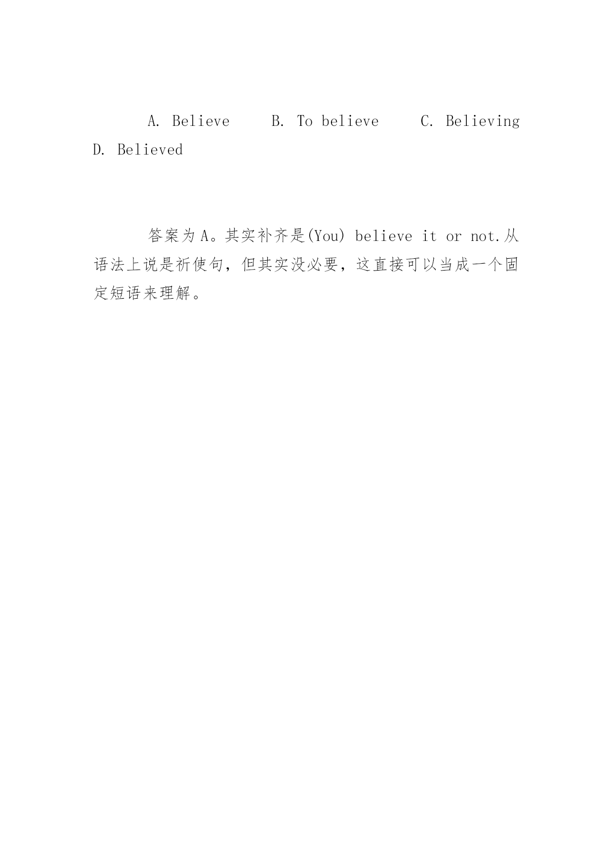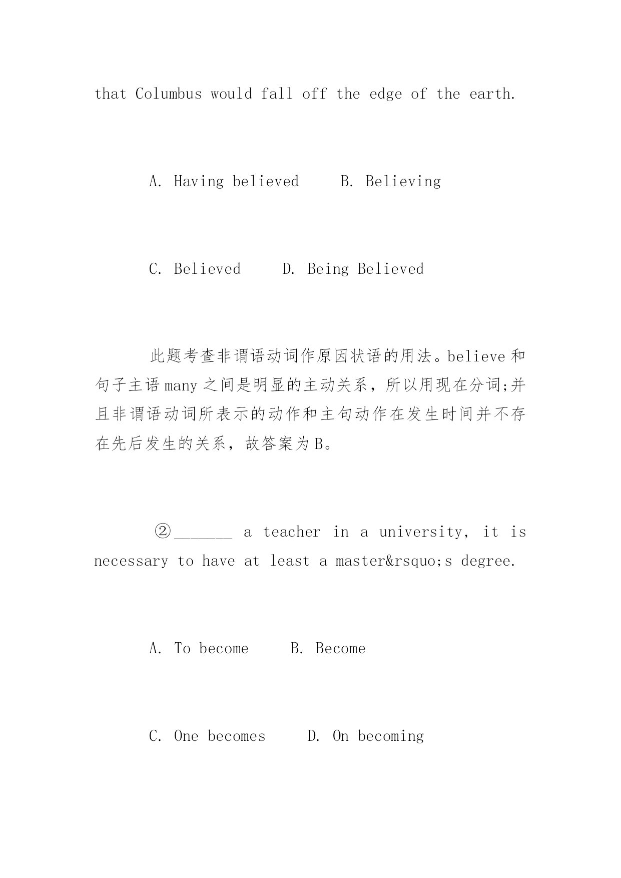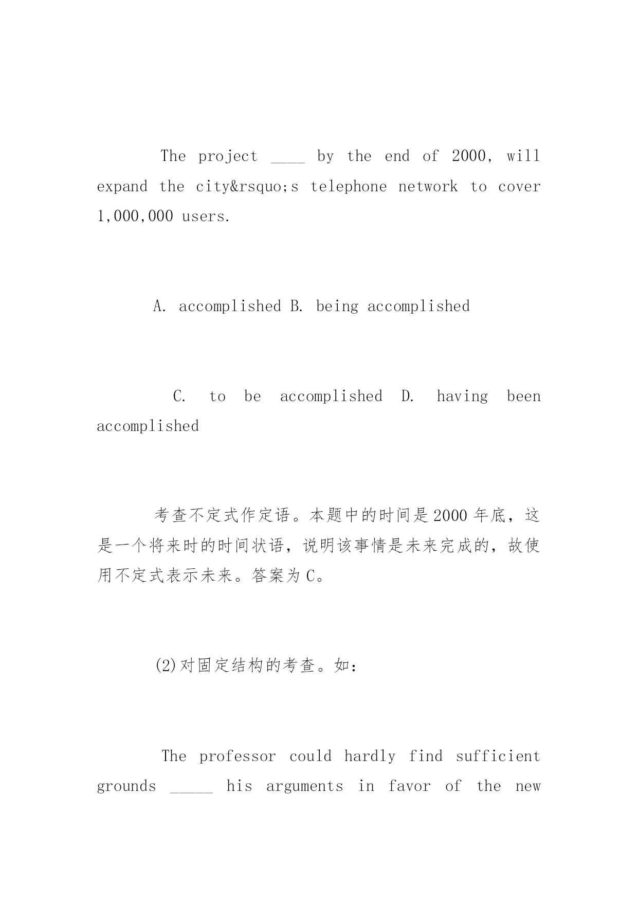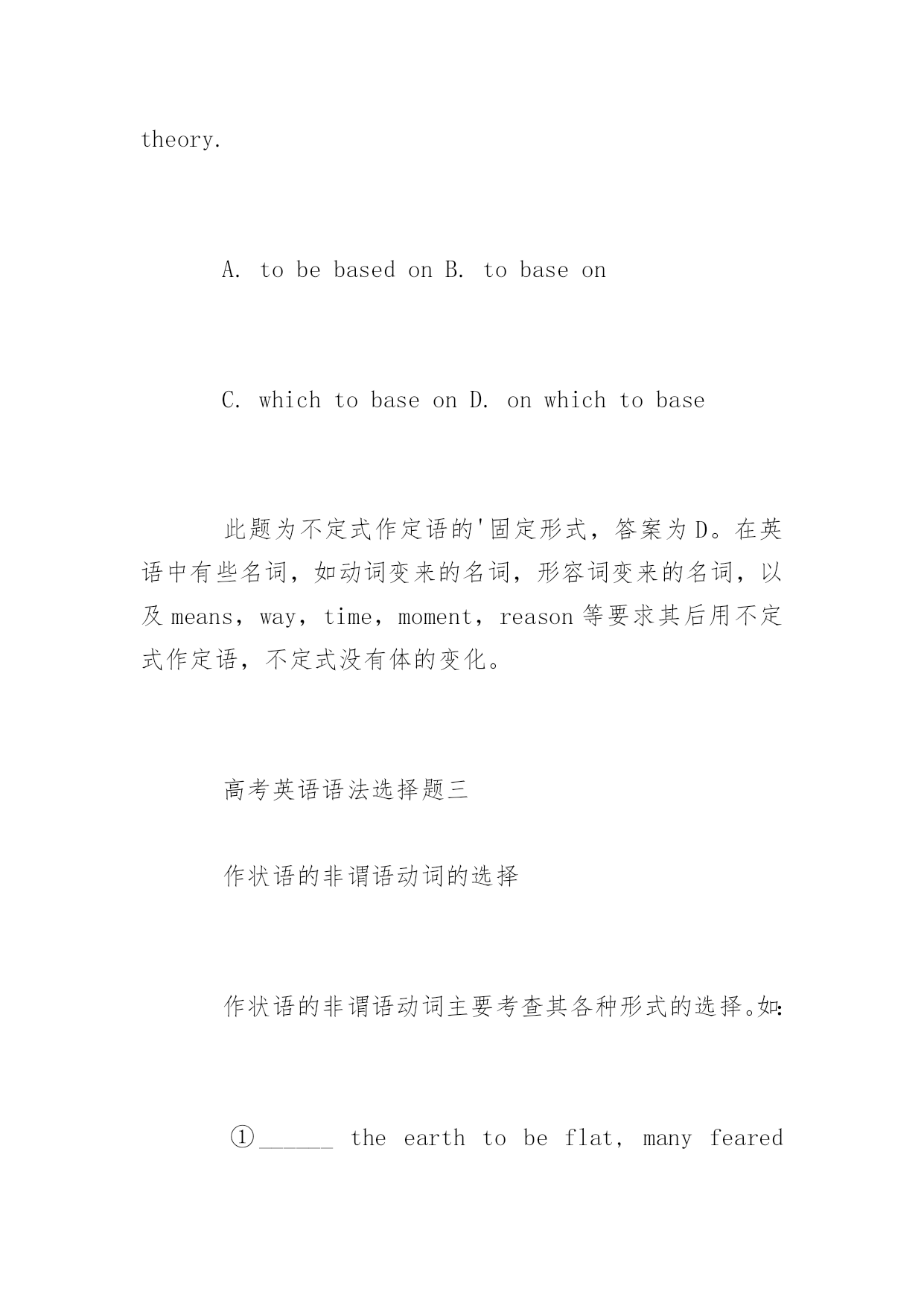 高考英语语法选择题高考英语语法选择题对高考英语不怎么熟练的情况下可以对英语语法归类训练,下面是小编整理的高考英语语法选择题,可以提高英语原发填空,供大家参考!高考英语语法选择题一1)谓语动词后不定式与动名词的选择谓语动词后接不定式还是接动名词也是语法测试中的一个题眼。如:①Idon’tmind____thedecisionaslongasitisnottoolate.A.youtodelaymakingB.yourdelayingmakingC.yourdelayingtomakeD.youdelaytomake本题考查动名词作宾语。句意:只要不是太晚,我不介意你延期做出决定。mind和delay后接动词时,要用动词的-ing形式。答案为B。②HadIremembered____thewindows,thethiefwouldnothavegotin.A.tocloseB.closingC.tohaveclosedD.havingclosedremembertodosth.记得去做某事;rememberdoing/havingdonesth.记得已做过某事。本题为虚拟语气,表示与过去事实相反的情况。句意:要是我记着去关窗户的话,小偷就进不来了。答案为A。③Yourhairwants______.You’dbetterhaveitdonetomorrow.A.cutB.tocutC.cuttingD.beingcut答案为C。此处want是需要的意思,和need用法一样,后接-ing形式,用主动表被动意义。高考英语语法选择题二作定语的非谓语动词的选择从近几年的考查情况来看,对作定语的非谓语动词的考查主要有两种情况:(1)对一般概念的考查。如:Theproject____bytheendof2000,willexpandthecity’stelephonenetworktocover1,000,000users.A.accomplishedB.beingaccomplishedC.tobeaccomplishedD.havingbeenaccomplished考查不定式作定语。本题中的时间是2000年底,这是一个将来时的时间状语,说明该事情是未来完成的,故使用不定式表示未来。答案为C。(2)对固定结构的考查。如:Theprofessorcouldhardlyfindsufficientgrounds_____hisargumentsinfavorofthenewtheory.A.tobebasedonB.tobaseonC.whichtobaseonD.onwhichtobase此题为不定式作定语的'固定形式,答案为D。在英语中有些名词,如动词变来的名词,形容词变来的名词,以及means,way,time,moment,reason等要求其后用不定式作定语,不定式没有体的变化。高考英语语法选择题三作状语的非谓语动词的选择作状语的非谓语动词主要考查其各种形式的选择。如:①______theearthtobeflat,manyfearedthatColumbuswouldfallofftheedgeoftheearth.A.HavingbelievedB.BelievingC.BelievedD.BeingBelieved此题考查非谓语动词作原因状语的用法。believe和句子主语many之间是明显的主动关系,所以用现在分词;并且非谓语动词所表示的动作和主句动作在发生时间并不存在先后发生的关系,故答案为B。②_______ateacherinauniversity,itisnecessarytohaveatleastamaster’sdegree.A.TobecomeB.BecomeC.OnebecomesD.Onbecoming答案为A。句意:想在大学里当教师,至少要有硕士学位。tobecomeateacherintheuniversity作目的状语。③Realizingthathehadn’tenoughmoneyand_______toborrowfromhisfather,hedecidedtosellhiswatch.A.notwantedB.notowantC.notwantingD.wantingnot本题主语是he,动作都是主动的,而Realizing和wanting都是在这里作非谓语动词,并列结构,故答案为C。④_______itornot,hisdiscoveryhascreatedastirinscientificcircles.A.BelieveB.Tobel