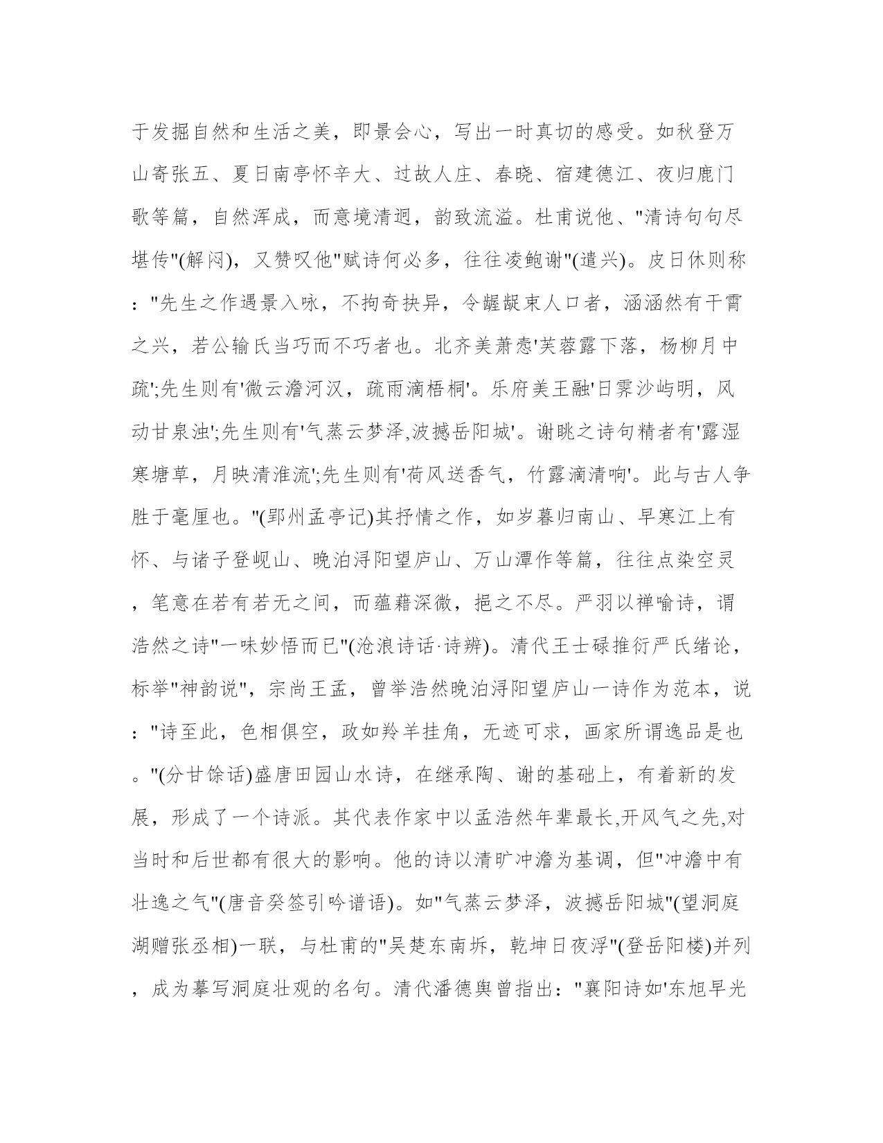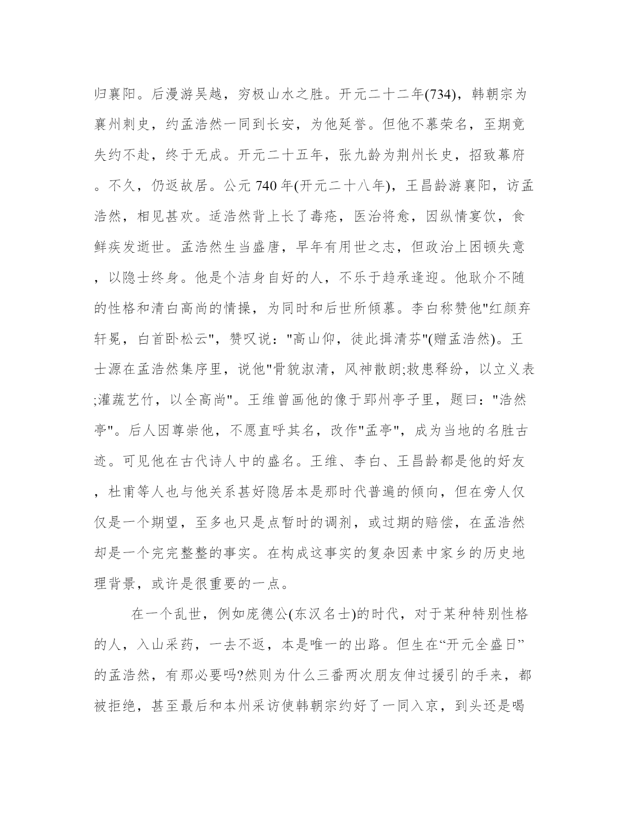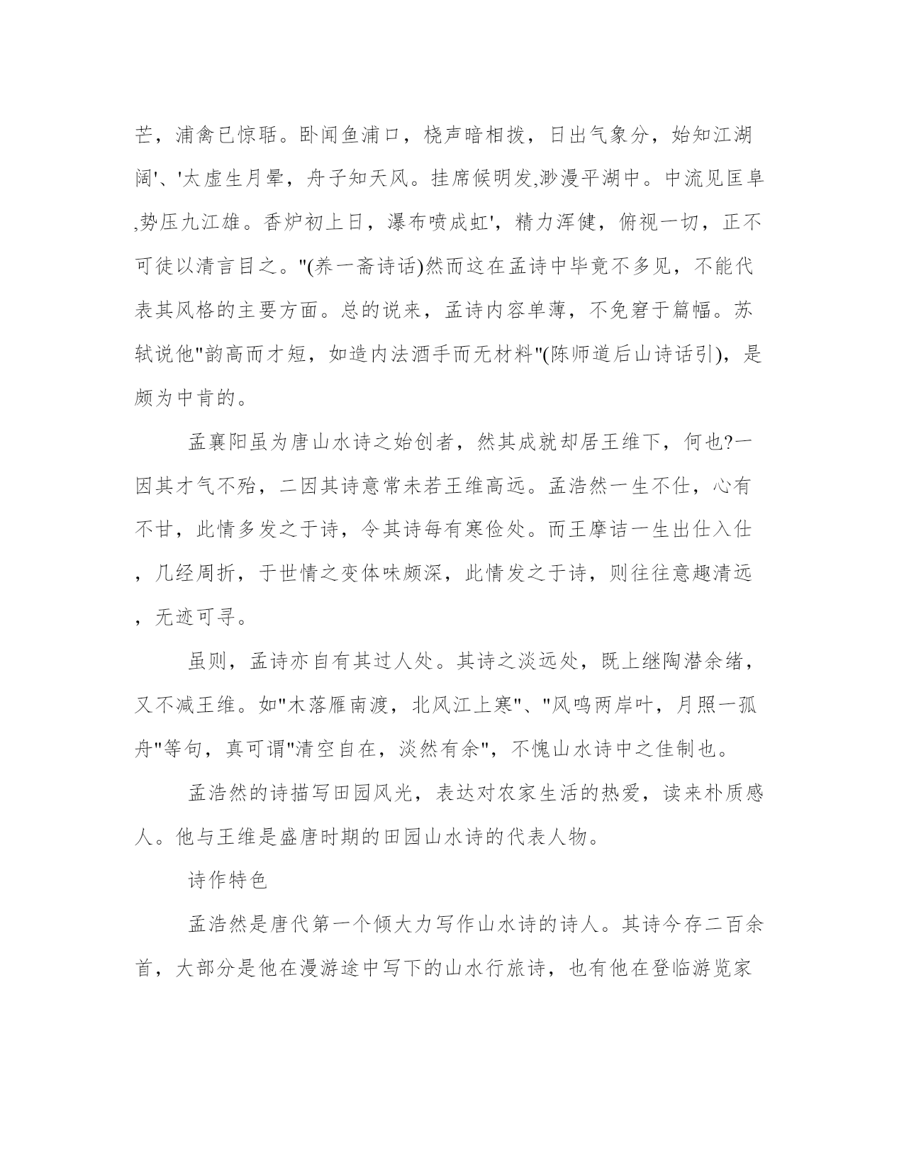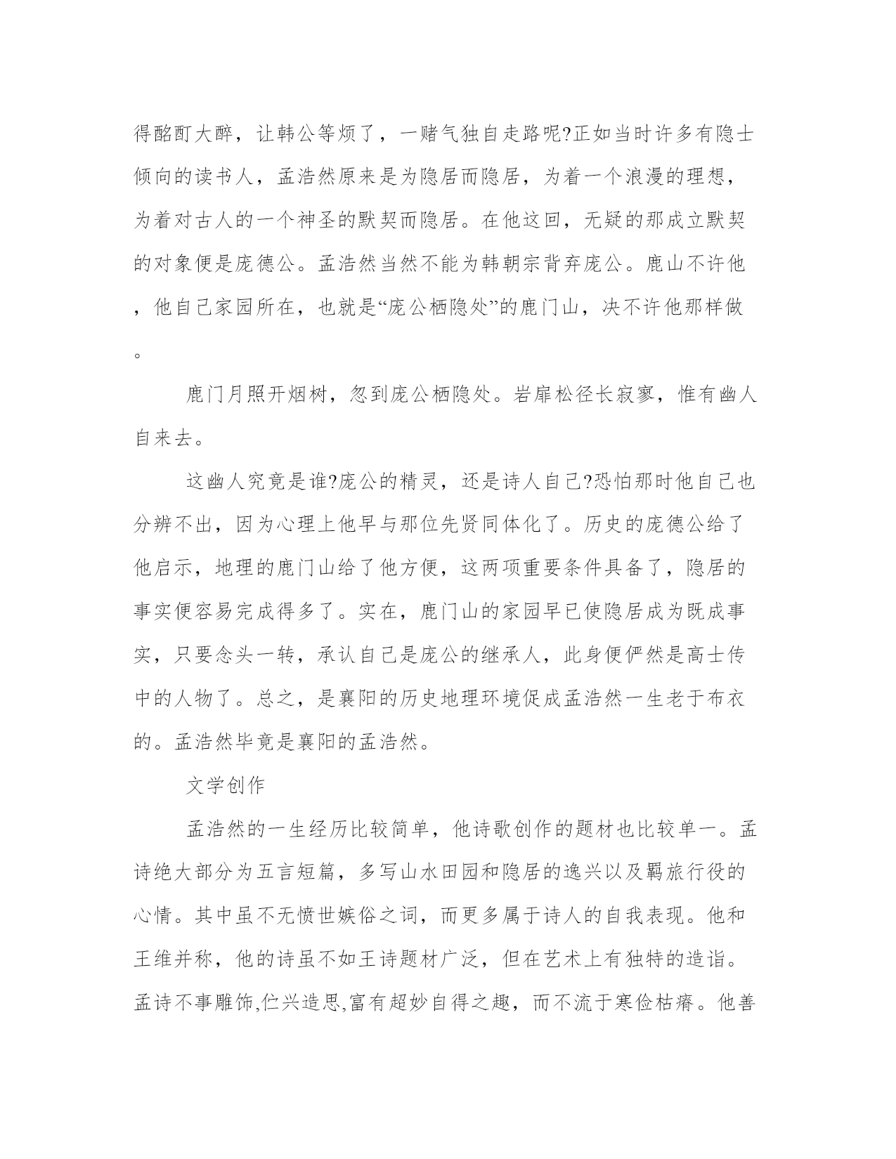 孟浩然的资料介绍生平孟浩然出生于公元689年(武后永昌元年),唐代一位不甘隐居。壮年时曾往吴越漫游,后又赴长安谋求官职,但以「当路无人」,只好还归故园。开元二十八年(七四零)诗人王昌龄游襄阳,和他相聚甚欢,但此时孟浩然背上正生毒疮,据说就是因为「食鲜疾动」,终于病故,年五十二岁。孟浩然的一生,徘徊于求官与归隐的矛盾之中,直到碰了钉子才了结了求官的愿望。他虽然隐居林下,但仍与当时达官显官如张九龄等有往还,和诗人王维、李白、王昌龄也有酬唱。孟浩然的诗已摆脱了初唐应制,咏物的狭窄境界,更多地抒写了个人的怀抱,给开元诗坛带来了新鲜气息,并得到时人的倾慕。李白称颂他「高山仰,徒此揖清芬」,杜甫礼赞他「清诗句句尽堪传」。可见他在当时即享有盛名。他死后不到十年,诗集便两经编定,并送上「秘府」保存。现有孟浩然集。孟浩然出生于公元689年(武后永昌元年)。40岁时,游长安,应进士举不第。曾在太学赋诗,名动公卿,一座倾服,为之搁笔。他和王维交谊甚笃。传说王维曾私邀入内署,适逢玄宗至,浩然惊避床下。王维不敢隐瞒,据实奏闻,玄宗命出见。浩然自诵其诗,至"不才明主弃"之句,玄宗不悦,说:"卿不求仕,而朕未尝弃卿,奈何诬我!"放归襄阳。后漫游吴越,穷极山水之胜。开元二十二年(734),韩朝宗为襄州刺史,约孟浩然一同到长安,为他延誉。但他不慕荣名,至期竟失约不赴,终于无成。开元二十五年,张九龄为荆州长史,招致幕府。不久,仍返故居。公元740年(开元二十八年),王昌龄游襄阳,访孟浩然,相见甚欢。适浩然背上长了毒疮,医治将愈,因纵情宴饮,食鲜疾发逝世。孟浩然生当盛唐,早年有用世之志,但政治上困顿失意,以隐士终身。他是个洁身自好的人,不乐于趋承逢迎。他耿介不随的性格和清白高尚的情操,为同时和后世所倾慕。李白称赞他"红颜弃轩冕,白首卧松云",赞叹说:"高山仰,徒此揖清芬"(赠孟浩然)。王士源在孟浩然集序里,说他"骨貌淑清,风神散朗;救患释纷,以立义表;灌蔬艺竹,以全高尚"。王维曾画他的像于郢州亭子里,题曰:"浩然亭"。后人因尊崇他,不愿直呼其名,改作"孟亭",成为当地的名胜古迹。可见他在古代诗人中的盛名。王维、李白、王昌龄都是他的好友,杜甫等人也与他关系甚好隐居本是那时代普遍的倾向,但在旁人仅仅是一个期望,至多也只是点暂时的调剂,或过期的赔偿,在孟浩然却是一个完完整整的事实。在构成这事实的复杂因素中家乡的历史地理背景,或许是很重要的一点。在一个乱世,例如庞德公(东汉名士)的时代,对于某种特别性格的人,入山采药,一去不返,本是唯一的出路。但生在“开元全盛日”的孟浩然,有那必要吗?然则为什么三番两次朋友伸过援引的手来,都被拒绝,甚至最后和本州采访使韩朝宗约好了一同入京,到头还是喝得酩酊大醉,让韩公等烦了,一赌气独自走路呢?正如当时许多有隐士倾向的读书人,孟浩然原来是为隐居而隐居,为着一个浪漫的理想,为着对古人的一个神圣的默契而隐居。在他这回,无疑的那成立默契的对象便是庞德公。孟浩然当然不能为韩朝宗背弃庞公。鹿山不许他,他自己家园所在,也就是“庞公栖隐处”的鹿门山,决不许他那样做。鹿门月照开烟树,忽到庞公栖隐处。岩扉松径长寂寥,惟有幽人自来去。这幽人究竟是谁?庞公的精灵,还是诗人自己?恐怕那时他自己也分辨不出,因为心理上他早与那位先贤同体化了。历史的庞德公给了他启示,地理的鹿门山给了他方便,这两项重要条件具备了,隐居的事实便容易完成得多了。实在,鹿门山的家园早已使隐居成为既成事实,只要念头一转,承认自己是庞公的继承人,此身便俨然是高士传中的人物了。总之,是襄阳的历史地理环境促成孟浩然一生老于布衣的。孟浩然毕竟是襄阳的孟浩然。文学创作孟浩然的一生经历比较简单,他诗歌创作的题材也比较单一。孟诗绝大部分为五言短篇,多写山水田园和隐居的逸兴以及羁旅行役的心情。其中虽不无愤世嫉俗之词,而更多属于诗人的自我表现。他和王维并称,他的诗虽不如王诗题材广泛,但在艺术上有独特的造诣。孟诗不事雕饰,伫兴造思,富有超妙自得之趣,而不流于寒俭枯瘠。他善于发掘自然和生活之美,即景会心,写出一时真切的感受。如秋登万山寄张五、夏日南亭怀辛大、过故人庄、春晓、宿建德江、夜归鹿门歌等篇,自然浑成,而意境清迥,韵致流溢。杜甫说他、"清诗句句尽堪传"(解闷),又赞叹他"赋诗何必多,往往凌鲍谢"(遣兴)。皮日休则称:"先生之作遇景入咏,不拘奇抉异,令龌龊束人口者,涵涵然有干霄之兴,若公输氏当巧而不巧者也。北齐美萧悫'芙蓉露下落,杨柳月中疏';先生则有'微云澹河汉,疏雨滴梧桐'。乐府美王融'日霁沙屿明,风动甘泉浊';先生则有'气蒸云梦泽,波撼岳阳城'。谢眺之诗句精者有'露湿寒塘草,月映清淮流';先生则有'荷风送香气,竹露滴清响'。此与古人争胜于毫厘也。"(郢州孟亭记)其抒情之作,如岁暮归南山