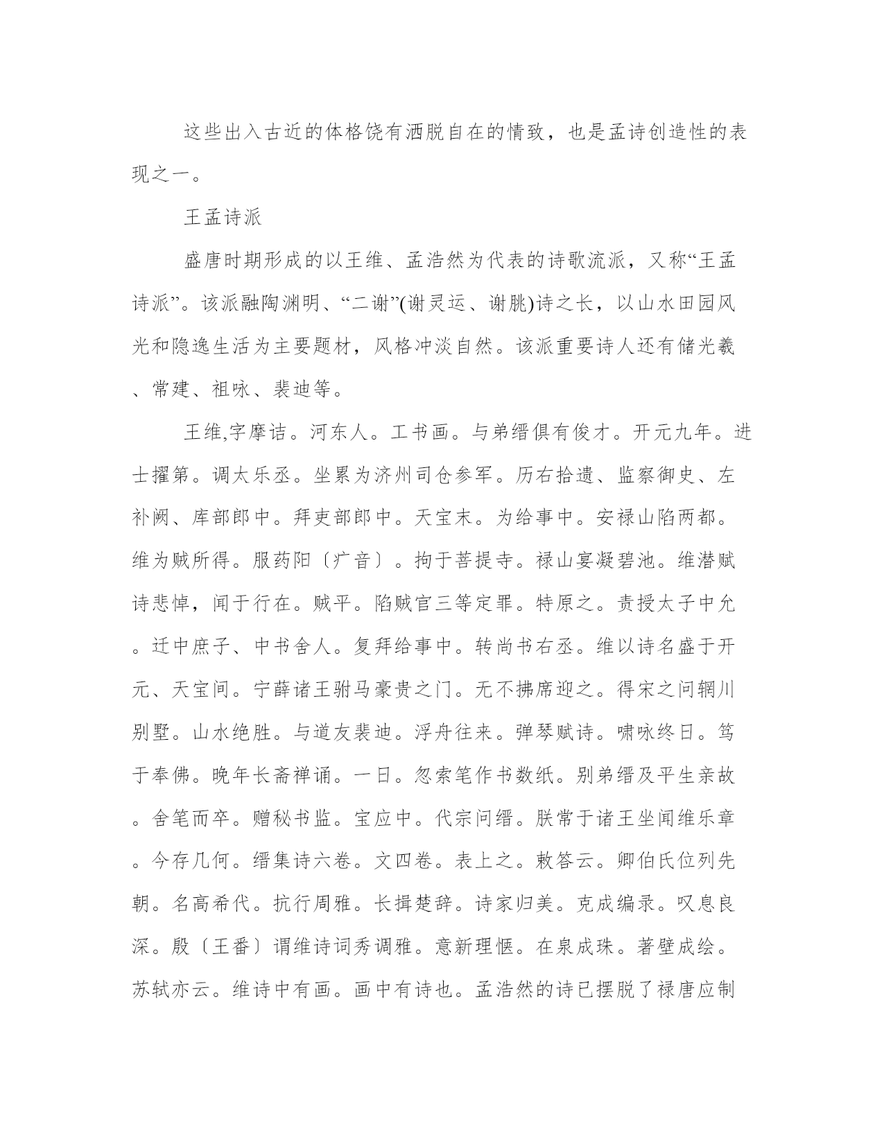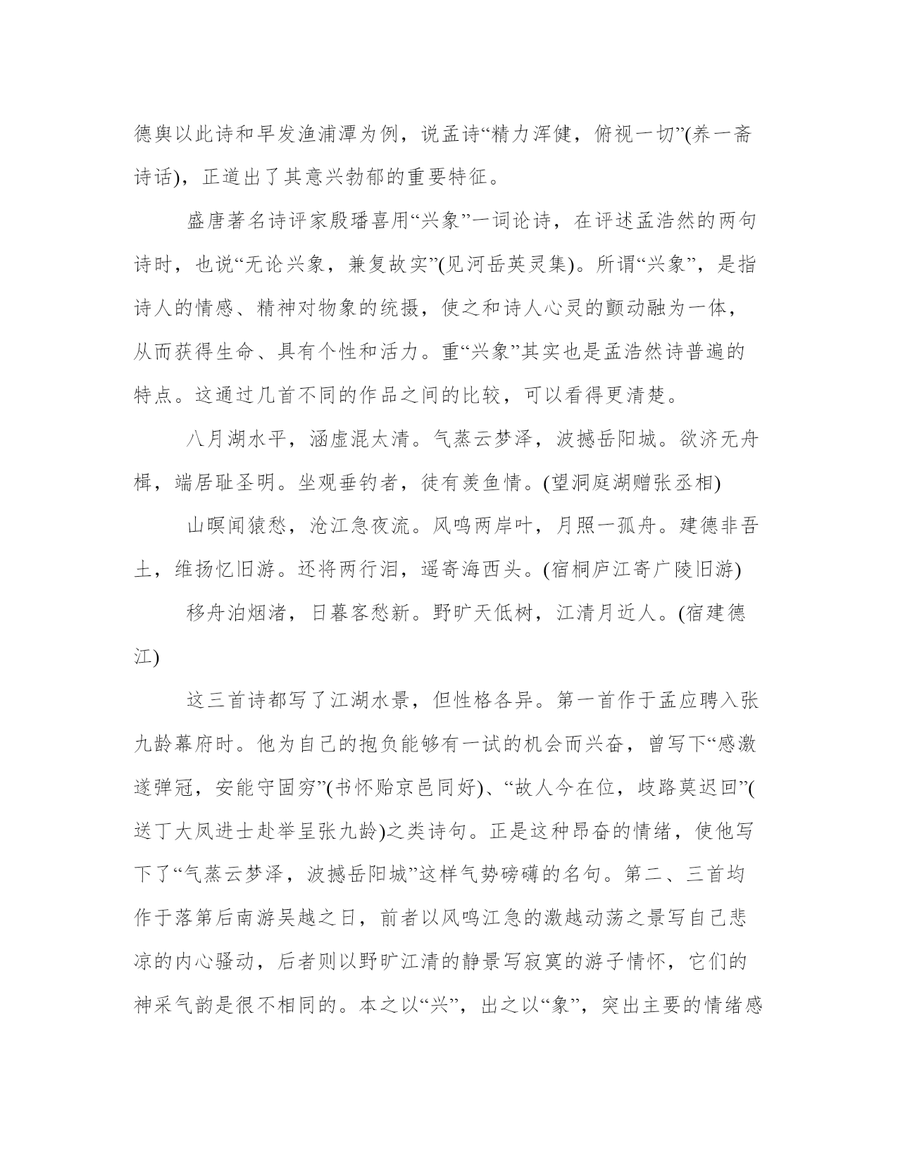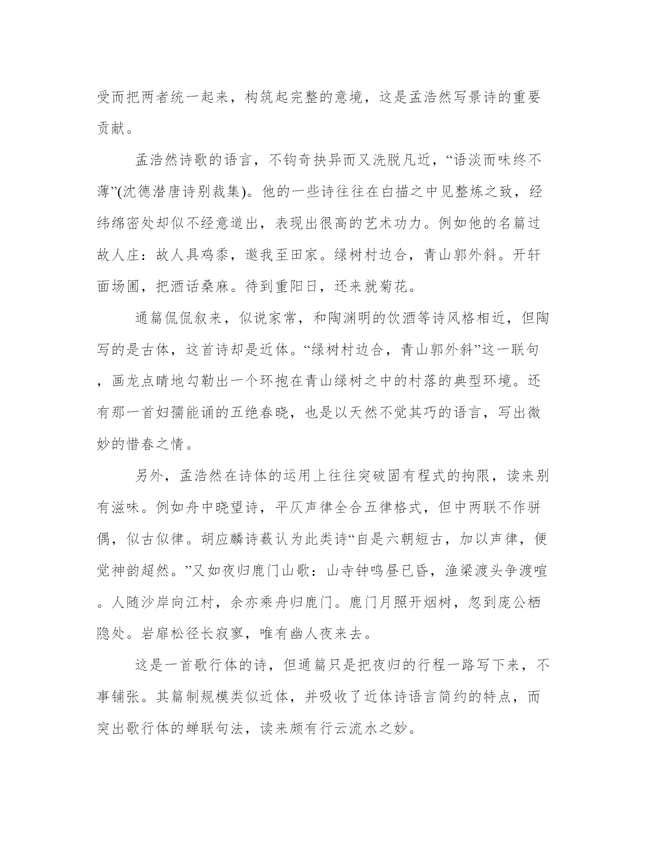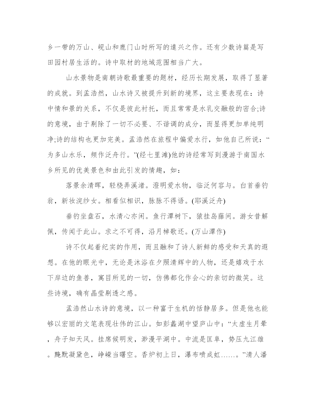 孟浩然的资料介绍生平孟浩然出生于公元689年(武后永昌元年),唐代一位不甘隐居。壮年时曾往吴越漫游,后又赴长安谋求官职,但以「当路无人」,只好还归故园。开元二十八年(七四零)诗人王昌龄游襄阳,和他相聚甚欢,但此时孟浩然背上正生毒疮,据说就是因为「食鲜疾动」,终于病故,年五十二岁。孟浩然的一生,徘徊于求官与归隐的矛盾之中,直到碰了钉子才了结了求官的愿望。他虽然隐居林下,但仍与当时达官显官如张九龄等有往还,和诗人王维、李白、王昌龄也有酬唱。孟浩然的诗已摆脱了初唐应制,咏物的狭窄境界,更多地抒写了个人的怀抱,给开元诗坛带来了新鲜气息,并得到时人的倾慕。李白称颂他「高山仰,徒此揖清芬」,杜甫礼赞他「清诗句句尽堪传」。可见他在当时即享有盛名。他死后不到十年,诗集便两经编定,并送上「秘府」保存。现有孟浩然集。孟浩然出生于公元689年(武后永昌元年)。40岁时,游长安,应进士举不第。曾在太学赋诗,名动公卿,一座倾服,为之搁笔。他和王维交谊甚笃。传说王维曾私邀入内署,适逢玄宗至,浩然惊避床下。王维不敢隐瞒,据实奏闻,玄宗命出见。浩然自诵其诗,至"不才明主弃"之句,玄宗不悦,说:"卿不求仕,而朕未尝弃卿,奈何诬我!"放归襄阳。后漫游吴越,穷极山水之胜。开元二十二年(734),韩朝宗为襄州刺史,约孟浩然一同到长安,为他延誉。但他不慕荣名,至期竟失约不赴,终于无成。开元二十五年,张九龄为荆州长史,招致幕府。不久,仍返故居。公元740年(开元二十八年),王昌龄游襄阳,访孟浩然,相见甚欢。适浩然背上长了毒疮,医治将愈,因纵情宴饮,食鲜疾发逝世。孟浩然生当盛唐,早年有用世之志,但政治上困顿失意,以隐士终身。他是个洁身自好的人,不乐于趋承逢迎。他耿介不随的性格和清白高尚的情操,为同时和后世所倾慕。李白称赞他"红颜弃轩冕,白首卧松云",赞叹说:"高山仰,徒此揖清芬"(赠孟浩然)。王士源在孟浩然集序里,说他"骨貌淑清,风神散朗;救患释纷,以立义表;灌蔬艺竹,以全高尚"。王维曾画他的像于郢州亭子里,题曰:"浩然亭"。后人因尊崇他,不愿直呼其名,改作"孟亭",成为当地的名胜古迹。可见他在古代诗人中的盛名。王维、李白、王昌龄都是他的好友,杜甫等人也与他关系甚好隐居本是那时代普遍的倾向,但在旁人仅仅是一个期望,至多也只是点暂时的调剂,或过期的赔偿,在孟浩然却是一个完完整整的事实。在构成这事实的复杂因素中家乡的历史地理背景,或许是很重要的一点。在一个乱世,例如庞德公(东汉名士)的时代,对于某种特别性格的人,入山采药,一去不返,本是唯一的出路。但生在“开元全盛日”的孟浩然,有那必要吗?然则为什么三番两次朋友伸过援引的手来,都被拒绝,甚至最后和本州采访使韩朝宗约好了一同入京,到头还是喝得酩酊大醉,让韩公等烦了,一赌气独自走路呢?正如当时许多有隐士倾向的读书人,孟浩然原来是为隐居而隐居,为着一个浪漫的理想,为着对古人的一个神圣的默契而隐居。在他这回,无疑的那成立默契的对象便是庞德公。孟浩然当然不能为韩朝宗背弃庞公。鹿山不许他,他自己家园所在,也就是“庞公栖隐处”的鹿门山,决不许他那样做。鹿门月照开烟树,忽到庞公栖隐处。岩扉松径长寂寥,惟有幽人自来去。这幽人究竟是谁?庞公的精灵,还是诗人自己?恐怕那时他自己也分辨不出,因为心理上他早与那位先贤同体化了。历史的庞德公给了他启示,地理的鹿门山给了他方便,这两项重要条件具备了,隐居的事实便容易完成得多了。实在,鹿门山的家园早已使隐居成为既成事实,只要念头一转,承认自己是庞公的继承人,此身便俨然是高士传中的人物了。总之,是襄阳的历史地理环境促成孟浩然一生老于布衣的。孟浩然毕竟是襄阳的孟浩然。文学创作孟浩然的一生经历比较简单,他诗歌创作的题材也比较单一。孟诗绝大部分为五言短篇,多写山水田园和隐居的逸兴以及羁旅行役的心情。其中虽不无愤世嫉俗之词,而更多属于诗人的自我表现。他和王维并称,他的诗虽不如王诗题材广泛,但在艺术上有独特的造诣。孟诗不事雕饰,伫兴造思,富有超妙自得之趣,而不流于寒俭枯瘠。他善于发掘自然和生活之美,即景会心,写出一时真切的感受。如秋登万山寄张五、夏日南亭怀辛大、过故人庄、春晓、宿建德江、夜归鹿门歌等篇,自然浑成,而意境清迥,韵致流溢。杜甫说他、"清诗句句尽堪传"(解闷),又赞叹他"赋诗何必多,往往凌鲍谢"(遣兴)。皮日休则称:"先生之作遇景入咏,不拘奇抉异,令龌龊束人口者,涵涵然有干霄之兴,若公输氏当巧而不巧者也。北齐美萧悫'芙蓉露下落,杨柳月中疏';先生则有'微云澹河汉,疏雨滴梧桐'。乐府美王融'日霁沙屿明,风动甘泉浊';先生则有'气蒸云梦泽,波撼岳阳城'。谢眺之诗句精者有'露湿寒塘草,月映清淮流';先生则有'荷风送香气,竹露滴清响'。此与古人争胜于毫厘也。"(郢州孟亭记)其抒情之作,如岁暮归南山
