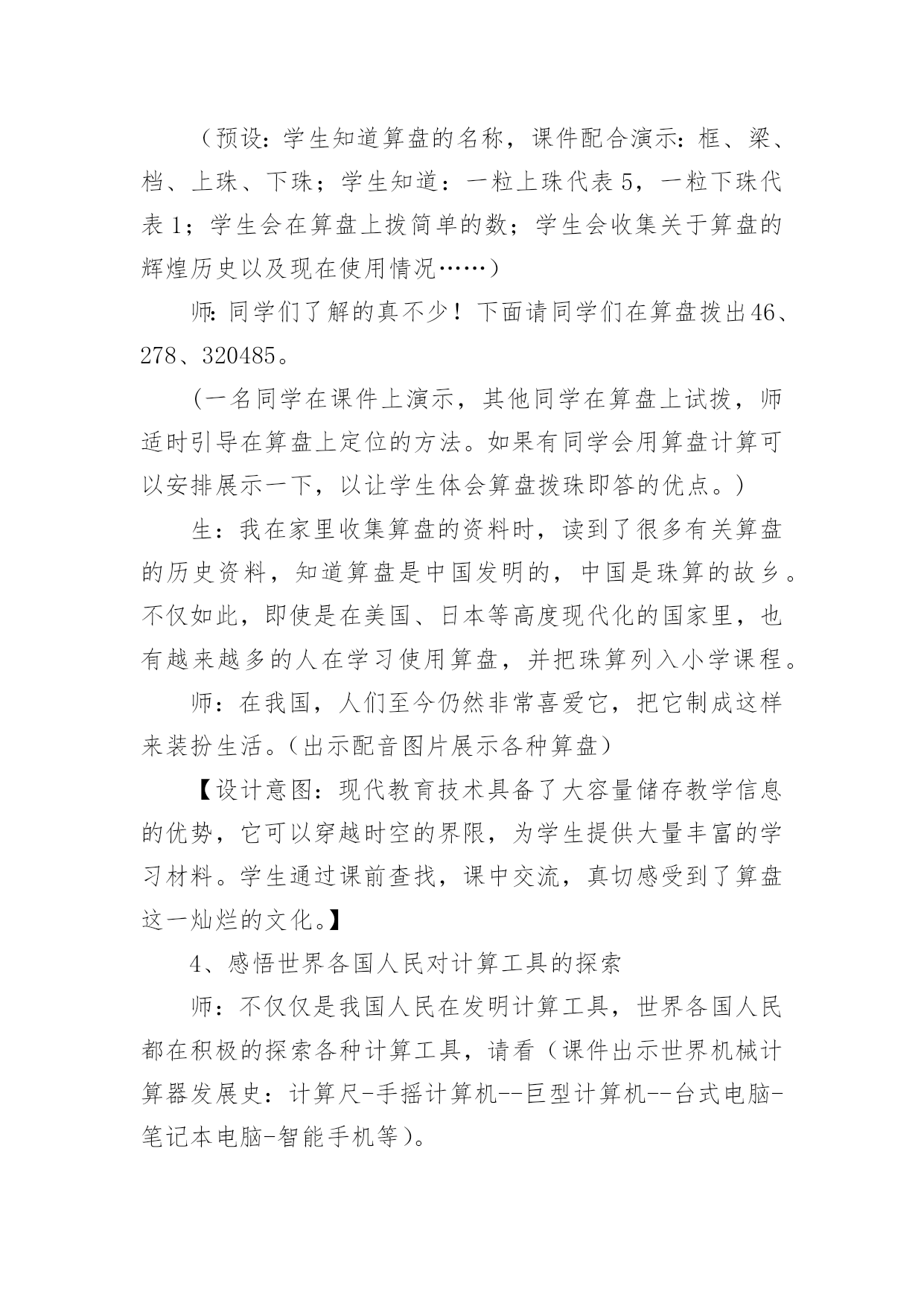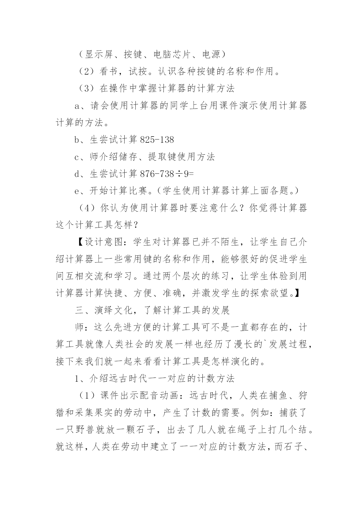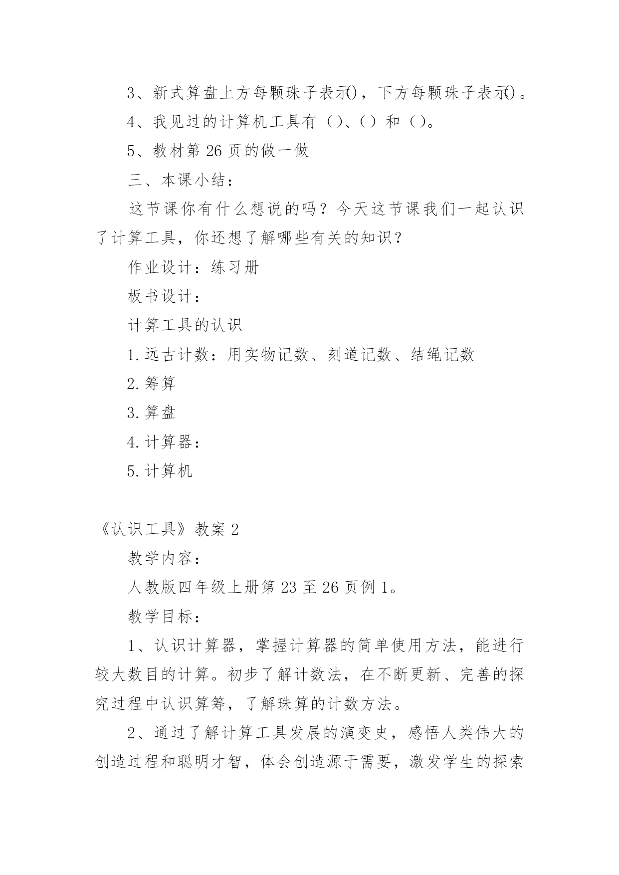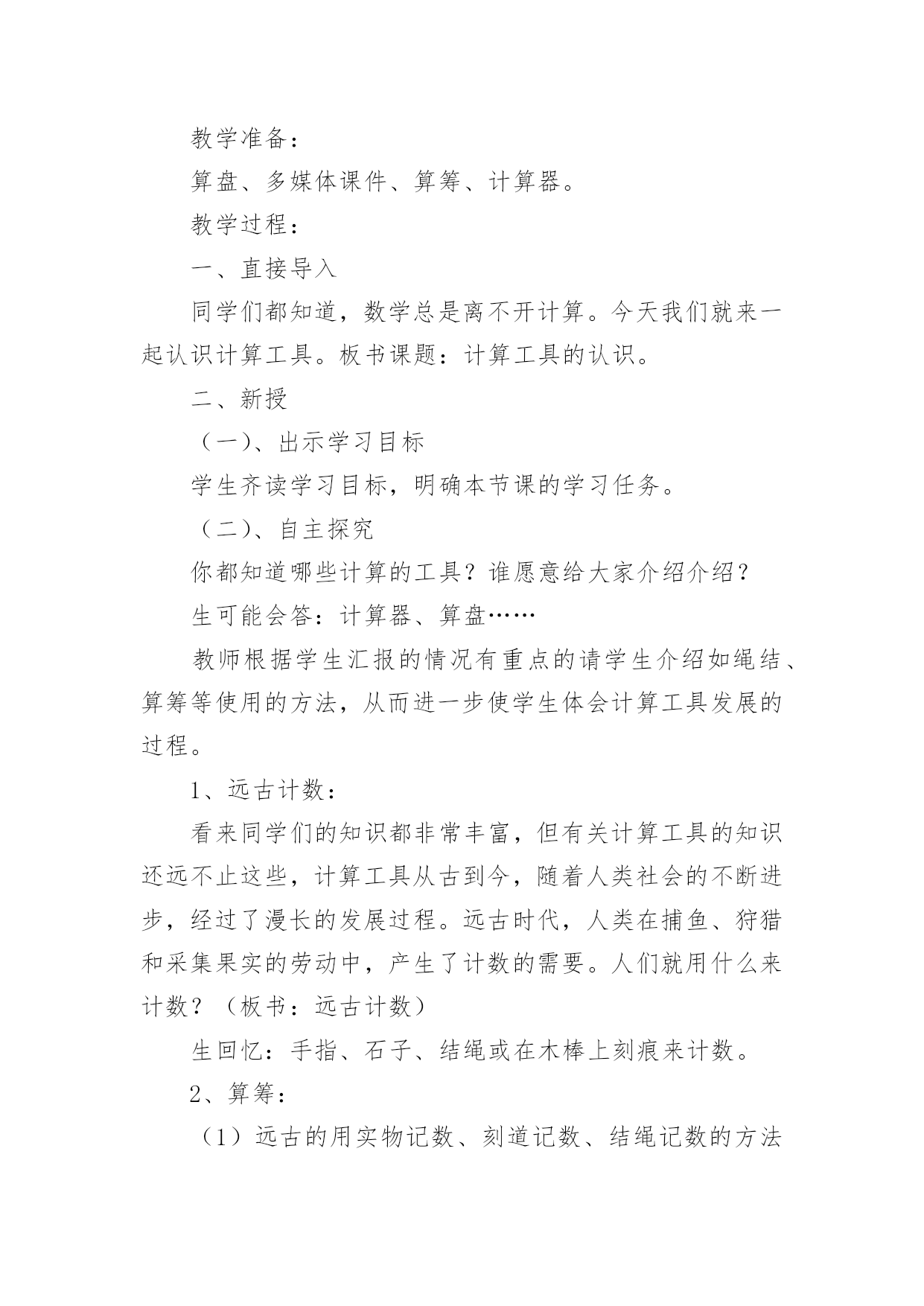 《认识工具》教案作为一名辛苦耕耘的教育工作者,通常会被要求编写教案,借助教案可以更好地组织教学活动。教案应该怎么写呢?以下是小编为大家整理的《认识工具》教案,希望对大家有所帮助。《认识工具》教案1教学内容:教科书第23~27页内容。教学目标:1、使学生简单了解计算工具的发展,包括结绳计事等远古计数方法、算筹的简单知识、传统计算工具——算盘,及其计算方法、生活中常用的计算器、和现代计算机的发展史。2、展示人类伟大的创造过程和聪明才智,体会到人们为了方便在计算工具方面的探索和努力。使学生经历认识和使用计算工具的过程3、培养学生学习数学的兴趣。通过认识算盘,体会我国古代劳动人民的智慧与努力,激发爱国感情。教学重点:利用计算器来进行计算。教学难点:正确使用存储运算键。教学准备:算盘、多媒体课件、算筹、计算器。教学过程:一、直接导入同学们都知道,数学总是离不开计算。今天我们就来一起认识计算工具。板书课题:计算工具的认识。二、新授(一)、出示学习目标学生齐读学习目标,明确本节课的学习任务。(二)、自主探究你都知道哪些计算的工具?谁愿意给大家介绍介绍?生可能会答:计算器、算盘……教师根据学生汇报的情况有重点的请学生介绍如绳结、算筹等使用的方法,从而进一步使学生体会计算工具发展的过程。1、远古计数:看来同学们的知识都非常丰富,但有关计算工具的知识还远不止这些,计算工具从古到今,随着人类社会的不断进步,经过了漫长的发展过程。远古时代,人类在捕鱼、狩猎和采集果实的劳动中,产生了计数的需要。人们就用什么来计数?(板书:远古计数)生回忆:手指、石子、结绳或在木棒上刻痕来计数。2、算筹:(1)远古的用实物记数、刻道记数、结绳记数的方法只能计数,而不能清楚的表示出计数级是什么事情,人们开始想一些新的办法来计数。这就出现了这样一种计数方法——算筹。(出示课件)(板书:算筹)介绍算筹:我国古代人用算筹表示数和计算。算筹是用木棍或竹子制成。在屏幕上展示。算筹是如何用来计数的。与远古计数方法相比它的优点就是有数位,哪一位表示几就用小棍来表示。一个竖棍就是1,二个就是2,五个就用一个横棍来表示……空格表示零。课件出示:算筹表示多位数。(2)你知道这些用算筹表示的数分别是多少吗?课件出示题目。3、算盘:(1)后来我国劳动人民创造了算盘作为计算工具。七八百年前,算盘已经在我国广泛使用。出示老式算盘实物。展示算盘:上面有两颗珠子,每颗代表5,下面每颗珠子表示1。一档共表示多少?表示15。因为我国古代是15进制。现在是满十进一。所以算盘后来游船到日本、朝鲜等国。进行了改进。(2)出示新式算盘。上面是1颗珠子。一档表示多少?一档表示10。它的特点是结构简单,使用方便,特别实用。他计算数目较大和数目较多的加减法,更为简便。(3)课件出示由老式算盘衍生出的形态各异的算盘。4、计算器:现在,算盘因为笨重、不方便携带,逐渐被更轻便的计算工具所取代。我们现在最常用的计算工具是哪一个?你在哪里见过计算器?同学们可以互相看一看,你们的计算器各部相同?因为根据各种不同的需要,所以有科学专用的计算器,有最简洁的计算器……但他们的功能都大致相同。5、电子计算机:(1).随着时间的发展,科技又向前推进,人们又发明了什么?出示课件:台式电脑,笔记本电脑,平板电脑。师:随着科技的发展,人类计算工具会更加先进。就等着在座的各位,你们这一代人去实现。(2)现在人们人手一部的'手机,也具备了微电脑的功能。6.简单认识计算器比较重要的按键的名称和作用。、(三)、计算器的应用1、学生自学教材26页的例题2、学生在小组内交流方法。3、小组汇报,全班交流并说说你找到了什么规律?(四)、巩固练习1、早在14世纪,中国就发明了()。2、老式算盘上方有()颗珠子,每颗珠子表示(),下方有()颗珠子,每颗珠子表示()。3、新式算盘上方每颗珠子表示(),下方每颗珠子表示()。4、我见过的计算机工具有()、()和()。5、教材的做一做三、本课小结:这节课你有什么想说的吗?今天这节课我们一起认识了计算工具,你还想了解哪些有关的知识?作业设计:练习册板书设计:计算工具的认识1.远古计数:用实物记数、刻道记数、结绳记数2.筹算3.算盘4.计算器:5.计算机《认识工具》教案2教学内容:人教版四年级上册第23至26页例1。教学目标:1、认识计算器,掌握计算器的简单使用方法,能进行较大数目的计算。初步了解计数法,在不断更新、完善的探究过程中认识算筹,了解珠算的计数方法。2、通过了解计算工具发展的演变史,感悟人类伟大的创造过程和聪明才智,体会创造源于需要,激发学生的探索精神和创造欲望。3、培养学生动手操作、动口表达的能力,激发学生的创新意识。教学重点:掌握计算器的简单使用方法,了解计算工具的发展史。教学难点:体会创造源于需要,激发民族