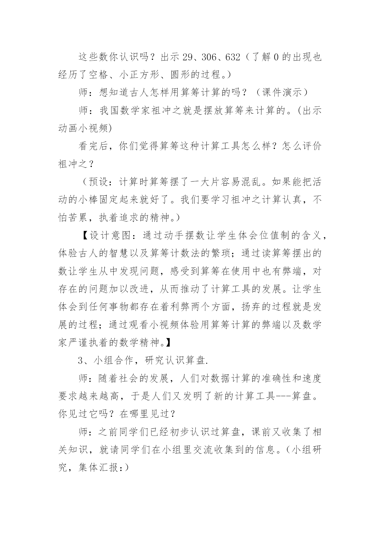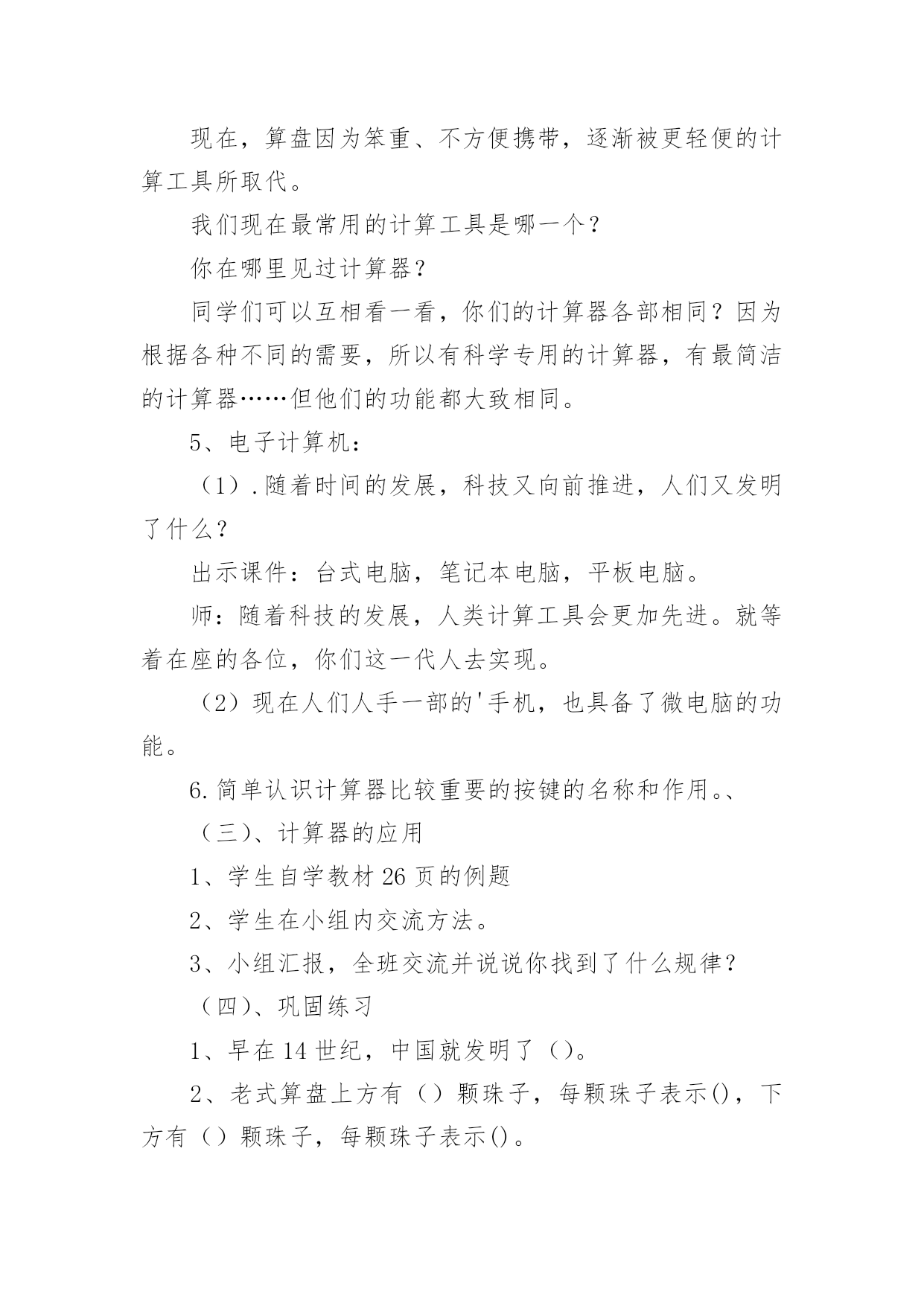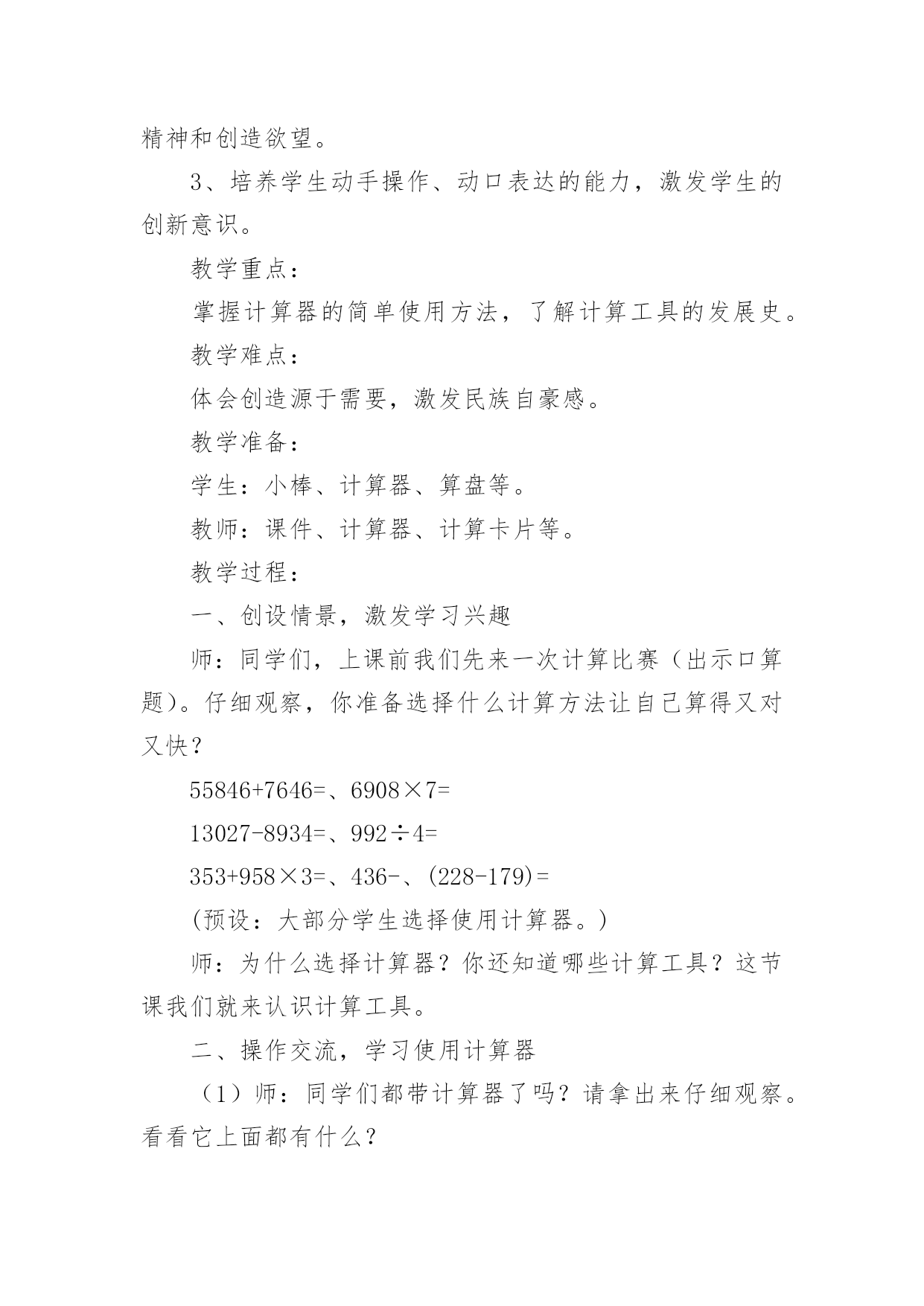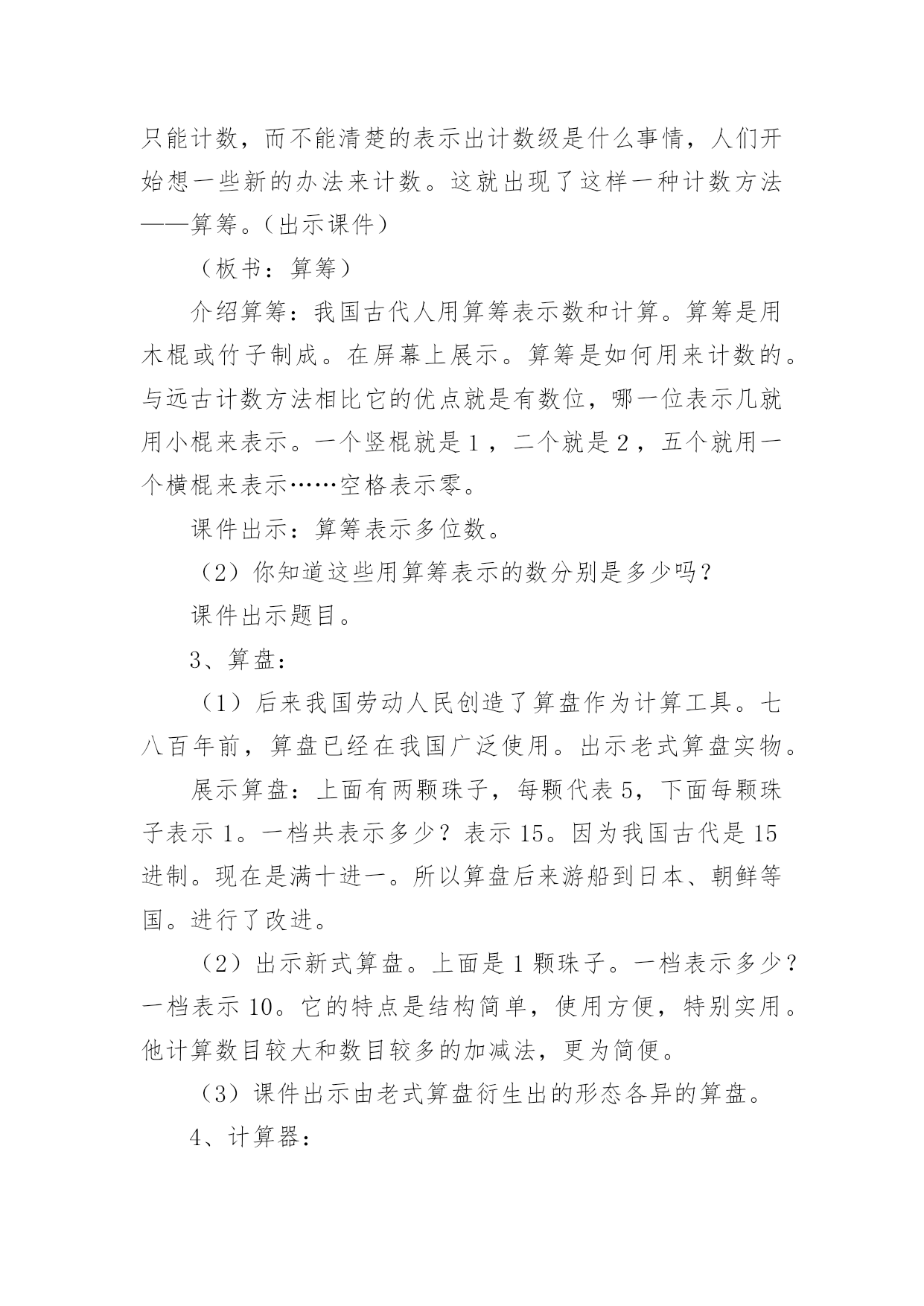《认识工具》教案作为一名辛苦耕耘的教育工作者,通常会被要求编写教案,借助教案可以更好地组织教学活动。教案应该怎么写呢?以下是小编为大家整理的《认识工具》教案,希望对大家有所帮助。《认识工具》教案1教学内容:教科书第23~27页内容。教学目标:1、使学生简单了解计算工具的发展,包括结绳计事等远古计数方法、算筹的简单知识、传统计算工具——算盘,及其计算方法、生活中常用的计算器、和现代计算机的发展史。2、展示人类伟大的创造过程和聪明才智,体会到人们为了方便在计算工具方面的探索和努力。使学生经历认识和使用计算工具的过程3、培养学生学习数学的兴趣。通过认识算盘,体会我国古代劳动人民的智慧与努力,激发爱国感情。教学重点:利用计算器来进行计算。教学难点:正确使用存储运算键。教学准备:算盘、多媒体课件、算筹、计算器。教学过程:一、直接导入同学们都知道,数学总是离不开计算。今天我们就来一起认识计算工具。板书课题:计算工具的认识。二、新授(一)、出示学习目标学生齐读学习目标,明确本节课的学习任务。(二)、自主探究你都知道哪些计算的工具?谁愿意给大家介绍介绍?生可能会答:计算器、算盘……教师根据学生汇报的情况有重点的请学生介绍如绳结、算筹等使用的方法,从而进一步使学生体会计算工具发展的过程。1、远古计数:看来同学们的知识都非常丰富,但有关计算工具的知识还远不止这些,计算工具从古到今,随着人类社会的不断进步,经过了漫长的发展过程。远古时代,人类在捕鱼、狩猎和采集果实的劳动中,产生了计数的需要。人们就用什么来计数?(板书:远古计数)生回忆:手指、石子、结绳或在木棒上刻痕来计数。2、算筹:(1)远古的用实物记数、刻道记数、结绳记数的方法只能计数,而不能清楚的表示出计数级是什么事情,人们开始想一些新的办法来计数。这就出现了这样一种计数方法——算筹。(出示课件)(板书:算筹)介绍算筹:我国古代人用算筹表示数和计算。算筹是用木棍或竹子制成。在屏幕上展示。算筹是如何用来计数的。与远古计数方法相比它的优点就是有数位,哪一位表示几就用小棍来表示。一个竖棍就是1,二个就是2,五个就用一个横棍来表示……空格表示零。课件出示:算筹表示多位数。(2)你知道这些用算筹表示的数分别是多少吗?课件出示题目。3、算盘:(1)后来我国劳动人民创造了算盘作为计算工具。七八百年前,算盘已经在我国广泛使用。出示老式算盘实物。展示算盘:上面有两颗珠子,每颗代表5,下面每颗珠子表示1。一档共表示多少?表示15。因为我国古代是15进制。现在是满十进一。所以算盘后来游船到日本、朝鲜等国。进行了改进。(2)出示新式算盘。上面是1颗珠子。一档表示多少?一档表示10。它的特点是结构简单,使用方便,特别实用。他计算数目较大和数目较多的加减法,更为简便。(3)课件出示由老式算盘衍生出的形态各异的算盘。4、计算器:现在,算盘因为笨重、不方便携带,逐渐被更轻便的计算工具所取代。我们现在最常用的计算工具是哪一个?你在哪里见过计算器?同学们可以互相看一看,你们的计算器各部相同?因为根据各种不同的需要,所以有科学专用的计算器,有最简洁的计算器……但他们的功能都大致相同。5、电子计算机:(1).随着时间的发展,科技又向前推进,人们又发明了什么?出示课件:台式电脑,笔记本电脑,平板电脑。师:随着科技的发展,人类计算工具会更加先进。就等着在座的各位,你们这一代人去实现。(2)现在人们人手一部的'手机,也具备了微电脑的功能。6.简单认识计算器比较重要的按键的名称和作用。、(三)、计算器的应用1、学生自学教材26页的例题2、学生在小组内交流方法。3、小组汇报,全班交流并说说你找到了什么规律?(四)、巩固练习1、早在14世纪,中国就发明了()。2、老式算盘上方有()颗珠子,每颗珠子表示(),下方有()颗珠子,每颗珠子表示()。3、新式算盘上方每颗珠子表示(),下方每颗珠子表示()。4、我见过的计算机工具有()、()和()。5、教材的做一做三、本课小结:这节课你有什么想说的吗?今天这节课我们一起认识了计算工具,你还想了解哪些有关的知识?作业设计:练习册板书设计:计算工具的认识1.远古计数:用实物记数、刻道记数、结绳记数2.筹算3.算盘4.计算器:5.计算机《认识工具》教案2教学内容:人教版四年级上册第23至26页例1。教学目标:1、认识计算器,掌握计算器的简单使用方法,能进行较大数目的计算。初步了解计数法,在不断更新、完善的探究过程中认识算筹,了解珠算的计数方法。2、通过了解计算工具发展的演变史,感悟人类伟大的创造过程和聪明才智,体会创造源于需要,激发学生的探索精神和创造欲望。3、培养学生动手操作、动口表达的能力,激发学生的创新意识。教学重点:掌握计算器的简单使用方法,了解计算工具的发展史。教学难点:体会创造源于需要,激发民族