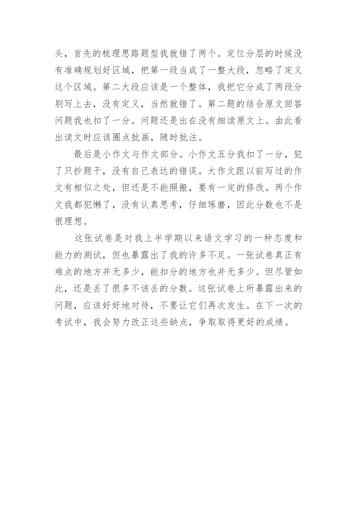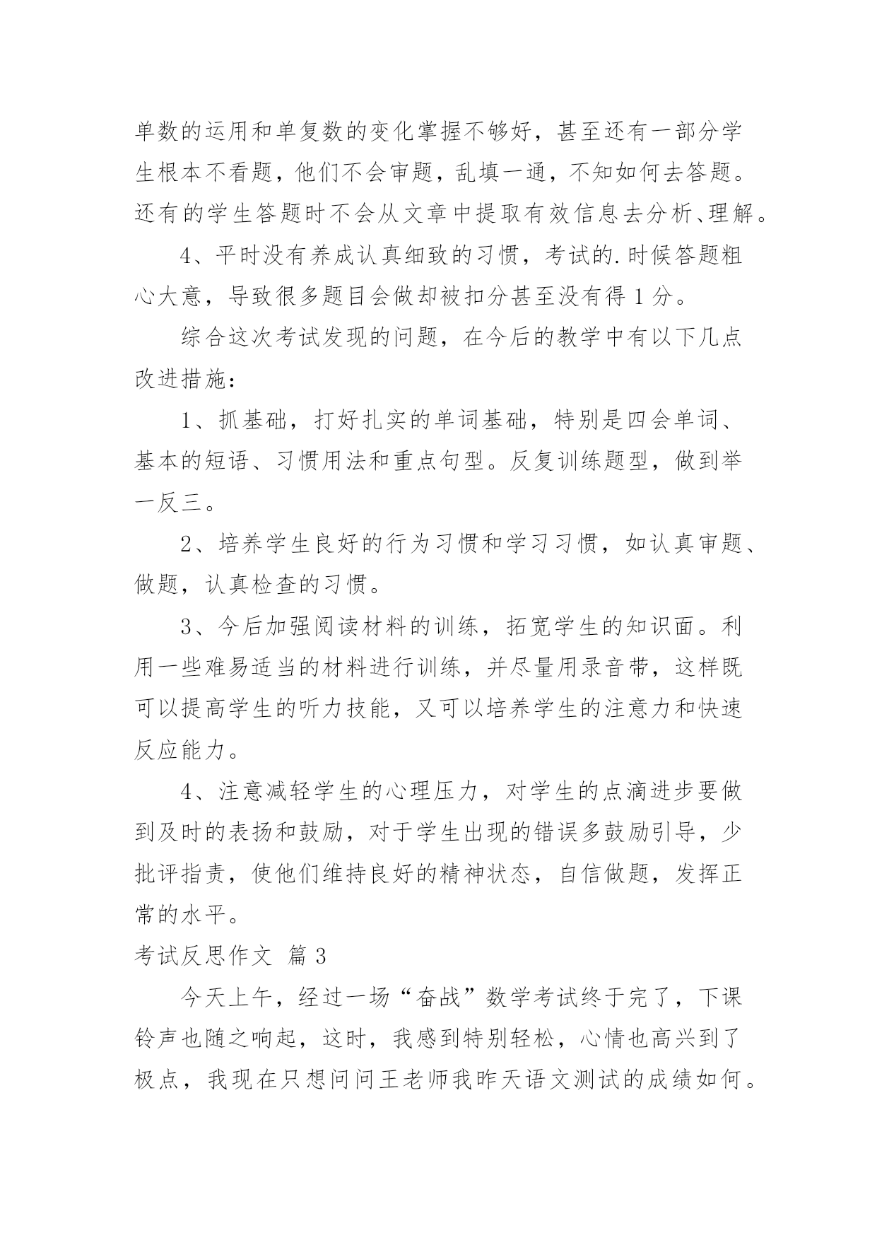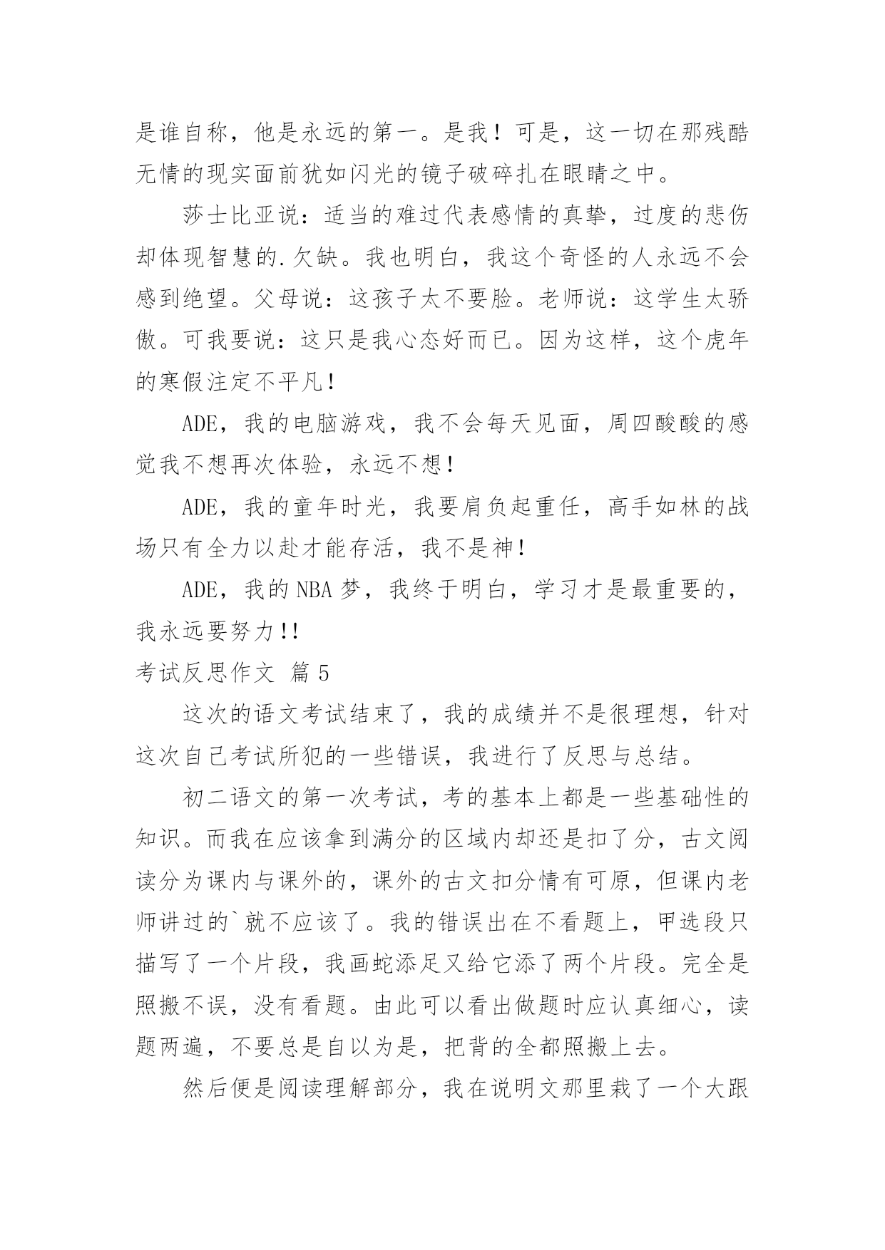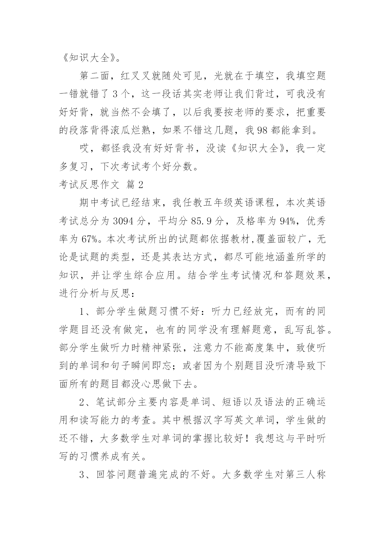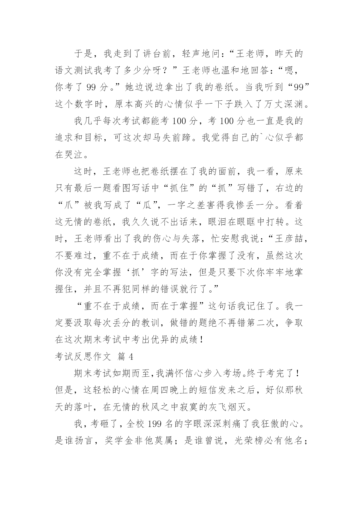 考试反思作文考试反思作文精选【5篇】在我们平凡的日常里,大家都写过作文吧,借助作文人们可以反映客观事物、表达思想感情、传递知识信息。那么,怎么去写作文呢?以下是小编收集整理的考试反思作文5篇,仅供参考,希望能够帮助到大家。考试反思作文篇1这个星期的星期三,我们考试复习了第二单元,虽说这次卷子比上次的要简单,可许多课外知识和填空都拦住了我的'去路,考试试卷整整一天都没发下来,可能是因为我们考的差吧!直到今天早上卷子才发了下来。早晨,老师拿着一叠卷子走了进来,大家马上停止了早读,教室里安静极了,连一根针掉到地上都听得见,大家都屏息凝神地注视着卷子,我的心也像挂了十几个水桶——七上八下,“唰”“唰”老师把卷子发了下来,我很快找到了我的卷子,呀,一个大大的94直往我眼里扑,打开试卷正面通红一片,那一个个叉,一个个圈真是刺眼,仿佛在嘲笑我说:“基础题不过关。”于是,我开始寻找我的错误。虽然我考了第一,但还有许多不会做的题。第一面,我没什么错,只有一个照样子写成语的错,它给了我们一个将心比心,将心比心就能想到将计就计,,只要想到以牙还牙就能想到以毒攻毒,可见我平时积累太少了,今后得多背背《知识大全》。第二面,红叉叉就随处可见,光就在于填空,我填空题一错就错了3个,这一段话其实老师让我们背过,可我没有好好背,就当然不会填了,以后我要按老师的要求,把重要的段落背得滚瓜烂熟,如果不错这几题,我98都能拿到。哎,都怪我没有好好背书,没读《知识大全》,我一定多复习,下次考试考个好分数。考试反思作文篇2期中考试已经结束,我任教五年级英语课程,本次英语考试总分为3094分,平均分85.9分,及格率为94%,优秀率为67%。本次考试所出的试题都依据教材,覆盖面较广,无论是试题的类型,还是其表达方式,都尽可能地涵盖所学的知识,并让学生综合应用。结合学生考试情况和答题效果,进行分析与反思:1、部分学生做题习惯不好:听力已经放完,而有的同学题目还没有做完,也有的同学没有理解题意,乱写乱答。部分学生做听力时精神紧张,注意力不能高度集中,致使听到的单词和句子瞬间即忘;或者因为个别题目没听清导致下面所有的题目都没心思做下去。2、笔试部分主要内容是单词、短语以及语法的正确运用和读写能力的考查。其中根据汉字写英文单词,学生做的还不错,大多数学生对单词的掌握比较好!我想这与平时听写的习惯养成有关。3、回答问题普遍完成的不好。大多数学生对第三人称单数的运用和单复数的变化掌握不够好,甚至还有一部分学生根本不看题,他们不会审题,乱填一通,不知如何去答题。还有的学生答题时不会从文章中提取有效信息去分析、理解。4、平时没有养成认真细致的习惯,考试的.时候答题粗心大意,导致很多题目会做却被扣分甚至没有得1分。综合这次考试发现的问题,在今后的教学中有以下几点改进措施:1、抓基础,打好扎实的单词基础,特别是四会单词、基本的短语、习惯用法和重点句型。反复训练题型,做到举一反三。2、培养学生良好的行为习惯和学习习惯,如认真审题、做题,认真检查的习惯。3、今后加强阅读材料的训练,拓宽学生的知识面。利用一些难易适当的材料进行训练,并尽量用录音带,这样既可以提高学生的听力技能,又可以培养学生的注意力和快速反应能力。4、注意减轻学生的心理压力,对学生的点滴进步要做到及时的表扬和鼓励,对于学生出现的错误多鼓励引导,少批评指责,使他们维持良好的精神状态,自信做题,发挥正常的水平。考试反思作文篇3今天上午,经过一场“奋战”数学考试终于完了,下课铃声也随之响起,这时,我感到特别轻松,心情也高兴到了极点,我现在只想问问王老师我昨天语文测试的成绩如何。于是,我走到了讲台前,轻声地问:“王老师,昨天的语文测试我考了多少分呀?”王老师也温和地回答:“嗯,你考了99分。”她边说边拿出了我的卷纸。当我听到“99”这个数字时,原本高兴的心情似乎一下子跌入了万丈深渊。我几乎每次考试都能考100分,考100分也一直是我的追求和目标,可这次却马失前蹄。我觉得自己的`心似乎都在哭泣。这时,王老师也把卷纸摆在了我的面前,我一看,原来只有最后一题看图写话中“抓住”的“抓”写错了,右边的“爪”被我写成了“瓜”,一字之差害得我惨丢一分。看着这无情的卷纸,我久久说不出话来,眼泪在眼眶中打转。这时,王老师看出了我的伤心与失落,忙安慰我说:“王彦喆,不要难过,重不在于成绩,而在于你掌握了没有,虽然这次你没有完全掌握‘抓’字的写法,但是只要下次你牢牢地掌握住,并且不再犯同样的错误就行了。”“重不在于成绩,而在于掌握”这句话我记住了。我一定要汲取每次丢分的教训,做错的题绝不再错第二次,争取在这次期末考试中考出优异的成绩!考试反思作文篇4期末考试如期而至,我满怀信心步入考场。终于考完了!但是,这轻松的心情在周四晚上的短信发来之后,好似那秋天的落