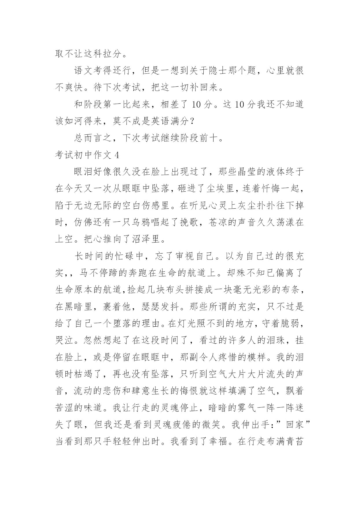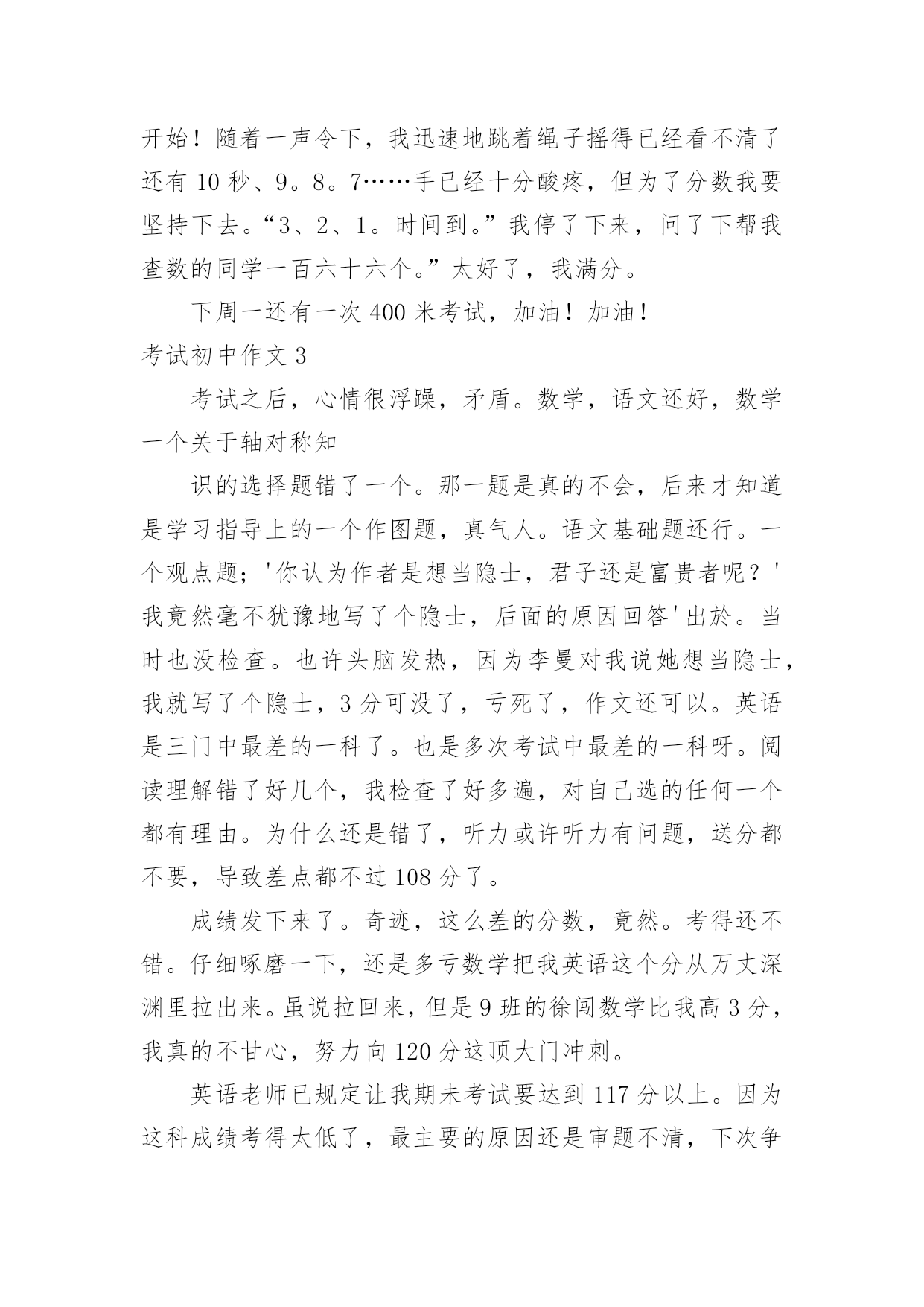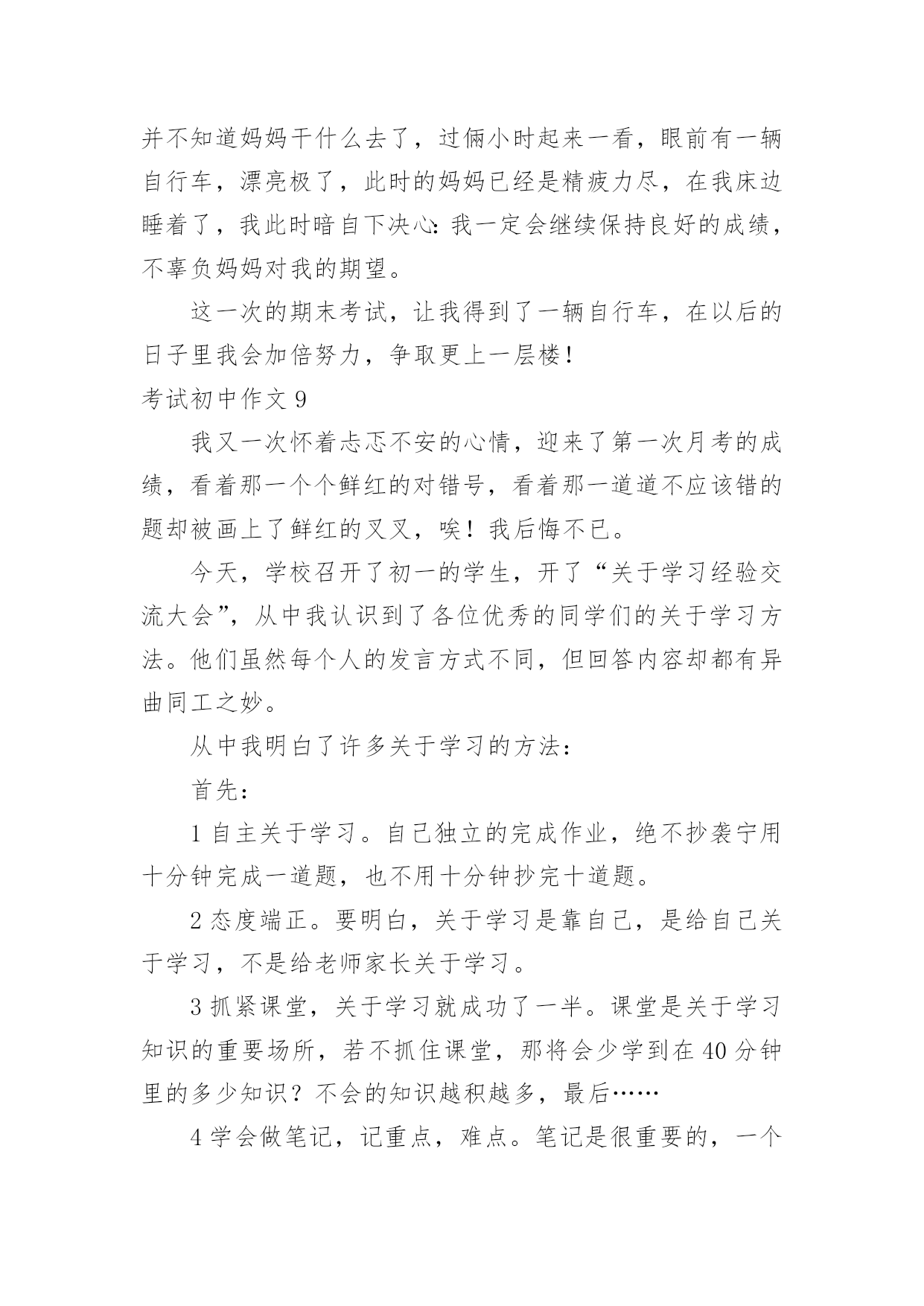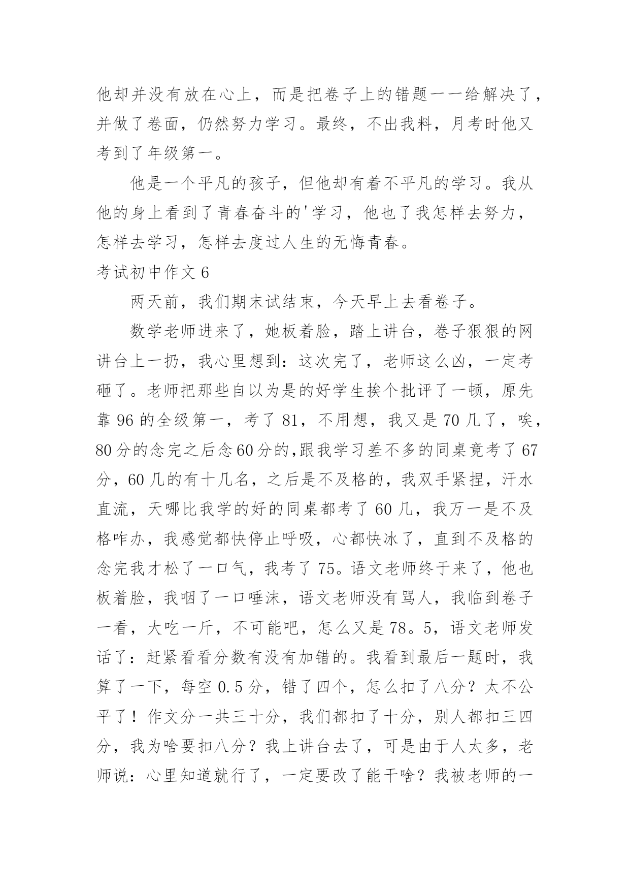 考试初中作文考试初中作文【荐】在平平淡淡的日常中,说到作文,大家肯定都不陌生吧,写作文是培养人们的观察力、联想力、想象力、思考力和记忆力的重要手段。你知道作文怎样写才规范吗?下面是小编整理的考试初中作文,仅供参考,大家一起来看看吧。考试初中作文1现在已经快进入期末复习状态上了,我们就不应该再玩了,而是应该抽空多复习复习期末考个好成绩。虽然考试之前我们会有烦恼,总是惴惴不安的。那就开始复习吧,像数学什么的不能一下见成效,必须多用功,期末考试的题理所当然是要比期中考试的难,所以期中考试没有及格的同学肯定更要努力用功才可能及格,我们虽然没别人聪明,但是只要我们勤劳努力用功未必考试比好同学差,不是人家都说笨鸟先飞吗。我们虽然不聪明但是只要我们勤劳肯定能提高。我的小学同学跟我说过学习的一个窍门,就是一边背一边比划一边把那些枯燥的东西和你感兴趣的事联系在一起,世界史上有一老兄叫伊达尔哥,就记成你打我哥,不就好记多了么。也许是有点傻,但成效还不错。如果你是理科生,那就在考试前多被几条英语短语和经典的例句,留作作文时候用,有一句出彩的句子很管用的。数学嘛~~翻翻你的卷子和参考书,有一些题目是常考的,在考试前粘着老师,学只要我们会它。这些都是些考试应急的方法。也许你都作了也只是多了10分,但总是好的开始嘛!语文只要把老师告诉我们的重点背下来,上课在好好听听老师讲课把阅读这块怎么答题,语文就能考一个好成绩。期末真的很快就要来了,希望大家能和我一样多复习在期末考个好成绩,不要因为当时没有好好复习期末没有考个好成绩而后悔。考试初中作文2初中的第一个学期即将结束同时,这也意味着期末考试即将来临,这不,体育已经考完三分之二了。昨天下午,我们男生考跳远女生考跳绳。我在队伍靠后一点,所以趁热身的时间,活动了一下手腕和胸腕,转动力一下脖子,又试着跑了几次,感觉还不错,很快就轮到我了。心想:平时的成绩时候都有1米7左右,偶尔也发挥好一点跳个1米8,今天怎么着也能跳个1米子7。这样想想,心中充满了自信,竭尽全力跳了出去,“1.59米”?!不可能!刚才是我大意了,这一次一定要跳到179米。我用又用用尽全力向高分跳去。什么?只有1,6米!不可能?虽然我心里有一百个不愿意,却也没有办法。因为每个人只有两次机会。很快一天过去了,今天与昨天来了过来,我们男生先是跑了20xx米。热身完牛后又练习了一会,考试就开始。我心想,昨天的跳远自丢了分,今天的跳绳一定要把分夺回来。开始!随着一声令下,我迅速地跳着绳子摇得已经看不清了还有10秒、9。8。7……手已经十分酸疼,但为了分数我要坚持下去。“3、2、1。时间到。”我停了下来,问了下帮我查数的同学一百六十六个。”太好了,我满分。下周一还有一次400米考试,加油!加油!考试初中作文3考试之后,心情很浮躁,矛盾。数学,语文还好,数学一个关于轴对称知识的选择题错了一个。那一题是真的不会,后来才知道是学习指导上的一个作图题,真气人。语文基础题还行。一个观点题;'你认为作者是想当隐士,君子还是富贵者呢?'我竟然毫不犹豫地写了个隐士,后面的原因回答'出於。当时也没检查。也许头脑发热,因为李曼对我说她想当隐士,我就写了个隐士,3分可没了,亏死了,作文还可以。英语是三门中最差的一科了。也是多次考试中最差的一科呀。阅读理解错了好几个,我检查了好多遍,对自己选的任何一个都有理由。为什么还是错了,听力或许听力有问题,送分都不要,导致差点都不过108分了。成绩发下来了。奇迹,这么差的分数,竟然。考得还不错。仔细啄磨一下,还是多亏数学把我英语这个分从万丈深渊里拉出来。虽说拉回来,但是9班的徐闯数学比我高3分,我真的不甘心,努力向120分这顶大门冲刺。英语老师已规定让我期未考试要达到117分以上。因为这科成绩考得太低了,最主要的原因还是审题不清,下次争取不让这科拉分。语文考得还行,但是一想到关于隐士那个题,心里就很不爽快。待下次考试,把这一切补回来。和阶段第一比起来,相差了10分。这10分我还不知道该如河得来,莫不成是英语满分?总而言之,下次考试继续阶段前十。考试初中作文4眼泪好像很久没在脸上出现过了,那些晶莹的液体终于在今天又一次从眼眶中坠落,砸进了尘埃里,连着忏悔一起,陷于无边无际的空白伤感里。在听见心灵上灰尘扑扑往下掉时,仿佛还有一只乌鸦唱起了挽歌,苍凉的声音久久荡漾在上空。把心推向了沼泽里。长时间的忙碌中,忘了审视自己。以为自己过的很充实,,马不停蹄的奔跑在生命的航道上。却殊不知已偏离了生命原本的航道,捡起几块布头拼接成一块毫无光彩的布条,在黑暗里,裹着他,瑟瑟发抖。那些所谓的充实,只不过是给了自己一个堕落的理由。在灯光照不到的地方,守着脆弱,哭泣。忽然想起了在这段时间了,看过的许多人的泪珠,挂在脸上,或是停留在眼眶中,那副令人疼惜的模样。我的泪顿