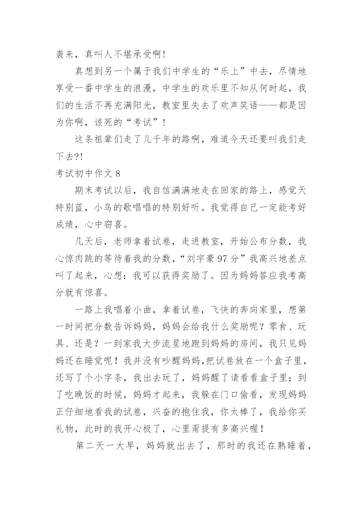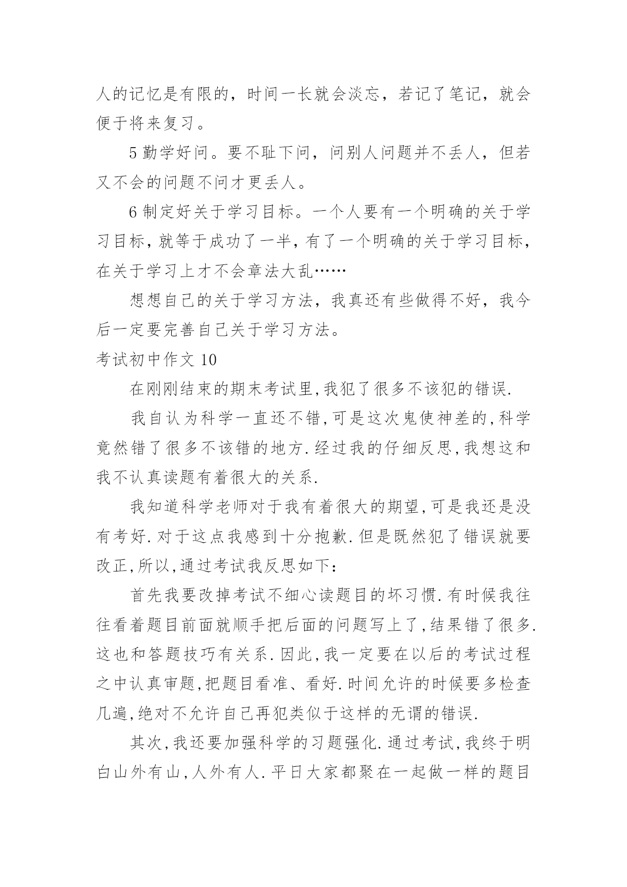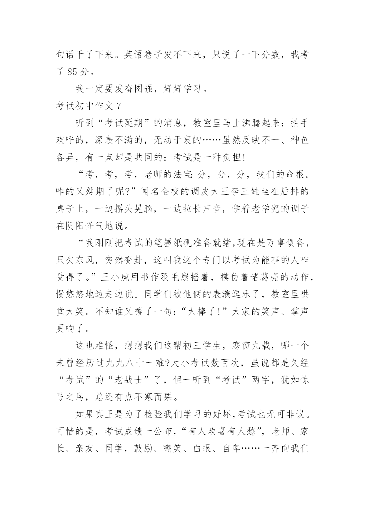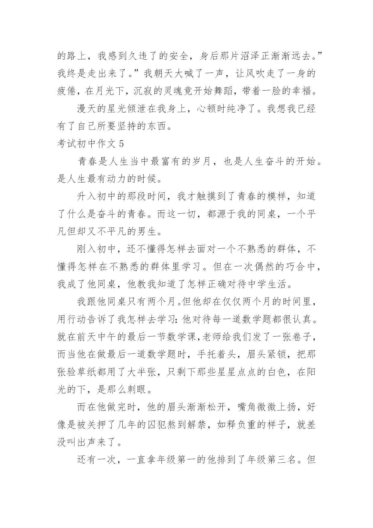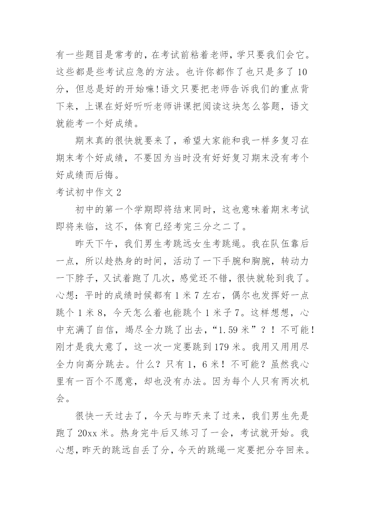 考试初中作文考试初中作文【荐】在平平淡淡的日常中,说到作文,大家肯定都不陌生吧,写作文是培养人们的观察力、联想力、想象力、思考力和记忆力的重要手段。你知道作文怎样写才规范吗?下面是小编整理的考试初中作文,仅供参考,大家一起来看看吧。考试初中作文1现在已经快进入期末复习状态上了,我们就不应该再玩了,而是应该抽空多复习复习期末考个好成绩。虽然考试之前我们会有烦恼,总是惴惴不安的。那就开始复习吧,像数学什么的不能一下见成效,必须多用功,期末考试的题理所当然是要比期中考试的难,所以期中考试没有及格的同学肯定更要努力用功才可能及格,我们虽然没别人聪明,但是只要我们勤劳努力用功未必考试比好同学差,不是人家都说笨鸟先飞吗。我们虽然不聪明但是只要我们勤劳肯定能提高。我的小学同学跟我说过学习的一个窍门,就是一边背一边比划一边把那些枯燥的东西和你感兴趣的事联系在一起,世界史上有一老兄叫伊达尔哥,就记成你打我哥,不就好记多了么。也许是有点傻,但成效还不错。如果你是理科生,那就在考试前多被几条英语短语和经典的例句,留作作文时候用,有一句出彩的句子很管用的。数学嘛~~翻翻你的卷子和参考书,有一些题目是常考的,在考试前粘着老师,学只要我们会它。这些都是些考试应急的方法。也许你都作了也只是多了10分,但总是好的开始嘛!语文只要把老师告诉我们的重点背下来,上课在好好听听老师讲课把阅读这块怎么答题,语文就能考一个好成绩。期末真的很快就要来了,希望大家能和我一样多复习在期末考个好成绩,不要因为当时没有好好复习期末没有考个好成绩而后悔。考试初中作文2初中的第一个学期即将结束同时,这也意味着期末考试即将来临,这不,体育已经考完三分之二了。昨天下午,我们男生考跳远女生考跳绳。我在队伍靠后一点,所以趁热身的时间,活动了一下手腕和胸腕,转动力一下脖子,又试着跑了几次,感觉还不错,很快就轮到我了。心想:平时的成绩时候都有1米7左右,偶尔也发挥好一点跳个1米8,今天怎么着也能跳个1米子7。这样想想,心中充满了自信,竭尽全力跳了出去,“1.59米”?!不可能!刚才是我大意了,这一次一定要跳到179米。我用又用用尽全力向高分跳去。什么?只有1,6米!不可能?虽然我心里有一百个不愿意,却也没有办法。因为每个人只有两次机会。很快一天过去了,今天与昨天来了过来,我们男生先是跑了20xx米。热身完牛后又练习了一会,考试就开始。我心想,昨天的跳远自丢了分,今天的跳绳一定要把分夺回来。开始!随着一声令下,我迅速地跳着绳子摇得已经看不清了还有10秒、9。8。7……手已经十分酸疼,但为了分数我要坚持下去。“3、2、1。时间到。”我停了下来,问了下帮我查数的同学一百六十六个。”太好了,我满分。下周一还有一次400米考试,加油!加油!考试初中作文3考试之后,心情很浮躁,矛盾。数学,语文还好,数学一个关于轴对称知识的选择题错了一个。那一题是真的不会,后来才知道是学习指导上的一个作图题,真气人。语文基础题还行。一个观点题;'你认为作者是想当隐士,君子还是富贵者呢?'我竟然毫不犹豫地写了个隐士,后面的原因回答'出於。当时也没检查。也许头脑发热,因为李曼对我说她想当隐士,我就写了个隐士,3分可没了,亏死了,作文还可以。英语是三门中最差的一科了。也是多次考试中最差的一科呀。阅读理解错了好几个,我检查了好多遍,对自己选的任何一个都有理由。为什么还是错了,听力或许听力有问题,送分都不要,导致差点都不过108分了。成绩发下来了。奇迹,这么差的分数,竟然。考得还不错。仔细啄磨一下,还是多亏数学把我英语这个分从万丈深渊里拉出来。虽说拉回来,但是9班的徐闯数学比我高3分,我真的不甘心,努力向120分这顶大门冲刺。英语老师已规定让我期未考试要达到117分以上。因为这科成绩考得太低了,最主要的原因还是审题不清,下次争取不让这科拉分。语文考得还行,但是一想到关于隐士那个题,心里就很不爽快。待下次考试,把这一切补回来。和阶段第一比起来,相差了10分。这10分我还不知道该如河得来,莫不成是英语满分?总而言之,下次考试继续阶段前十。考试初中作文4眼泪好像很久没在脸上出现过了,那些晶莹的液体终于在今天又一次从眼眶中坠落,砸进了尘埃里,连着忏悔一起,陷于无边无际的空白伤感里。在听见心灵上灰尘扑扑往下掉时,仿佛还有一只乌鸦唱起了挽歌,苍凉的声音久久荡漾在上空。把心推向了沼泽里。长时间的忙碌中,忘了审视自己。以为自己过的很充实,,马不停蹄的奔跑在生命的航道上。却殊不知已偏离了生命原本的航道,捡起几块布头拼接成一块毫无光彩的布条,在黑暗里,裹着他,瑟瑟发抖。那些所谓的充实,只不过是给了自己一个堕落的理由。在灯光照不到的地方,守着脆弱,哭泣。忽然想起了在这段时间了,看过的许多人的泪珠,挂在脸上,或是停留在眼眶中,那副令人疼惜的模样。我的泪顿