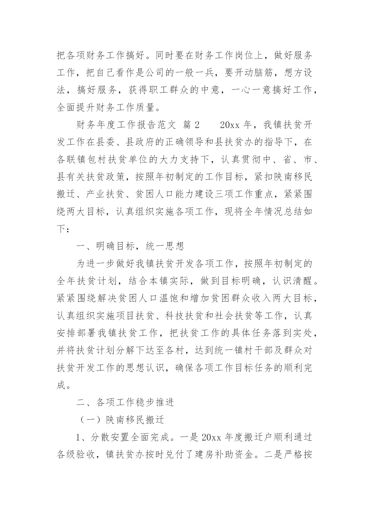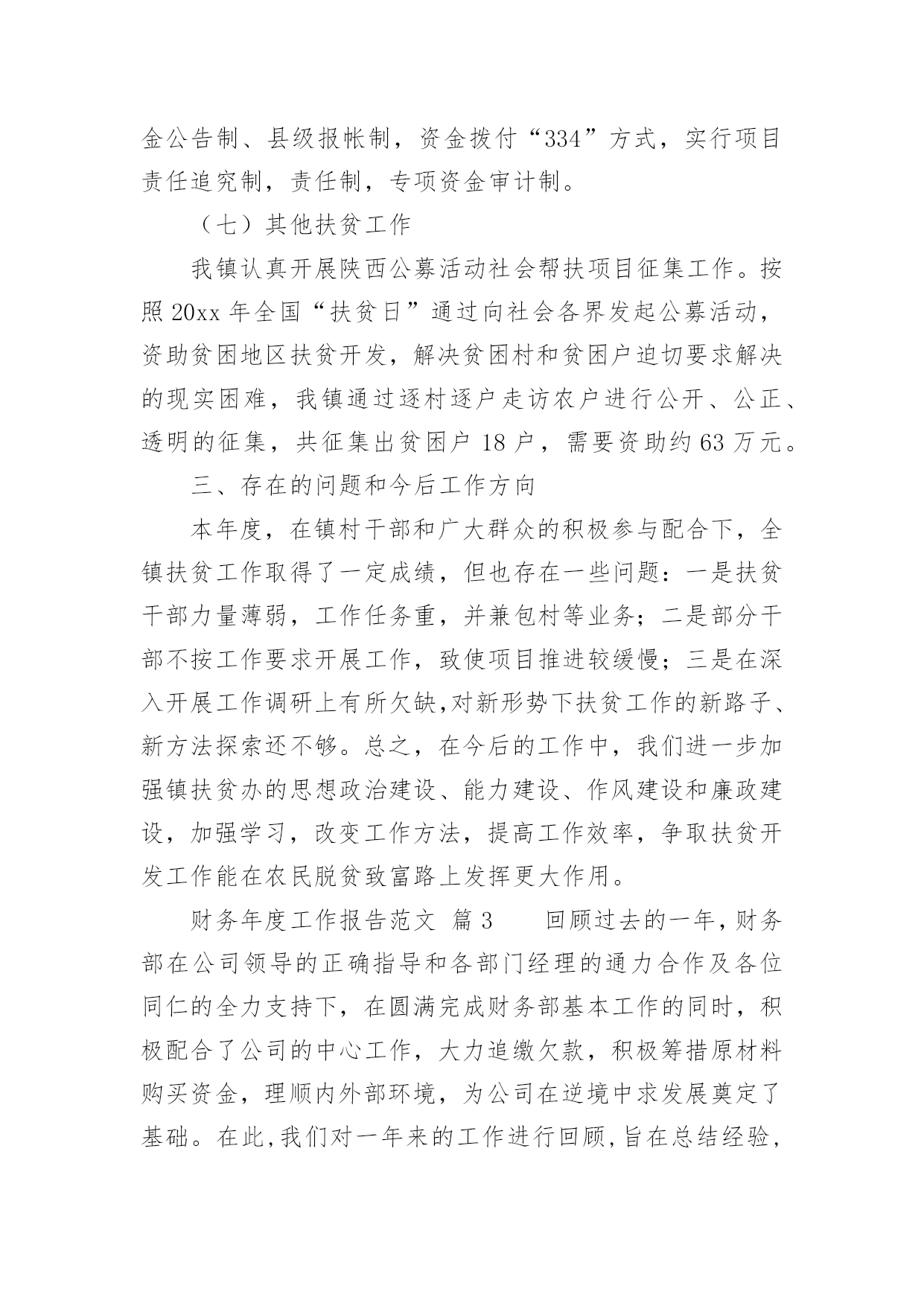 财务年度工作报告财务年度工作报告范文[热门]在日常生活和工作中,我们使用报告的情况越来越多,报告成为了一种新兴产业。我敢肯定,大部分人都对写报告很是头疼的,下面是小编精心整理的财务年度工作报告范文,仅供参考,大家一起来看看吧。财务年度工作报告范文篇120xx年公司的生产经营工作遇到了一些困难,我们财务部也不例外。但是通过部门全体同事的努力以及各部门大力支持和积极配合下,我们逐步走出困境,各项工作开始正常化。我们财务部依据领导班子的工作意见,围绕公司的中心目标,结合本部门的实际情况和工作重点,群策群力,充分调动全体财务人员的工作积极性和工作能动性,精心安排,通力合作,根本完成了20xx年的财务工作,取得了一定的工作成绩。现将20xx年财务部工作情况具体总结如下:一、认真细致做好财务日常工作为了适应市场经济的要求,实现公司全年目标工作任务,我们财务部全面标准会计核算和财务管理工作,充分发挥预算管理的功能,进一步加强财务核算和财务监督功能,使财务人员做到既当家又理财,认真搞好各项财务工作。一是认真、细致地做好会计报销、工资发放、会计原始凭证、记账凭证的审核、记账、装订及相关财政、税务票据的领用、核销等日常会计核算、会计监督工作,做到工作认真、认真、无过失。二是按会计档案管理的要求及时进行会计档案的整理、归档工作,确保会计档案全面、完整,便于以后日常查阅和利用。三是积极与相关税务主管部门联系,争取相关部门对我公司的理解与支持,限度的利用国家相关的福利企业税收优惠政策,为公司节约每一分资金,创造经济效益,确保公司开展和生产经营工作的正常开展。四是在做好自己本职工作的同时,我们财务部坚持“公司工作一盘棋”,积极配合相关部门的工作,利用财务部现有的各项资源做好力所能及的工作,为公司的开展做出我们应尽的努力。二、制定各项财务本钱计划,严格操纵本钱费用我们财务部依据公司实际制定各项财务本钱计划,严格操纵本钱费用,为增加公司经济效益,从产量、本钱和收入三者的关系来操纵本钱。同时,把本钱操纵贯穿于公司生产经营全过程,让本钱操纵、节约的观念成为每个部门、每一个员工的自觉行动。通过精细化管理和有效的方法促使每个部门、每个员工都从根底工作抓起,从点滴抓起,力求走好每一步,抓好每件事,让每一个人、每一分钱、每一份资源都发挥作用,都为公司创造价值。三、做好资金调拨工作,合理操纵公司总体资金规模为了保证有限的资金能满足公司正常生产与日常开支需要,为此,我们财务部一方面及时与客户对账,加强销货款的及时回笼,在资金安排上,做到公正、透明,先急后缓。另一方面,依据公司经营方针与计划,合理地安排融资进度与额度,选择相对利率较低的银行去贷款,以保证生产经营所需。这样,通过以资金为纽带的.综合调控,推动了公司生产经营开展的有序进行,今年我公司负责xx项目,该项目计划投资1.8亿目前已投资三千五百万元已预收房款近5000万元本年贷款1500万元。四、加强财务会计制度建设,提高财务信息质量我们财务部加强财务会计制度建设,用制度标准财务工作,严格落实到实际财务工作中。同时切实提高会计信息的质量,要求会计报表报送时间必须及时,做到数据准确、报表格式标准、完整,提高了会计信息的质量,为公司领导决策和管理者进行财务分析提供了可靠、有用的信息。五、明确工作岗位职责,提高财务人员责任性虽然我们财务部只有4名工作人员,但每个人都能明确自己的岗位职责权限、工作分工和纪律要求,从而认真做好工作。同时要求他们进行工作总结,岗位评述和认定,对各自的工作提出建议、作出打算。这样,强化了各岗位会计人员的责任感,加强了内部核算监督,推动了各岗位的交流、合作与团结。六、加强团队建设,做好服务工作搞好财务工作,团队建设是根本。我们财务部要求每个会计人员牢固确立“以人为本”的管理理念,认真听取职工的意见与建议,与职工同呼吸,共命运,加快各项工作开展。每个会计人员要辛勤努力、廉洁清正和勤俭朴素,提高自己的综合素养,充分调开工作积极性,团结一致,齐心协力,把各项财务工作搞好。同时要在财务工作岗位上,做好服务工作,把自己看作是公司的一般一兵,要开动脑筋,想方设法,搞好服务,获得职工群众的中意,一心一意搞好工作,全面提升财务工作质量。财务年度工作报告范文篇220xx年,我镇扶贫开发工作在县委、县政府的正确领导和县扶贫办的指导下,在各联镇包村扶贫单位的大力支持下,认真贯彻中、省、市、县有关扶贫政策,按照年初制定的工作目标,紧扣陕南移民搬迁、产业扶贫、贫困人口能力建设三项工作重点,紧紧围绕两大目标,认真组织实施各项工作,现将全年情况总结如下:一、明确目标,统一思想为进一步做好我镇扶贫开发各项工作,按照年初制定的全年扶贫计划,结合本镇实际,做到目标明确,认识清醒。紧紧围绕解决贫困人口温饱和增加贫困群众收入两大目标,认真