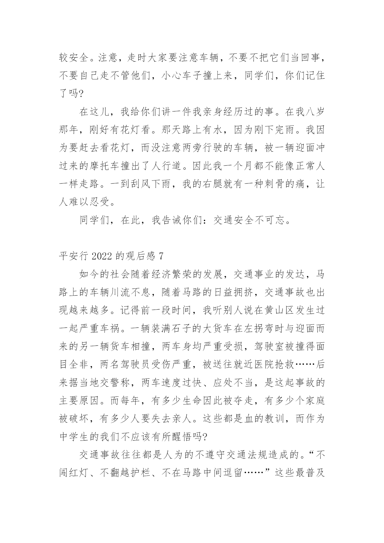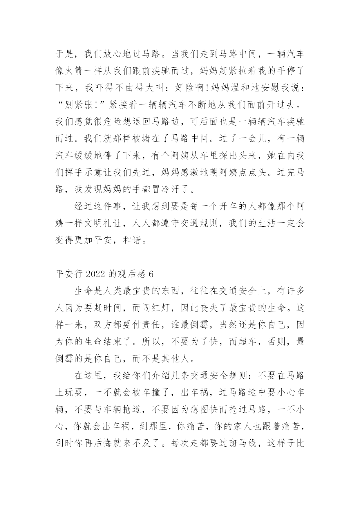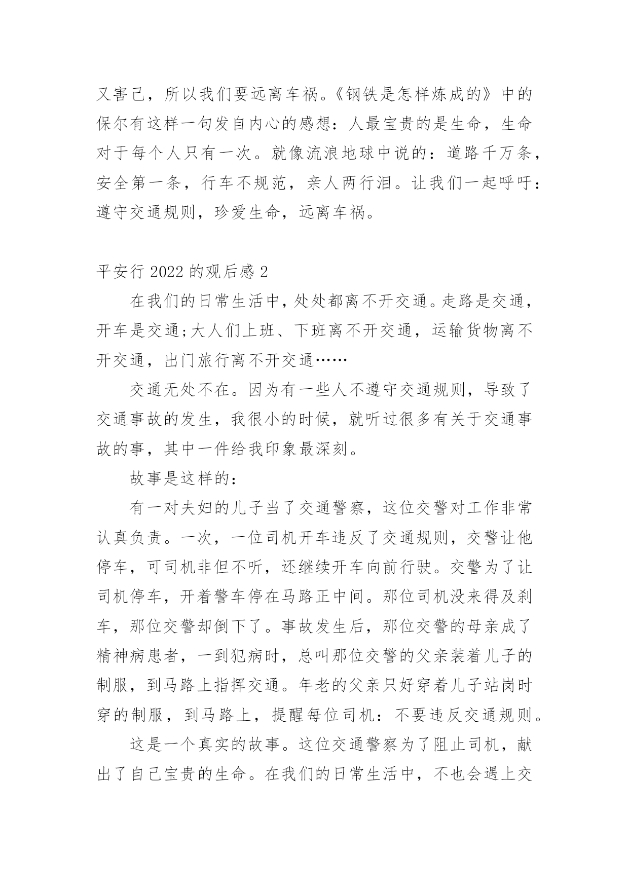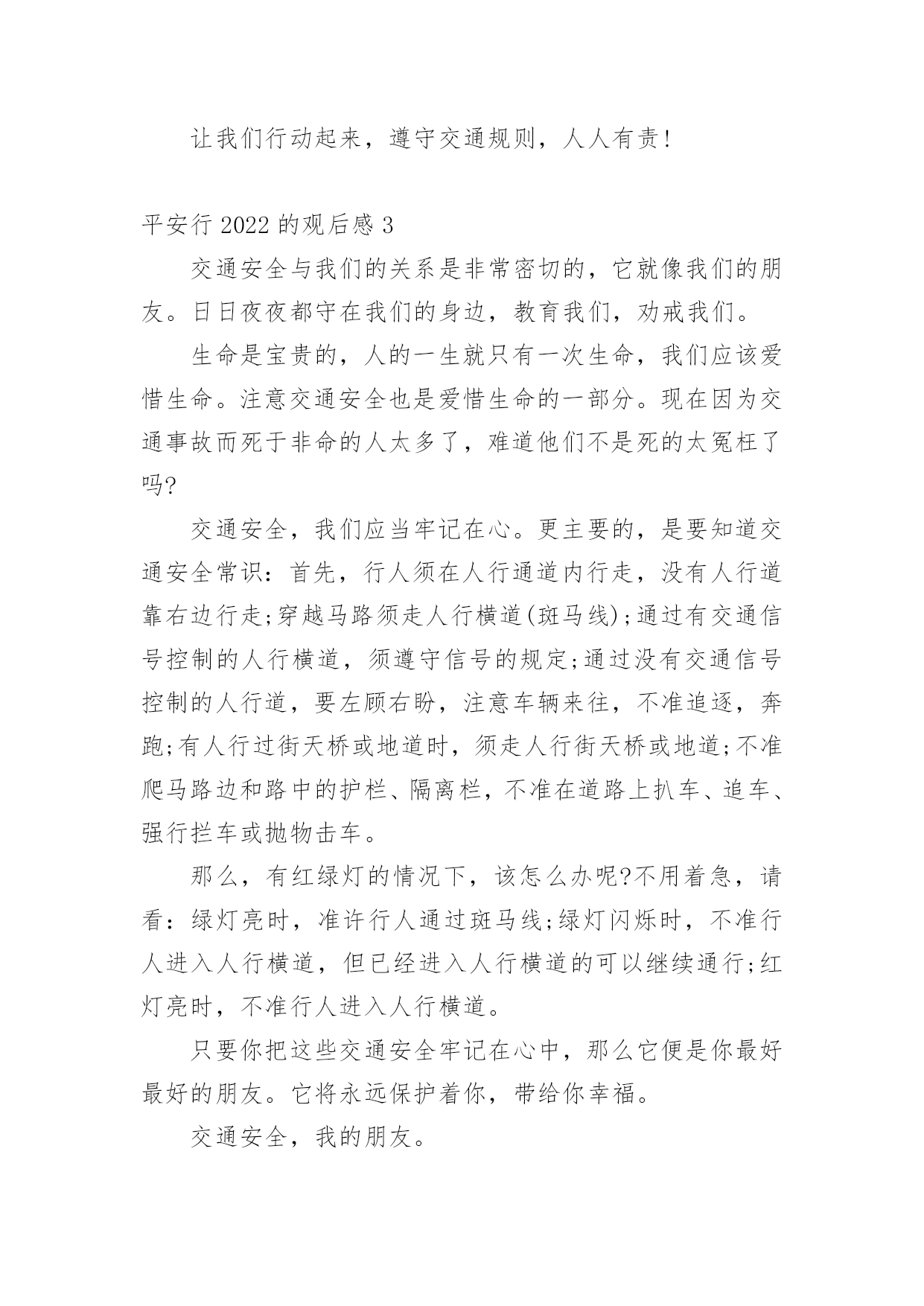 平安行2022的观后感看完一部影视作品以后,这次观看让你心中有什么感想呢?这时我们很有必要写一篇观后感了。现在你是否对观后感一筹莫展呢?以下是小编为大家整理的平安行2022的观后感范文(精选12篇),欢迎阅读,希望大家能够喜欢。平安行2022的观后感1首先大屏幕上映入眼帘的是:文明礼让,平安出行。俞警官给我们普及了一下交通的四要素:人,车,路,环境。人是主导地位,所有的违章违法都是人造成的。我们的城市已变得越来越美丽,马路上车辆川流不息的景象随处可见。然而由于有些人交通安全意识的.淡薄,在车水马龙的马路上演了一幕幕不可挽回的悲剧。交通安全关乎生命,生命没有彩排。全国每年有10万的人死于车祸,每六分钟就有一人死于交通事故。当屏幕上一个个小视频中播放着发生在我们附近的一起起的车祸,当一条条鲜活的生命消失在车轮下时,内心久久无法平静。车祸,让很多的家庭支离破碎,让幸福在车祸中断送。很多肇事司机在一失足间铸就了千古恨。触目惊心的数字,不计其数的亲人就在车祸的转眼间中沉醉在悲痛当中。当因超速超载而引出的惨痛的车祸;当想象他们丧失亲人时那悲痛欲尽的情形,谁还会感受不到生命的宝贵无处不在?超速行驶疏忽法律法规的要求结果酿成了大祸,酒后驾车,害人又害己,所以我们要远离车祸。《钢铁是怎样炼成的》中的保尔有这样一句发自内心的感想:人最宝贵的是生命,生命对于每个人只有一次。就像流浪地球中说的:道路千万条,安全第一条,行车不规范,亲人两行泪。让我们一起呼吁:遵守交通规则,珍爱生命,远离车祸。平安行2022的观后感2在我们的日常生活中,处处都离不开交通。走路是交通,开车是交通;大人们上班、下班离不开交通,运输货物离不开交通,出门旅行离不开交通……交通无处不在。因为有一些人不遵守交通规则,导致了交通事故的发生,我很小的时候,就听过很多有关于交通事故的事,其中一件给我印象最深刻。故事是这样的:有一对夫妇的儿子当了交通警察,这位交警对工作非常认真负责。一次,一位司机开车违反了交通规则,交警让他停车,可司机非但不听,还继续开车向前行驶。交警为了让司机停车,开着警车停在马路正中间。那位司机没来得及刹车,那位交警却倒下了。事故发生后,那位交警的母亲成了精神病患者,一到犯病时,总叫那位交警的父亲装着儿子的制服,到马路上指挥交通。年老的父亲只好穿着儿子站岗时穿的制服,到马路上,提醒每位司机:不要违反交通规则。这是一个真实的故事。这位交通警察为了阻止司机,献出了自己宝贵的生命。在我们的日常生活中,不也会遇上交通事故吗?据统计,我国每年至少有10万余人死于交通事故,多少无辜的生命啊!这都是人们不遵守交通规则而产生的悲剧,让许多家庭破碎了。可见,遵守交通规则在日常生活中是多么地重要啊!现在,马路宽阔、平坦了,道路顺畅了,交通规则也增多了。十字路口设置了红绿灯,可还是有人抢红灯;马路上有非机动车道和机动车道,可还是有司机弄错;马路口有斑马线,可还是有人过马路不走的斑马线;设置了铁轨,还是有人在新设置的铁轨上玩;建筑了高速公路,有人却攀爬高速公路。像这些危险的行为,如果一不留神,马上就会失去宝贵的生命。那么我们怎样预防交通事故呢?在此,我提出一些建议:1、不闯红灯,行人过马路要走斑马线。2、不酒后驾车,不骑英雄车,不在车上玩耍、打闹。3、非机动车走非机动车道,机动车走机动车道,行人、自行车靠边行。4、靠右行,靠边行。5、听从交警的指挥,不与交警发生冲突,不违章行车。交通是我们日常生活中不可缺少的一部分,人类离开了交通,就等于鱼儿离开了水。我们要避免交通事故的.发生。多少条宝贵的生命啊!男的,女的,老的,少的,就连刚生下的婴儿也惨死在无情的车轮下,刚刚诞生的一个新生命就这样被无情的车轮毁了,多么令人伤感啊!要是那些司机们都遵守交通规则,那该有多好啊!让我们行动起来,遵守交通规则,人人有责!平安行2022的观后感3交通安全与我们的关系是非常密切的,它就像我们的朋友。日日夜夜都守在我们的身边,教育我们,劝戒我们。生命是宝贵的,人的一生就只有一次生命,我们应该爱惜生命。注意交通安全也是爱惜生命的一部分。现在因为交通事故而死于非命的人太多了,难道他们不是死的太冤枉了吗?交通安全,我们应当牢记在心。更主要的,是要知道交通安全常识:首先,行人须在人行通道内行走,没有人行道靠右边行走;穿越马路须走人行横道(斑马线);通过有交通信号控制的人行横道,须遵守信号的规定;通过没有交通信号控制的人行道,要左顾右盼,注意车辆来往,不准追逐,奔跑;有人行过街天桥或地道时,须走人行街天桥或地道;不准爬马路边和路中的护栏、隔离栏,不准在道路上扒车、追车、强行拦车或抛物击车。那么,有红绿灯的情况下,该怎么办呢?不用着急,请看:绿灯亮时,准许行人通过斑马线;绿灯闪烁时,不准行人进入人行横道,但已经进入人行横道的