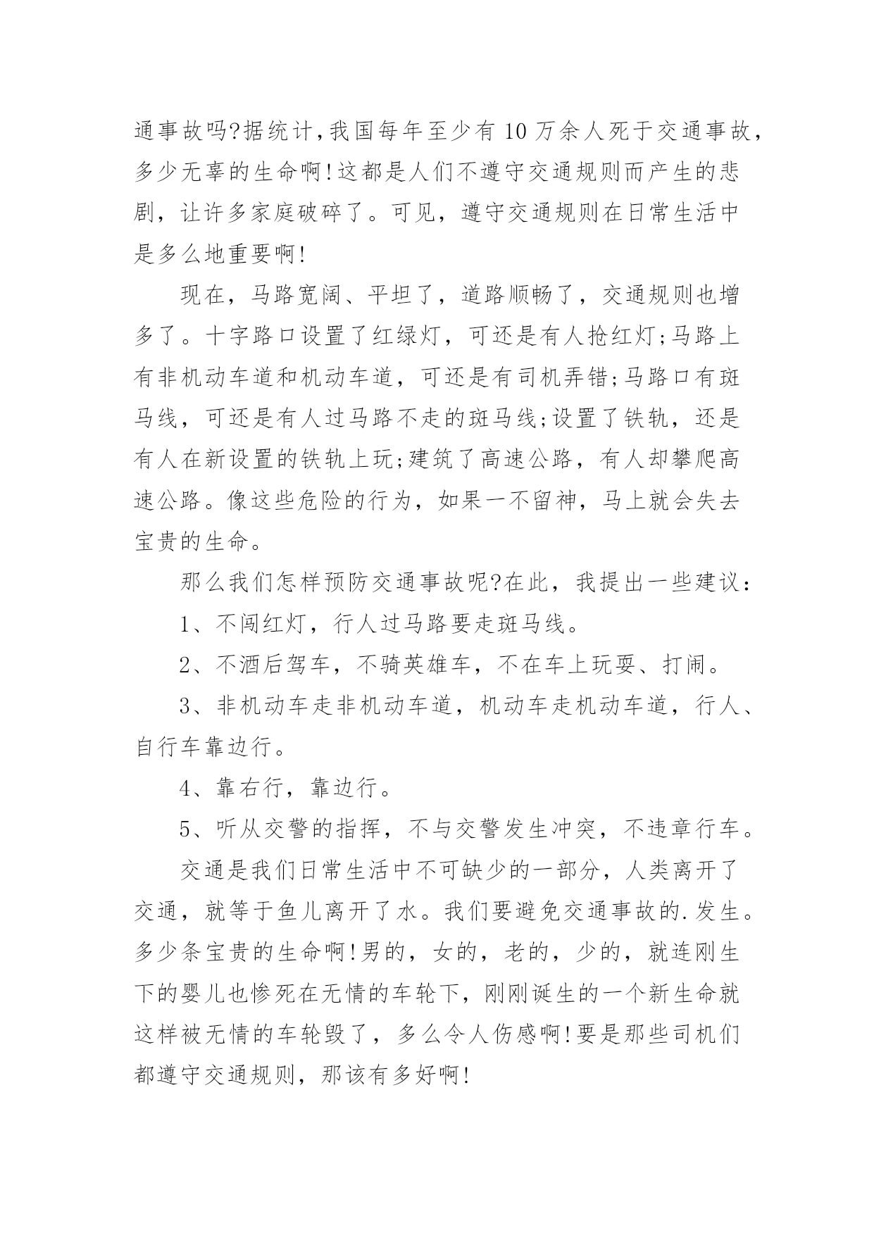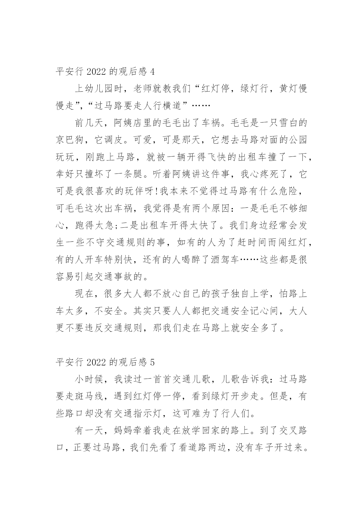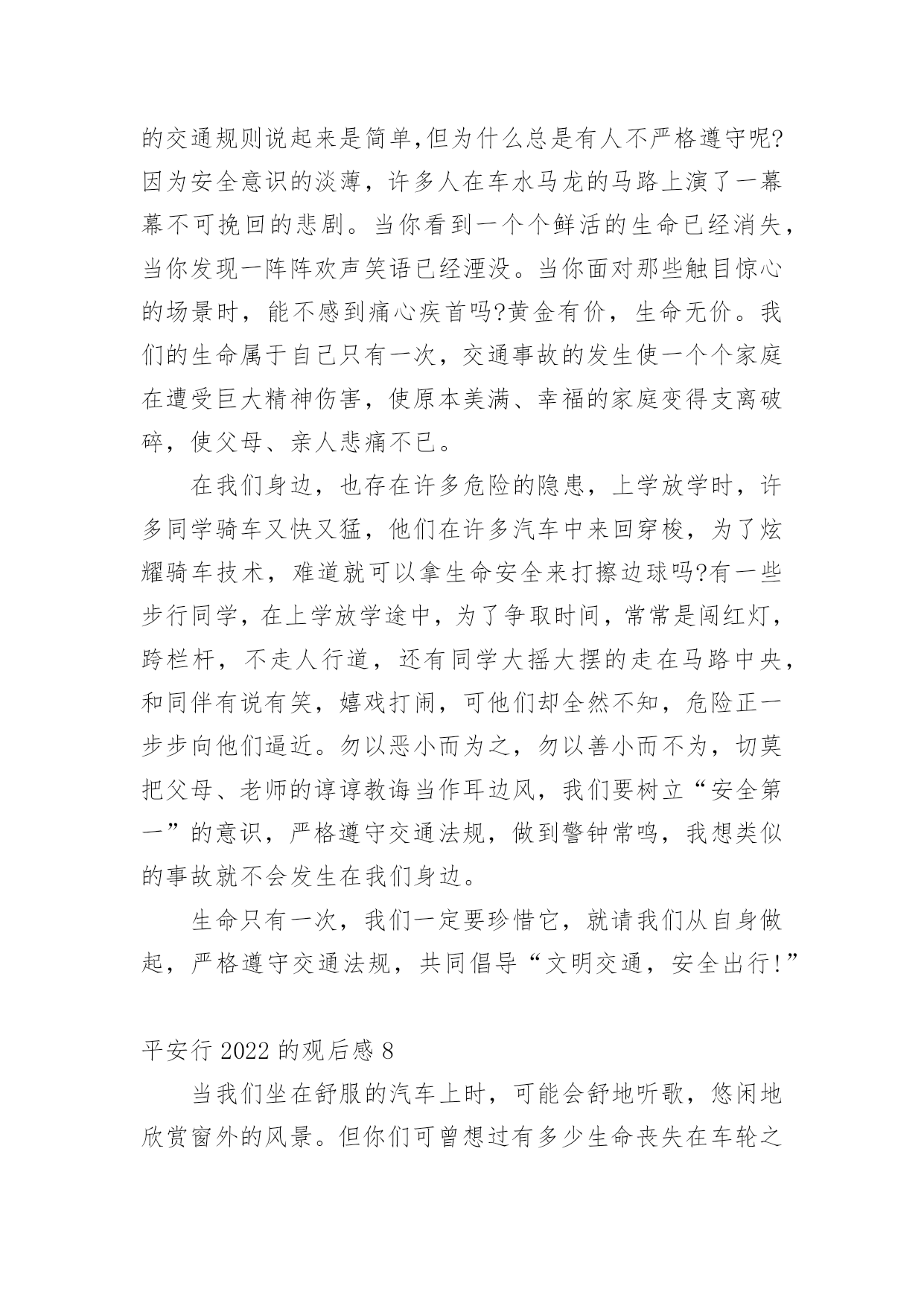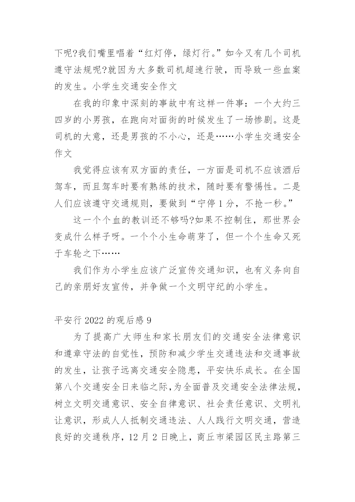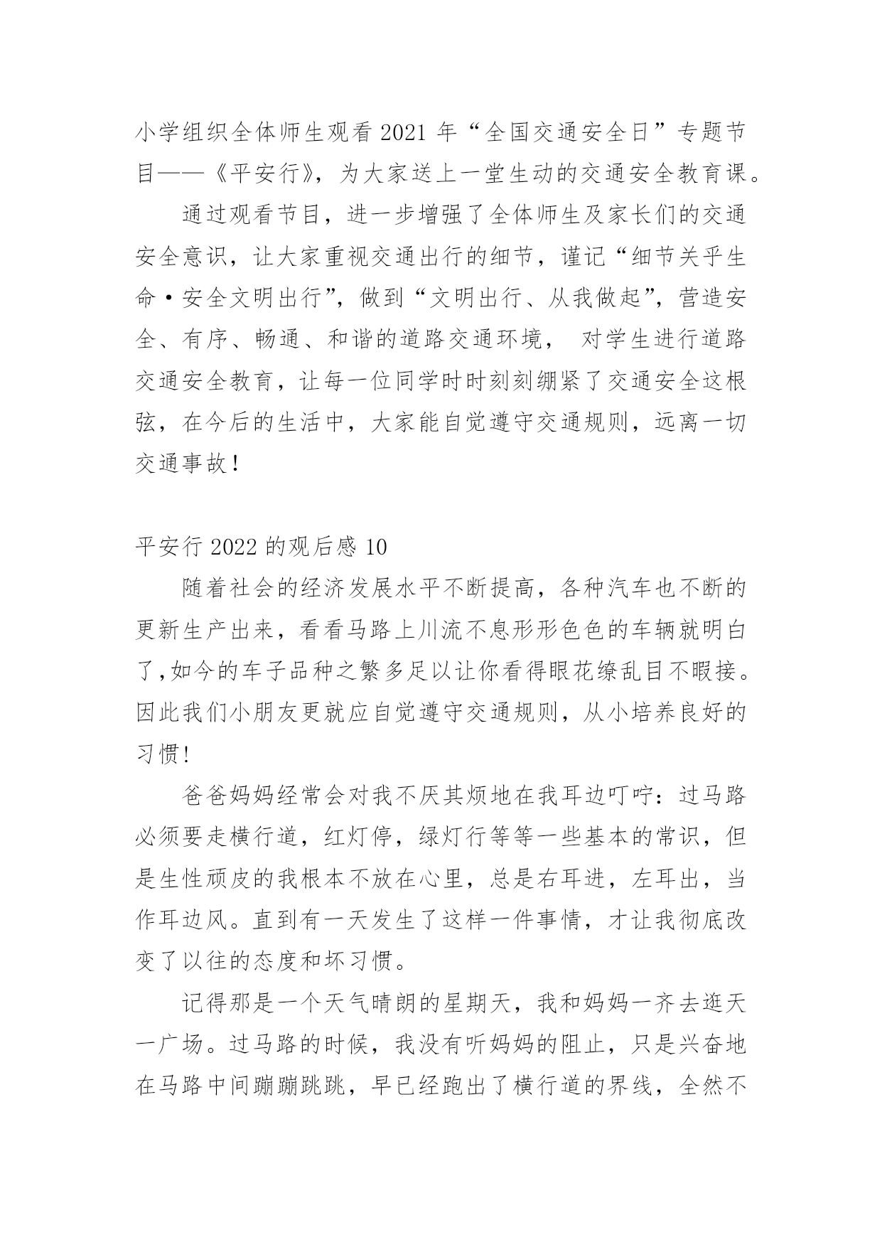 平安行2022的观后感看完一部影视作品以后,这次观看让你心中有什么感想呢?这时我们很有必要写一篇观后感了。现在你是否对观后感一筹莫展呢?以下是小编为大家整理的平安行2022的观后感范文(精选12篇),欢迎阅读,希望大家能够喜欢。平安行2022的观后感1首先大屏幕上映入眼帘的是:文明礼让,平安出行。俞警官给我们普及了一下交通的四要素:人,车,路,环境。人是主导地位,所有的违章违法都是人造成的。我们的城市已变得越来越美丽,马路上车辆川流不息的景象随处可见。然而由于有些人交通安全意识的.淡薄,在车水马龙的马路上演了一幕幕不可挽回的悲剧。交通安全关乎生命,生命没有彩排。全国每年有10万的人死于车祸,每六分钟就有一人死于交通事故。当屏幕上一个个小视频中播放着发生在我们附近的一起起的车祸,当一条条鲜活的生命消失在车轮下时,内心久久无法平静。车祸,让很多的家庭支离破碎,让幸福在车祸中断送。很多肇事司机在一失足间铸就了千古恨。触目惊心的数字,不计其数的亲人就在车祸的转眼间中沉醉在悲痛当中。当因超速超载而引出的惨痛的车祸;当想象他们丧失亲人时那悲痛欲尽的情形,谁还会感受不到生命的宝贵无处不在?超速行驶疏忽法律法规的要求结果酿成了大祸,酒后驾车,害人又害己,所以我们要远离车祸。《钢铁是怎样炼成的》中的保尔有这样一句发自内心的感想:人最宝贵的是生命,生命对于每个人只有一次。就像流浪地球中说的:道路千万条,安全第一条,行车不规范,亲人两行泪。让我们一起呼吁:遵守交通规则,珍爱生命,远离车祸。平安行2022的观后感2在我们的日常生活中,处处都离不开交通。走路是交通,开车是交通;大人们上班、下班离不开交通,运输货物离不开交通,出门旅行离不开交通……交通无处不在。因为有一些人不遵守交通规则,导致了交通事故的发生,我很小的时候,就听过很多有关于交通事故的事,其中一件给我印象最深刻。故事是这样的:有一对夫妇的儿子当了交通警察,这位交警对工作非常认真负责。一次,一位司机开车违反了交通规则,交警让他停车,可司机非但不听,还继续开车向前行驶。交警为了让司机停车,开着警车停在马路正中间。那位司机没来得及刹车,那位交警却倒下了。事故发生后,那位交警的母亲成了精神病患者,一到犯病时,总叫那位交警的父亲装着儿子的制服,到马路上指挥交通。年老的父亲只好穿着儿子站岗时穿的制服,到马路上,提醒每位司机:不要违反交通规则。这是一个真实的故事。这位交通警察为了阻止司机,献出了自己宝贵的生命。在我们的日常生活中,不也会遇上交通事故吗?据统计,我国每年至少有10万余人死于交通事故,多少无辜的生命啊!这都是人们不遵守交通规则而产生的悲剧,让许多家庭破碎了。可见,遵守交通规则在日常生活中是多么地重要啊!现在,马路宽阔、平坦了,道路顺畅了,交通规则也增多了。十字路口设置了红绿灯,可还是有人抢红灯;马路上有非机动车道和机动车道,可还是有司机弄错;马路口有斑马线,可还是有人过马路不走的斑马线;设置了铁轨,还是有人在新设置的铁轨上玩;建筑了高速公路,有人却攀爬高速公路。像这些危险的行为,如果一不留神,马上就会失去宝贵的生命。那么我们怎样预防交通事故呢?在此,我提出一些建议:1、不闯红灯,行人过马路要走斑马线。2、不酒后驾车,不骑英雄车,不在车上玩耍、打闹。3、非机动车走非机动车道,机动车走机动车道,行人、自行车靠边行。4、靠右行,靠边行。5、听从交警的指挥,不与交警发生冲突,不违章行车。交通是我们日常生活中不可缺少的一部分,人类离开了交通,就等于鱼儿离开了水。我们要避免交通事故的.发生。多少条宝贵的生命啊!男的,女的,老的,少的,就连刚生下的婴儿也惨死在无情的车轮下,刚刚诞生的一个新生命就这样被无情的车轮毁了,多么令人伤感啊!要是那些司机们都遵守交通规则,那该有多好啊!让我们行动起来,遵守交通规则,人人有责!平安行2022的观后感3交通安全与我们的关系是非常密切的,它就像我们的朋友。日日夜夜都守在我们的身边,教育我们,劝戒我们。生命是宝贵的,人的一生就只有一次生命,我们应该爱惜生命。注意交通安全也是爱惜生命的一部分。现在因为交通事故而死于非命的人太多了,难道他们不是死的太冤枉了吗?交通安全,我们应当牢记在心。更主要的,是要知道交通安全常识:首先,行人须在人行通道内行走,没有人行道靠右边行走;穿越马路须走人行横道(斑马线);通过有交通信号控制的人行横道,须遵守信号的规定;通过没有交通信号控制的人行道,要左顾右盼,注意车辆来往,不准追逐,奔跑;有人行过街天桥或地道时,须走人行街天桥或地道;不准爬马路边和路中的护栏、隔离栏,不准在道路上扒车、追车、强行拦车或抛物击车。那么,有红绿灯的情况下,该怎么办呢?不用着急,请看:绿灯亮时,准许行人通过斑马线;绿灯闪烁时,不准行人进入人行横道,但已经进入人行横道的
