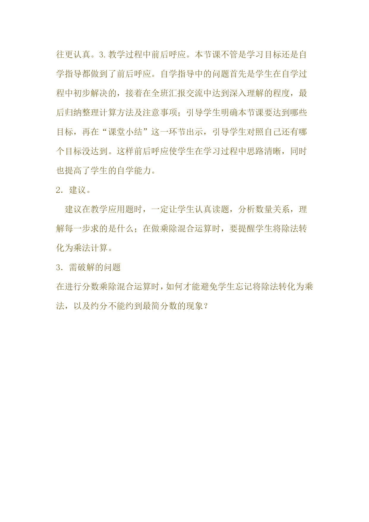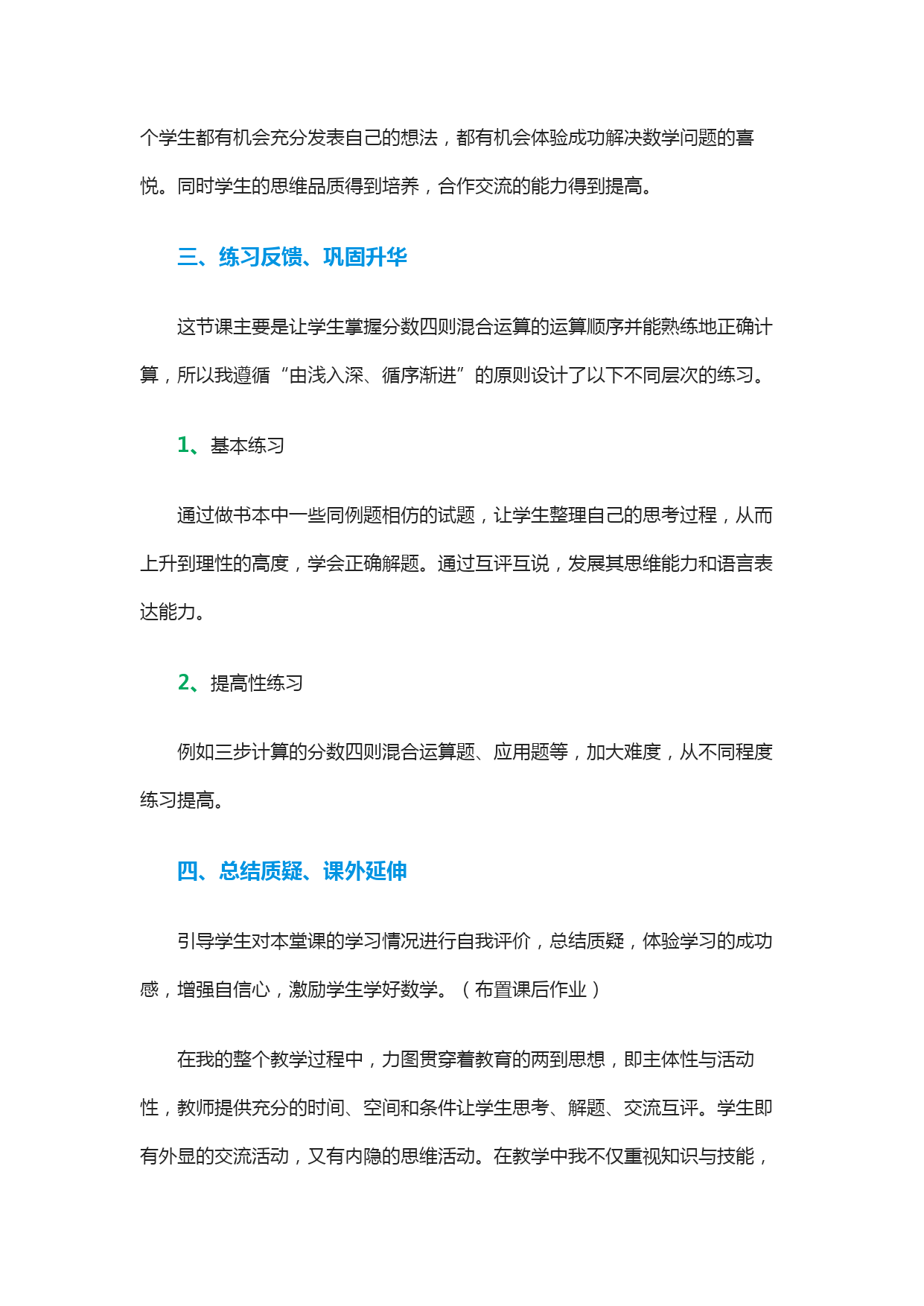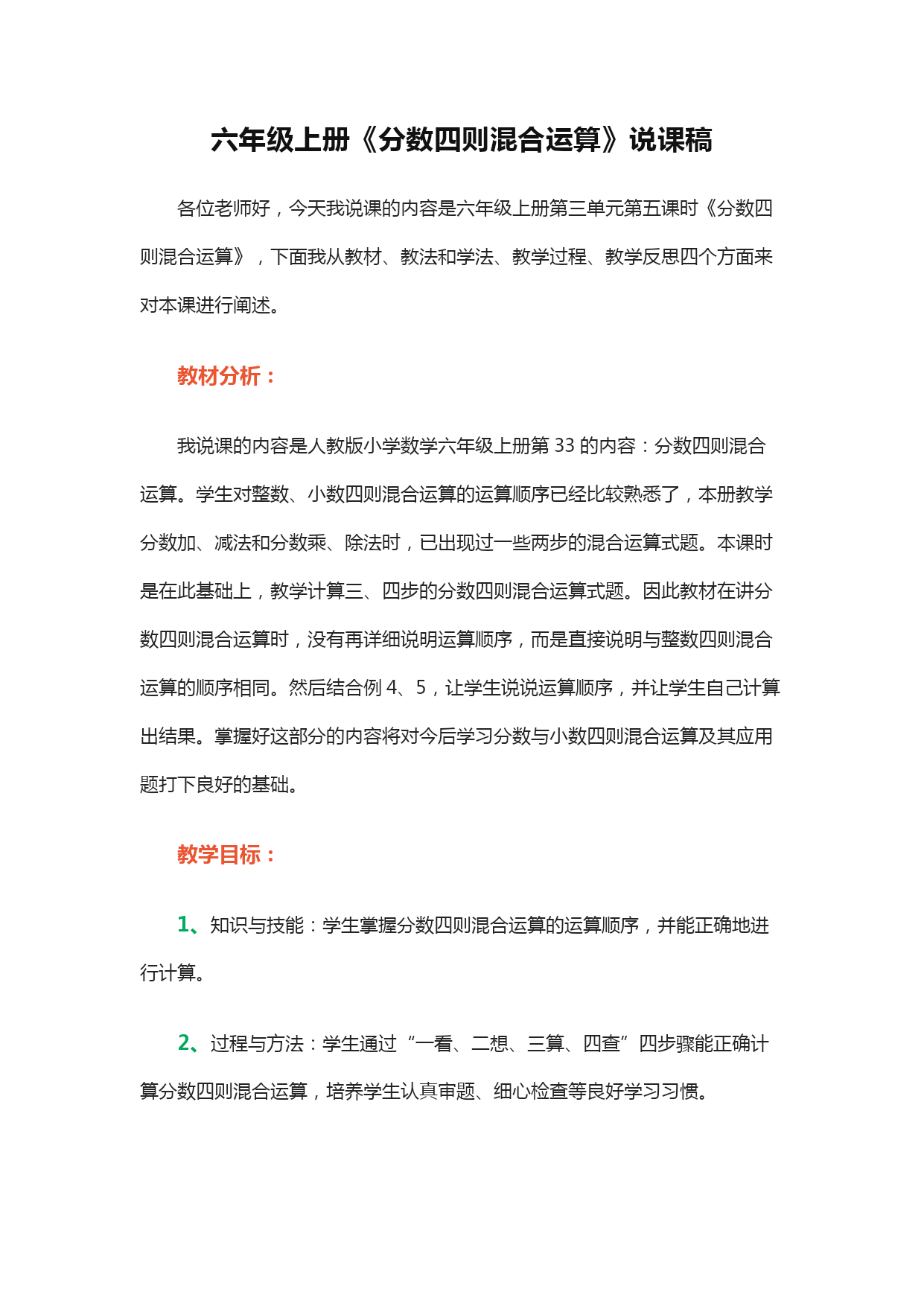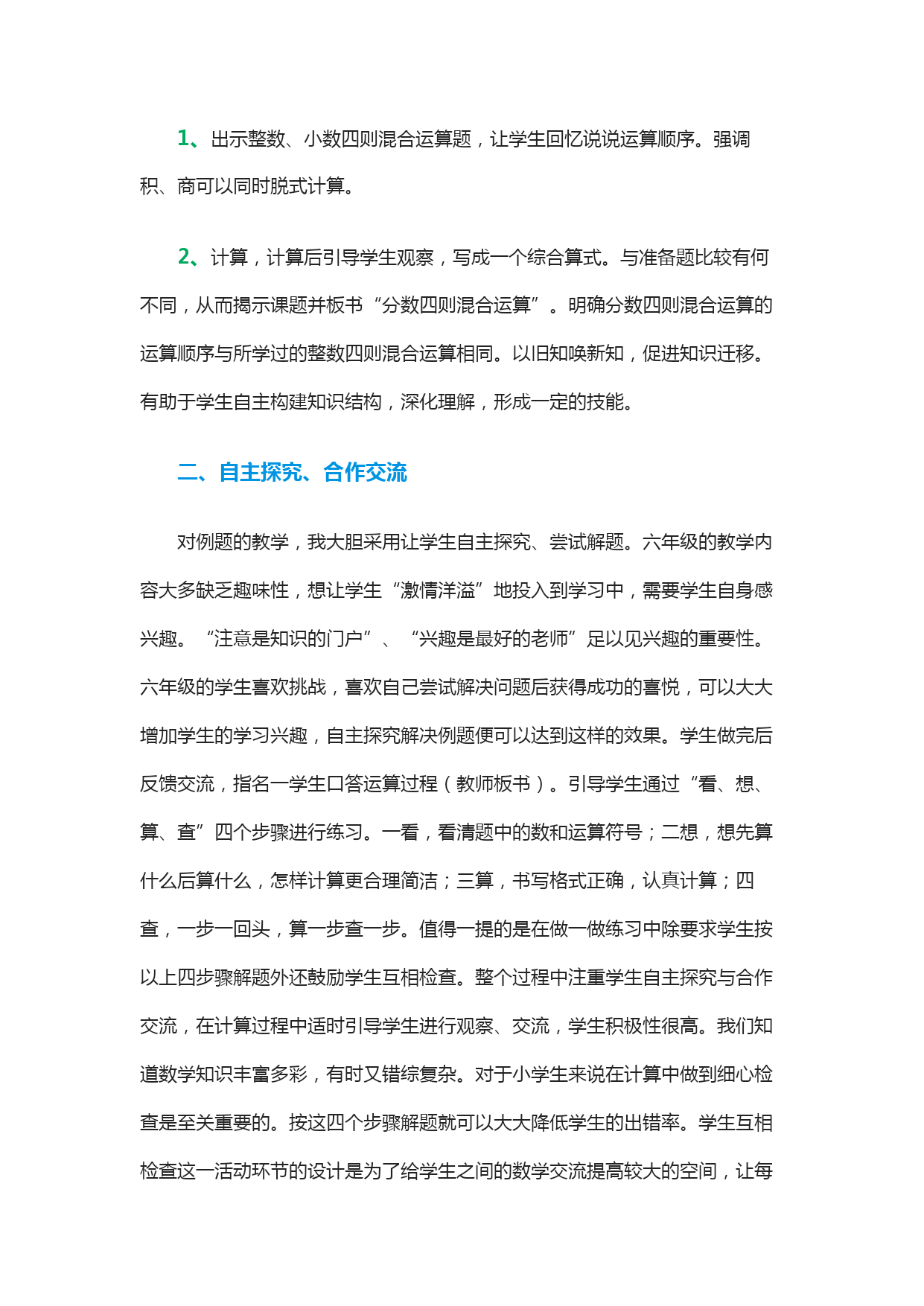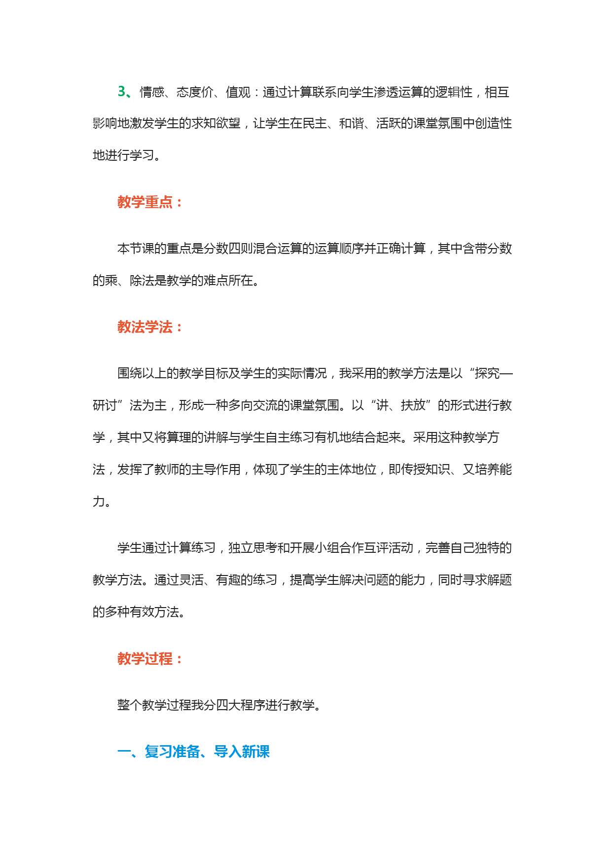 “分数乘除混合运算”教学反思本课的教学内容比较简单,学生又有了预习作业的练习与尝试,因此教学时我放手让学生独立解答,思维快的学生要求用两种方法解答。学生在独立解答时,我巡视到许多学生已经用综合算式在计算,因有了分数乘除法计算方法的基础,分数乘除混合运算的计算正确率较高。在全班交流时,我适时出示学生中的另一种计算方法:逐步计算逐步约分的方法,组织学生进行比较,从而优化方法,理解混合运算转化的算理。学会了分数连除和分数乘除法混合运算的计算方法,但在课上的计算练习中还是发现少数学生计算时错误较多:有些学生没有把除法转化成乘法就约分,有些学生把乘数也写成倒数等。小结算法时我特意指名让这部分学生说说在类似的计算练习中你有什么要提醒大家注意的地方吗?通过这样的交流,这些学生认识到了自己的错误,对其他学生也起到了警醒的作用。我感觉亮点之处有:1.自学指导为学生自学指引方向,本节课的学习目标就达到了,所以说自学指导是学生自学的领航者。2.充分发挥多媒体在数学教学中的重要作用,激发学生学习兴趣。数学学习有时很是枯燥乏味的,尤其是计算教学,但是我在教学活动中,充分利用了多媒体。用课件出示学习目标、自学指导、计算方法等,非常醒目;用实物展台展示学生做的题,尤其是典型错误,既起到了重点强调的效果,也促进了学生的书写。因为自己做的题随时都有被展示的可能,全班学生的学习积极性提高了,书写也较以往更认真。3.教学过程中前后呼应。本节课不管是学习目标还是自学指导都做到了前后呼应。自学指导中的问题首先是学生在自学过程中初步解决的,接着在全班汇报交流中达到深入理解的程度,最后归纳整理计算方法及注意事项;引导学生明确本节课要达到哪些目标,再在“课堂小结”这一环节出示,引导学生对照自己还有哪个目标没达到。这样前后呼应使学生在学习过程中思路清晰,同时也提高了学生的自学能力。2.建议。建议在教学应用题时,一定让学生认真读题,分析数量关系,理解每一步求的是什么;在做乘除混合运算时,要提醒学生将除法转化为乘法计算。3.需破解的问题在进行分数乘除混合运算时,如何才能避免学生忘记将除法转化为乘法,以及约分不能约到最简分数的现象?六年级上册《分数四则混合运算》说课稿各位老师好,今天我说课的内容是六年级上册第三单元第五课时《分数四则混合运算》,下面我从教材、教法和学法、教学过程、教学反思四个方面来对本课进行阐述。教材分析:我说课的内容是人教版小学数学六年级上册第33的内容:分数四则混合运算。学生对整数、小数四则混合运算的运算顺序已经比较熟悉了,本册教学分数加、减法和分数乘、除法时,已出现过一些两步的混合运算式题。本课时是在此基础上,教学计算三、四步的分数四则混合运算式题。因此教材在讲分数四则混合运算时,没有再详细说明运算顺序,而是直接说明与整数四则混合运算的顺序相同。然后结合例4、5,让学生说说运算顺序,并让学生自己计算出结果。掌握好这部分的内容将对今后学习分数与小数四则混合运算及其应用题打下良好的基础。教学目标:1、知识与技能:学生掌握分数四则混合运算的运算顺序,并能正确地进行计算。2、过程与方法:学生通过“一看、二想、三算、四查”四步骤能正确计算分数四则混合运算,培养学生认真审题、细心检查等良好学习习惯。3、情感、态度价、值观:通过计算联系向学生渗透运算的逻辑性,相互影响地激发学生的求知欲望,让学生在民主、和谐、活跃的课堂氛围中创造性地进行学习。教学重点:本节课的重点是分数四则混合运算的运算顺序并正确计算,其中含带分数的乘、除法是教学的难点所在。教法学法:围绕以上的教学目标及学生的实际情况,我采用的教学方法是以“探究—研讨”法为主,形成一种多向交流的课堂氛围。以“讲、扶放”的形式进行教学,其中又将算理的讲解与学生自主练习有机地结合起来。采用这种教学方法,发挥了教师的主导作用,体现了学生的主体地位,即传授知识、又培养能力。学生通过计算练习,独立思考和开展小组合作互评活动,完善自己独特的教学方法。通过灵活、有趣的练习,提高学生解决问题的能力,同时寻求解题的多种有效方法。教学过程:整个教学过程我分四大程序进行教学。一、复习准备、导入新课1、出示整数、小数四则混合运算题,让学生回忆说说运算顺序。强调积、商可以同时脱式计算。2、计算,计算后引导学生观察,写成一个综合算式。与准备题比较有何不同,从而揭示课题并板书“分数四则混合运算”。明确分数四则混合运算的运算顺序与所学过的整数四则混合运算相同。以旧知唤新知,促进知识迁移。有助于学生自主构建知识结构,深化理解,形成一定的技能。二、自主探究、合作交流对例题的教学,我大胆采用让学生自主探究、尝试解题。六年级的教学内容大多缺乏趣味性,想让学生“激情洋溢”地投入到学习中,需要学生自身