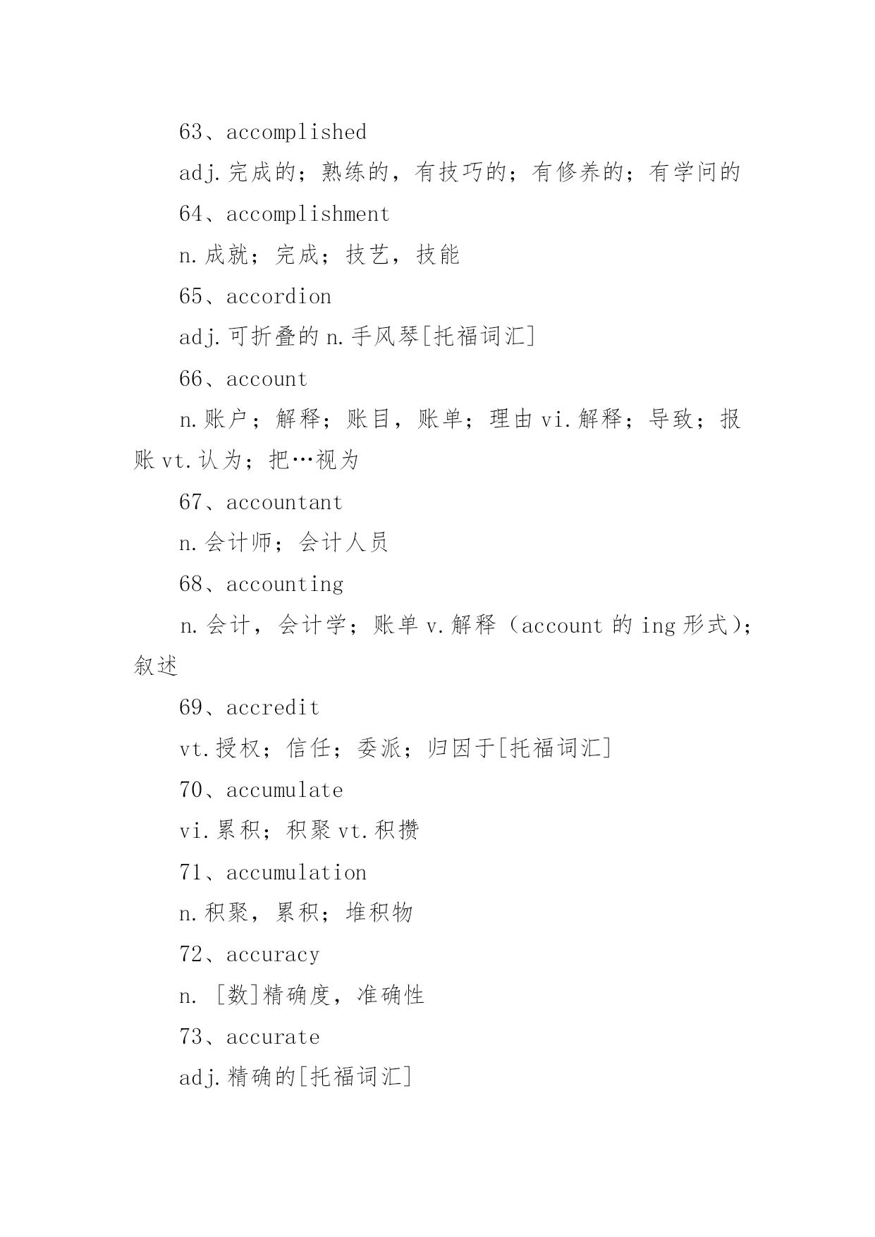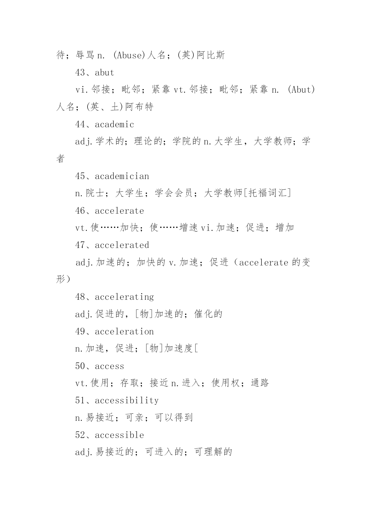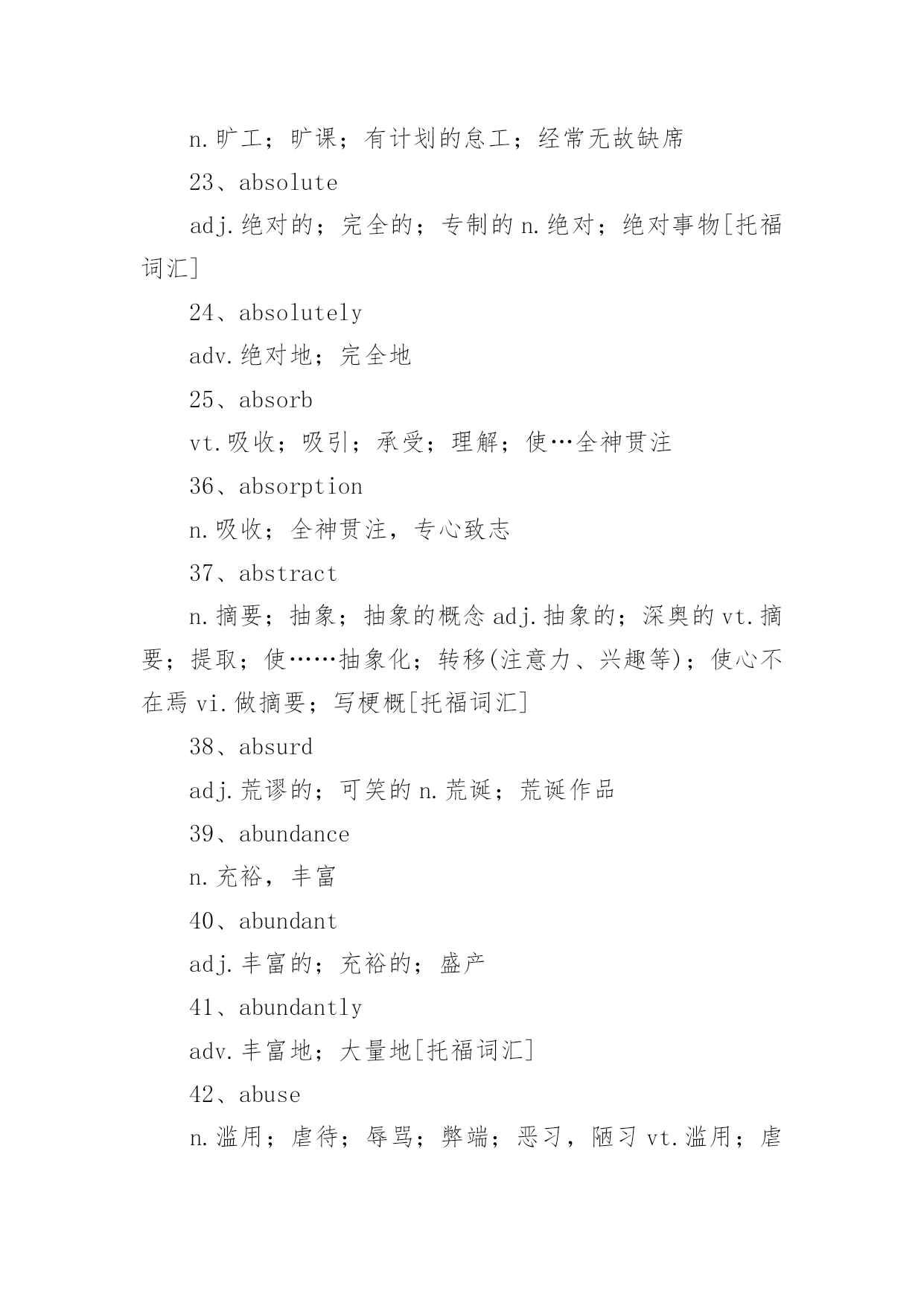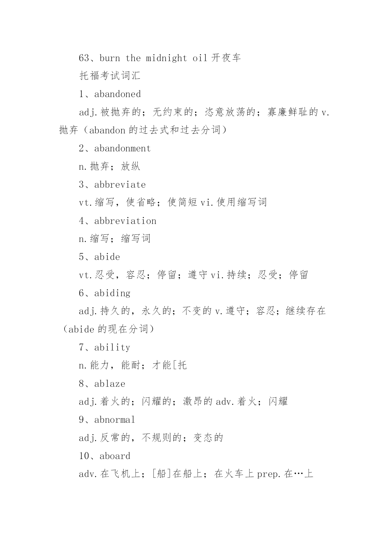 托福考试词汇托福考试必备词汇词汇,又称语汇,是一种语言里所有的(或特定范围的)词和固定短语的总和。例如汉语词汇、英语词汇或一般词汇、基本词汇、文言词汇、方言词汇等;还可以指某一个人或某一作品所用的词和固定短语的总和,以下是小编精心整理的托福考试必备词汇,欢迎阅读与收藏。托福考试词汇1、schoolyear学年2、term,trimester学季3、semester学期4、schoolday教学日5、schoolholiday假期6、curriculum课程7、subject学科8、discipline学科9、timetable课程表10、class,lesson课11、homework家庭作业12、exercise练习13、dictation听写14、playtime,break课间,休息15、toplaytruant,toplayhooky逃学,旷课16、lateforclass迟到17、course(ofstudy)学业18、writtenwork书面作业19、oralcalculation口算20、elucidation讲解21、preparelessons预习22、grant,scholarship,fellowship奖学金23、holderofagrant/scholar/fellow奖学金获得者24、schooluniform校服25、teachingstaff教育工作者(总称)26、ofschoolage学龄儿童27、beginningofterm开学28、matriculation注册29、toenroll注册30、totakelessons(学生)上课31、toteach(老师)上课32、requiredcourse必修课33、optionalcourse选修课34、transcript成绩单35、lecture演讲36、credit学分37、tostudy学习38、tolearnbyheart记住,掌握39、torevise,togoover复习40、test考试41、totest考试42、totakeanexamination参加考试43、convocationnotice考试通知44、examiner考试者45、boardofexaminers考试团46、oralexamination口试47、writtenexamination笔试48、question问题49、questionpaper试卷50、topassanexamination(exam)通过考试51、prizegiving分配奖品52、tofailanexamination未通过考试53、failure不及格54、torepeatayear留级55、competitiveexamination答辩考试56、competitiveness竞争意识57、driven有紧迫感的58、assiduouslearning勤奋学习59、independentstudy独立学习60、learningefficiency学习效率61、gainnewknowledgebyreviewold温故知新62、skipschool逃学63、burnthemidnightoil开夜车托福考试词汇1、abandonedadj.被抛弃的;无约束的;恣意放荡的;寡廉鲜耻的v.抛弃(abandon的过去式和过去分词)2、abandonmentn.抛弃;放纵3、abbreviatevt.缩写,使省略;使简短vi.使用缩写词4、abbreviationn.缩写;缩写词5、abidevt.忍受,容忍;停留;遵守vi.持续;忍受;停留6、abidingadj.持久的,永久的;不变的v.遵守;容忍;继续存在(abide的现在分词)7、abilityn.能力,能耐;才能[托8、ablazeadj.着火的;闪耀的;激昂的adv.着火;闪耀9、abnormaladj.反常的,不规则的;变态的10、aboardadv.在飞机上;[船]在船上;在火车上prep.在…上11、abolishvt.废除,废止;取消,革除12、abolitionn.废除;废止13、abolitionistn.废奴主义者;废除主义者14、abortvi.流产;堕胎;夭折;发育不全vt.使流产;使中止n.中止计划15、aboundvi.富于;充满[托16、abrasionn.磨损;磨耗;擦伤17、abrasiveadj.粗糙的;有研磨作用的;伤人感情的n.研磨料18、abruptadj.生硬的;突然的;唐突的;陡峭的19、absencen.没有;缺乏;缺席;不注意[20、absentadj.缺席的;缺少的;心不在焉的;茫然的vt.使缺席21、absenteen.缺席者缺席投票的缺席的22、absenteeismn.旷