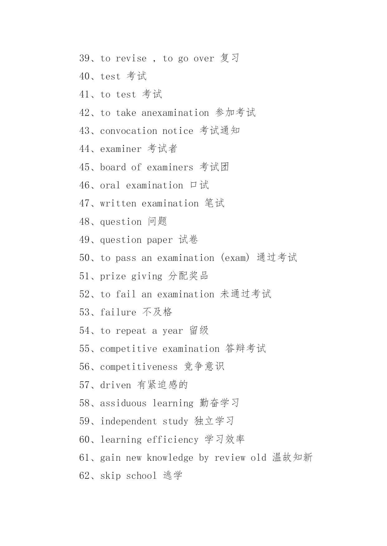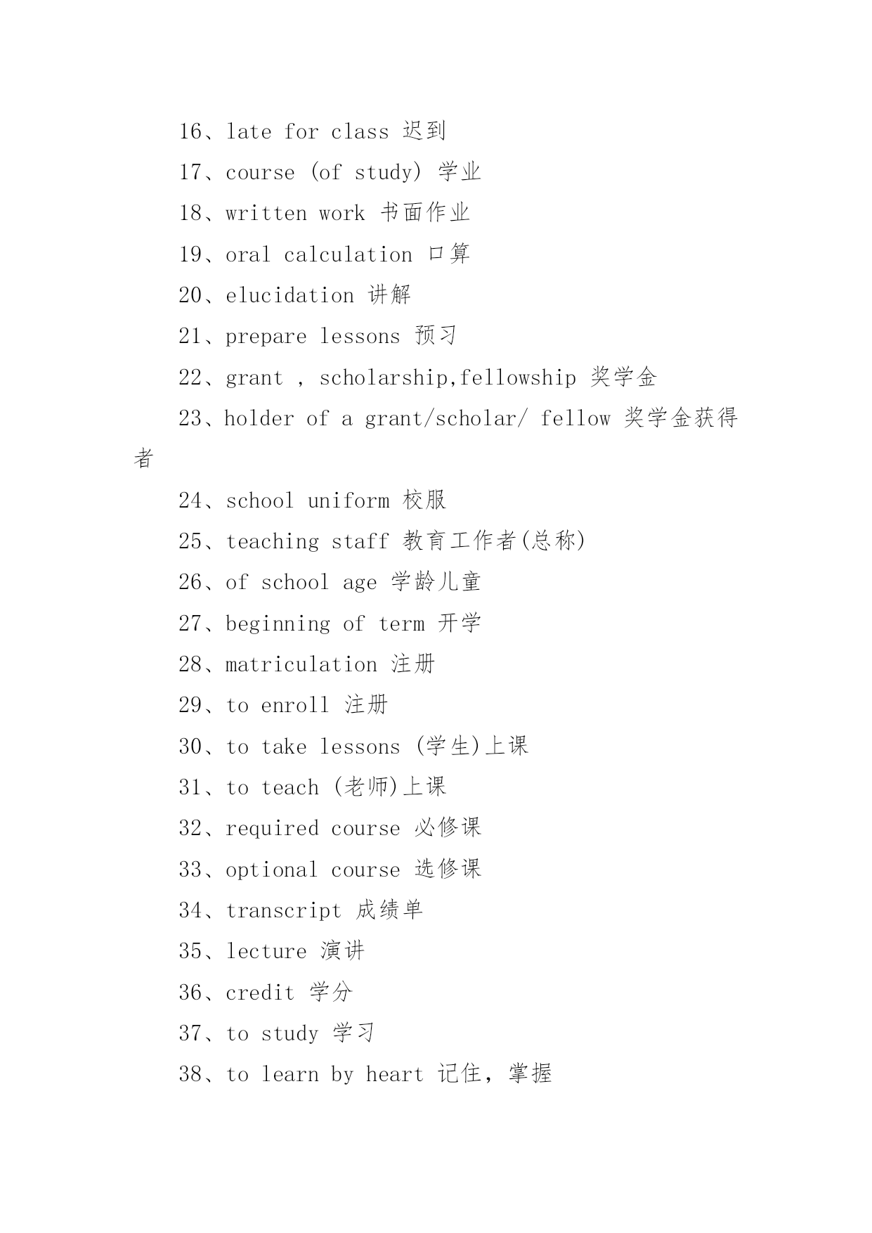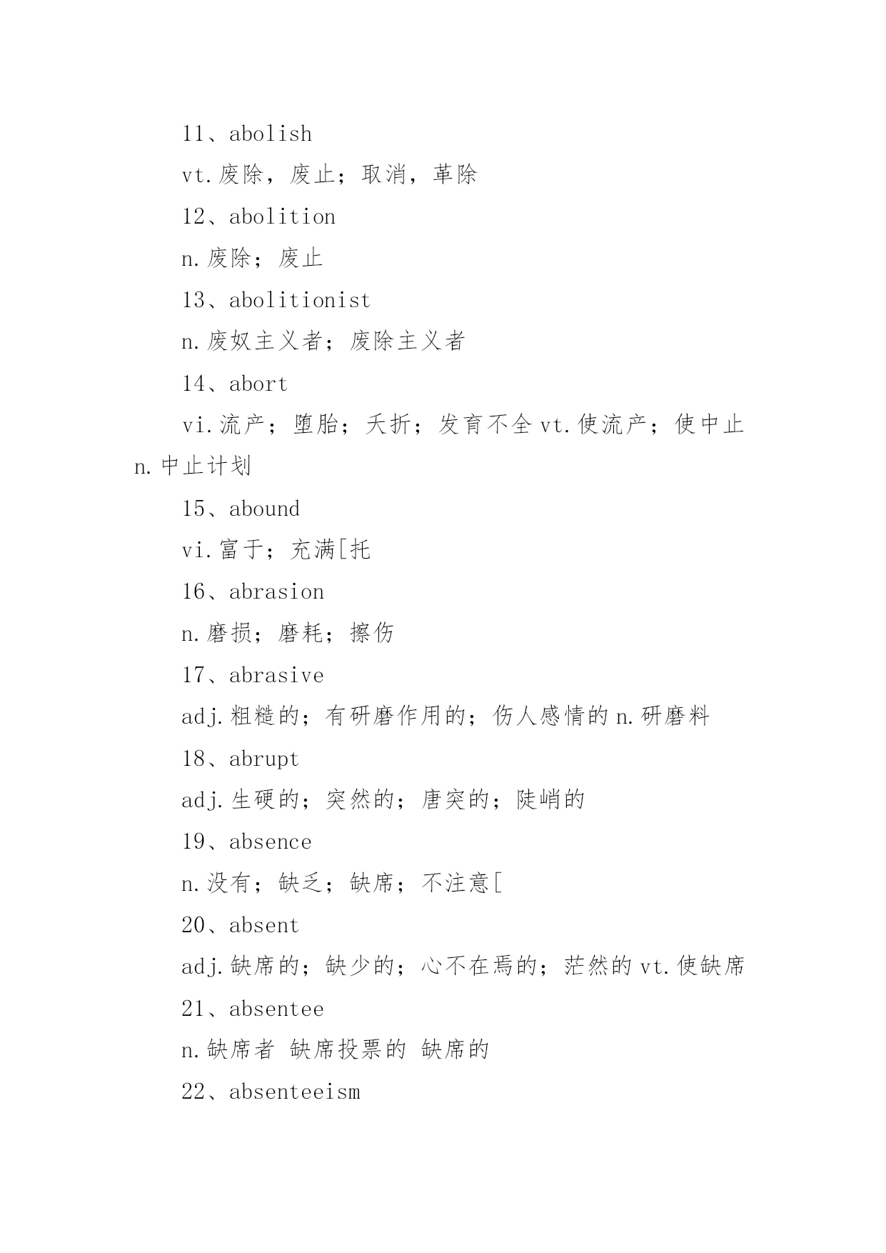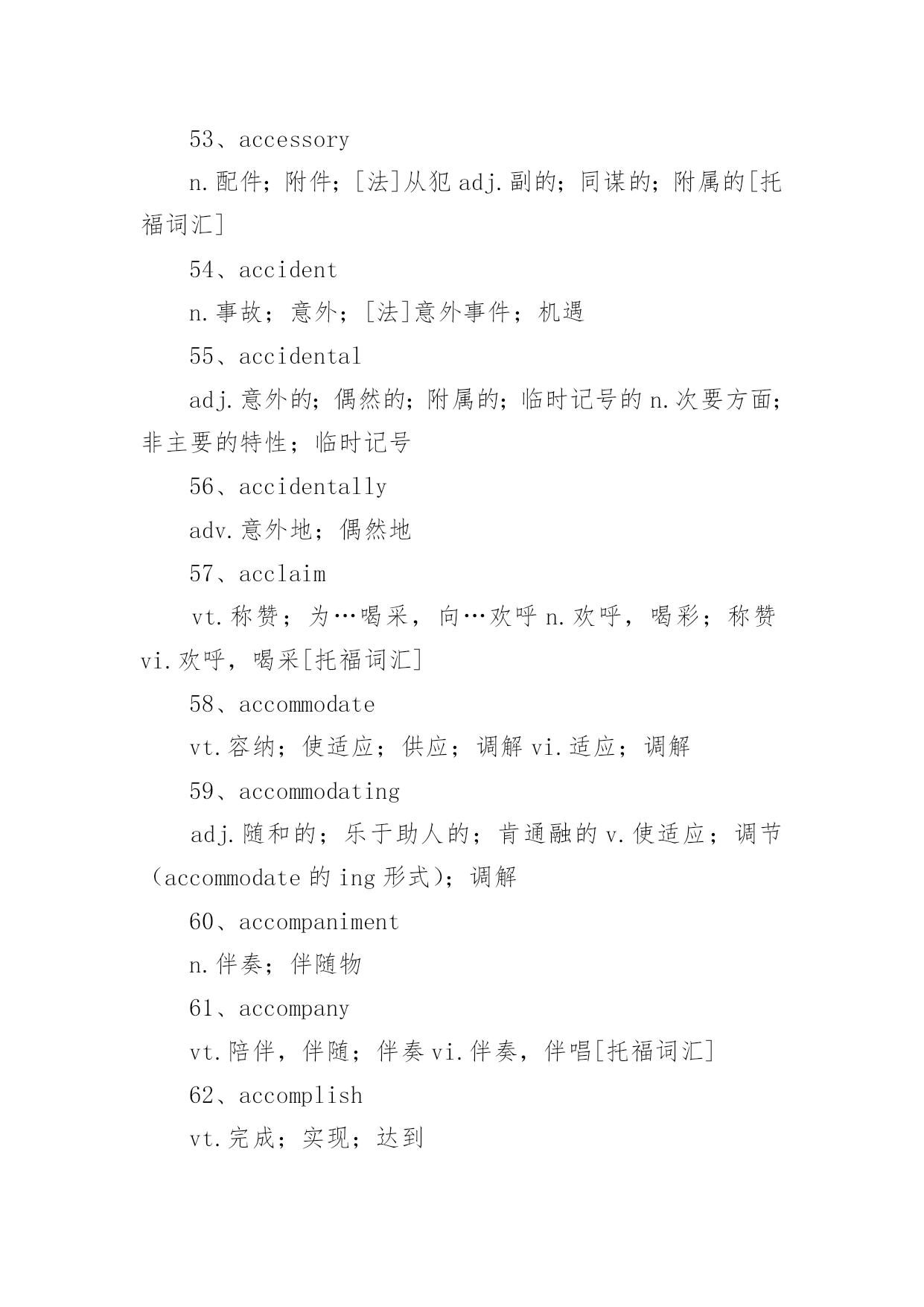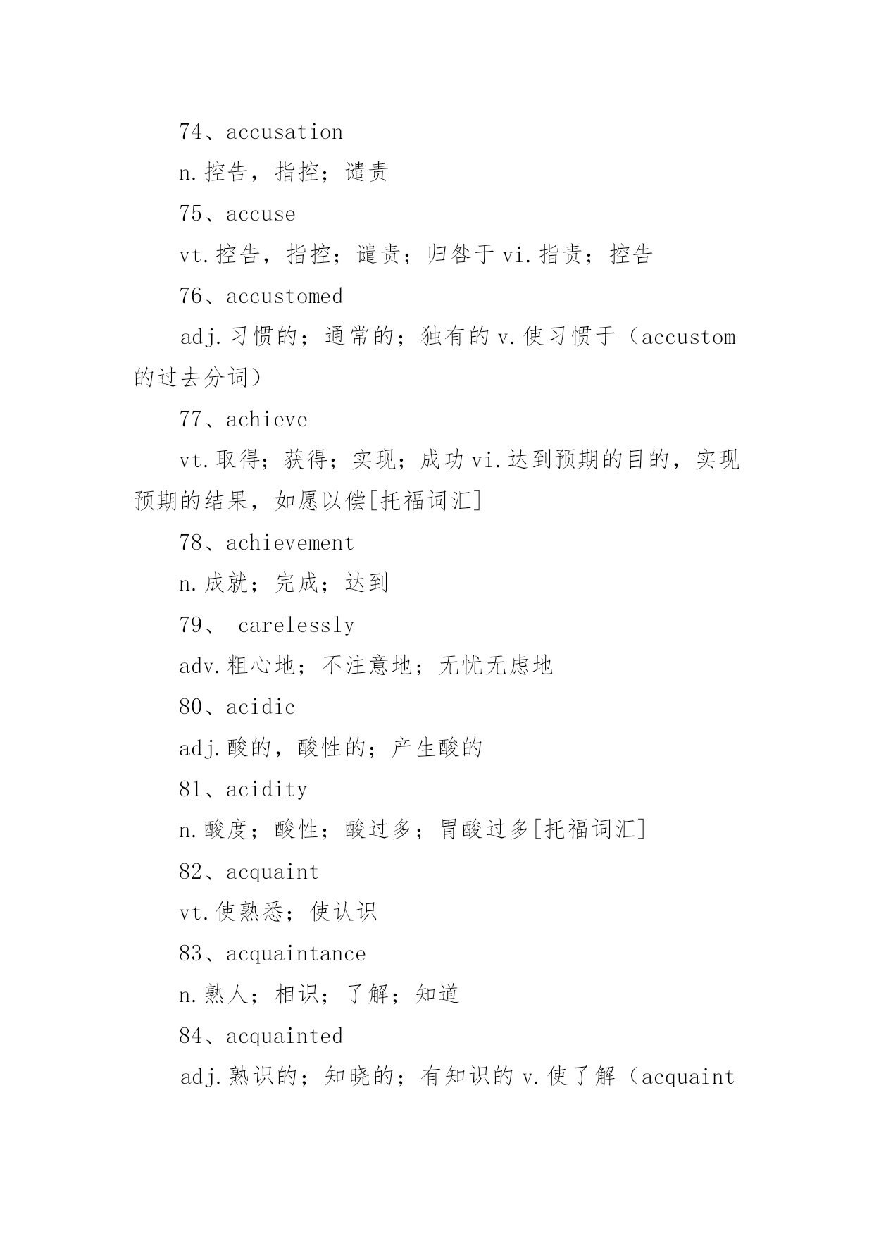 托福考试词汇托福考试必备词汇词汇,又称语汇,是一种语言里所有的(或特定范围的)词和固定短语的总和。例如汉语词汇、英语词汇或一般词汇、基本词汇、文言词汇、方言词汇等;还可以指某一个人或某一作品所用的词和固定短语的总和,以下是小编精心整理的托福考试必备词汇,欢迎阅读与收藏。托福考试词汇1、schoolyear学年2、term,trimester学季3、semester学期4、schoolday教学日5、schoolholiday假期6、curriculum课程7、subject学科8、discipline学科9、timetable课程表10、class,lesson课11、homework家庭作业12、exercise练习13、dictation听写14、playtime,break课间,休息15、toplaytruant,toplayhooky逃学,旷课16、lateforclass迟到17、course(ofstudy)学业18、writtenwork书面作业19、oralcalculation口算20、elucidation讲解21、preparelessons预习22、grant,scholarship,fellowship奖学金23、holderofagrant/scholar/fellow奖学金获得者24、schooluniform校服25、teachingstaff教育工作者(总称)26、ofschoolage学龄儿童27、beginningofterm开学28、matriculation注册29、toenroll注册30、totakelessons(学生)上课31、toteach(老师)上课32、requiredcourse必修课33、optionalcourse选修课34、transcript成绩单35、lecture演讲36、credit学分37、tostudy学习38、tolearnbyheart记住,掌握39、torevise,togoover复习40、test考试41、totest考试42、totakeanexamination参加考试43、convocationnotice考试通知44、examiner考试者45、boardofexaminers考试团46、oralexamination口试47、writtenexamination笔试48、question问题49、questionpaper试卷50、topassanexamination(exam)通过考试51、prizegiving分配奖品52、tofailanexamination未通过考试53、failure不及格54、torepeatayear留级55、competitiveexamination答辩考试56、competitiveness竞争意识57、driven有紧迫感的58、assiduouslearning勤奋学习59、independentstudy独立学习60、learningefficiency学习效率61、gainnewknowledgebyreviewold温故知新62、skipschool逃学63、burnthemidnightoil开夜车托福考试词汇1、abandonedadj.被抛弃的;无约束的;恣意放荡的;寡廉鲜耻的v.抛弃(abandon的过去式和过去分词)2、abandonmentn.抛弃;放纵3、abbreviatevt.缩写,使省略;使简短vi.使用缩写词4、abbreviationn.缩写;缩写词5、abidevt.忍受,容忍;停留;遵守vi.持续;忍受;停留6、abidingadj.持久的,永久的;不变的v.遵守;容忍;继续存在(abide的现在分词)7、abilityn.能力,能耐;才能[托8、ablazeadj.着火的;闪耀的;激昂的adv.着火;闪耀9、abnormaladj.反常的,不规则的;变态的10、aboardadv.在飞机上;[船]在船上;在火车上prep.在…上11、abolishvt.废除,废止;取消,革除12、abolitionn.废除;废止13、abolitionistn.废奴主义者;废除主义者14、abortvi.流产;堕胎;夭折;发育不全vt.使流产;使中止n.中止计划15、aboundvi.富于;充满[托16、abrasionn.磨损;磨耗;擦伤17、abrasiveadj.粗糙的;有研磨作用的;伤人感情的n.研磨料18、abruptadj.生硬的;突然的;唐突的;陡峭的19、absencen.没有;缺乏;缺席;不注意[20、absentadj.缺席的;缺少的;心不在焉的;茫然的vt.使缺席21、absenteen.缺席者缺席投票的缺席的22、absenteeismn.旷