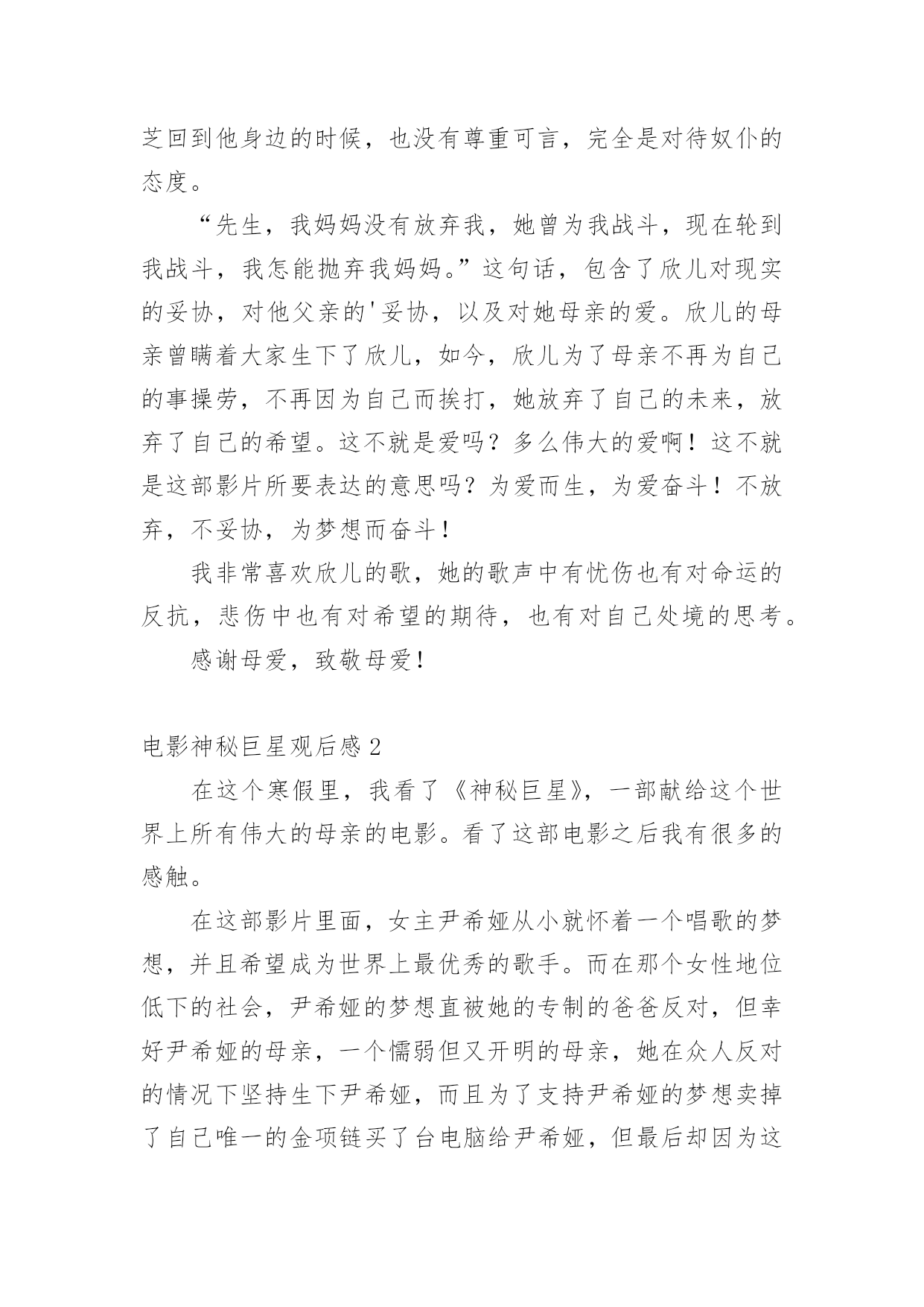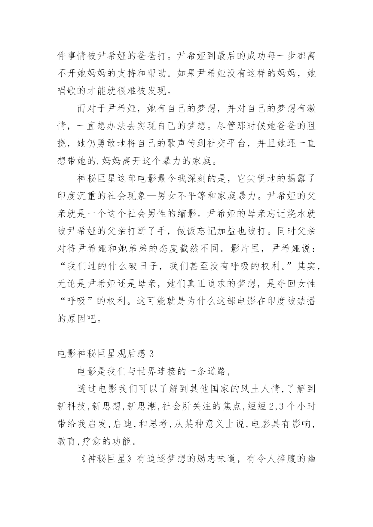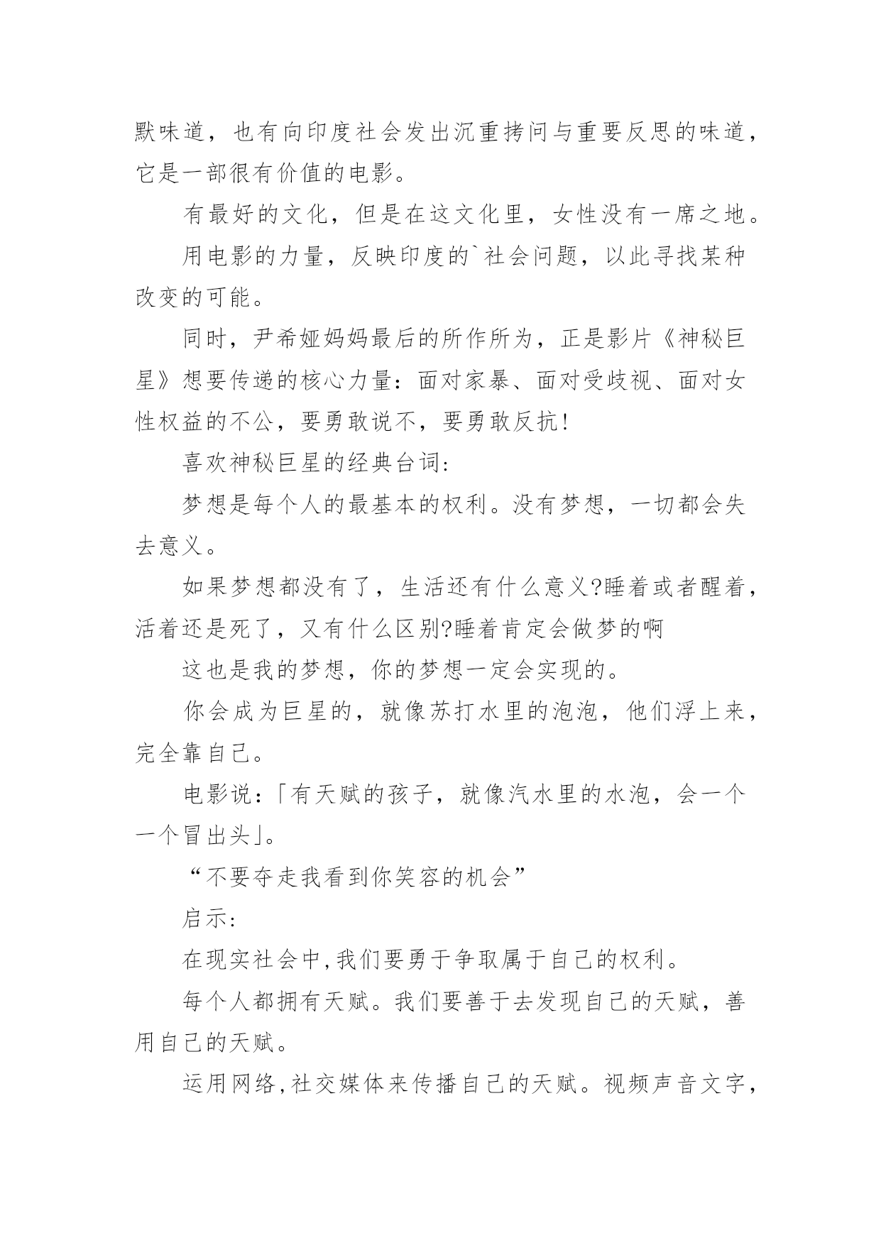 电影神秘巨星观后感细细品味一部作品以后,相信大家的收获肯定不少吧,这时候最关键的观后感不能忘了。是不是无从下笔、没有头绪?以下是小编收集整理的电影神秘巨星观后感,欢迎阅读,希望大家能够喜欢。电影神秘巨星观后感1在这个假期,我看了一部名叫《神秘巨星》的电影。这部电影使我大为感动,同时,我也对一些使我记忆犹新的句子有一些感受。这部电影讲述了欣儿与她的母亲娜芝为了欣儿的梦想而拼搏的故事。“没有梦想,一切都没有意义。是睡是醒都没有意义,是死是活也没有意义。发梦是基本权利,每个人都有权发梦。”这句话最让我感动,也是我认为最符合我的实际的事情。是的,没有梦想,没有为梦想而奋斗,那你是睡又怎样,是醒又怎样呢?每天浑浑噩噩度日,那和死亡又有什么区别呢?我现在也算是没有梦想的人,每天得过且过,很少考虑梦想,只是偶尔想起自己现在的目标是考上城区一中火箭班,要为之而努力。“我是你丈夫,没有我的批准,你哪里都不能去!”这句话是娜芝的丈夫对娜芝说的。这哪里还有什么公平可言,用一种命令的口气和自己的结发妻子说话,哪怕是在恳求娜芝回到他身边的时候,也没有尊重可言,完全是对待奴仆的态度。“先生,我妈妈没有放弃我,她曾为我战斗,现在轮到我战斗,我怎能抛弃我妈妈。”这句话,包含了欣儿对现实的妥协,对他父亲的'妥协,以及对她母亲的爱。欣儿的母亲曾瞒着大家生下了欣儿,如今,欣儿为了母亲不再为自己的事操劳,不再因为自己而挨打,她放弃了自己的未来,放弃了自己的希望。这不就是爱吗?多么伟大的爱啊!这不就是这部影片所要表达的意思吗?为爱而生,为爱奋斗!不放弃,不妥协,为梦想而奋斗!我非常喜欢欣儿的歌,她的歌声中有忧伤也有对命运的反抗,悲伤中也有对希望的期待,也有对自己处境的思考。感谢母爱,致敬母爱!电影神秘巨星观后感2在这个寒假里,我看了《神秘巨星》,一部献给这个世界上所有伟大的母亲的电影。看了这部电影之后我有很多的感触。在这部影片里面,女主尹希娅从小就怀着一个唱歌的梦想,并且希望成为世界上最优秀的歌手。而在那个女性地位低下的社会,尹希娅的梦想直被她的专制的爸爸反对,但幸好尹希娅的母亲,一个懦弱但又开明的母亲,她在众人反对的情况下坚持生下尹希娅,而且为了支持尹希娅的梦想卖掉了自己唯一的金项链买了台电脑给尹希娅,但最后却因为这件事情被尹希娅的爸爸打。尹希娅到最后的成功每一步都离不开她妈妈的支持和帮助。如果尹希娅没有这样的妈妈,她唱歌的才能就很难被发现。而对于尹希娅,她有自己的梦想,并对自己的梦想有激情,一直想办法去实现自己的梦想。尽管那时候她爸爸的阻挠,她仍勇敢地将自己的歌声传到社交平台,并且她还一直想带她的.妈妈离开这个暴力的家庭。神秘巨星这部电影最令我深刻的是,它尖锐地的揭露了印度沉重的社会现象—男女不平等和家庭暴力。尹希娅的父亲就是一个这个社会男性的缩影。尹希娅的母亲忘记烧水就被尹希娅的父亲打断了手,做饭忘记加盐也被打。同时父亲对待尹希娅和她弟弟的态度截然不同。影片里,尹希娅说:“我们过的什么破日子,我们甚至没有呼吸的权利。”其实,无论是尹希娅还是母亲,她们真正追求的梦想,是夺回女性“呼吸”的权利。这可能就是为什么这部电影在印度被禁播的原因吧。电影神秘巨星观后感3电影是我们与世界连接的一条道路,透过电影我们可以了解到其他国家的风土人情,了解到新科技,新思想,新思潮,社会所关注的焦点,短短2,3个小时带给我启发,启迪,和思考,从某种意义上说,电影具有影响,教育,疗愈的功能。《神秘巨星》有追逐梦想的励志味道,有令人捧腹的幽默味道,也有向印度社会发出沉重拷问与重要反思的味道,它是一部很有价值的电影。有最好的文化,但是在这文化里,女性没有一席之地。用电影的力量,反映印度的`社会问题,以此寻找某种改变的可能。同时,尹希娅妈妈最后的所作所为,正是影片《神秘巨星》想要传递的核心力量:面对家暴、面对受歧视、面对女性权益的不公,要勇敢说不,要勇敢反抗!喜欢神秘巨星的经典台词:梦想是每个人的最基本的权利。没有梦想,一切都会失去意义。如果梦想都没有了,生活还有什么意义?睡着或者醒着,活着还是死了,又有什么区别?睡着肯定会做梦的啊这也是我的梦想,你的梦想一定会实现的。你会成为巨星的,就像苏打水里的泡泡,他们浮上来,完全靠自己。电影说:「有天赋的孩子,就像汽水里的水泡,会一个一个冒出头」。“不要夺走我看到你笑容的机会”启示:在现实社会中,我们要勇于争取属于自己的权利。每个人都拥有天赋。我们要善于去发现自己的天赋,善用自己的天赋。运用网络,社交媒体来传播自己的天赋。视频声音文字,各种形式来宣传自己的天赋,为自己的天赋来打广告。终有一天,人们会发现了你的天赋,分享你的天赋,并且会愿意付出代价。还有一个,就是要善于去寻找自己的贵人,得到贵人的帮助。
