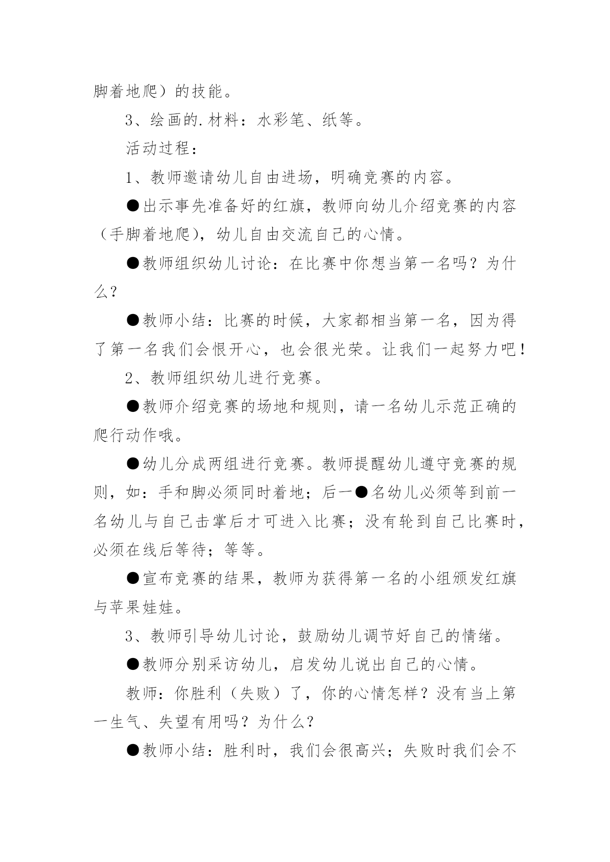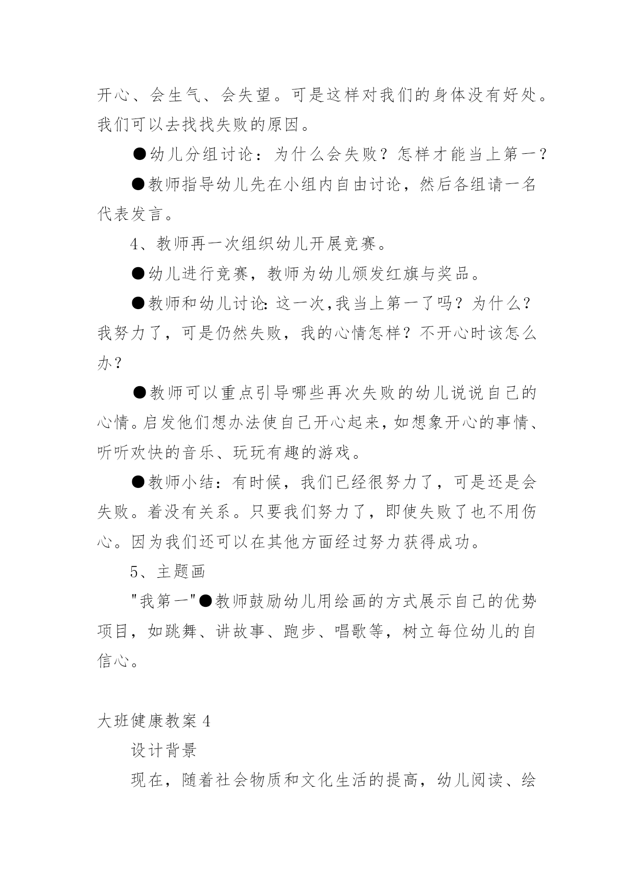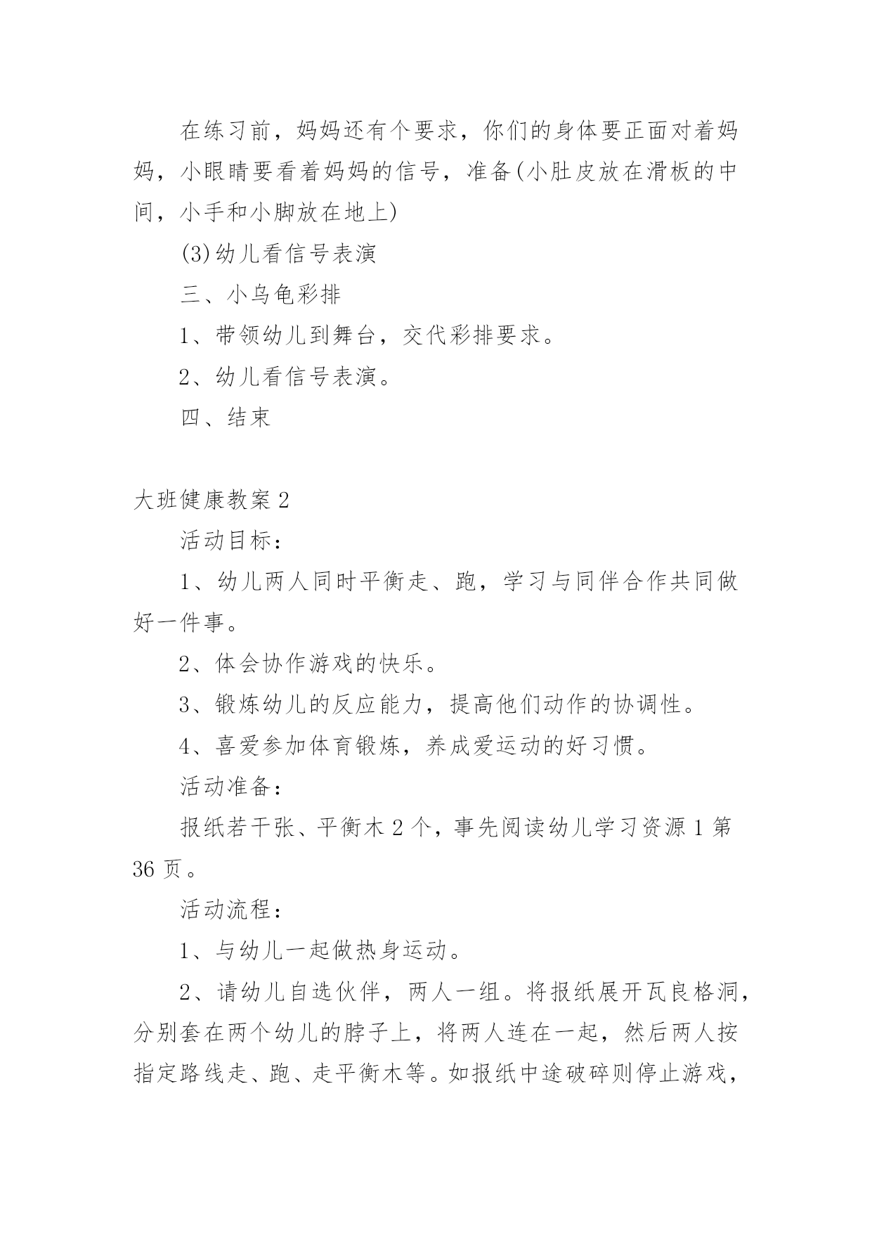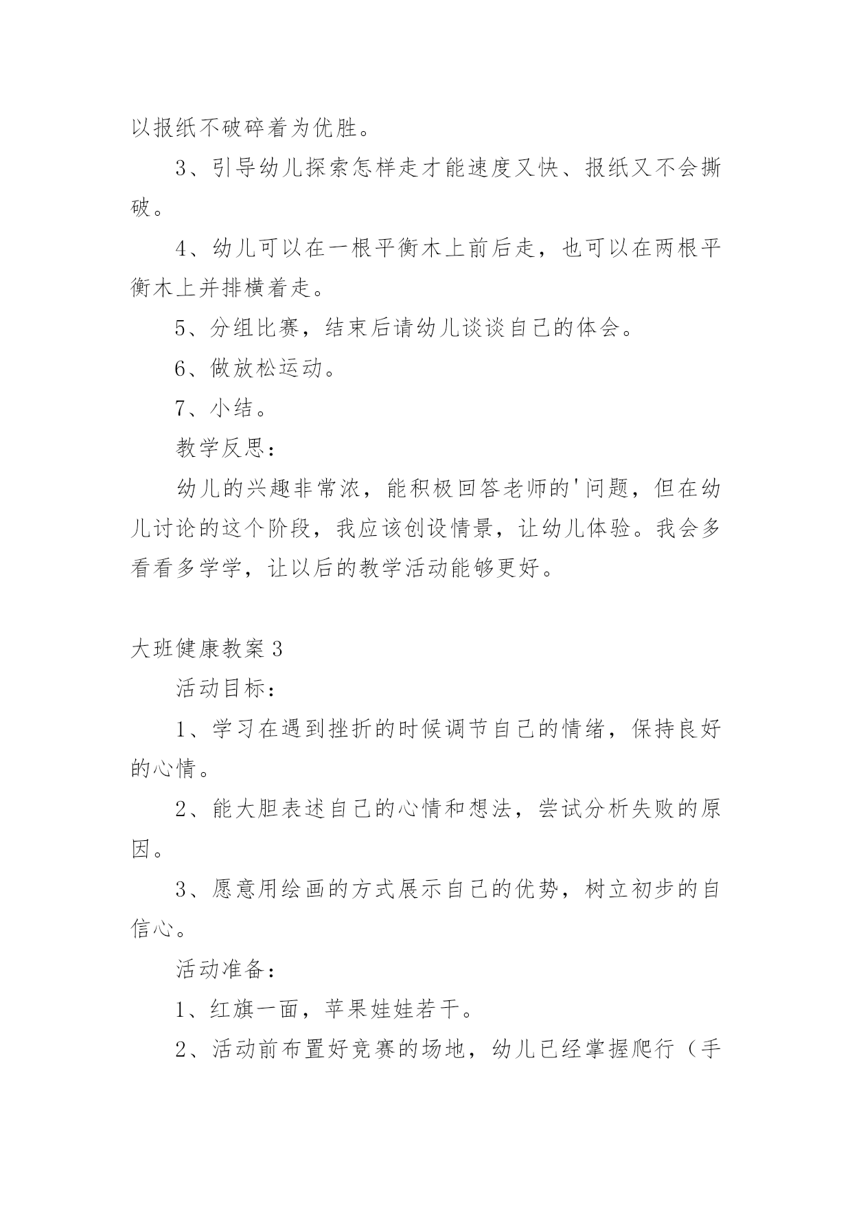 大班健康教案【荐】大班健康教案作为一名教学工作者,就有可能用到教案,编写教案有利于我们准确把握教材的重点与难点,进而选择恰当的教学方法。那么优秀的教案是什么样的呢?以下是小编整理的大班健康教案,仅供参考,希望能够帮助到大家。大班健康教案1活动目标:1、能手脚协调地在滑板上“花样游泳”。2、能按信号较整齐地表演。3、体验身体运动的乐趣。活动准备:滑板24块,事先布置好场地。过程:一、小乌龟做操1、宝宝们,告诉你们一个好消息,森林里要举行一场演出,邀请我们小乌龟去表演节目,你们愿意吗?那你们想表演什么?你们有什么本领?为了让演出更精彩,我们来学一个花样游泳,赶快找一个空地方,先跟着妈妈活动活动身体吧。2、热身运动——乌龟操。“今天天气真好,跟着妈妈一起来做运动吧。“今天天气真正好,乌龟乌龟起得早,穿上漂亮花花衣,跟着妈妈做游戏,伸伸脖子摇摇头,伸伸小手爬呀爬,伸伸小脚跳一跳,我是聪明的小乌龟。”二、小乌龟学本领(一)学习向前游1、我们的身体活动开了,要来学新本领了。出示滑板,这是什么?(滑板)对,我们要在滑板上学习花样游泳,想一想,在滑板上我们可以怎样游?在游泳之前妈妈有个要求:游泳时你们的小手和小脚都要动起来,还要注意安全,不要碰到其他的小乌龟,现在请每个宝宝,拿一块滑板到空的地方去练一练吧2、幼儿自由练习,教师观察。3、交流游泳的动作(1)刚才你们在练习游泳的时候,妈妈发现这只小乌龟游的特别棒,我们请它来游一游,好吗?(2)你们有没有看仔细了,它是怎么游的?它的小手是怎么划的,小脚呢?小肚皮要贴在哪里?(3)总结:原来他是两手轮流向前划,两脚用力向后蹬,肚皮贴在滑板中间,找一个空地方再来练一练吧。(4)(第二次练习)停,你们的小脚有没有动起来,赶快啊,不要忘记小手和小脚要一起动起来。(二)学习转圈游1、宝宝们,把滑板放在这里,快过来。刚才我们学了向前游的动作,在你们游泳的时候我发现有只小乌龟不仅会向前游,它还有另外一个方法。我们请它来游一游。2、(请转圈游的幼儿示范)你们看,他是怎么游的?在转圈游的时候,它小手动的方向和我们向前游一样吗?它是怎么动的?那小脚呢?3、那你们想不想学,赶快找一个空地方去游一游。幼儿练习,教师指导。(三)学习侧游1、刚才我们学习了向前游和转圈游,现在我们要来学侧游,你们知道什么是侧游吗?2、侧游就是像小螃蟹一样往旁边游,教师示范动作要求。3、刚才你们看清楚老师是怎么侧游的?请个别幼儿试一试。4、交代要求:在侧游的时候你们的'身体要对着妈妈,小脸蛋一只要看着妈妈,请你找一个空地方练一练吧。(四)小乌龟看信号练习花样游泳1、认识红旗信号,知道不同的信号做不同的游泳动作。(坐在滑板上)宝宝们,刚才我们学会了几种游泳的方法?为了我们的表演更整齐,你们要学会看着妈妈的信号来游泳。你们看,这是什么呀(小红旗),如果我的小红旗这样,你们应该往哪里游?如果小红旗这样呢(转圈)请你看好小旗转动的方向来做不同的游泳动作。2、提出要求,幼儿看信号练习花样游泳。在练习前,妈妈还有个要求,你们的身体要正面对着妈妈,小眼睛要看着妈妈的信号,准备(小肚皮放在滑板的中间,小手和小脚放在地上)(3)幼儿看信号表演三、小乌龟彩排1、带领幼儿到舞台,交代彩排要求。2、幼儿看信号表演。四、结束大班健康教案2活动目标:1、幼儿两人同时平衡走、跑,学习与同伴合作共同做好一件事。2、体会协作游戏的快乐。3、锻炼幼儿的反应能力,提高他们动作的协调性。4、喜爱参加体育锻炼,养成爱运动的好习惯。活动准备:报纸若干张、平衡木2个,事先阅读幼儿学习资源1。活动流程:1、与幼儿一起做热身运动。2、请幼儿自选伙伴,两人一组。将报纸展开瓦良格洞,分别套在两个幼儿的脖子上,将两人连在一起,然后两人按指定路线走、跑、走平衡木等。如报纸中途破碎则停止游戏,以报纸不破碎着为优胜。3、引导幼儿探索怎样走才能速度又快、报纸又不会撕破。4、幼儿可以在一根平衡木上前后走,也可以在两根平衡木上并排横着走。5、分组比赛,结束后请幼儿谈谈自己的体会。6、做放松运动。7、小结。教学反思:幼儿的兴趣非常浓,能积极回答老师的'问题,但在幼儿讨论的这个阶段,我应该创设情景,让幼儿体验。我会多看看多学学,让以后的教学活动能够更好。大班健康教案3活动目标:1、学习在遇到挫折的时候调节自己的情绪,保持良好的心情。2、能大胆表述自己的心情和想法,尝试分析失败的原因。3、愿意用绘画的方式展示自己的优势,树立初步的自信心。活动准备:1、红旗一面,苹果娃娃若干。2、活动前布置好竞赛的场地,幼儿已经掌握爬行(手脚着地爬)的技能。3、绘画的.材料:水彩笔、纸等。活动过程:1、教师邀请幼儿自由进场,明确竞赛的内容。●出示事先准备好的红旗,教师向幼儿介绍竞赛的内容(手脚着地爬),幼儿自由交流自己的心情。●教