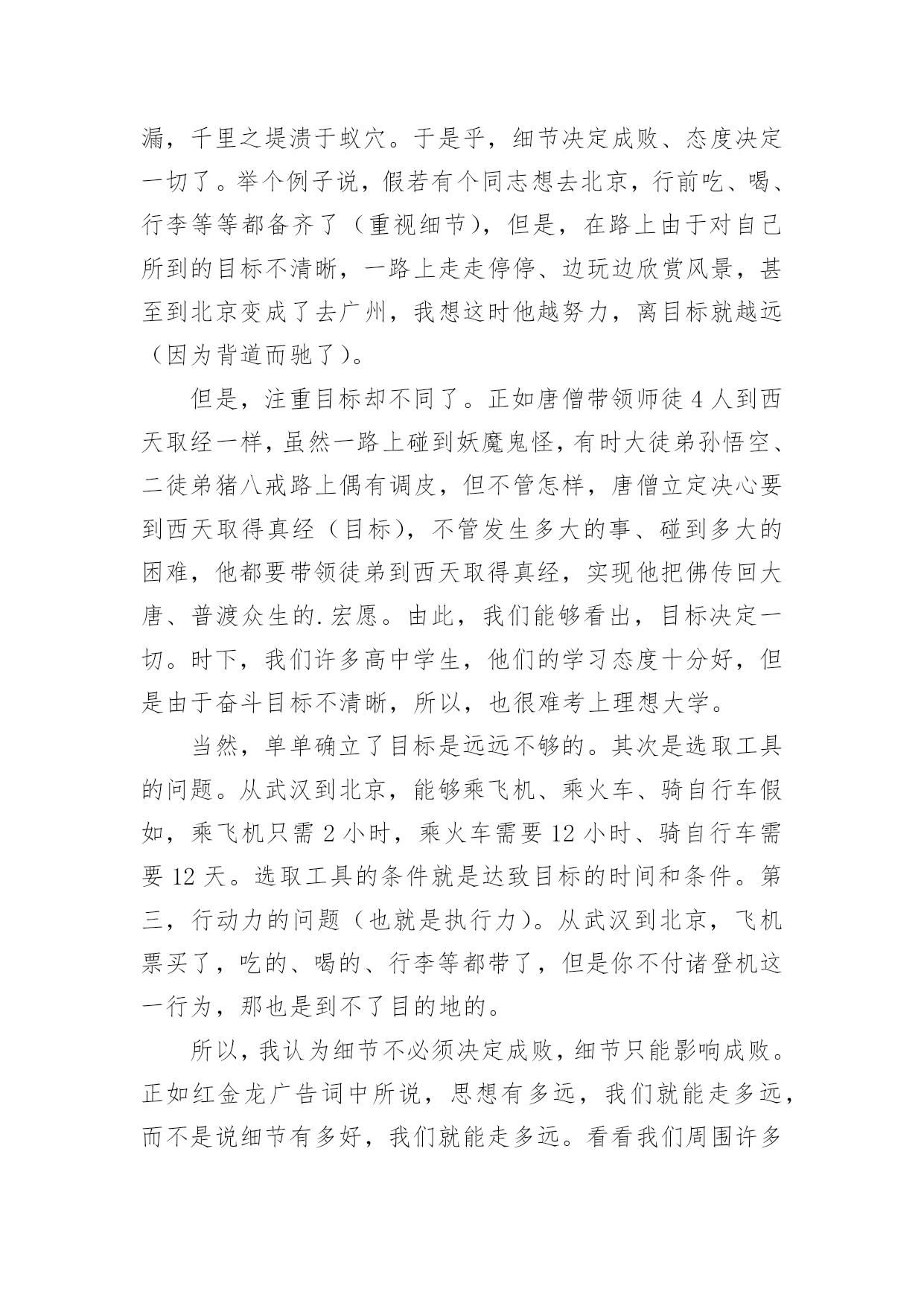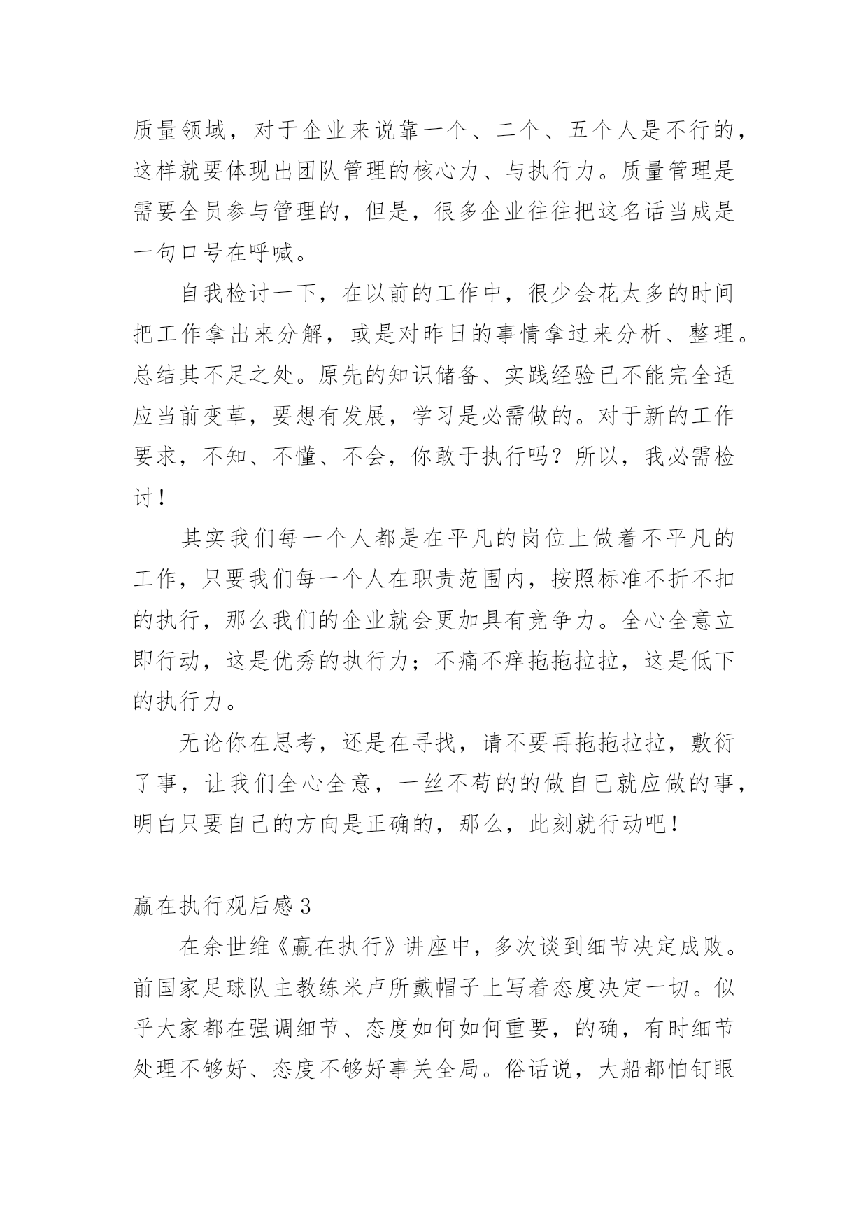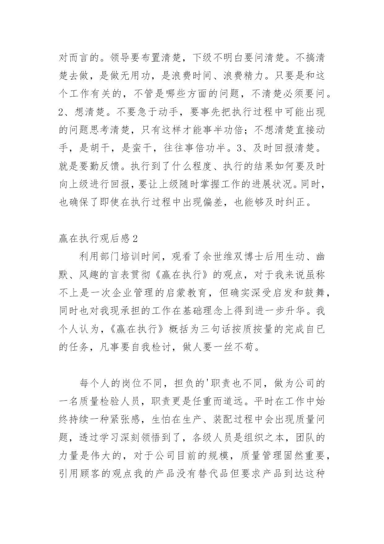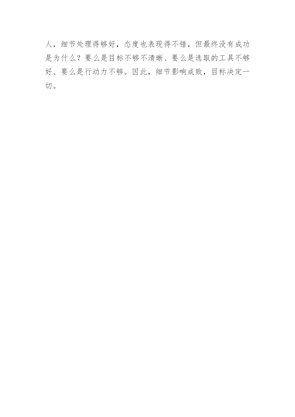 赢在执行观后感品味完一部作品后,相信大家一定领会了不少东西,是时候静下心来好好写写观后感了。可能你现在毫无头绪吧,以下是小编为大家整理的赢在执行观后感,欢迎大家分享。赢在执行观后感1看完《赢在执行》,收获很大,感触也很多。企业虽然和政府部门在运行机制、服务对象等很多方面存在很大差别,但在提高执行力这个问题上却是能够相互学习和借鉴的。但是,正因为有了这些差别的存在,所以不能照搬照套,照搬照套是典型的本本主义。如何提高执行潜力,结合学习状况,我认为就应从两个方面思考。第一个方面来自上级。上级在下达任务的同时要思考好两个方面的问题。1、任务的可执行性。下达任务的时候必须要思考下级的执行潜力,如果安排的工作超出了下级的执行潜力,对下级而言是不可能完成的任务,那么,即使再跳得高,也是摘不到桃子的,这是强人所难。2、任务的`明确性。下达的任务必须要清楚,不能有丝毫含糊。例如,布置一个材料任务,上级必须要把自己的意图讲清楚,要写哪些资料、讲多长时间、需要布置什么工作,否则,就会让下级无所适从。第二个方面的问题来自下级,就是具体的执行者。下级在执行过程中要注意三个方面的问题。1、问清楚。这是相对而言的。领导要布置清楚,下级不明白要问清楚。不搞清楚去做,是做无用功,是浪费时间、浪费精力。只要是和这个工作有关的,不管是哪些方面的问题,不清楚必须要问。2、想清楚。不要急于动手,要事先把执行过程中可能出现的问题思考清楚,只有这样才能事半功倍;不想清楚直接动手,是胡干,是蛮干,往往事倍功半。3、及时回报清楚。就是要勤反馈。执行到了什么程度、执行的结果如何要及时向上级进行回报,要让上级随时掌握工作的进展状况。同时,也确保了即使在执行过程中出现偏差,也能够及时纠正。赢在执行观后感2利用部门培训时间,观看了余世维双博士后用生动、幽默、风趣的言表贯彻《赢在执行》的观点,对于我来说虽称不上是一次企业管理的启蒙教育,但确实深受启发和鼓舞,同时也对我现承担的工作在基础理念上得到进一步升华。我个人认为,《赢在执行》概括为三句话按质按量的完成自已的任务,凡事要自我检讨,做人要一丝不苟。每个人的岗位不同,担负的'职责也不同,做为公司的一名质量检验人员,职责更是任重而道远。平时在工作中始终持续一种紧张感,生怕在生产、装配过程中会出现质量问题,透过学习深刻领悟到了,各级人员是组织之本,团队的力量是伟大的,对于公司目前的规模,质量管理固然重要,引用顾客的观点我的产品没有替代品但要求产品到达这种质量领域,对于企业来说靠一个、二个、五个人是不行的,这样就要体现出团队管理的核心力、与执行力。质量管理是需要全员参与管理的,但是,很多企业往往把这名话当成是一句口号在呼喊。自我检讨一下,在以前的工作中,很少会花太多的时间把工作拿出来分解,或是对昨日的事情拿过来分析、整理。总结其不足之处。原先的知识储备、实践经验已不能完全适应当前变革,要想有发展,学习是必需做的。对于新的工作要求,不知、不懂、不会,你敢于执行吗?所以,我必需检讨!其实我们每一个人都是在平凡的岗位上做着不平凡的工作,只要我们每一个人在职责范围内,按照标准不折不扣的执行,那么我们的企业就会更加具有竞争力。全心全意立即行动,这是优秀的执行力;不痛不痒拖拖拉拉,这是低下的执行力。无论你在思考,还是在寻找,请不要再拖拖拉拉,敷衍了事,让我们全心全意,一丝不苟的的做自已就应做的事,明白只要自己的方向是正确的,那么,此刻就行动吧!赢在执行观后感3在余世维《赢在执行》讲座中,多次谈到细节决定成败。前国家足球队主教练米卢所戴帽子上写着态度决定一切。似乎大家都在强调细节、态度如何如何重要,的确,有时细节处理不够好、态度不够好事关全局。俗话说,大船都怕钉眼漏,千里之堤溃于蚁穴。于是乎,细节决定成败、态度决定一切了。举个例子说,假若有个同志想去北京,行前吃、喝、行李等等都备齐了(重视细节),但是,在路上由于对自己所到的目标不清晰,一路上走走停停、边玩边欣赏风景,甚至到北京变成了去广州,我想这时他越努力,离目标就越远(因为背道而驰了)。但是,注重目标却不同了。正如唐僧带领师徒4人到西天取经一样,虽然一路上碰到妖魔鬼怪,有时大徒弟孙悟空、二徒弟猪八戒路上偶有调皮,但不管怎样,唐僧立定决心要到西天取得真经(目标),不管发生多大的事、碰到多大的困难,他都要带领徒弟到西天取得真经,实现他把佛传回大唐、普渡众生的.宏愿。由此,我们能够看出,目标决定一切。时下,我们许多高中学生,他们的学习态度十分好,但是由于奋斗目标不清晰,所以,也很难考上理想大学。当然,单单确立了目标是远远不够的。其次是选取工具的问题。从武汉到北京,能够乘飞机、乘火车、骑自行车假如,乘飞机只需2小时,乘火车需要12小时、骑自行车需要12天。选取工具的条件就是达致目标的时间和条件。第三,行动