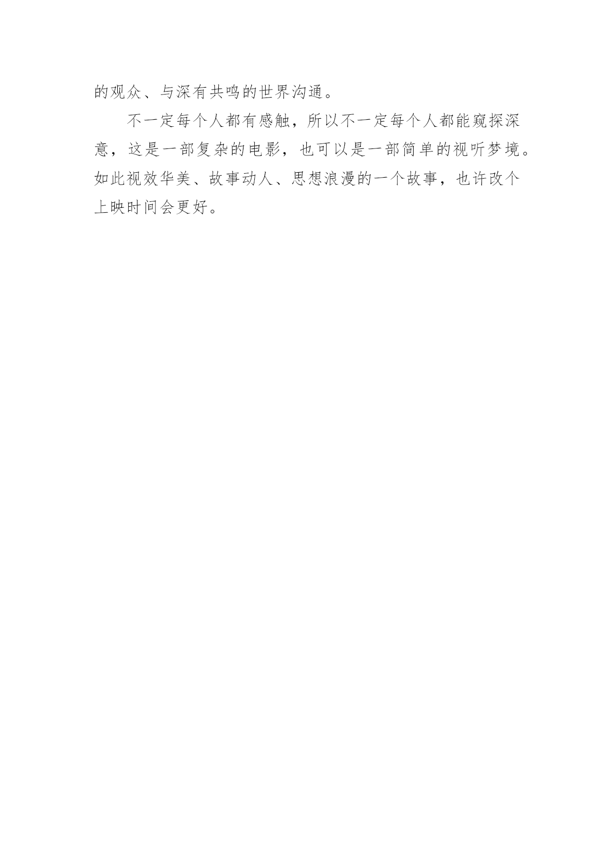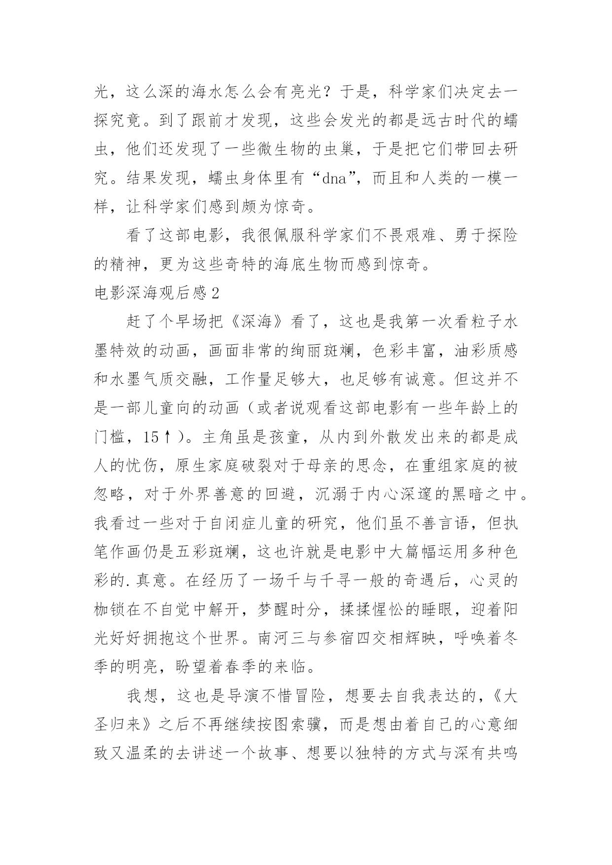 电影深海观后感电影深海观后感当看完一部作品后,相信大家一定领会了不少东西,是时候写一篇观后感好好记录一下了。那么观后感到底应该怎么写呢?以下是小编精心整理的电影深海观后感,欢迎阅读,希望大家能够喜欢。电影深海观后感1昨天,我和姐姐去上海科技馆观看巨型立体球幕电影深海火山。这部电影让我增长了许多见识。电影的银幕是一个半圆形的球体,座位很高,上面一层人的脚可以碰到下面一层人的头。电影讲述的是一个地质学家去海滩度假是,偶然发现在山崖上有一种比恐龙还早的动物活化石,令他惊愕不已。20年后,这位地质学家和其他科学家一起乘坐潜水艇到三千英尺深的水下去探险。在水下,他们发现海底火山喷发时喷出的岩浆和有毒气体足以使所有的动物都死亡,但火山喷发后,科学家们却发现在一些熔岩凝结成的石柱上,布满了许许多多的管虫,他们生机勃勃,根本没有被沸腾的.海水“烤熟”,原来,这些管虫专吃火山喷发完后水中的微生物。科学家们再看别的生物,一只龙虾漂了过来,他通体红色,显然,他已经被烤熟。科学家们决定到火山口里去看看,突然,他们发现再一片山谷背后有亮光,这么深的海水怎么会有亮光?于是,科学家们决定去一探究竟。到了跟前才发现,这些会发光的都是远古时代的蠕虫,他们还发现了一些微生物的虫巢,于是把它们带回去研究。结果发现,蠕虫身体里有“dna”,而且和人类的一模一样,让科学家们感到颇为惊奇。看了这部电影,我很佩服科学家们不畏艰难、勇于探险的精神,更为这些奇特的海底生物而感到惊奇。电影深海观后感2赶了个早场把《深海》看了,这也是我第一次看粒子水墨特效的动画,画面非常的绚丽斑斓,色彩丰富,油彩质感和水墨气质交融,工作量足够大,也足够有诚意。但这并不是一部儿童向的动画(或者说观看这部电影有一些年龄上的门槛,15↑)。主角虽是孩童,从内到外散发出来的都是成人的忧伤,原生家庭破裂对于母亲的思念,在重组家庭的被忽略,对于外界善意的回避,沉溺于内心深邃的黑暗之中。我看过一些对于自闭症儿童的研究,他们虽不善言语,但执笔作画仍是五彩斑斓,这也许就是电影中大篇幅运用多种色彩的.真意。在经历了一场千与千寻一般的奇遇后,心灵的枷锁在不自觉中解开,梦醒时分,揉揉惺忪的睡眼,迎着阳光好好拥抱这个世界。南河三与参宿四交相辉映,呼唤着冬季的明亮,盼望着春季的来临。我想,这也是导演不惜冒险,想要去自我表达的,《大圣归来》之后不再继续按图索骥,而是想由着自己的心意细致又温柔的去讲述一个故事、想要以独特的方式与深有共鸣的观众、与深有共鸣的世界沟通。不一定每个人都有感触,所以不一定每个人都能窥探深意,这是一部复杂的电影,也可以是一部简单的视听梦境。如此视效华美、故事动人、思想浪漫的一个故事,也许改个上映时间会更好。