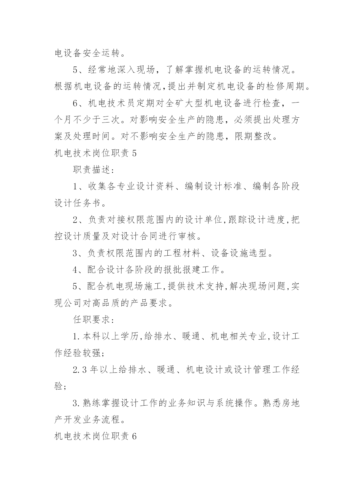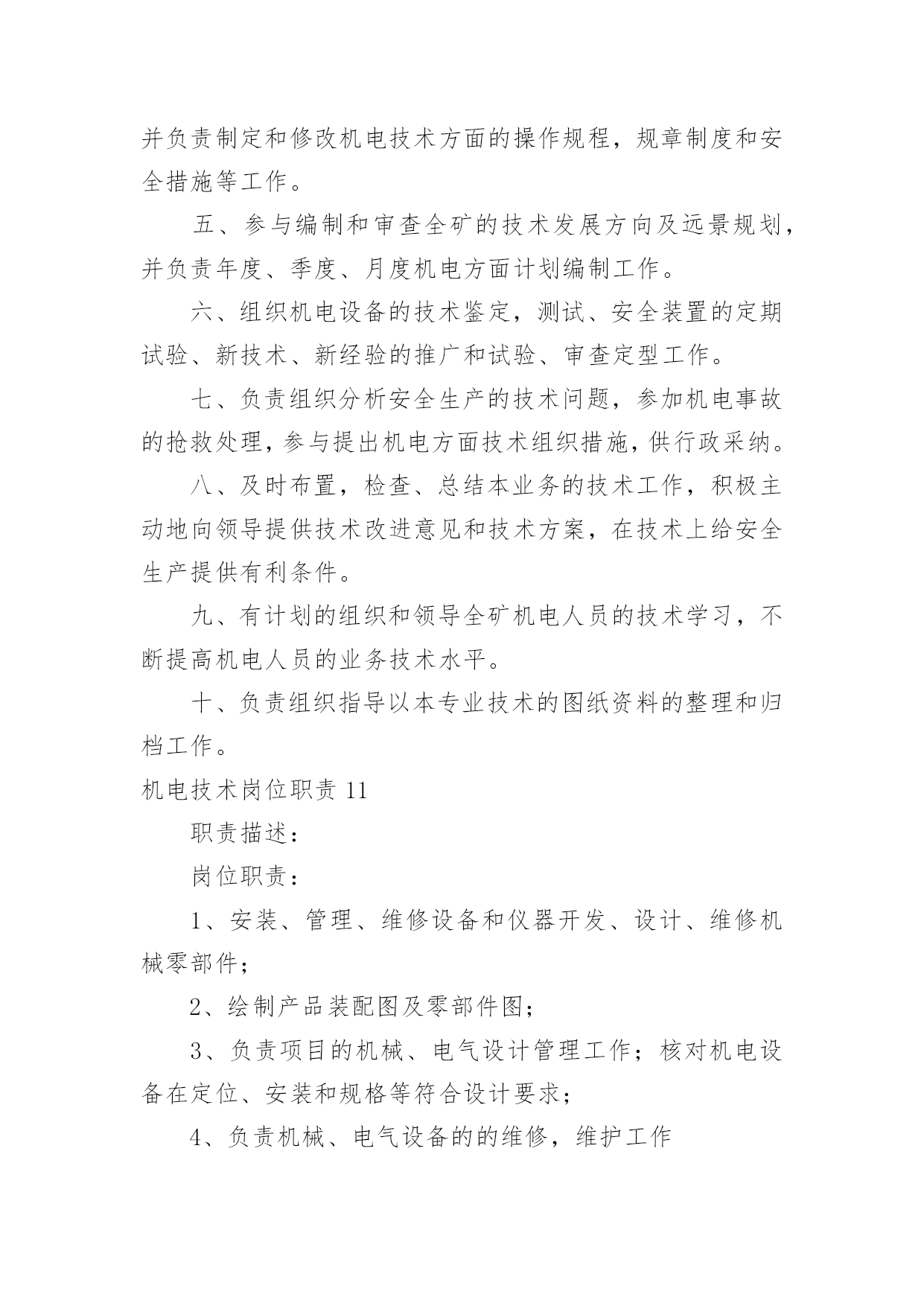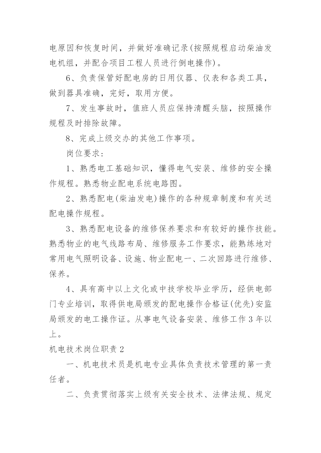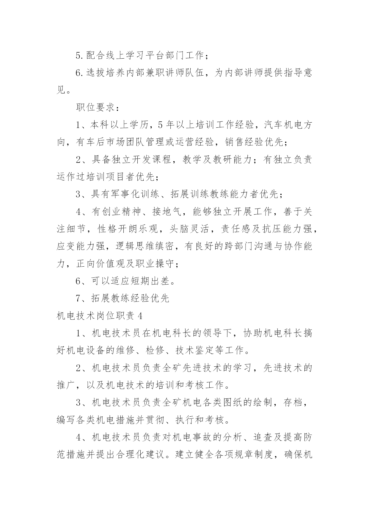 机电技术岗位职责机电技术岗位职责在当下社会,很多地方都会使用到岗位职责,岗位职责是指一个岗位所需要去完成的工作内容以及应当承担的责任范围,职责是职务与责任的统一,由授权范围和相应的责任两部分组成。相信很多朋友都对制定岗位职责感到非常苦恼吧,以下是小编整理的机电技术岗位职责,希望能够帮助到大家。机电技术岗位职责1岗位职责:1、负责重庆公司所辖各项目配电房(柴油发电机房)设施、设备的维护、维修和保养工作、负责所辖项目专业配电房及柴油发电房的工作。2、严格按照配电操作规程,负责配电设备的运行监护,严守配电房的值班、交接班和人员进出配电房的有关规定,杜绝闲杂人员进入配电房,确保配电设备的安全运行。3、负责配电房及柴油发电机房设备维修保养规程,进行日常维护和例行保养。4、坚守岗位,定期巡视检查配电运行仪表,认真抄录填写各种报表和运行记录。5、当发生停电事件时,立即与供电部门联系,问明停电原因和恢复时间,并做好准确记录(按照规程启动柴油发电机组,并配合项目工程人员进行倒电操作)。6、负责保管好配电房的日用仪器、仪表和各类工具,做到器具准确,完好,取用方便。7、发生事故时,值班人员应保持清醒头脑,按照操作规程及时排除故障。8、完成上级交办的其他工作事项。岗位要求:1、熟悉电工基础知识,懂得电气安装、维修的安全操作规程。熟悉物业配电系统电路图。2、熟悉配电(柴油发电)操作的各种规章制度和有关送配电操作规程。3、熟悉配电设备的维修保养要求和有较好的操作技能。熟悉物业的电气线路布局、维修服务工作要求,能熟练地对常用电气照明设备、设施、物业配电一、二次回路进行维修、保养。4、具有高中以上文化或中技学校毕业学历,经供电部门专业培训,取得供电局颁发的配电操作合格证(优先)安监局颁发的电工操作证。从事电气设备安装、维修工作3年以上。机电技术岗位职责2一、机电技术员是机电专业具体负责技术管理的第一责任者。二、负责贯彻落实上级有关安全技术、法律法规、规定以及三大规程在现场的实施。三、负责机电专业全面安全技术工作,具体负责组织编制停产检修措施、重大安全措施以及一般安全措施的审查。四、具体负责大型设备的安全运行、技术测定、各类保护整定、资料存档及各类保护设施的正常使用。五、具体负责设备的技术改造,新技术的推广应用,数据测试整理,图纸资料存档,以及设计、安装、供电图纸资料的审核。六、负责每旬至少一次按照煤矿安全规程对大型设备的技术装备、安全设施、井筒装备的检查。七、负责每月至少三次对各大型设备机房硐室的安全质量标准化检查,同时进行隐患排查。机电技术岗位职责3职位描述:职责描述:1.配合公司新业务开展,辅助汽车后市场线下门店培训体系的落地与执行;2.协助培训经理完善课程体系的搭建,培训项目策划工作;负责培训项目的执行,需求调研,课程开发,课程讲授,培训落地实施与检查并对培训结果进行客观评估,提出改进计划;3.根据培训项目需求独立开发课件并授课,编制培训教材,确保培训开展的专业性与高效性;4.根据培训计划,高效开展培训的整体实施与监督工作;5.配合线上学习平台部门工作;6.选拔培养内部兼职讲师队伍,为内部讲师提供指导意见。职位要求:1、本科以上学历,5年以上培训工作经验,汽车机电方向,有车后市场团队管理或运营经验,销售经验优先;2、具备独立开发课程,教学及教研能力;有独立负责运作过培训项目者优先;3、具有军事化训练、拓展训练教练能力者优先;4、有创业精神、接地气,能够独立开展工作,善于关注细节,性格开朗乐观,头脑灵活,责任感及抗压能力强,应变能力强,逻辑思维缜密,有良好的跨部门沟通与协作能力,正向价值观及职业操守;6、可以适应短期出差。7、拓展教练经验优先机电技术岗位职责41、机电技术员在机电科长的领导下,协助机电科长搞好机电设备的维修、检修、技术鉴定等工作。2、机电技术员负责全矿先进技术的学习,先进技术的推广,以及机电技术的培训和考核工作。3、机电技术员负责全矿机电各类图纸的绘制,存档,编写各类机电措施并贯彻、执行和考核。4、机电技术员负责对机电事故的分析、追查及提高防范措施并提出合理化建议。建立健全各项规章制度,确保机电设备安全运转。5、经常地深入现场,了解掌握机电设备的运转情况。根据机电设备的运转情况,提出并制定机电设备的检修周期。6、机电技术员定期对全矿大型机电设备进行检查,一个月不少于三次。对影响安全生产的隐患,必须提出处理方案及处理时间。对不影响安全生产的隐患,限期整改。机电技术岗位职责5职责描述:1、收集各专业设计资料、编制设计标准、编制各阶段设计任务书。2、负责对接权限范围内的设计单位,跟踪设计进度,把控设计质量及对设计合同进行审核。3、负责权限范围内的工程材料、设备设施选型。4、配合设计各阶段的报批报建工作。5、配合机电现场施工,提供技术支持,解