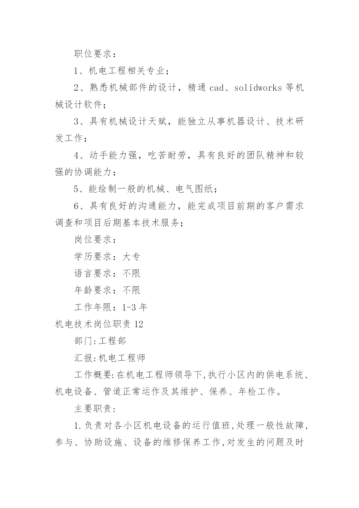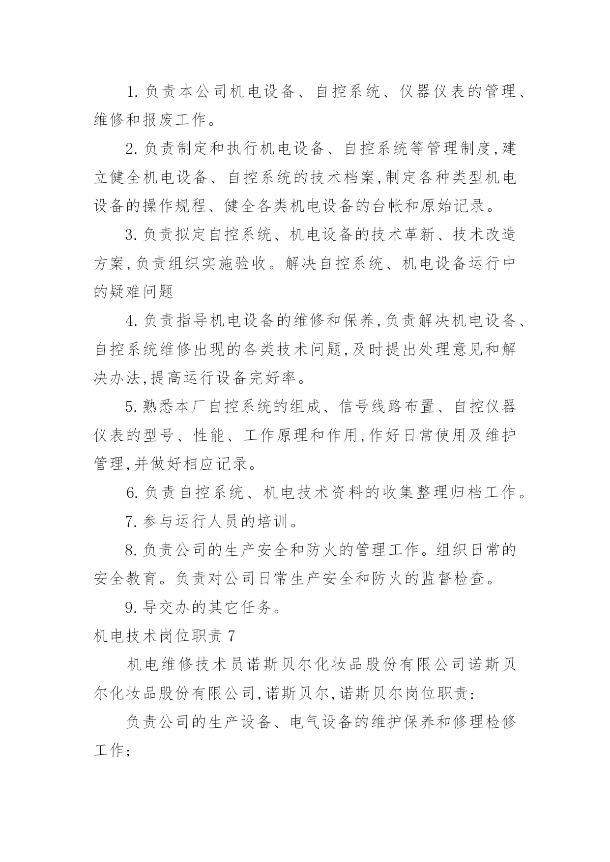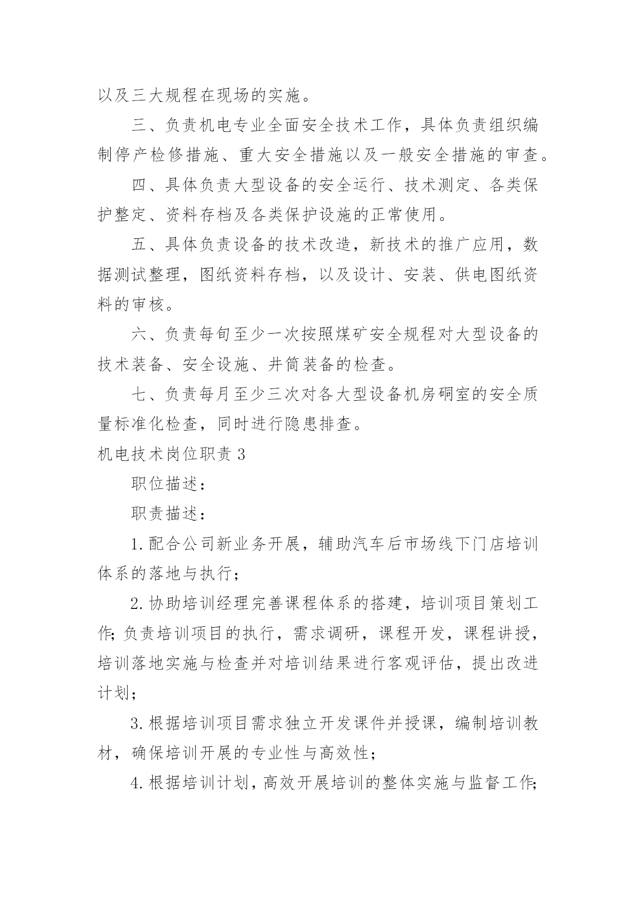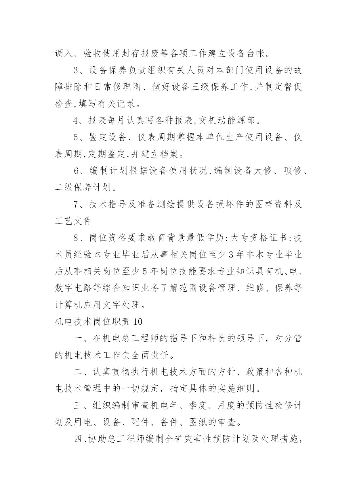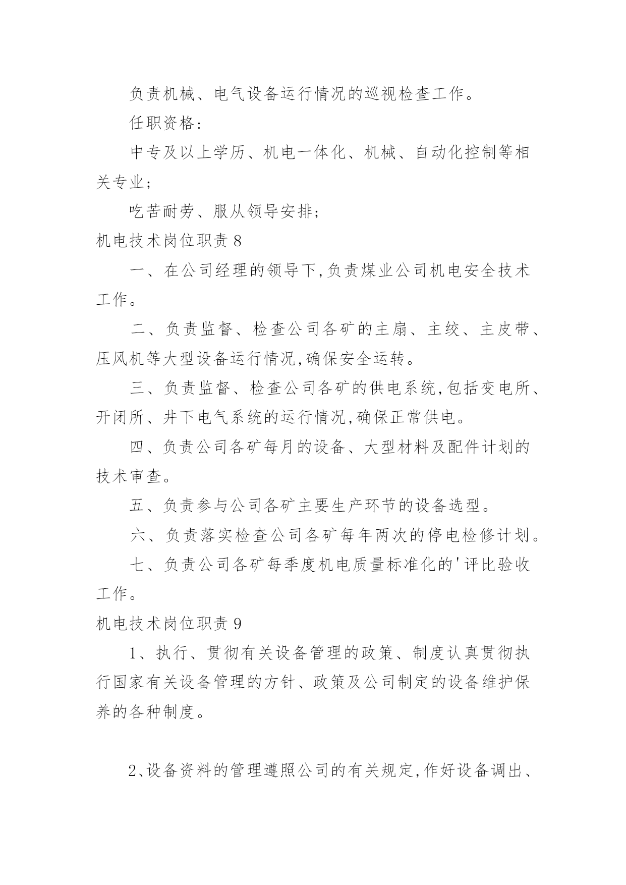 机电技术岗位职责机电技术岗位职责在当下社会,很多地方都会使用到岗位职责,岗位职责是指一个岗位所需要去完成的工作内容以及应当承担的责任范围,职责是职务与责任的统一,由授权范围和相应的责任两部分组成。相信很多朋友都对制定岗位职责感到非常苦恼吧,以下是小编整理的机电技术岗位职责,希望能够帮助到大家。机电技术岗位职责1岗位职责:1、负责重庆公司所辖各项目配电房(柴油发电机房)设施、设备的维护、维修和保养工作、负责所辖项目专业配电房及柴油发电房的工作。2、严格按照配电操作规程,负责配电设备的运行监护,严守配电房的值班、交接班和人员进出配电房的有关规定,杜绝闲杂人员进入配电房,确保配电设备的安全运行。3、负责配电房及柴油发电机房设备维修保养规程,进行日常维护和例行保养。4、坚守岗位,定期巡视检查配电运行仪表,认真抄录填写各种报表和运行记录。5、当发生停电事件时,立即与供电部门联系,问明停电原因和恢复时间,并做好准确记录(按照规程启动柴油发电机组,并配合项目工程人员进行倒电操作)。6、负责保管好配电房的日用仪器、仪表和各类工具,做到器具准确,完好,取用方便。7、发生事故时,值班人员应保持清醒头脑,按照操作规程及时排除故障。8、完成上级交办的其他工作事项。岗位要求:1、熟悉电工基础知识,懂得电气安装、维修的安全操作规程。熟悉物业配电系统电路图。2、熟悉配电(柴油发电)操作的各种规章制度和有关送配电操作规程。3、熟悉配电设备的维修保养要求和有较好的操作技能。熟悉物业的电气线路布局、维修服务工作要求,能熟练地对常用电气照明设备、设施、物业配电一、二次回路进行维修、保养。4、具有高中以上文化或中技学校毕业学历,经供电部门专业培训,取得供电局颁发的配电操作合格证(优先)安监局颁发的电工操作证。从事电气设备安装、维修工作3年以上。机电技术岗位职责2一、机电技术员是机电专业具体负责技术管理的第一责任者。二、负责贯彻落实上级有关安全技术、法律法规、规定以及三大规程在现场的实施。三、负责机电专业全面安全技术工作,具体负责组织编制停产检修措施、重大安全措施以及一般安全措施的审查。四、具体负责大型设备的安全运行、技术测定、各类保护整定、资料存档及各类保护设施的正常使用。五、具体负责设备的技术改造,新技术的推广应用,数据测试整理,图纸资料存档,以及设计、安装、供电图纸资料的审核。六、负责每旬至少一次按照煤矿安全规程对大型设备的技术装备、安全设施、井筒装备的检查。七、负责每月至少三次对各大型设备机房硐室的安全质量标准化检查,同时进行隐患排查。机电技术岗位职责3职位描述:职责描述:1.配合公司新业务开展,辅助汽车后市场线下门店培训体系的落地与执行;2.协助培训经理完善课程体系的搭建,培训项目策划工作;负责培训项目的执行,需求调研,课程开发,课程讲授,培训落地实施与检查并对培训结果进行客观评估,提出改进计划;3.根据培训项目需求独立开发课件并授课,编制培训教材,确保培训开展的专业性与高效性;4.根据培训计划,高效开展培训的整体实施与监督工作;5.配合线上学习平台部门工作;6.选拔培养内部兼职讲师队伍,为内部讲师提供指导意见。职位要求:1、本科以上学历,5年以上培训工作经验,汽车机电方向,有车后市场团队管理或运营经验,销售经验优先;2、具备独立开发课程,教学及教研能力;有独立负责运作过培训项目者优先;3、具有军事化训练、拓展训练教练能力者优先;4、有创业精神、接地气,能够独立开展工作,善于关注细节,性格开朗乐观,头脑灵活,责任感及抗压能力强,应变能力强,逻辑思维缜密,有良好的跨部门沟通与协作能力,正向价值观及职业操守;6、可以适应短期出差。7、拓展教练经验优先机电技术岗位职责41、机电技术员在机电科长的领导下,协助机电科长搞好机电设备的维修、检修、技术鉴定等工作。2、机电技术员负责全矿先进技术的学习,先进技术的推广,以及机电技术的培训和考核工作。3、机电技术员负责全矿机电各类图纸的绘制,存档,编写各类机电措施并贯彻、执行和考核。4、机电技术员负责对机电事故的分析、追查及提高防范措施并提出合理化建议。建立健全各项规章制度,确保机电设备安全运转。5、经常地深入现场,了解掌握机电设备的运转情况。根据机电设备的运转情况,提出并制定机电设备的检修周期。6、机电技术员定期对全矿大型机电设备进行检查,一个月不少于三次。对影响安全生产的隐患,必须提出处理方案及处理时间。对不影响安全生产的隐患,限期整改。机电技术岗位职责5职责描述:1、收集各专业设计资料、编制设计标准、编制各阶段设计任务书。2、负责对接权限范围内的设计单位,跟踪设计进度,把控设计质量及对设计合同进行审核。3、负责权限范围内的工程材料、设备设施选型。4、配合设计各阶段的报批报建工作。5、配合机电现场施工,提供技术支持,解