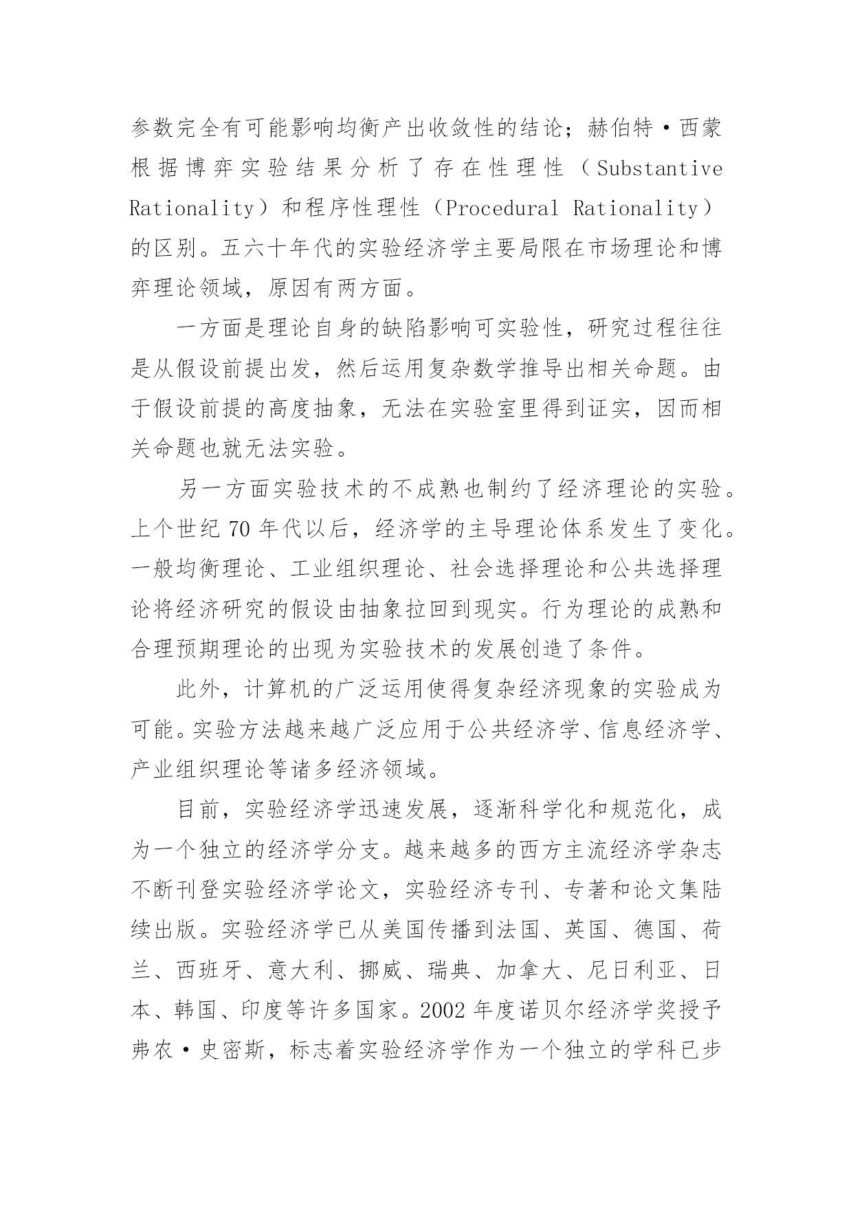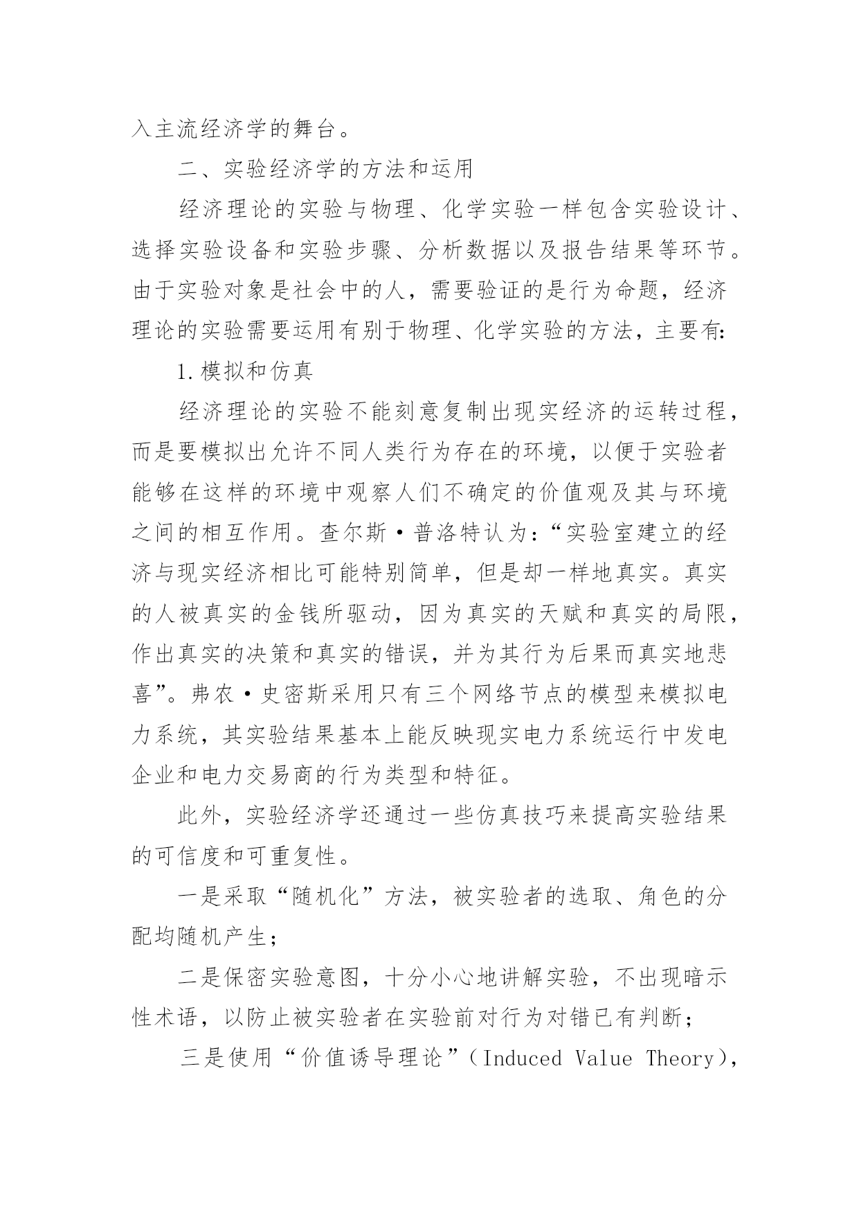 实验经济学:兴起、应用与意义实验经济学:兴起、应用与意义实验经济学:兴起、应用与意义2002年度诺贝尔经济学奖授予了美国经济学家弗农·史密斯,以表彰他在实验经济学领域所作出的杰出贡献。实验经济学对于中国经济工作者仍是一个比较陌生的领域。本文将对实验经济学的发展过程、基本方法及主要特点作简单介绍。一、实验经济学的兴起和发展实验经济学的研究,是在可控制的实验环境下对某一经济现象,通过控制实验条件、观察实验者行为和分析实验结果,以检验、比较和完善经济理论或提供决策依据的一门学科。人们在很长一段时间里始终固守着经济理论难以实验的思维定式。弗农·史密斯教授敏锐觉察到实验经济理论的作用,并首次付之于实践。他在亚利桑那大学十一个班级进行了长达六年的实验,验证了竞争均衡理论。据此实验所撰写的论文《竞争市场行为的实验研究》在1962年的《政治经济学杂志》发表,标志着实验经济学的诞生。此后,实验经济学开始运用于验证市场理论和博弈理论,并取得了一定进展。例如,弗农·史密斯的“口头双向拍卖市场实验”提出了市场参数完全有可能影响均衡产出收敛性的结论;赫伯特·西蒙根据博弈实验结果分析了存在性理性(SubstantiveRationality)和程序性理性(ProceduralRationality)的区别。五六十年代的实验经济学主要局限在市场理论和博弈理论领域,原因有两方面。一方面是理论自身的缺陷影响可实验性,研究过程往往是从假设前提出发,然后运用复杂数学推导出相关命题。由于假设前提的高度抽象,无法在实验室里得到证实,因而相关命题也就无法实验。另一方面实验技术的不成熟也制约了经济理论的实验。上个世纪70年代以后,经济学的主导理论体系发生了变化。一般均衡理论、工业组织理论、社会选择理论和公共选择理论将经济研究的假设由抽象拉回到现实。行为理论的成熟和合理预期理论的出现为实验技术的发展创造了条件。此外,计算机的广泛运用使得复杂经济现象的实验成为可能。实验方法越来越广泛应用于公共经济学、信息经济学、产业组织理论等诸多经济领域。目前,实验经济学迅速发展,逐渐科学化和规范化,成为一个独立的经济学分支。越来越多的西方主流经济学杂志不断刊登实验经济学论文,实验经济专刊、专著和论文集陆续出版。实验经济学已从美国传播到法国、英国、德国、荷兰、西班牙、意大利、挪威、瑞典、加拿大、尼日利亚、日本、韩国、印度等许多国家。2002年度诺贝尔经济学奖授予弗农·史密斯,标志着实验经济学作为一个独立的学科已步入主流经济学的舞台。二、实验经济学的方法和运用经济理论的实验与物理、化学实验一样包含实验设计、选择实验设备和实验步骤、分析数据以及报告结果等环节。由于实验对象是社会中的人,需要验证的是行为命题,经济理论的实验需要运用有别于物理、化学实验的方法,主要有:1.模拟和仿真经济理论的实验不能刻意复制出现实经济的运转过程,而是要模拟出允许不同人类行为存在的环境,以便于实验者能够在这样的环境中观察人们不确定的价值观及其与环境之间的相互作用。查尔斯·普洛特认为:“实验室建立的经济与现实经济相比可能特别简单,但是却一样地真实。真实的人被真实的金钱所驱动,因为真实的天赋和真实的局限,作出真实的决策和真实的错误,并为其行为后果而真实地悲喜”。弗农·史密斯采用只有三个网络节点的模型来模拟电力系统,其实验结果基本上能反映现实电力系统运行中发电企业和电力交易商的行为类型和特征。此外,实验经济学还通过一些仿真技巧来提高实验结果的可信度和可重复性。一是采取“随机化”方法,被实验者的选取、角色的分配均随机产生;二是保密实验意图,十分小心地讲解实验,不出现暗示性术语,以防止被实验者在实验前对行为对错已有判断;三是使用“价值诱导理论”(InducedValueTheory),诱导被实验者发挥被指定角色的特性,使其个人先天的特性尽可能与实验无关。下一页