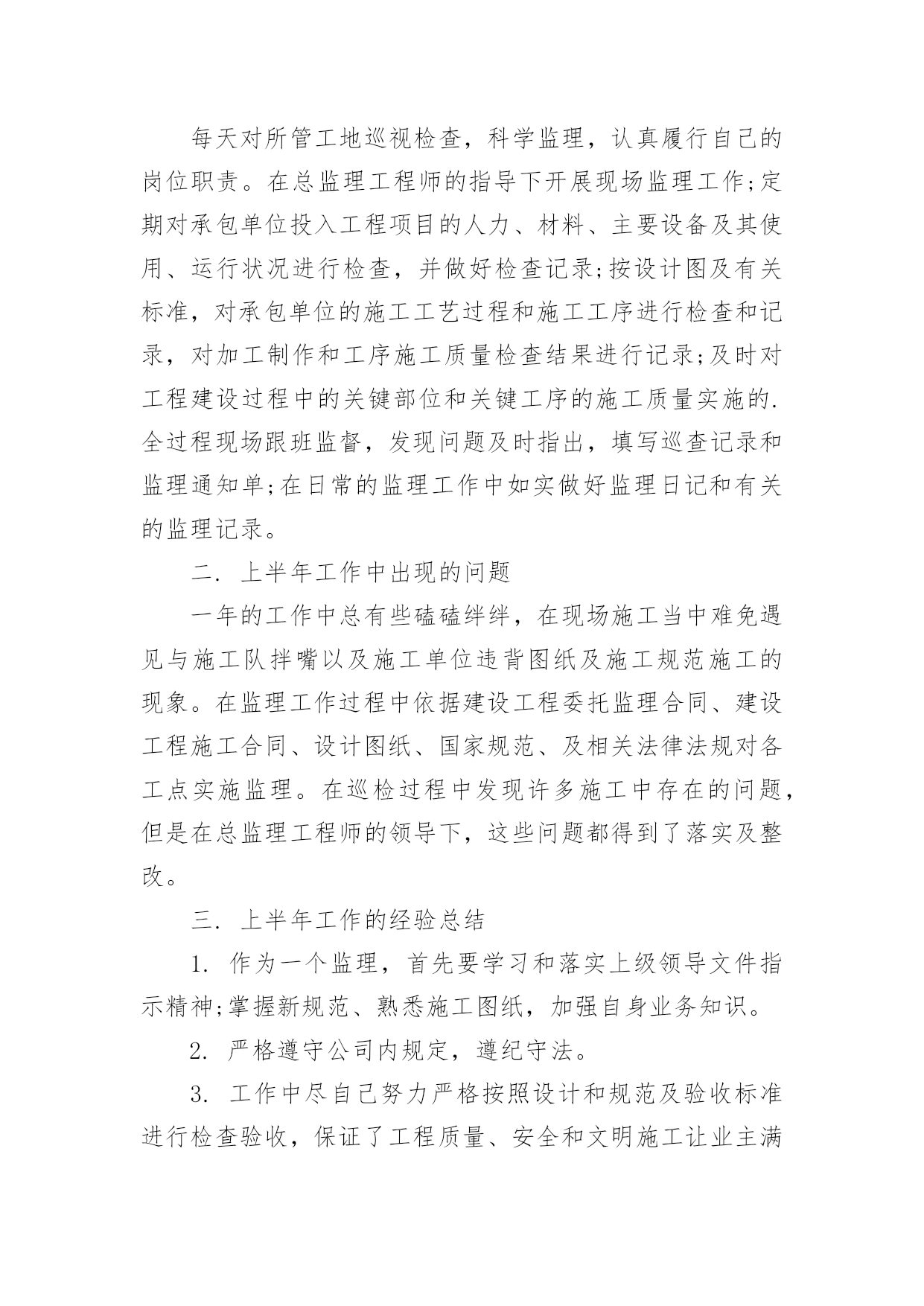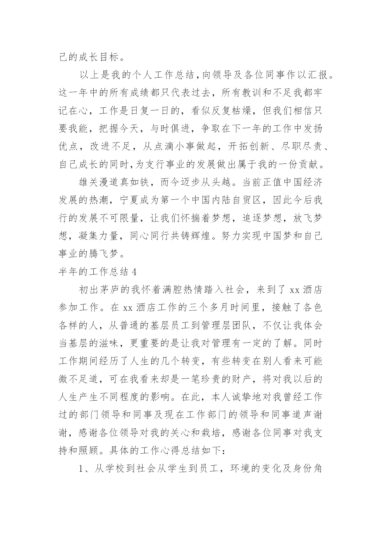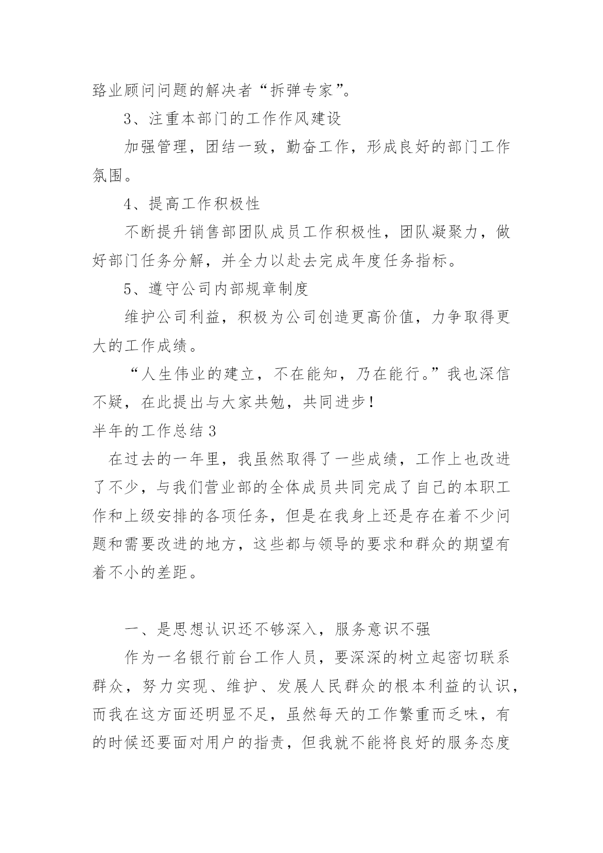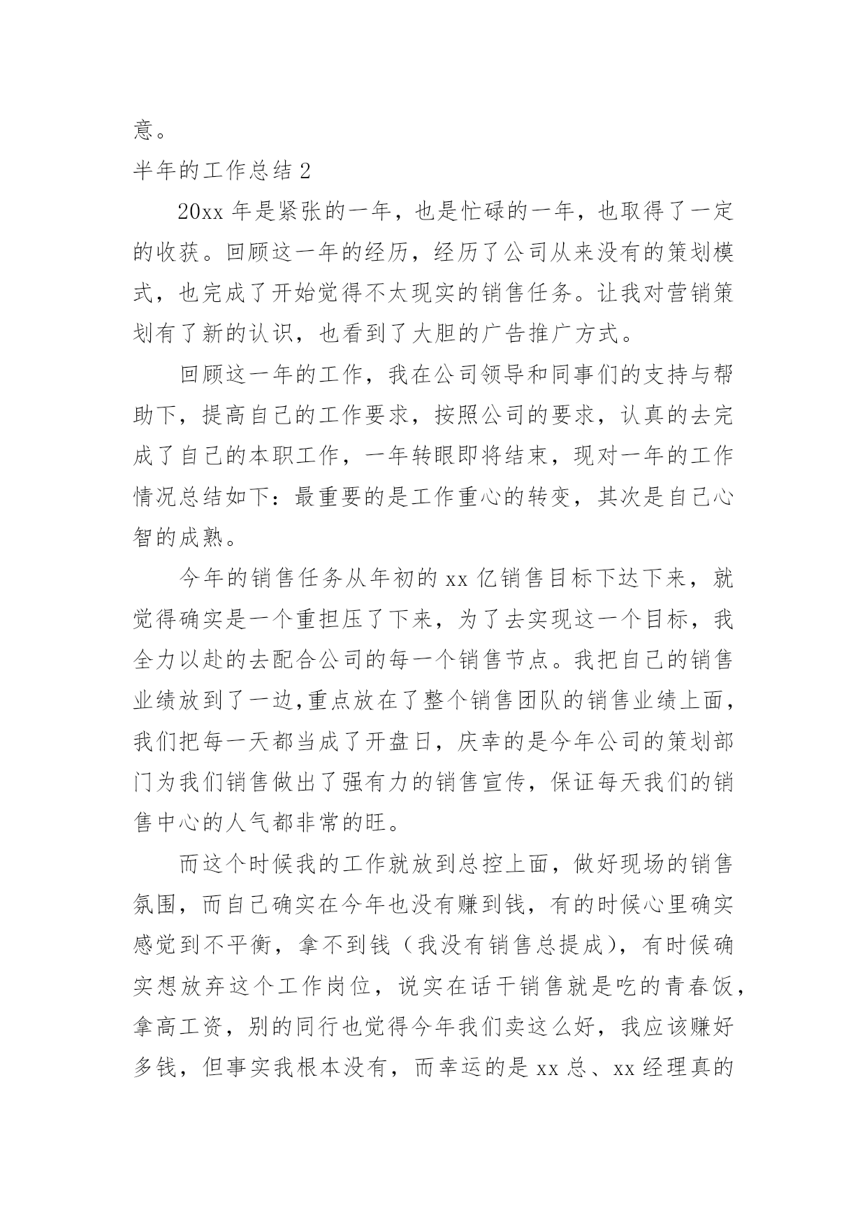 半年的工作总结半年的工作总结总结是指社会团体、企业单位和个人对某一阶段的学习、工作或其完成情况加以回顾和分析,得出教训和一些规律性认识的一种书面材料,它在我们的学习、工作中起到呈上启下的作用,不如静下心来好好写写总结吧。那么总结有什么格式呢?以下是小编整理的半年的工作总结,欢迎阅读,希望大家能够喜欢。半年的工作总结120xx年上半年已经结束,回首展望,工作里有喜有忧。为更好地便于以后的工作,特在此总结一下今年的工作经验及教训,提高自身的综合素质,寻找更好的工作方法,以便在20xx年下半年更好地努力工作。一.本年工作情况我自从年初来到五南区间担任监理,努力学习业务和了解工地情况,先后泰山路站围护桩施工、芝泉路站和五南区间的施工监管工作。目前五南区间已完成开挖支护50%,这三个项目均为逢查必检的工点,因此在平时的施工当中尽职尽责,严把质量关,在平时的检查当中经受住了考验,较好地完成了本职工作及上级领导安排的各项工作。每天对所管工地巡视检查,科学监理,认真履行自己的岗位职责。在总监理工程师的指导下开展现场监理工作;定期对承包单位投入工程项目的人力、材料、主要设备及其使用、运行状况进行检查,并做好检查记录;按设计图及有关标准,对承包单位的施工工艺过程和施工工序进行检查和记录,对加工制作和工序施工质量检查结果进行记录;及时对工程建设过程中的关键部位和关键工序的施工质量实施的.全过程现场跟班监督,发现问题及时指出,填写巡查记录和监理通知单;在日常的监理工作中如实做好监理日记和有关的监理记录。二.上半年工作中出现的问题一年的工作中总有些磕磕绊绊,在现场施工当中难免遇见与施工队拌嘴以及施工单位违背图纸及施工规范施工的现象。在监理工作过程中依据建设工程委托监理合同、建设工程施工合同、设计图纸、国家规范、及相关法律法规对各工点实施监理。在巡检过程中发现许多施工中存在的问题,但是在总监理工程师的领导下,这些问题都得到了落实及整改。三.上半年工作的经验总结1.作为一个监理,首先要学习和落实上级领导文件指示精神;掌握新规范、熟悉施工图纸,加强自身业务知识。2.严格遵守公司内规定,遵纪守法。3.工作中尽自己努力严格按照设计和规范及验收标准进行检查验收,保证了工程质量、安全和文明施工让业主满意。半年的工作总结220xx年是紧张的一年,也是忙碌的一年,也取得了一定的收获。回顾这一年的经历,经历了公司从来没有的策划模式,也完成了开始觉得不太现实的销售任务。让我对营销策划有了新的认识,也看到了大胆的广告推广方式。回顾这一年的工作,我在公司领导和同事们的支持与帮助下,提高自己的工作要求,按照公司的要求,认真的去完成了自己的本职工作,一年转眼即将结束,现对一年的工作情况总结如下:最重要的是工作重心的转变,其次是自己心智的成熟。今年的销售任务从年初的xx亿销售目标下达下来,就觉得确实是一个重担压了下来,为了去实现这一个目标,我全力以赴的去配合公司的每一个销售节点。我把自己的销售业绩放到了一边,重点放在了整个销售团队的销售业绩上面,我们把每一天都当成了开盘日,庆幸的是今年公司的策划部门为我们销售做出了强有力的销售宣传,保证每天我们的销售中心的人气都非常的旺。而这个时候我的工作就放到总控上面,做好现场的销售氛围,而自己确实在今年也没有赚到钱,有的时候心里确实感觉到不平衡,拿不到钱(我没有销售总提成),有时候确实想放弃这个工作岗位,说实在话干销售就是吃的青春饭,拿高工资,别的同行也觉得今年我们卖这么好,我应该赚好多钱,但事实我根本没有,而幸运的是xx总、xx经理真的也很理解我,对我关怀和帮助,同事们也非常配合我的工作,我应该感谢他们。20xx年的主要工作内容如下:一、销售部日常管理工作销售部门是公司对外展示的形象窗口,代表的是一个公司外表,也是公司最赚钱的一个部门,是一个先锋部队。销售部工作也是最直接的,拿业绩说话。天天跟形形色色的人打交道也是最难的一件事情,特别有些客户不讲道理,死缠烂打。面对这些工作,为了完成任务目标,自我强化工作意识,提高工作效率,细化工作内容,冷静处理客户问题,力求达到客户的满意度,创造良好的客户口碑,力求各项工作准确,避免疏漏和差错,至今基本做的还是比较完善。1、认真做好市场调研工作对xx市场的信息掌握,对竞争对手的产品细致分析,每周调研做好记录,及时和团队分享,给公司产品定价提供依据,做到知己知彼百战不殆。2、营造火爆的'销售氛围促进销售配合策划部门的活动作出应对调整,在销售现场做好总控,盯紧销售案场的每一组客户做出调整,应对突发情况,核对房源、价格、优惠等确保准确,避免疏漏和差错。3、做好客户问题的处理客户多了什么样的情况都有,要退房的、要优惠的、有对合同条款不满意的等等。在保证公司的利益不被侵犯的前提下,与客户周旋,洽谈,不但要完成签约,