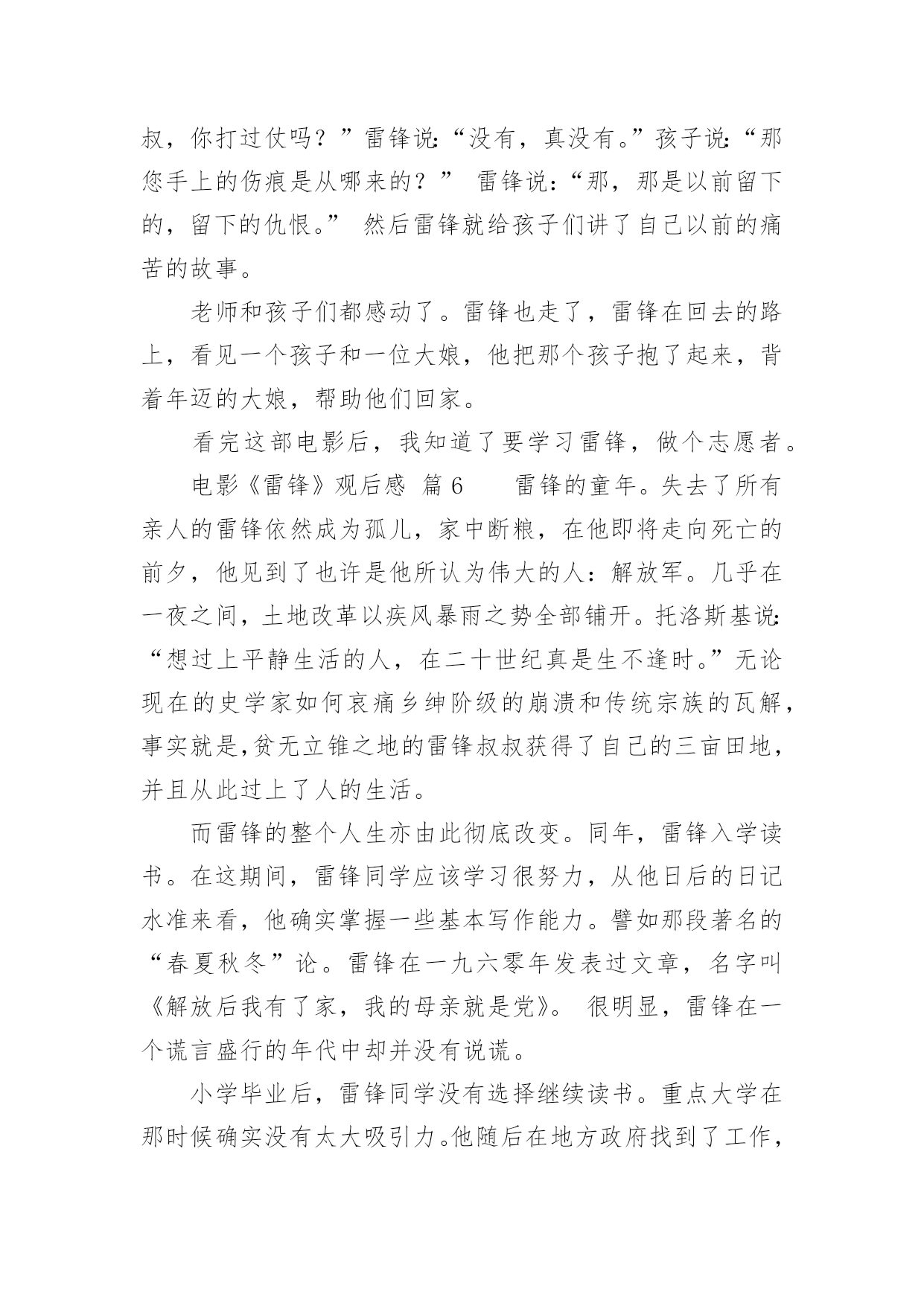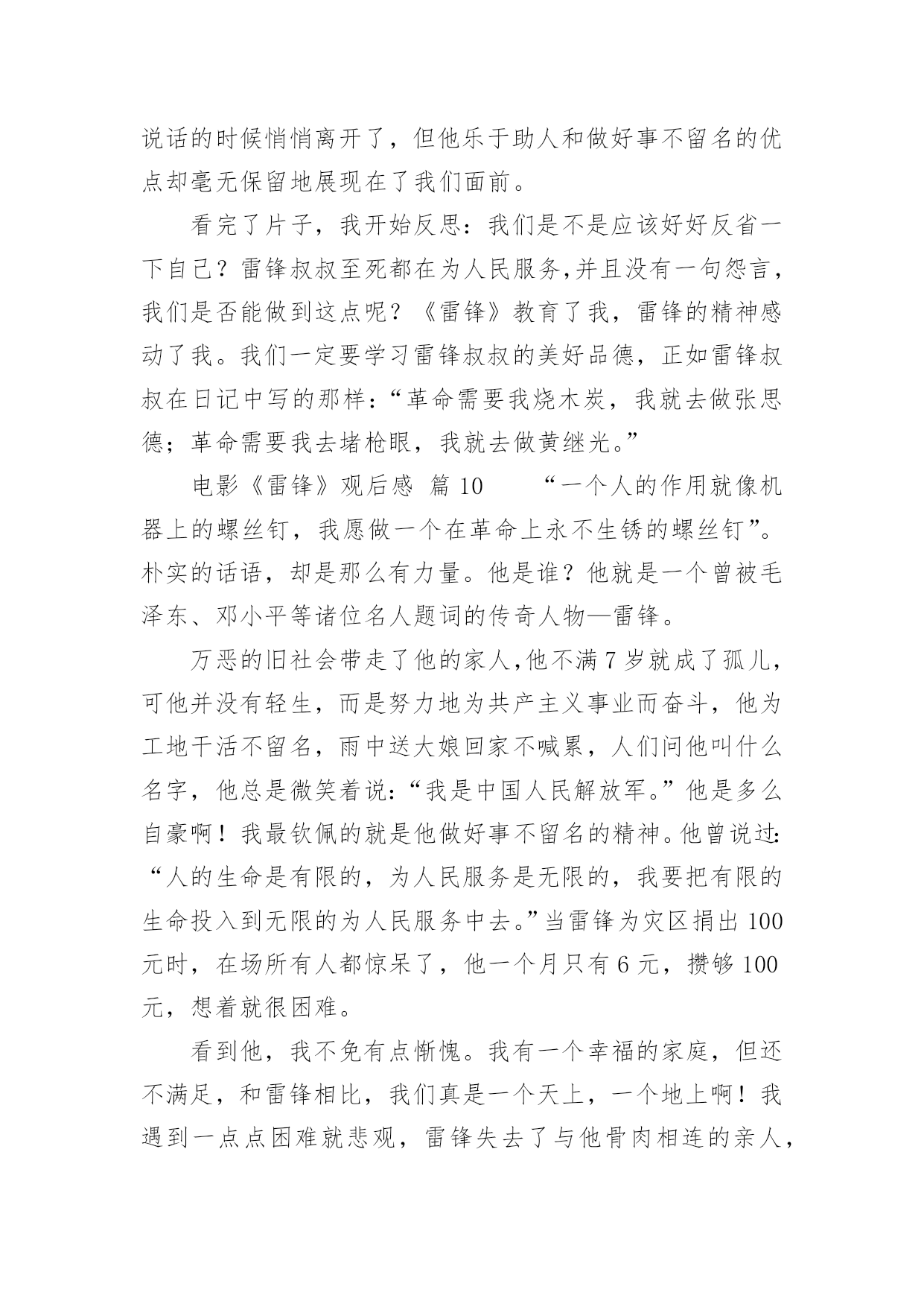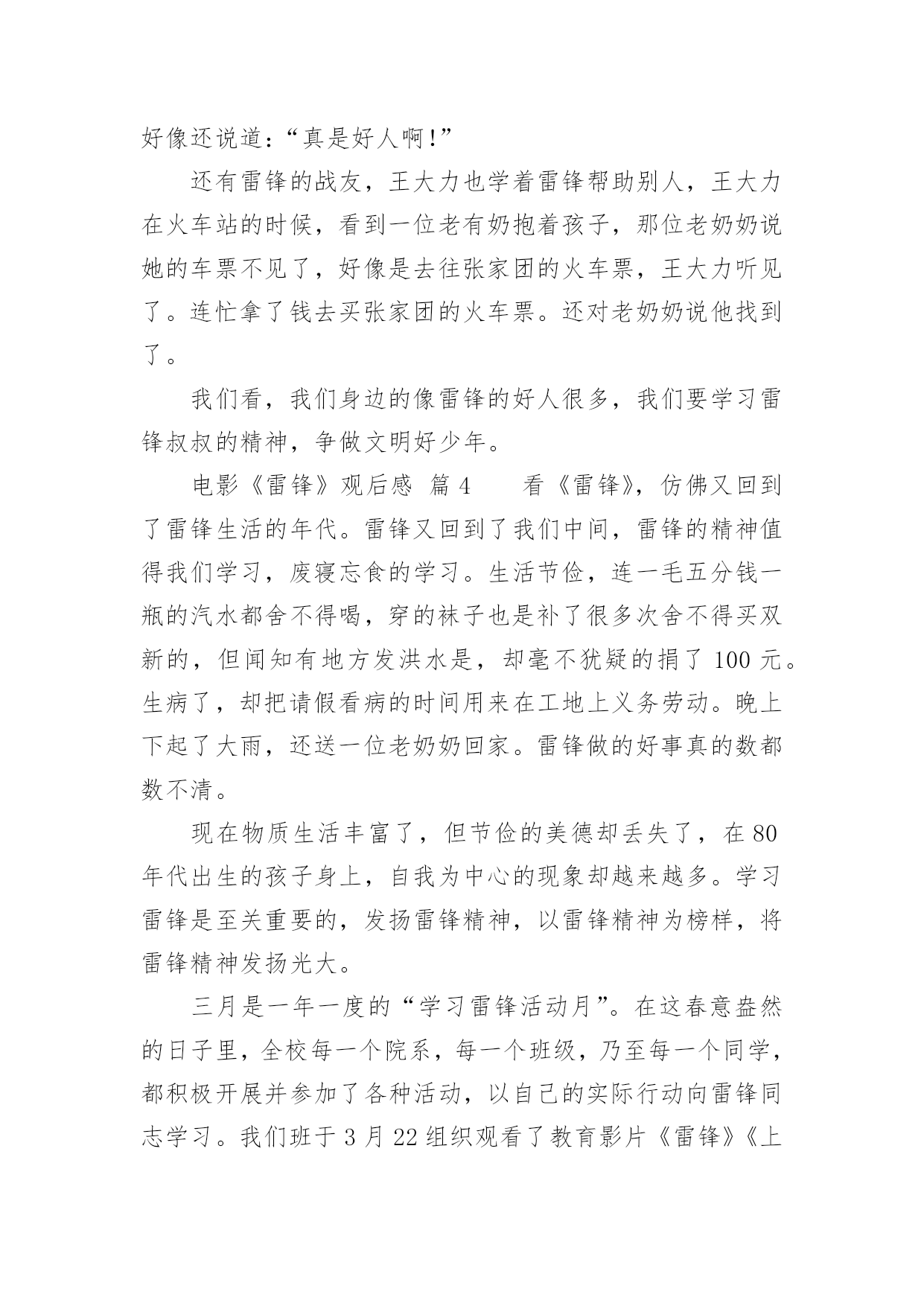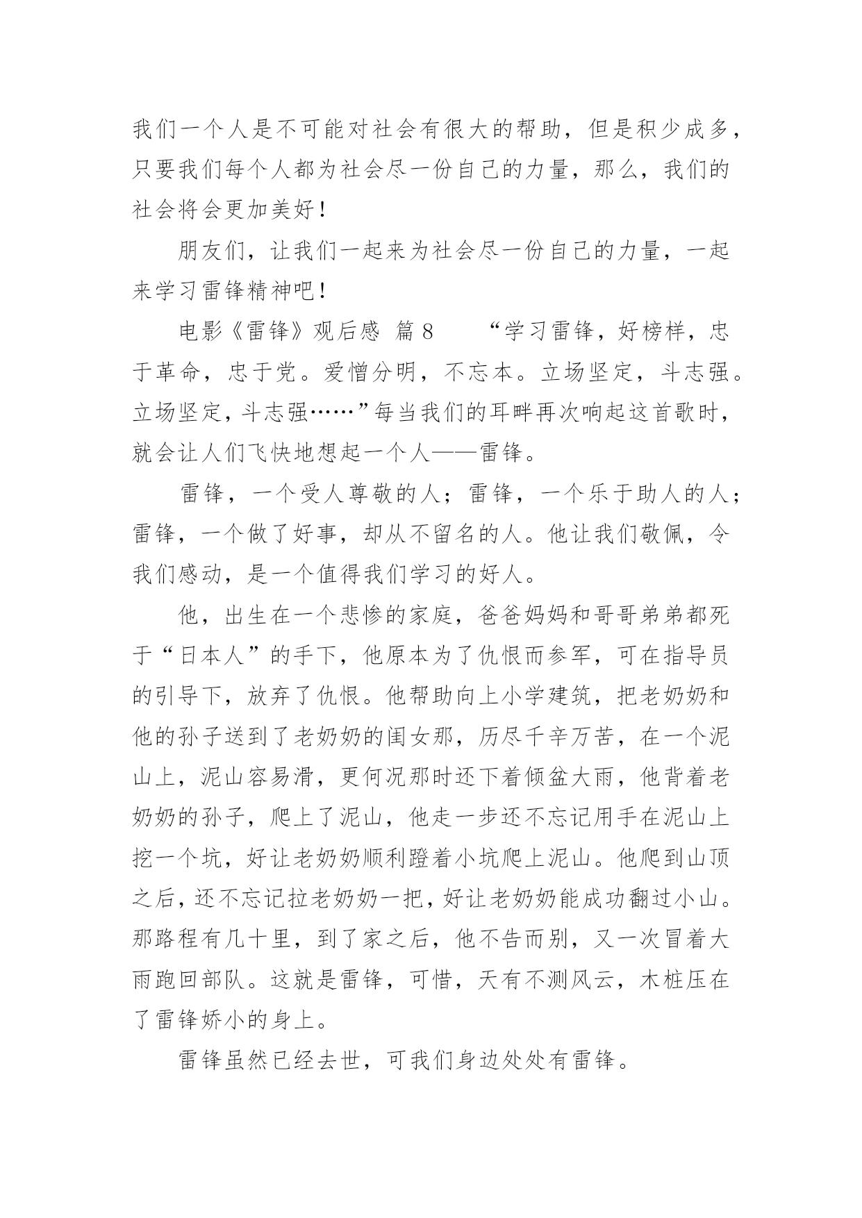 电影《雷锋》观后感电影《雷锋》观后感(精选48篇)当看完一部影视作品后,相信大家的视野一定开拓了不少吧,这时候,最关键的观后感怎么能落下!那么你会写观后感吗?以下是小编收集整理的电影《雷锋》观后感,希望能够帮助到大家。电影《雷锋》观后感篇1班会课上,学校播放了电影《雷锋》,我再一次被雷锋叔叔热情地帮助人民群众,不留姓名的精神所感动。给我印象最深的是影片中的两个情节:一次放假时,雷锋到建筑工地上义务帮工,他向看车的老大爷借了辆车,便忙碌地干了起来。如果用他的话说,这叫为社会发展添一份力。他还和一位义务工人比赛,装材料后,一声令下,两人飞奔向卸货点,最后,雷锋超过了他,第一个卸了货。一位老师还在广播里宣传,使全工地上的人都干劲十足。不到一天,工人们就完成了全部任务。在雷锋回来的路上下起了大雨,一位老奶奶带着孙女去女儿家。雷锋问她们去哪儿,她们说去左家庄。虽然那离得很远,可雷锋还是说:“我也去左家庄,我们顺路。”他帮老奶奶背着孙女,冒着大雨很快到了那里。雷锋擦完汗,连口水也没有喝,就悄悄地回到了部队。看到这里,我想起了读过一篇文章,题目叫《“白胡子”雷锋》,文章写的是小作者赵云帆家楼下的刘爷爷,每天都坚持打扫楼梯的故事。其实,我们身边就有许多的小雷锋:我们班的邹威同学,每天放学回家后,他都会到纪成家帮助他补习功课,天天如此。因此,纪成的成绩有了很大的进步。班上的陈强的右手骨折,金玉同学主动为他整理学习用品,李海亮同学天天为他到食堂打饭。学校的志愿者为学校及社区打扫卫生,义务宣传……看完《雷锋》这部电影后,我明白了一个道理:一个人做点好事并不难,难的是一辈子做好事。雷锋叔叔做到了,他真了不起!我要向他学习,做新时代的小雷锋。电影《雷锋》观后感篇2三月份是学雷锋月,借此机会,刘老师给我们放了一部关于雷锋的电影。电影里,雷锋的行为十分让大家感动。那他是什么行为使我非常感动呢?那就听我娓娓道来吧!就先说雷锋放假的时候吧,他不去别的地方,就去工地为工人们搬砖头,运砖头,为此还隐姓埋名地不告诉别人他自己的名字,结果,那位老大爷还以为是雷锋的同学王大力做的好事呢!当雷锋搬好砖头的时候,天色已晚,当他正匆匆忙忙地走在回宿舍的路上时,突然,他背后响起了一阵清脆的哭声,原来,一位老大娘正抱着一个孩子,撑着一把伞,正在急匆匆地赶路呢!雷锋看见了,急忙迎上去问:“老大娘,你的是要去哪里啊?”老大娘回答:“去扬家屯。”雷锋说:“扬家屯?还有二十多里路呢!要不,我陪您去吧!”老大娘感激地说:“好啊!真是谢谢你啦,解放军同志。”于是,雷锋抱起孩子,老大娘在后面撑着雨伞,朝远处走去。当他们遇到一个长上坡,爬又爬不上去,都是泥巴,雷锋就用手挖一个坑,先让自己爬上去开路,然后让老大娘在后面跟着走。经过千辛万苦,终于到了杨家屯,雷锋放下孩子,给了老大娘,趁她不注意,就悄悄地往朦胧的夜色中走去……看完这部电影,我有很多的感想,作为一名少先队员,我想:雷锋叔叔做了那么多好事,我也应该从身边的小事做起,向雷锋叔叔学习,假如:在公共汽车上,给经爷爷老奶奶让座,在家里为父母做到力所能及的事,在学校和集体为老师和同学做事,为班级争光。我再想想我自己,我不连普通的买菜都有做不到,更何况雷锋小时候还要上山砍柴呢!雷锋叔叔,虽然你离开我们有五十年了,可是你的名字,我们永远铭记在心里!电影《雷锋》观后感篇3雷锋的精神我们要时时刻刻学习,要争做文明好少年。为什么要这样说呢?因为雷锋小的时候也经常帮助别人。我记得在看这部电影的时候,我看见雷锋为了帮助老奶奶,自己却在外边淋雨,背上还背着老奶奶的孙子,雷锋背着她的孙子还要走二十多里路,因为这位老奶奶想去她的儿媳妇家,正巧下了一场大暴雨,所以她才没办法的。雷锋把老奶奶和她的孙子送到了她的儿媳妇家,老奶奶把在路上的事,一字不漏的说了出来,本来老奶奶想叫儿媳烧一碗姜汤给雷锋喝。可是一转眼人就不见了,老奶奶嘴里好像还说道:“真是好人啊!”还有雷锋的战友,王大力也学着雷锋帮助别人,王大力在火车站的时候,看到一位老有奶抱着孩子,那位老奶奶说她的车票不见了,好像是去往张家团的火车票,王大力听见了。连忙拿了钱去买张家团的火车票。还对老奶奶说他找到了。我们看,我们身边的像雷锋的好人很多,我们要学习雷锋叔叔的精神,争做文明好少年。电影《雷锋》观后感篇4看《雷锋》,仿佛又回到了雷锋生活的年代。雷锋又回到了我们中间,雷锋的精神值得我们学习,废寝忘食的学习。生活节俭,连一毛五分钱一瓶的汽水都舍不得喝,穿的袜子也是补了很多次舍不得买双新的,但闻知有地方发洪水是,却毫不犹疑的捐了100元。生病了,却把请假看病的时间用来在工地上义务劳动。晚上下起了大雨,还送一位老奶奶回家。雷锋做的好事真的数都数不清。现在物质生活丰富了,但节俭的美德却丢失了,在80年代出生的孩子身上,自我为
