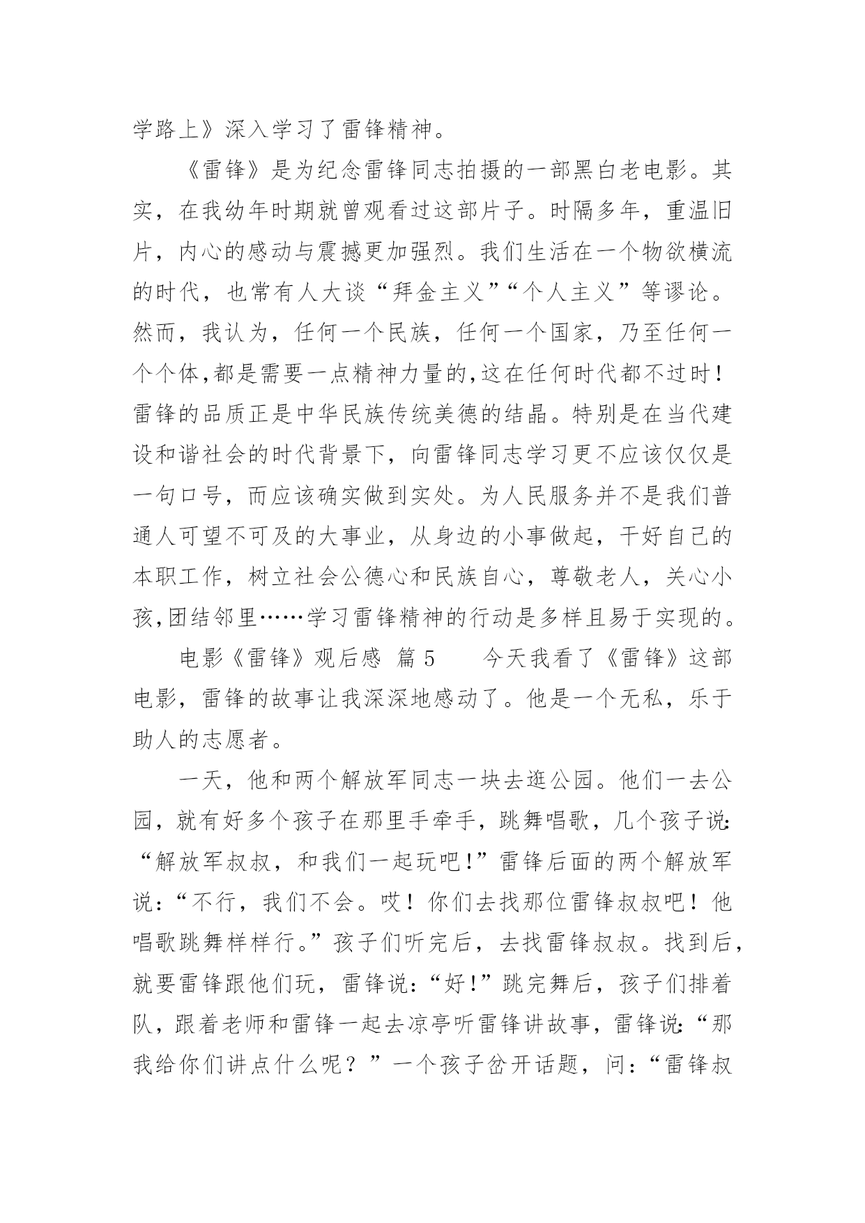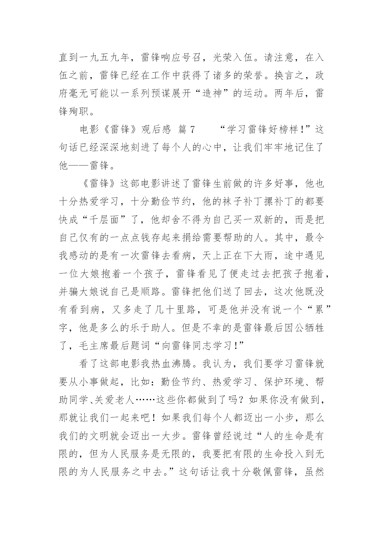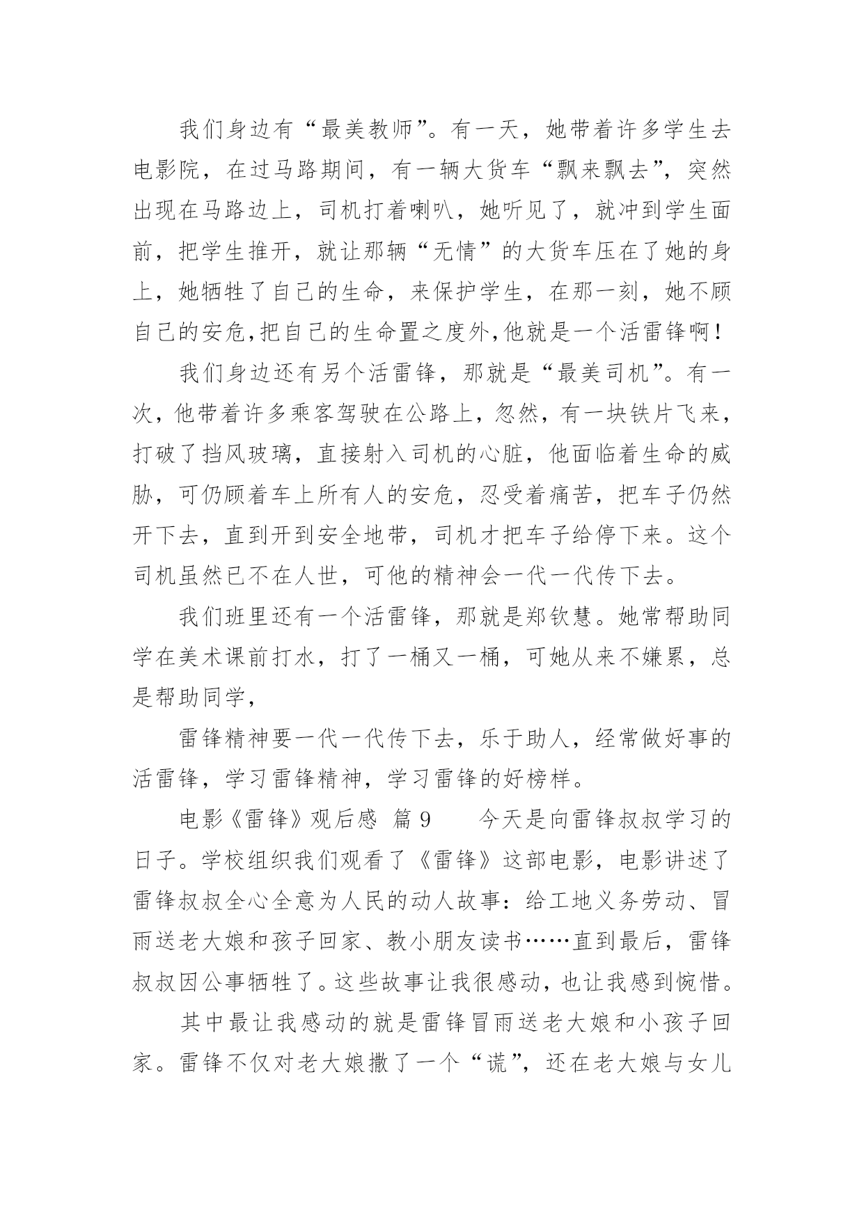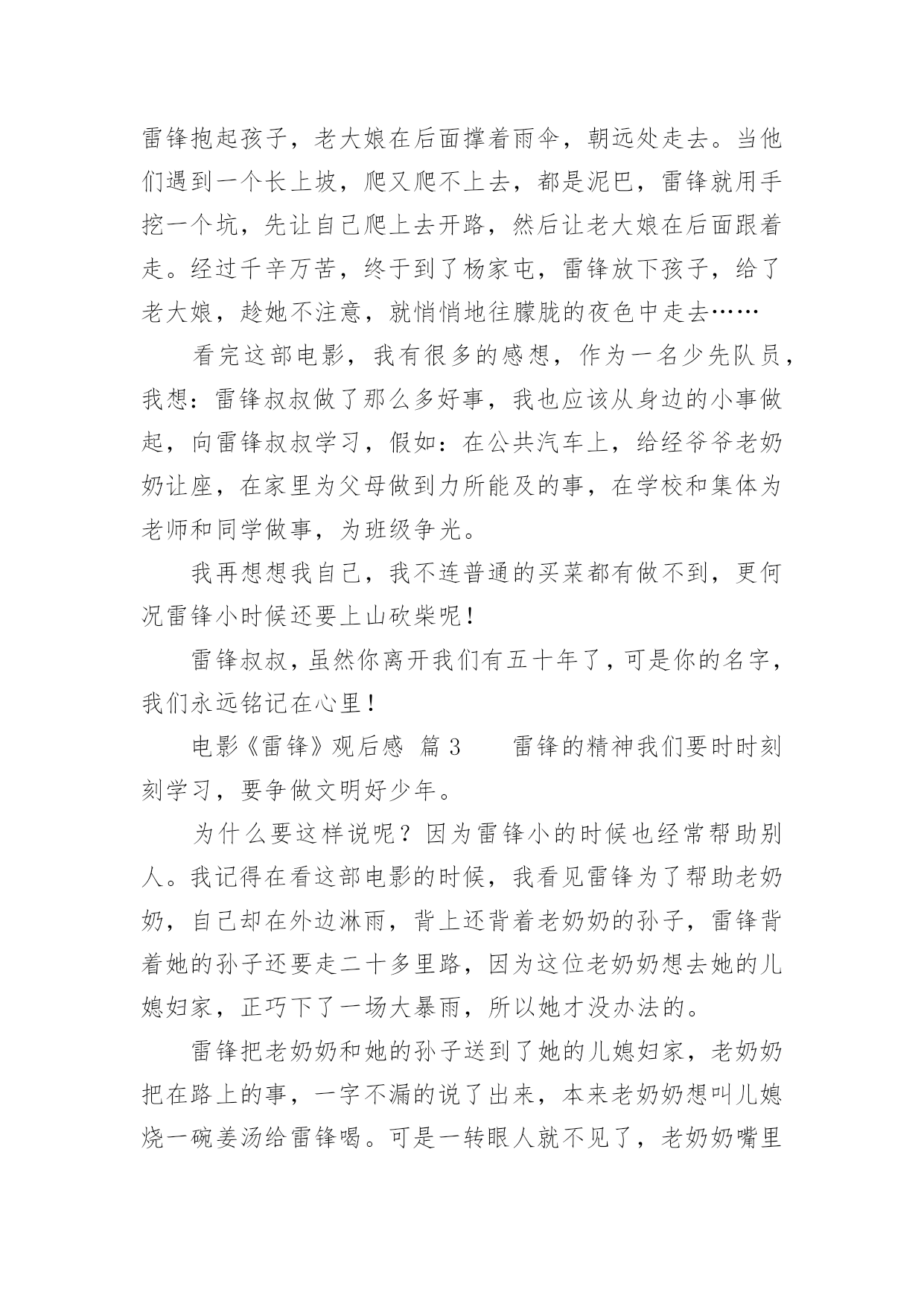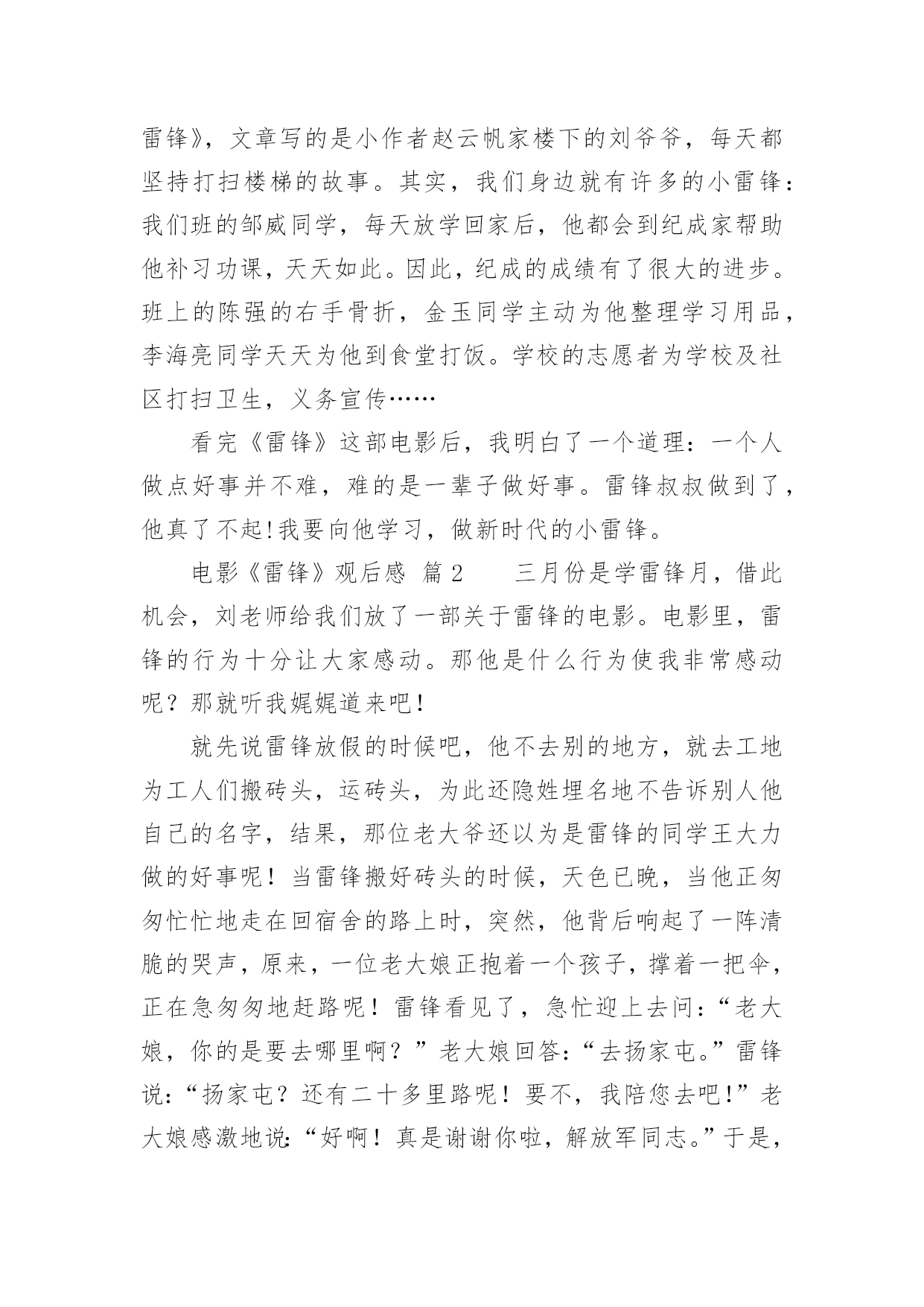 电影《雷锋》观后感电影《雷锋》观后感(精选48篇)当看完一部影视作品后,相信大家的视野一定开拓了不少吧,这时候,最关键的观后感怎么能落下!那么你会写观后感吗?以下是小编收集整理的电影《雷锋》观后感,希望能够帮助到大家。电影《雷锋》观后感篇1班会课上,学校播放了电影《雷锋》,我再一次被雷锋叔叔热情地帮助人民群众,不留姓名的精神所感动。给我印象最深的是影片中的两个情节:一次放假时,雷锋到建筑工地上义务帮工,他向看车的老大爷借了辆车,便忙碌地干了起来。如果用他的话说,这叫为社会发展添一份力。他还和一位义务工人比赛,装材料后,一声令下,两人飞奔向卸货点,最后,雷锋超过了他,第一个卸了货。一位老师还在广播里宣传,使全工地上的人都干劲十足。不到一天,工人们就完成了全部任务。在雷锋回来的路上下起了大雨,一位老奶奶带着孙女去女儿家。雷锋问她们去哪儿,她们说去左家庄。虽然那离得很远,可雷锋还是说:“我也去左家庄,我们顺路。”他帮老奶奶背着孙女,冒着大雨很快到了那里。雷锋擦完汗,连口水也没有喝,就悄悄地回到了部队。看到这里,我想起了读过一篇文章,题目叫《“白胡子”雷锋》,文章写的是小作者赵云帆家楼下的刘爷爷,每天都坚持打扫楼梯的故事。其实,我们身边就有许多的小雷锋:我们班的邹威同学,每天放学回家后,他都会到纪成家帮助他补习功课,天天如此。因此,纪成的成绩有了很大的进步。班上的陈强的右手骨折,金玉同学主动为他整理学习用品,李海亮同学天天为他到食堂打饭。学校的志愿者为学校及社区打扫卫生,义务宣传……看完《雷锋》这部电影后,我明白了一个道理:一个人做点好事并不难,难的是一辈子做好事。雷锋叔叔做到了,他真了不起!我要向他学习,做新时代的小雷锋。电影《雷锋》观后感篇2三月份是学雷锋月,借此机会,刘老师给我们放了一部关于雷锋的电影。电影里,雷锋的行为十分让大家感动。那他是什么行为使我非常感动呢?那就听我娓娓道来吧!就先说雷锋放假的时候吧,他不去别的地方,就去工地为工人们搬砖头,运砖头,为此还隐姓埋名地不告诉别人他自己的名字,结果,那位老大爷还以为是雷锋的同学王大力做的好事呢!当雷锋搬好砖头的时候,天色已晚,当他正匆匆忙忙地走在回宿舍的路上时,突然,他背后响起了一阵清脆的哭声,原来,一位老大娘正抱着一个孩子,撑着一把伞,正在急匆匆地赶路呢!雷锋看见了,急忙迎上去问:“老大娘,你的是要去哪里啊?”老大娘回答:“去扬家屯。”雷锋说:“扬家屯?还有二十多里路呢!要不,我陪您去吧!”老大娘感激地说:“好啊!真是谢谢你啦,解放军同志。”于是,雷锋抱起孩子,老大娘在后面撑着雨伞,朝远处走去。当他们遇到一个长上坡,爬又爬不上去,都是泥巴,雷锋就用手挖一个坑,先让自己爬上去开路,然后让老大娘在后面跟着走。经过千辛万苦,终于到了杨家屯,雷锋放下孩子,给了老大娘,趁她不注意,就悄悄地往朦胧的夜色中走去……看完这部电影,我有很多的感想,作为一名少先队员,我想:雷锋叔叔做了那么多好事,我也应该从身边的小事做起,向雷锋叔叔学习,假如:在公共汽车上,给经爷爷老奶奶让座,在家里为父母做到力所能及的事,在学校和集体为老师和同学做事,为班级争光。我再想想我自己,我不连普通的买菜都有做不到,更何况雷锋小时候还要上山砍柴呢!雷锋叔叔,虽然你离开我们有五十年了,可是你的名字,我们永远铭记在心里!电影《雷锋》观后感篇3雷锋的精神我们要时时刻刻学习,要争做文明好少年。为什么要这样说呢?因为雷锋小的时候也经常帮助别人。我记得在看这部电影的时候,我看见雷锋为了帮助老奶奶,自己却在外边淋雨,背上还背着老奶奶的孙子,雷锋背着她的孙子还要走二十多里路,因为这位老奶奶想去她的儿媳妇家,正巧下了一场大暴雨,所以她才没办法的。雷锋把老奶奶和她的孙子送到了她的儿媳妇家,老奶奶把在路上的事,一字不漏的说了出来,本来老奶奶想叫儿媳烧一碗姜汤给雷锋喝。可是一转眼人就不见了,老奶奶嘴里好像还说道:“真是好人啊!”还有雷锋的战友,王大力也学着雷锋帮助别人,王大力在火车站的时候,看到一位老有奶抱着孩子,那位老奶奶说她的车票不见了,好像是去往张家团的火车票,王大力听见了。连忙拿了钱去买张家团的火车票。还对老奶奶说他找到了。我们看,我们身边的像雷锋的好人很多,我们要学习雷锋叔叔的精神,争做文明好少年。电影《雷锋》观后感篇4看《雷锋》,仿佛又回到了雷锋生活的年代。雷锋又回到了我们中间,雷锋的精神值得我们学习,废寝忘食的学习。生活节俭,连一毛五分钱一瓶的汽水都舍不得喝,穿的袜子也是补了很多次舍不得买双新的,但闻知有地方发洪水是,却毫不犹疑的捐了100元。生病了,却把请假看病的时间用来在工地上义务劳动。晚上下起了大雨,还送一位老奶奶回家。雷锋做的好事真的数都数不清。现在物质生活丰富了,但节俭的美德却丢失了,在80年代出生的孩子身上,自我为