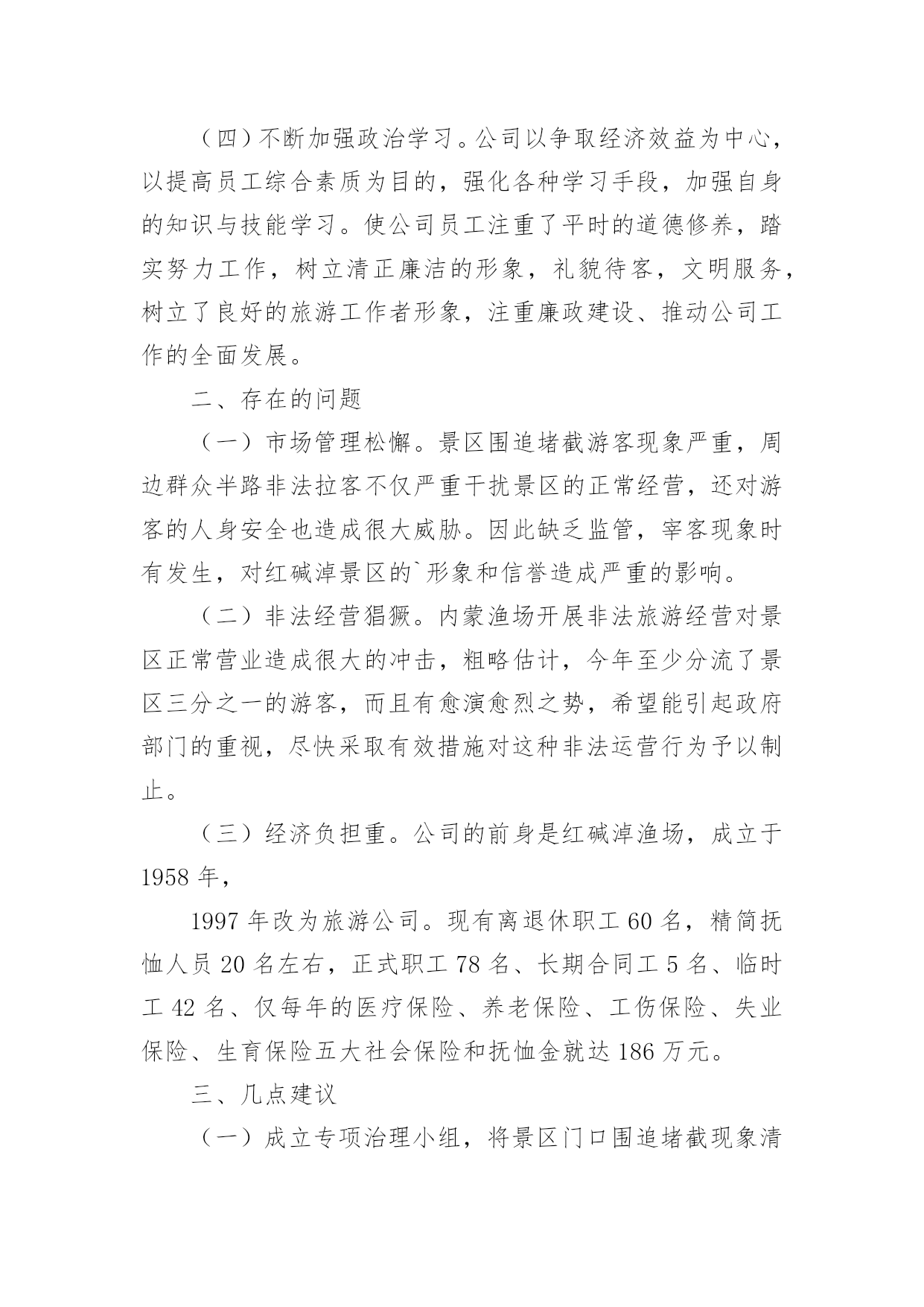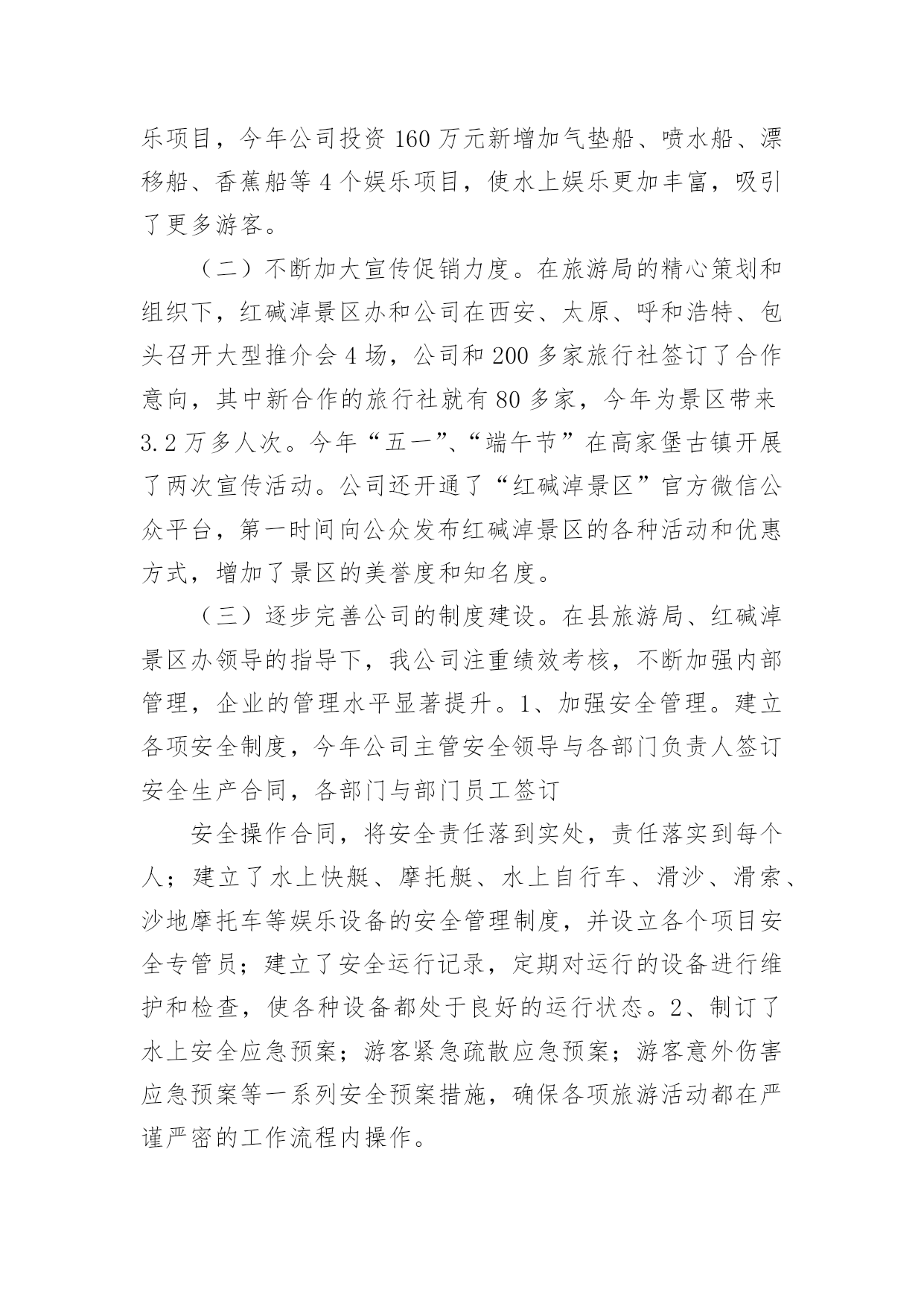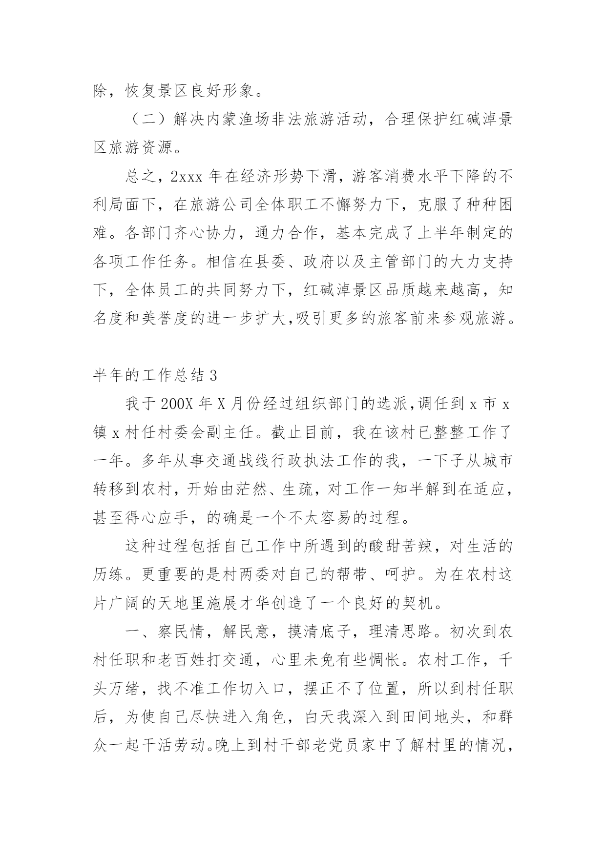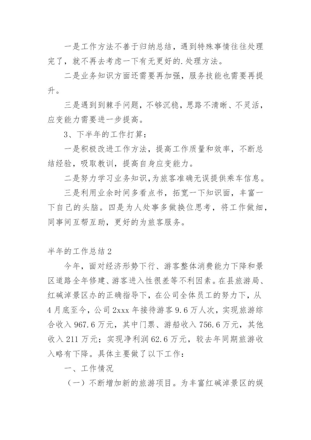 半年的工作总结总结是在某一特定时间段对学习和工作生活或其完成情况,包括取得的成绩、存在的问题及得到的经验和教训加以回顾和分析的书面材料,它可以明确下一步的工作方向,少走弯路,少犯错误,提高工作效益,为此我们要做好回顾,写好总结。但是总结有什么要求呢?以下是小编精心整理的半年的工作总结,仅供参考,欢迎大家阅读。半年的工作总结1转眼间,20xx年已经过了一半,回想上半年的工作,有收获也有不足,归纳总结后分为以下几个方面:1、工作中的收获:一是学习张总报告,从中让我了解本企业的发展前景、及目标,也为医药企业工作总结自己今后工作指明了方向。二是积极参加站上组织的各项技能培训活动,从而对自身是一种修正和提升过程,虽然原来也培训过,但技能是要不断改进,才能满足工作和自身的需求。三是在高速分站体验一天,让我认识到责任团队的重要性,团结协作才能出收益。四是参加本科室组织的各项活动,积极与新老员工沟通,学习老员工处事的沉稳灵活,学习新员工积极向上、敢于尝试的态度,取长补短,提高工作激情。2、工作不足之处:一是工作方法不善于归纳总结,遇到特殊事情往往处理完了,就不再去考虑一下有无更好的.处理方法。二是业务知识方面还需要再加强,服务技能也需要再提升。三是遇到到棘手问题,不够沉稳,思路不清晰、不灵活,应变能力需要进一步提高。3、下半年的工作打算:一是积极改进工作方法,提高工作质量和效率,不断总结经验,吸取教训,提高自身应变能力。二是努力学习业务知识,为旅客准确无误提供乘车信息。三是利用业余时间多看点书,拓宽一下知识面,丰富一下自己的头脑。四是为人处事多做换位思考,将工作做细,同事间互帮互助,更好的为旅客服务。半年的工作总结2今年,面对经济形势下行、游客整体消费能力下降和景区道路全年修建、游客进入性很差等不利因素。在县旅游局、红碱淖景区办的正确指导下,在公司全体员工的努力下,从4月底至今,公司2xxx年接待游客9.6万人次,实现旅游综合收入967.6万元,其中门票、游船收入756.6万元,其他收入211万元;实现净利润62.6万元,较去年同期旅游收入略有下降。具体主要做了以下工作:一、工作情况(一)不断增加新的旅游项目。为丰富红碱淖景区的娱乐项目,今年公司投资160万元新增加气垫船、喷水船、漂移船、香蕉船等4个娱乐项目,使水上娱乐更加丰富,吸引了更多游客。(二)不断加大宣传促销力度。在旅游局的精心策划和组织下,红碱淖景区办和公司在西安、太原、呼和浩特、包头召开大型推介会4场,公司和200多家旅行社签订了合作意向,其中新合作的旅行社就有80多家,今年为景区带来3.2万多人次。今年“五一”、“端午节”在高家堡古镇开展了两次宣传活动。公司还开通了“红碱淖景区”官方微信公众平台,第一时间向公众发布红碱淖景区的各种活动和优惠方式,增加了景区的美誉度和知名度。(三)逐步完善公司的制度建设。在县旅游局、红碱淖景区办领导的指导下,我公司注重绩效考核,不断加强内部管理,企业的管理水平显著提升。1、加强安全管理。建立各项安全制度,今年公司主管安全领导与各部门负责人签订安全生产合同,各部门与部门员工签订安全操作合同,将安全责任落到实处,责任落实到每个人;建立了水上快艇、摩托艇、水上自行车、滑沙、滑索、沙地摩托车等娱乐设备的安全管理制度,并设立各个项目安全专管员;建立了安全运行记录,定期对运行的设备进行维护和检查,使各种设备都处于良好的运行状态。2、制订了水上安全应急预案;游客紧急疏散应急预案;游客意外伤害应急预案等一系列安全预案措施,确保各项旅游活动都在严谨严密的工作流程内操作。(四)不断加强政治学习。公司以争取经济效益为中心,以提高员工综合素质为目的,强化各种学习手段,加强自身的知识与技能学习。使公司员工注重了平时的道德修养,踏实努力工作,树立清正廉洁的形象,礼貌待客,文明服务,树立了良好的旅游工作者形象,注重廉政建设、推动公司工作的全面发展。二、存在的问题(一)市场管理松懈。景区围追堵截游客现象严重,周边群众半路非法拉客不仅严重干扰景区的正常经营,还对游客的人身安全也造成很大威胁。因此缺乏监管,宰客现象时有发生,对红碱淖景区的`形象和信誉造成严重的影响。(二)非法经营猖獗。内蒙渔场开展非法旅游经营对景区正常营业造成很大的冲击,粗略估计,今年至少分流了景区三分之一的游客,而且有愈演愈烈之势,希望能引起政府部门的重视,尽快采取有效措施对这种非法运营行为予以制止。(三)经济负担重。公司的前身是红碱淖渔场,成立于1958年,1997年改为旅游公司。现有离退休职工60名,精简抚恤人员20名左右,正式职工78名、长期合同工5名、临时工42名、仅每年的医疗保险、养老保险、工伤保险、失业保险、生育保险五大社会保险和抚恤金就达186万元。三、几点建议(一)成立专项治理小组,将景区门口