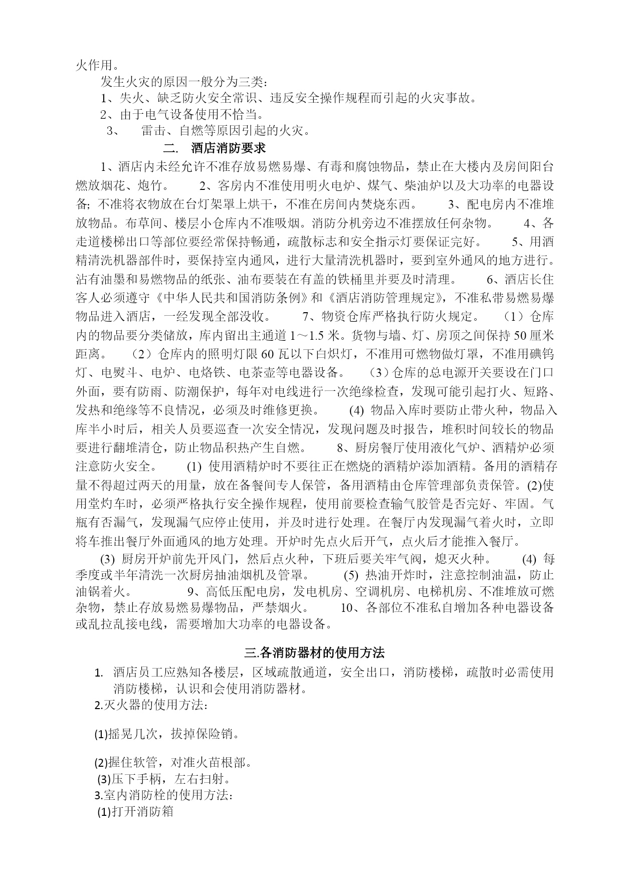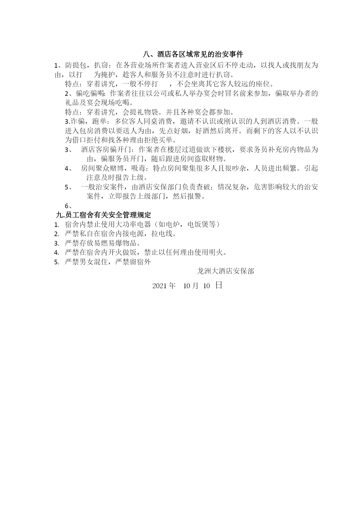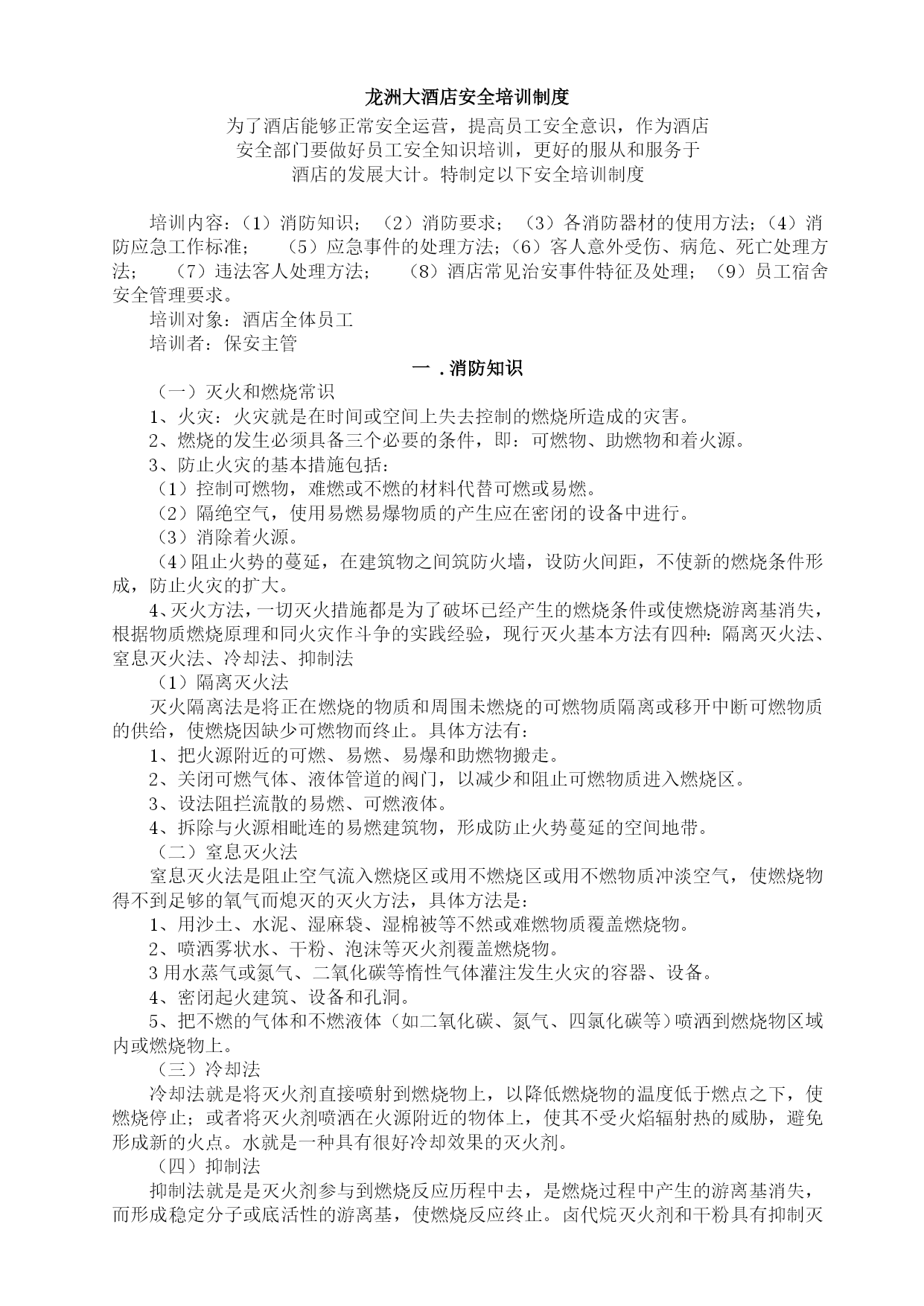 酒店安全培训制度优质资料(可以直接使用,可编辑优质资料,欢迎下载)龙洲大酒店安全培训制度为了酒店能够正常安全运营,提高员工安全意识,作为酒店安全部门要做好员工安全知识培训,更好的服从和服务于酒店的发展大计。特制定以下安全培训制度培训内容:(1)消防知识;(2)消防要求;(3)各消防器材的使用方法;(4)消防应急工作标准;(5)应急事件的处理方法;(6)客人意外受伤、病危、死亡处理方法;(7)违法客人处理方法;(8)酒店常见治安事件特征及处理;(9)员工宿舍安全管理要求。培训对象:酒店全体员工培训者:保安主管一.消防知识(一)灭火和燃烧常识1、火灾:火灾就是在时间或空间上失去控制的燃烧所造成的灾害。2、燃烧的发生必须具备三个必要的条件,即:可燃物、助燃物和着火源。3、防止火灾的基本措施包括:(1)控制可燃物,难燃或不燃的材料代替可燃或易燃。(2)隔绝空气,使用易燃易爆物质的产生应在密闭的设备中进行。(3)消除着火源。(4)阻止火势的蔓延,在建筑物之间筑防火墙,设防火间距,不使新的燃烧条件形成,防止火灾的扩大。4、灭火方法,一切灭火措施都是为了破坏已经产生的燃烧条件或使燃烧游离基消失,根据物质燃烧原理和同火灾作斗争的实践经验,现行灭火基本方法有四种:隔离灭火法、窒息灭火法、冷却法、抑制法(1)隔离灭火法灭火隔离法是将正在燃烧的物质和周围未燃烧的可燃物质隔离或移开中断可燃物质的供给,使燃烧因缺少可燃物而终止。具体方法有:1、把火源附近的可燃、易燃、易爆和助燃物搬走。2、关闭可燃气体、液体管道的阀门,以减少和阻止可燃物质进入燃烧区。3、设法阻拦流散的易燃、可燃液体。4、拆除与火源相毗连的易燃建筑物,形成防止火势蔓延的空间地带。(二)窒息灭火法窒息灭火法是阻止空气流入燃烧区或用不燃烧区或用不燃物质冲淡空气,使燃烧物得不到足够的氧气而熄灭的灭火方法,具体方法是:1、用沙土、水泥、湿麻袋、湿棉被等不然或难燃物质覆盖燃烧物。2、喷洒雾状水、干粉、泡沫等灭火剂覆盖燃烧物。3用水蒸气或氮气、二氧化碳等惰性气体灌注发生火灾的容器、设备。4、密闭起火建筑、设备和孔洞。5、把不燃的气体和不燃液体(如二氧化碳、氮气、四氯化碳等)喷洒到燃烧物区域内或燃烧物上。(三)冷却法冷却法就是将灭火剂直接喷射到燃烧物上,以降低燃烧物的温度低于燃点之下,使燃烧停止;或者将灭火剂喷洒在火源附近的物体上,使其不受火焰辐射热的威胁,避免形成新的火点。水就是一种具有很好冷却效果的灭火剂。(四)抑制法抑制法就是是灭火剂参与到燃烧反应历程中去,是燃烧过程中产生的游离基消失,而形成稳定分子或底活性的游离基,使燃烧反应终止。卤代烷灭火剂和干粉具有抑制灭火作用。发生火灾的原因一般分为三类:1、失火、缺乏防火安全常识、违反安全操作规程而引起的火灾事故。2、由于电气设备使用不恰当。雷击、自燃等原因引起的火灾。二.酒店消防要求1、酒店内未经允许不准存放易燃易爆、有毒和腐蚀物品,禁止在大楼内及房间阳台燃放烟花、炮竹。2、客房内不准使用明火电炉、煤气、柴油炉以及大功率的电器设备;不准将衣物放在台灯架罩上烘干,不准在房间内焚烧东西。3、配电房内不准堆放物品。布草间、楼层小仓库内不准吸烟。消防分机旁边不准摆放任何杂物。4、各走道楼梯出口等部位要经常保持畅通,疏散标志和安全指示灯要保证完好。5、用酒精清洗机器部件时,要保持室内通风,进行大量清洗机器时,要到室外通风的地方进行。沾有油墨和易燃物品的纸张、油布要装在有盖的铁桶里并要及时清理。6、酒店长住客人必须遵守《中华人民共和国消防条例》和《酒店消防管理规定》,不准私带易燃易爆物品进入酒店,一经发现全部没收。7、物资仓库严格执行防火规定。(1)仓库内的物品要分类储放,库内留出主通道1~1.5米。货物与墙、灯、房顶之间保持50厘米距离。(2)仓库内的照明灯限60瓦以下白炽灯,不准用可燃物做灯罩,不准用碘钨灯、电熨斗、电炉、电烙铁、电茶壶等电器设备。(3)仓库的总电源开关要设在门口外面,要有防雨、防潮保护,每年对电线进行一次绝缘检查,发现可能引起打火、短路、发热和绝缘等不良情况,必须及时维修更换。(4)物品入库时要防止带火种,物品入库半小时后,相关人员要巡查一次安全情况,发现问题及时报告,堆积时间较长的物品要进行翻堆清仓,防止物品积热产生自燃。8、厨房餐厅使用液化气炉、酒精炉必须注意防火安全。(1)使用酒精炉时不要往正在燃烧的酒精炉添加酒精。备用的酒精存量不得超过两天的用量,放在备餐间专人保管,备用酒精由仓库管理部负责保管。(2)使用堂灼车时,必须严格执行安全操作规程,使用前要检查输气胶管是否完好、牢固。气瓶有否漏气,发现漏气应停止使用,并及时进行处理。在餐厅内发现漏气着火时,