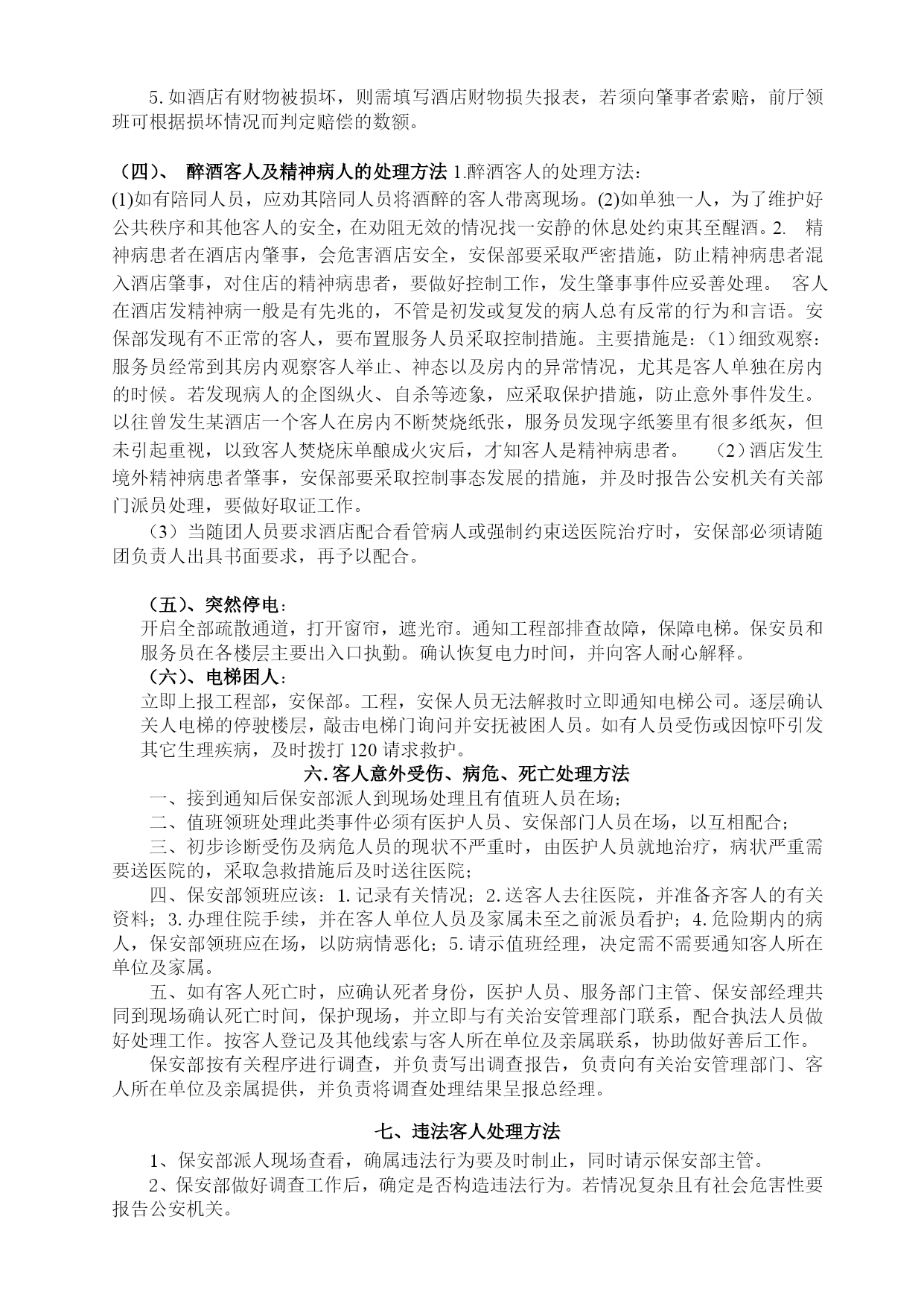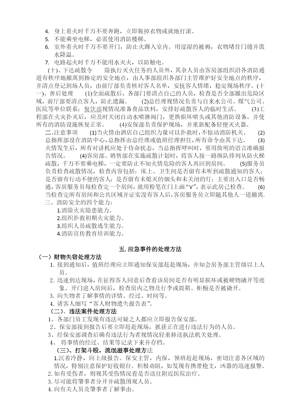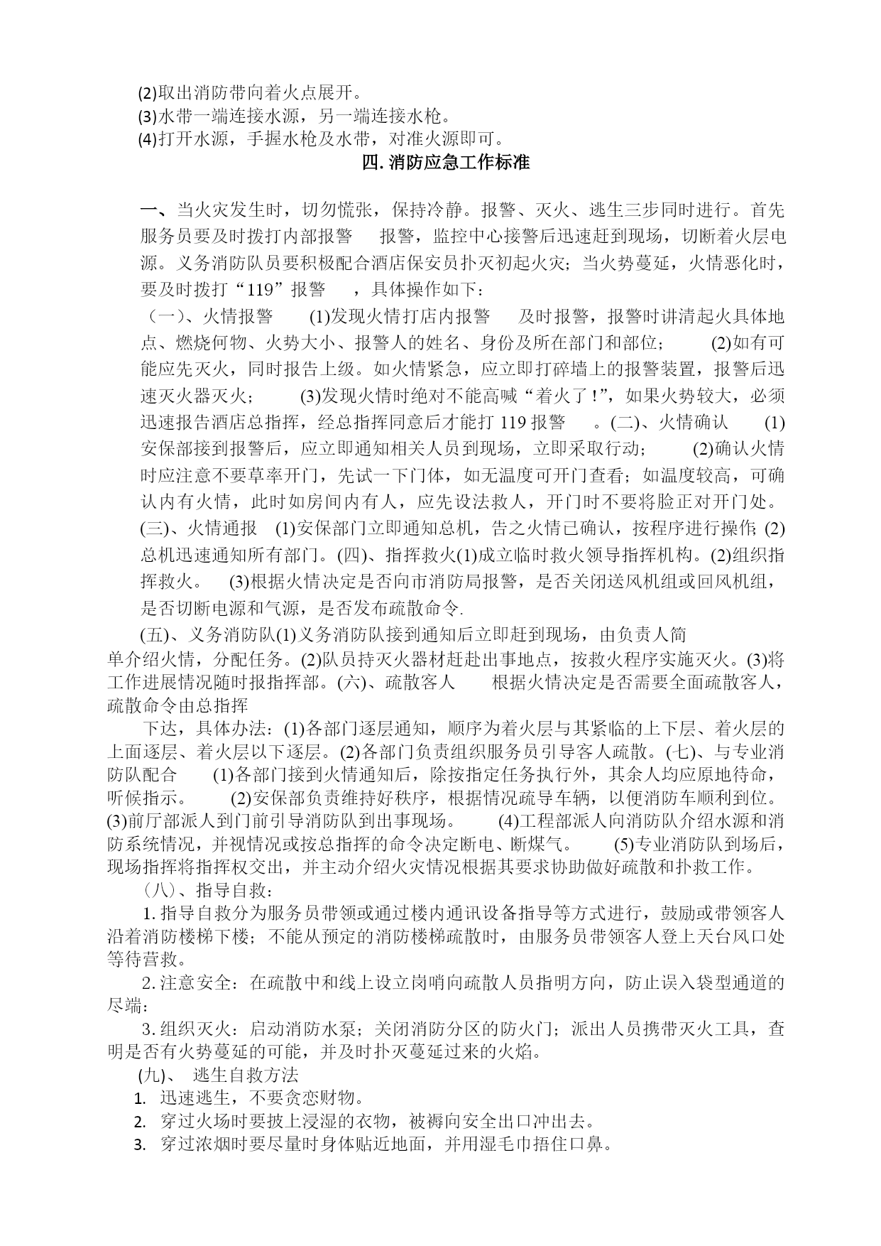 酒店安全培训制度优质资料(可以直接使用,可编辑优质资料,欢迎下载)龙洲大酒店安全培训制度为了酒店能够正常安全运营,提高员工安全意识,作为酒店安全部门要做好员工安全知识培训,更好的服从和服务于酒店的发展大计。特制定以下安全培训制度培训内容:(1)消防知识;(2)消防要求;(3)各消防器材的使用方法;(4)消防应急工作标准;(5)应急事件的处理方法;(6)客人意外受伤、病危、死亡处理方法;(7)违法客人处理方法;(8)酒店常见治安事件特征及处理;(9)员工宿舍安全管理要求。培训对象:酒店全体员工培训者:保安主管一.消防知识(一)灭火和燃烧常识1、火灾:火灾就是在时间或空间上失去控制的燃烧所造成的灾害。2、燃烧的发生必须具备三个必要的条件,即:可燃物、助燃物和着火源。3、防止火灾的基本措施包括:(1)控制可燃物,难燃或不燃的材料代替可燃或易燃。(2)隔绝空气,使用易燃易爆物质的产生应在密闭的设备中进行。(3)消除着火源。(4)阻止火势的蔓延,在建筑物之间筑防火墙,设防火间距,不使新的燃烧条件形成,防止火灾的扩大。4、灭火方法,一切灭火措施都是为了破坏已经产生的燃烧条件或使燃烧游离基消失,根据物质燃烧原理和同火灾作斗争的实践经验,现行灭火基本方法有四种:隔离灭火法、窒息灭火法、冷却法、抑制法(1)隔离灭火法灭火隔离法是将正在燃烧的物质和周围未燃烧的可燃物质隔离或移开中断可燃物质的供给,使燃烧因缺少可燃物而终止。具体方法有:1、把火源附近的可燃、易燃、易爆和助燃物搬走。2、关闭可燃气体、液体管道的阀门,以减少和阻止可燃物质进入燃烧区。3、设法阻拦流散的易燃、可燃液体。4、拆除与火源相毗连的易燃建筑物,形成防止火势蔓延的空间地带。(二)窒息灭火法窒息灭火法是阻止空气流入燃烧区或用不燃烧区或用不燃物质冲淡空气,使燃烧物得不到足够的氧气而熄灭的灭火方法,具体方法是:1、用沙土、水泥、湿麻袋、湿棉被等不然或难燃物质覆盖燃烧物。2、喷洒雾状水、干粉、泡沫等灭火剂覆盖燃烧物。3用水蒸气或氮气、二氧化碳等惰性气体灌注发生火灾的容器、设备。4、密闭起火建筑、设备和孔洞。5、把不燃的气体和不燃液体(如二氧化碳、氮气、四氯化碳等)喷洒到燃烧物区域内或燃烧物上。(三)冷却法冷却法就是将灭火剂直接喷射到燃烧物上,以降低燃烧物的温度低于燃点之下,使燃烧停止;或者将灭火剂喷洒在火源附近的物体上,使其不受火焰辐射热的威胁,避免形成新的火点。水就是一种具有很好冷却效果的灭火剂。(四)抑制法抑制法就是是灭火剂参与到燃烧反应历程中去,是燃烧过程中产生的游离基消失,而形成稳定分子或底活性的游离基,使燃烧反应终止。卤代烷灭火剂和干粉具有抑制灭火作用。发生火灾的原因一般分为三类:1、失火、缺乏防火安全常识、违反安全操作规程而引起的火灾事故。2、由于电气设备使用不恰当。雷击、自燃等原因引起的火灾。二.酒店消防要求1、酒店内未经允许不准存放易燃易爆、有毒和腐蚀物品,禁止在大楼内及房间阳台燃放烟花、炮竹。2、客房内不准使用明火电炉、煤气、柴油炉以及大功率的电器设备;不准将衣物放在台灯架罩上烘干,不准在房间内焚烧东西。3、配电房内不准堆放物品。布草间、楼层小仓库内不准吸烟。消防分机旁边不准摆放任何杂物。4、各走道楼梯出口等部位要经常保持畅通,疏散标志和安全指示灯要保证完好。5、用酒精清洗机器部件时,要保持室内通风,进行大量清洗机器时,要到室外通风的地方进行。沾有油墨和易燃物品的纸张、油布要装在有盖的铁桶里并要及时清理。6、酒店长住客人必须遵守《中华人民共和国消防条例》和《酒店消防管理规定》,不准私带易燃易爆物品进入酒店,一经发现全部没收。7、物资仓库严格执行防火规定。(1)仓库内的物品要分类储放,库内留出主通道1~1.5米。货物与墙、灯、房顶之间保持50厘米距离。(2)仓库内的照明灯限60瓦以下白炽灯,不准用可燃物做灯罩,不准用碘钨灯、电熨斗、电炉、电烙铁、电茶壶等电器设备。(3)仓库的总电源开关要设在门口外面,要有防雨、防潮保护,每年对电线进行一次绝缘检查,发现可能引起打火、短路、发热和绝缘等不良情况,必须及时维修更换。(4)物品入库时要防止带火种,物品入库半小时后,相关人员要巡查一次安全情况,发现问题及时报告,堆积时间较长的物品要进行翻堆清仓,防止物品积热产生自燃。8、厨房餐厅使用液化气炉、酒精炉必须注意防火安全。(1)使用酒精炉时不要往正在燃烧的酒精炉添加酒精。备用的酒精存量不得超过两天的用量,放在备餐间专人保管,备用酒精由仓库管理部负责保管。(2)使用堂灼车时,必须严格执行安全操作规程,使用前要检查输气胶管是否完好、牢固。气瓶有否漏气,发现漏气应停止使用,并及时进行处理。在餐厅内发现漏气着火时,