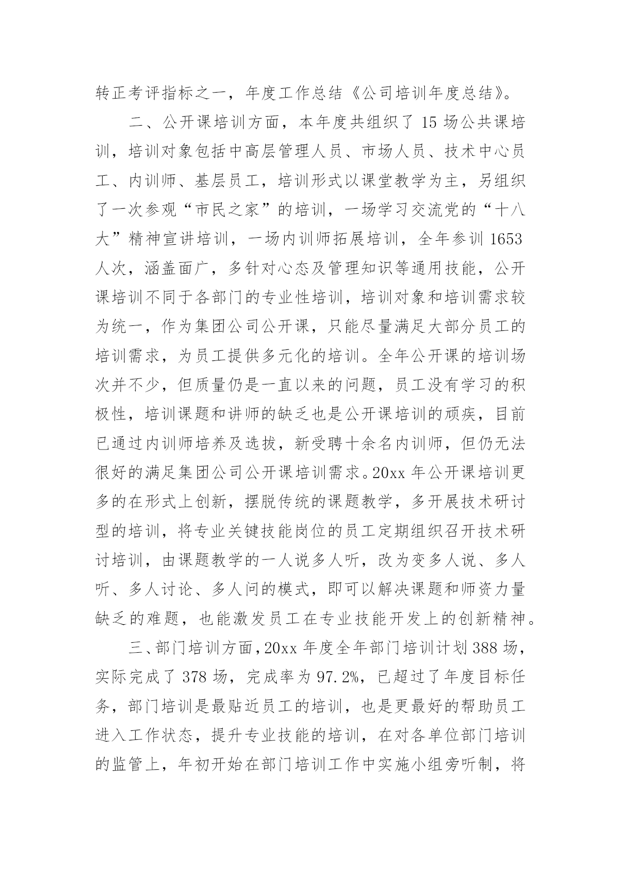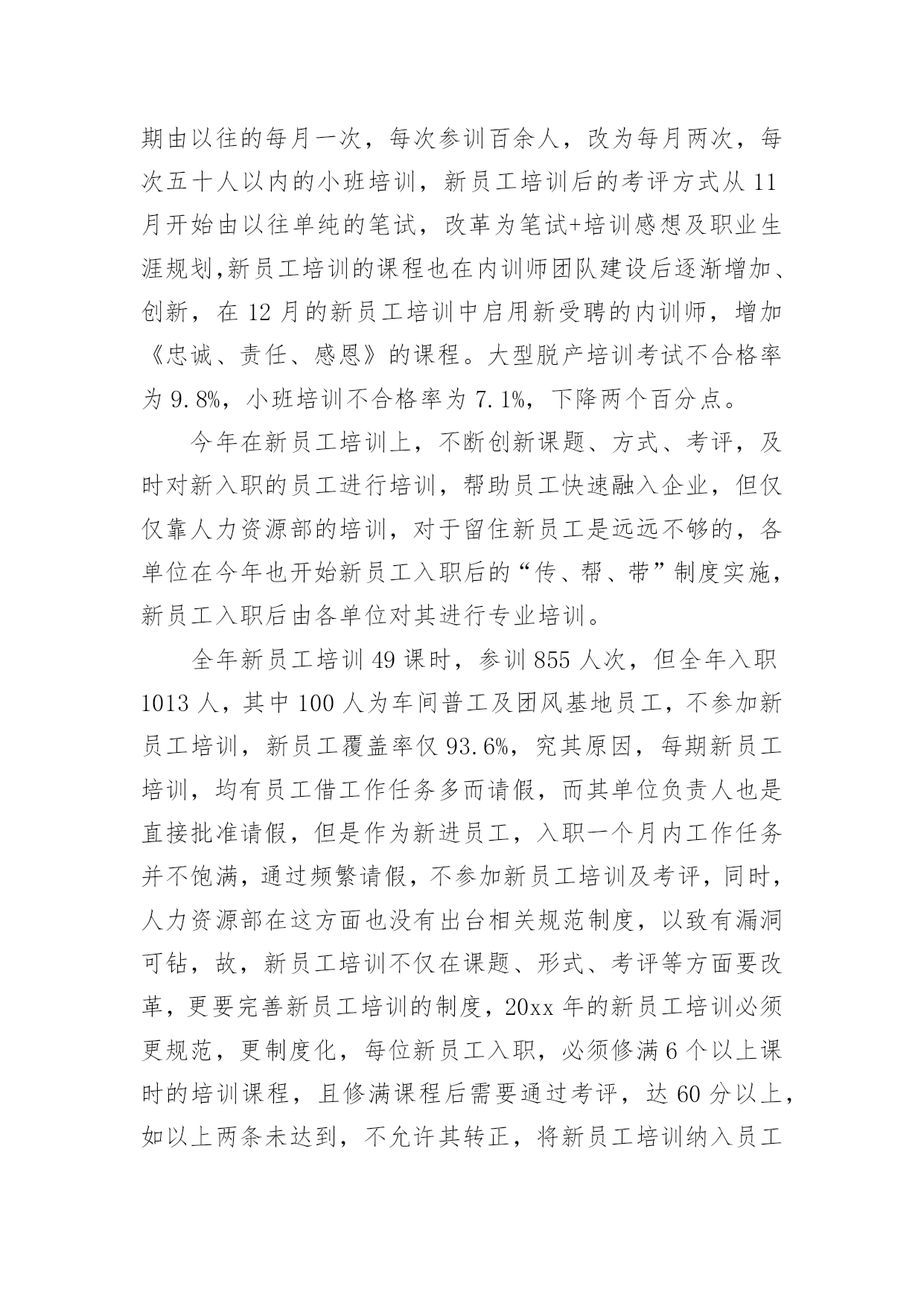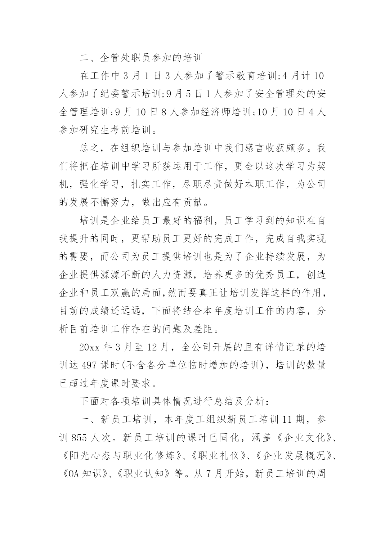 公司培训总结公司培训总结模板合集10篇总结是指对某一阶段的工作、学习或思想中的经验或情况加以总结和概括的书面材料,它在我们的学习、工作中起到呈上启下的作用,让我们一起来学习写总结吧。你想知道总结怎么写吗?以下是小编帮大家整理的公司培训总结10篇,希望对大家有所帮助。公司培训总结篇1回顾20xx年企管处培训工作,我们持之以恒贯彻落实建设学习型公司、培育学习型员工的精神,企管处共组织了2次大型培训活动,组织了20余次各处(室)6S代表培训,并取得了圆满的成效,为集团公司管控模式的强力推进做好基础,推动集团公司健康发展作出了积极贡献,公司培训年度总结。一年来做了以下培训工作总一、企管处组织的培训在4月XX日组织了绩效专管员与6S专管员培训,共计200人参加了此次培训。在6月27日组织了自救互救培训,共计有200余人参加了此次培训。每月进行1-2次的6S专管员、6S代表培训共计20余次,共计培训160人次。二、企管处职员参加的培训在工作中3月1日3人参加了警示教育培训;4月计10人参加了纪委警示培训;9月5日1人参加了安全管理处的安全管理培训;9月10日8人参加经济师培训;10月10日4人参加研究生考前培训。总之,在组织培训与参加培训中我们感言收获颇多。我们将把在培训中学习所获运用于工作,更会以这次学习为契机,强化学习,扎实工作,尽职尽责做好本职工作,为公司的发展不懈努力,做出应有贡献。培训是企业给员工最好的福利,员工学习到的知识在自我提升的同时,更帮助员工更好的完成工作,完成自我实现的需要,而公司为员工提供培训也是为了企业持续发展,为企业提供源源不断的人力资源,培养更多的优秀员工,创造企业和员工双赢的局面,然而要真正让培训发挥这样的作用,目前的成绩还远远,下面将结合本年度培训工作的内容,分析目前培训工作存在的问题及差距。20xx年3月至12月,全公司开展的且有详情记录的培训达497课时(不含各分单位临时增加的培训),培训的数量已超过年度课时要求。下面对各项培训具体情况进行总结及分析:一、新员工培训,本年度工组织新员工培训11期,参训855人次。新员工培训的课时已固化,涵盖《企业文化》、《阳光心态与职业化修炼》、《职业礼仪》、《企业发展概况》、《OA知识》、《职业认知》等。从7月开始,新员工培训的周期由以往的每月一次,每次参训百余人,改为每月两次,每次五十人以内的小班培训,新员工培训后的考评方式从11月开始由以往单纯的笔试,改革为笔试+培训感想及职业生涯规划,新员工培训的课程也在内训师团队建设后逐渐增加、创新,在12月的新员工培训中启用新受聘的内训师,增加《忠诚、责任、感恩》的课程。大型脱产培训考试不合格率为9.8%,小班培训不合格率为7.1%,下降两个百分点。今年在新员工培训上,不断创新课题、方式、考评,及时对新入职的员工进行培训,帮助员工快速融入企业,但仅仅靠人力资源部的培训,对于留住新员工是远远不够的,各单位在今年也开始新员工入职后的“传、帮、带”制度实施,新员工入职后由各单位对其进行专业培训。全年新员工培训49课时,参训855人次,但全年入职1013人,其中100人为车间普工及团风基地员工,不参加新员工培训,新员工覆盖率仅93.6%,究其原因,每期新员工培训,均有员工借工作任务多而请假,而其单位负责人也是直接批准请假,但是作为新进员工,入职一个月内工作任务并不饱满,通过频繁请假,不参加新员工培训及考评,同时,人力资源部在这方面也没有出台相关规范制度,以致有漏洞可钻,故,新员工培训不仅在课题、形式、考评等方面要改革,更要完善新员工培训的制度,20xx年的新员工培训必须更规范,更制度化,每位新员工入职,必须修满6个以上课时的培训课程,且修满课程后需要通过考评,达60分以上,如以上两条未达到,不允许其转正,将新员工培训纳入员工转正考评指标之一,年度工作总结《公司培训年度总结》。二、公开课培训方面,本年度共组织了15场公共课培训,培训对象包括中高层管理人员、市场人员、技术中心员工、内训师、基层员工,培训形式以课堂教学为主,另组织了一次参观“市民之家”的培训,一场学习交流党的“十八大”精神宣讲培训,一场内训师拓展培训,全年参训1653人次,涵盖面广,多针对心态及管理知识等通用技能,公开课培训不同于各部门的专业性培训,培训对象和培训需求较为统一,作为集团公司公开课,只能尽量满足大部分员工的培训需求,为员工提供多元化的培训。全年公开课的培训场次并不少,但质量仍是一直以来的问题,员工没有学习的积极性,培训课题和讲师的缺乏也是公开课培训的顽疾,目前已通过内训师培养及选拔,新受聘十余名内训师,但仍无法很好的满足集团公司公开课培训需求。20xx年公开课培训更多的在形式上创新,摆脱传统的课题教学,多开展技术研讨型的培训,将专业关键技能岗位的员工定