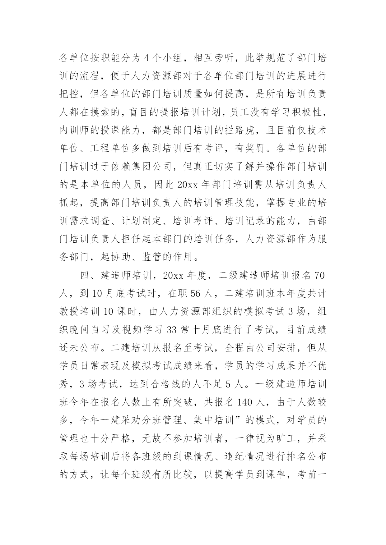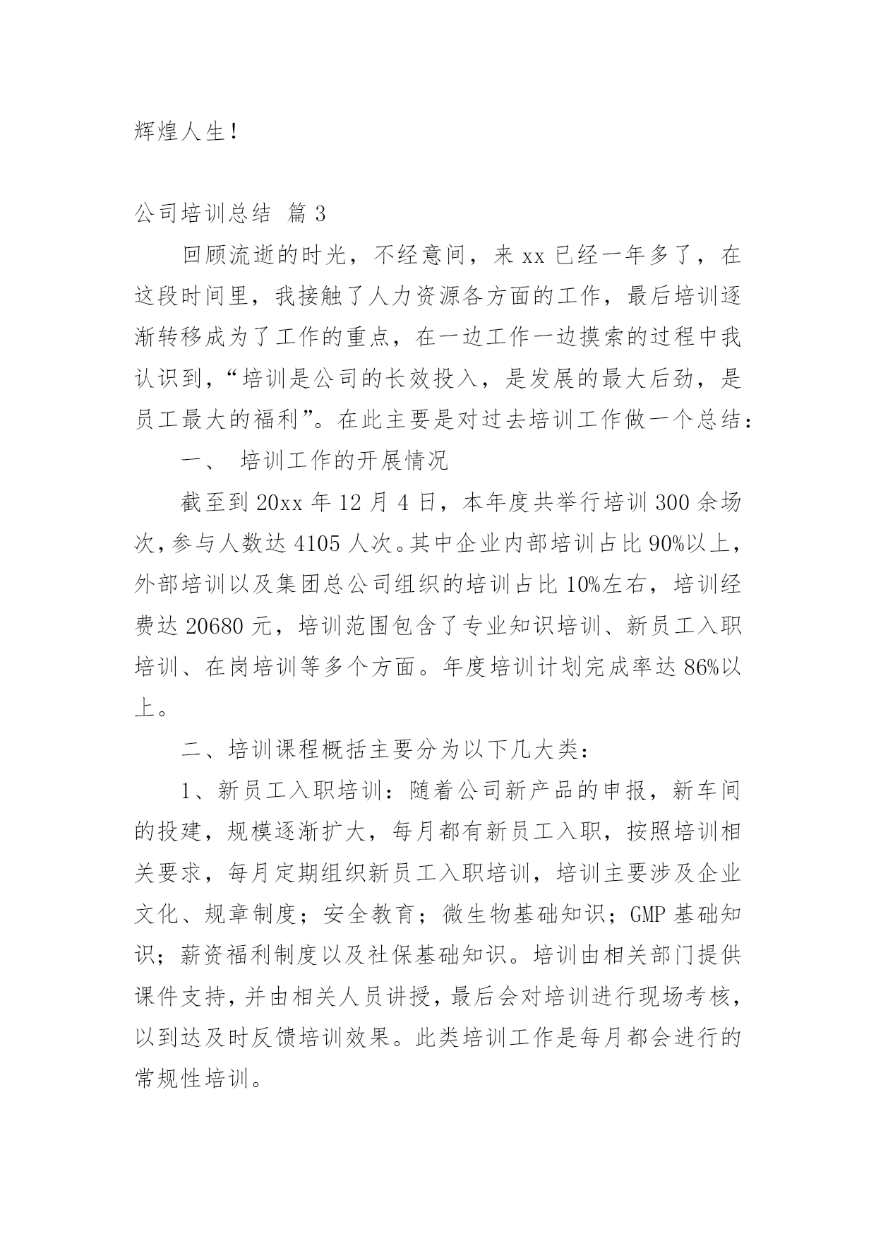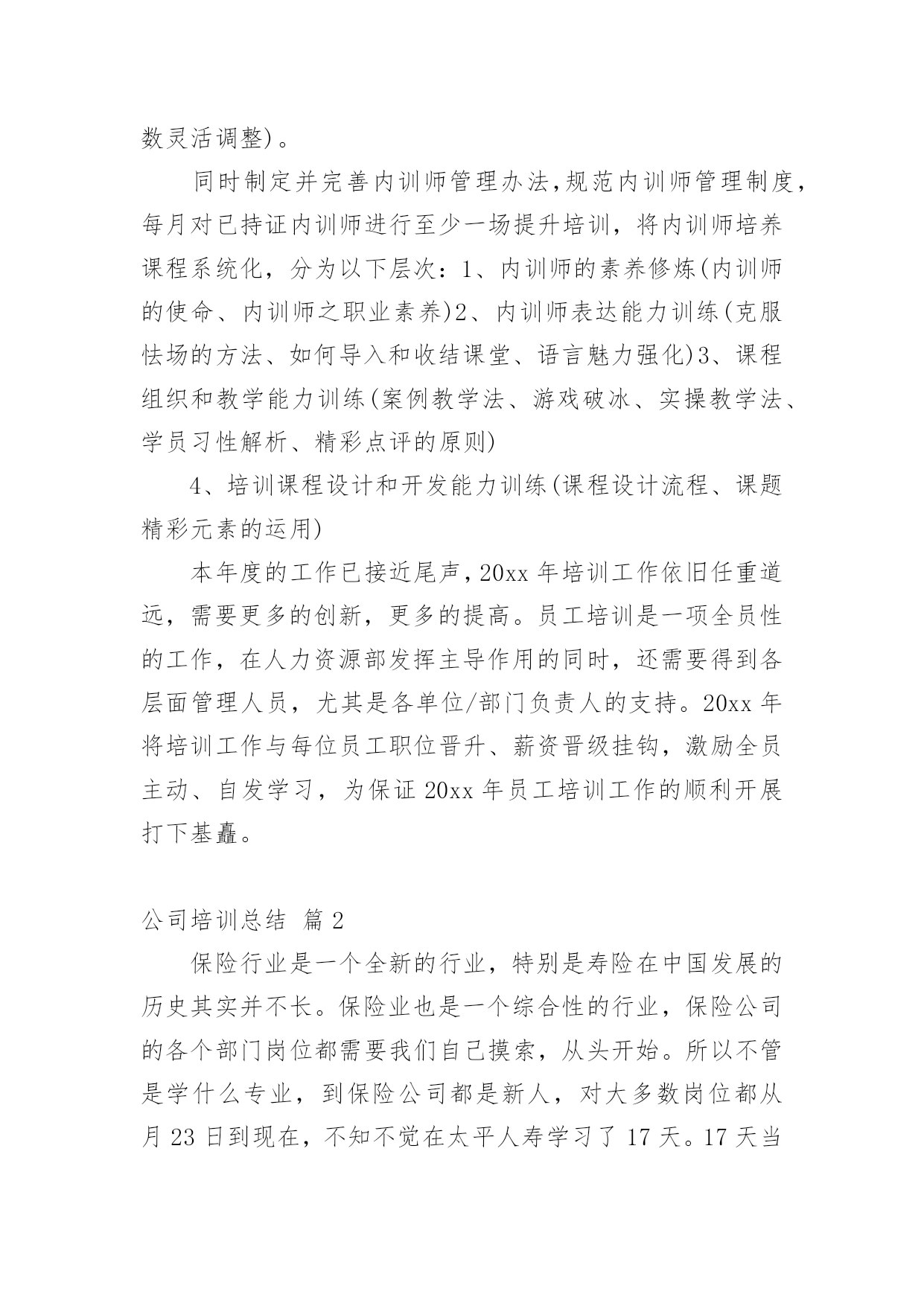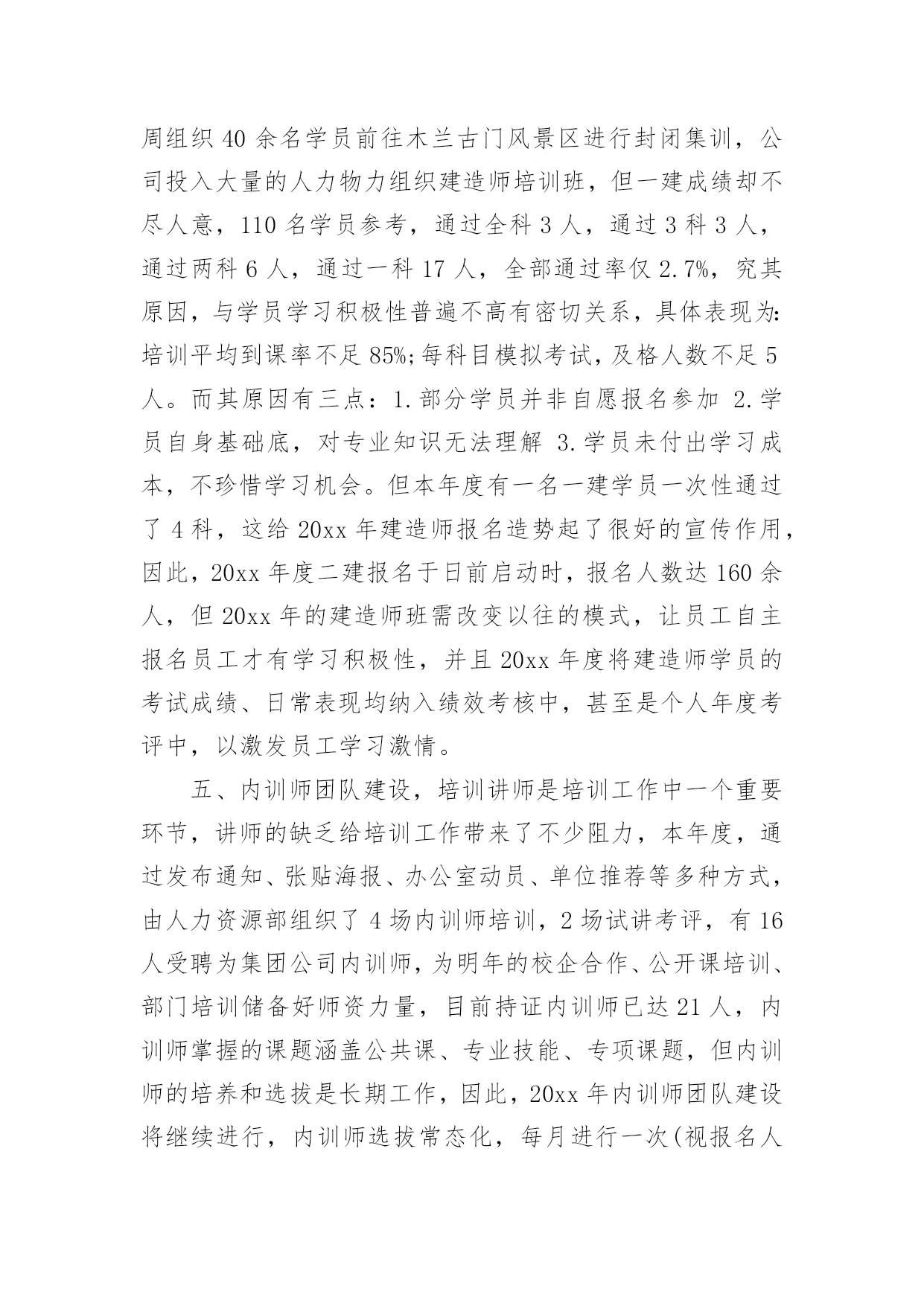 公司培训总结公司培训总结模板合集10篇总结是指对某一阶段的工作、学习或思想中的经验或情况加以总结和概括的书面材料,它在我们的学习、工作中起到呈上启下的作用,让我们一起来学习写总结吧。你想知道总结怎么写吗?以下是小编帮大家整理的公司培训总结10篇,希望对大家有所帮助。公司培训总结篇1回顾20xx年企管处培训工作,我们持之以恒贯彻落实建设学习型公司、培育学习型员工的精神,企管处共组织了2次大型培训活动,组织了20余次各处(室)6S代表培训,并取得了圆满的成效,为集团公司管控模式的强力推进做好基础,推动集团公司健康发展作出了积极贡献,公司培训年度总结。一年来做了以下培训工作总一、企管处组织的培训在4月XX日组织了绩效专管员与6S专管员培训,共计200人参加了此次培训。在6月27日组织了自救互救培训,共计有200余人参加了此次培训。每月进行1-2次的6S专管员、6S代表培训共计20余次,共计培训160人次。二、企管处职员参加的培训在工作中3月1日3人参加了警示教育培训;4月计10人参加了纪委警示培训;9月5日1人参加了安全管理处的安全管理培训;9月10日8人参加经济师培训;10月10日4人参加研究生考前培训。总之,在组织培训与参加培训中我们感言收获颇多。我们将把在培训中学习所获运用于工作,更会以这次学习为契机,强化学习,扎实工作,尽职尽责做好本职工作,为公司的发展不懈努力,做出应有贡献。培训是企业给员工最好的福利,员工学习到的知识在自我提升的同时,更帮助员工更好的完成工作,完成自我实现的需要,而公司为员工提供培训也是为了企业持续发展,为企业提供源源不断的人力资源,培养更多的优秀员工,创造企业和员工双赢的局面,然而要真正让培训发挥这样的作用,目前的成绩还远远,下面将结合本年度培训工作的内容,分析目前培训工作存在的问题及差距。20xx年3月至12月,全公司开展的且有详情记录的培训达497课时(不含各分单位临时增加的培训),培训的数量已超过年度课时要求。下面对各项培训具体情况进行总结及分析:一、新员工培训,本年度工组织新员工培训11期,参训855人次。新员工培训的课时已固化,涵盖《企业文化》、《阳光心态与职业化修炼》、《职业礼仪》、《企业发展概况》、《OA知识》、《职业认知》等。从7月开始,新员工培训的周期由以往的每月一次,每次参训百余人,改为每月两次,每次五十人以内的小班培训,新员工培训后的考评方式从11月开始由以往单纯的笔试,改革为笔试+培训感想及职业生涯规划,新员工培训的课程也在内训师团队建设后逐渐增加、创新,在12月的新员工培训中启用新受聘的内训师,增加《忠诚、责任、感恩》的课程。大型脱产培训考试不合格率为9.8%,小班培训不合格率为7.1%,下降两个百分点。今年在新员工培训上,不断创新课题、方式、考评,及时对新入职的员工进行培训,帮助员工快速融入企业,但仅仅靠人力资源部的培训,对于留住新员工是远远不够的,各单位在今年也开始新员工入职后的“传、帮、带”制度实施,新员工入职后由各单位对其进行专业培训。全年新员工培训49课时,参训855人次,但全年入职1013人,其中100人为车间普工及团风基地员工,不参加新员工培训,新员工覆盖率仅93.6%,究其原因,每期新员工培训,均有员工借工作任务多而请假,而其单位负责人也是直接批准请假,但是作为新进员工,入职一个月内工作任务并不饱满,通过频繁请假,不参加新员工培训及考评,同时,人力资源部在这方面也没有出台相关规范制度,以致有漏洞可钻,故,新员工培训不仅在课题、形式、考评等方面要改革,更要完善新员工培训的制度,20xx年的新员工培训必须更规范,更制度化,每位新员工入职,必须修满6个以上课时的培训课程,且修满课程后需要通过考评,达60分以上,如以上两条未达到,不允许其转正,将新员工培训纳入员工转正考评指标之一,年度工作总结《公司培训年度总结》。二、公开课培训方面,本年度共组织了15场公共课培训,培训对象包括中高层管理人员、市场人员、技术中心员工、内训师、基层员工,培训形式以课堂教学为主,另组织了一次参观“市民之家”的培训,一场学习交流党的“十八大”精神宣讲培训,一场内训师拓展培训,全年参训1653人次,涵盖面广,多针对心态及管理知识等通用技能,公开课培训不同于各部门的专业性培训,培训对象和培训需求较为统一,作为集团公司公开课,只能尽量满足大部分员工的培训需求,为员工提供多元化的培训。全年公开课的培训场次并不少,但质量仍是一直以来的问题,员工没有学习的积极性,培训课题和讲师的缺乏也是公开课培训的顽疾,目前已通过内训师培养及选拔,新受聘十余名内训师,但仍无法很好的满足集团公司公开课培训需求。20xx年公开课培训更多的在形式上创新,摆脱传统的课题教学,多开展技术研讨型的培训,将专业关键技能岗位的员工定