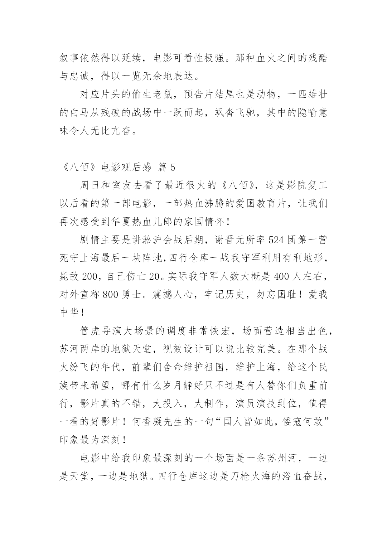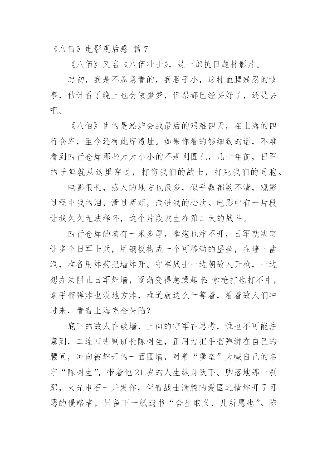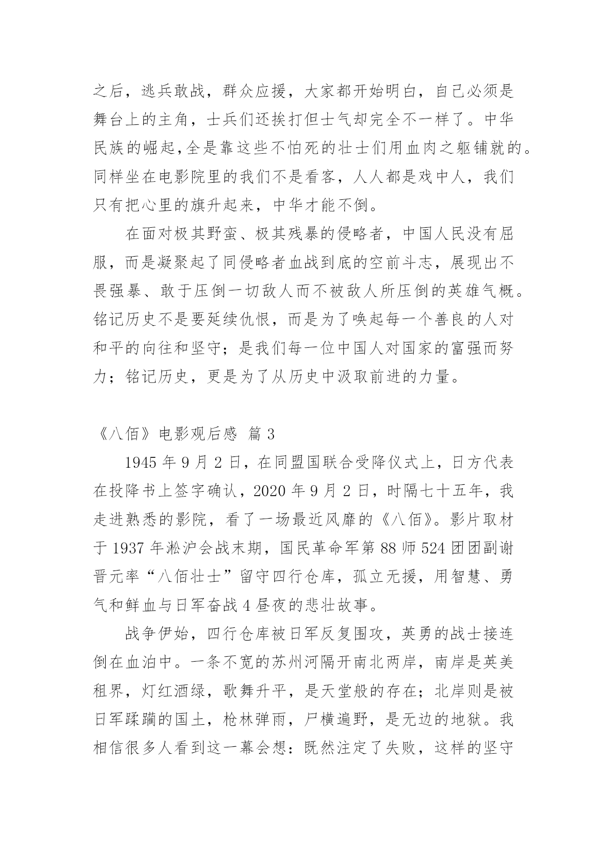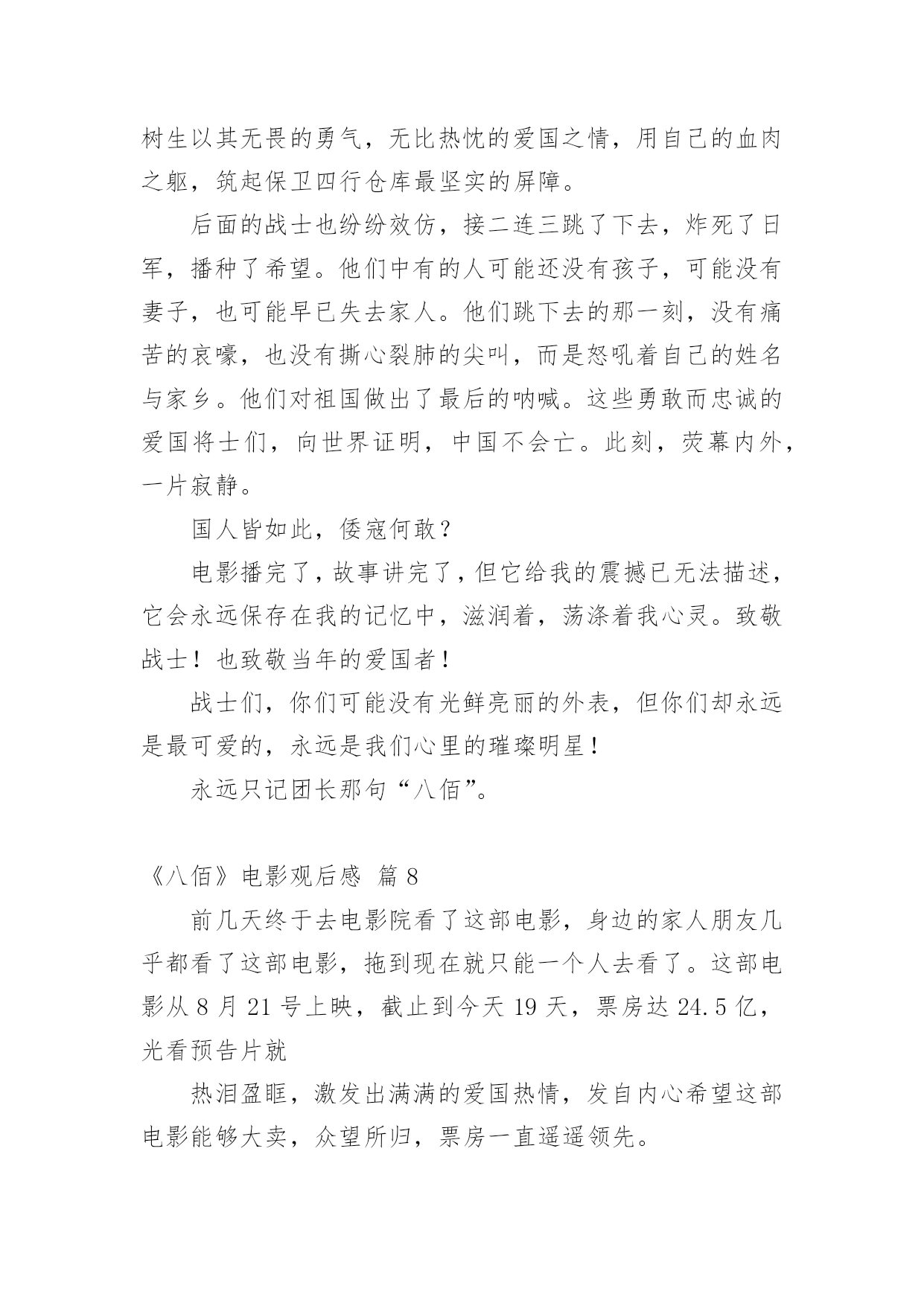 《八佰》电影观后感《八佰》电影观后感(精选20篇)在观看完一部作品以后,相信你会有不少感想吧,何不写一篇观后感记录下呢?观后感你想好怎么写了吗?以下是小编整理的《八佰》电影观后感,仅供参考,欢迎大家阅读。《八佰》电影观后感篇1今天,我们全体人员观看了一部振奋人心,令人动容历史题材电影《八佰》。我们生活在如此繁华昌盛今天,是多少革命人士不惧危险,不怕牺牲为我们后辈打下江山。在观看电影中,给我带来震撼感想不是一点点,在电影中虽然刻画每个人性格不同,但是都是有血有肉,铁骨铮铮硬汉形象,为了保卫祖国最后一道防线,国民革命军第88师524团留守上海四行仓库孤军奋战四天四夜,电影跌宕起伏,扣人心弦,有许多情节让人泪目。在观影中,让我印象最深是河对岸爱国民众不畏惧生命危险,趁着夜色游过河对岸将国旗带到四行仓库,交到壮士们手中,在危险面前,在正义面前,团长选择升旗,他希望这样选择能够燃气中华人民斗志激情,也让中国人民燃气希望,不要隔江犹唱后庭花。为了鲜红旗帜能在四行仓库平台上升旗,战士们奋力抵抗,以血肉之躯,前仆后继。守住了战士们用生命献血凝固而成国旗,让它屹立不倒。战士们用行动告诉全世界,中国不会倒下,中国不会亡。在国难当头,外敌入侵之际,我们会前仆后继去战斗,维护国家民族尊严屹立不倒。河对岸有爱国人士,也有麻木不仁一群人,随着镜头在浴血奋战坐以待毙间来回切换,让我感觉到民族悲剧,八佰壮士是个孤独存在,即使绝望死亡感,无力感,却丝毫为动摇战士们爱国之心,他们愿意舍生取义,唤醒对岸掩耳盗铃式自欺欺人。当然,整部电影下来,那些用生命用血肉来守护国家战士们,是真正英雄,是名族之魂。明知仓库是坟墓,甘愿舍命守护,明知前面是刀山火海,拼命也要遵守军令。致敬那些舍生取义民族英雄,八佰壮士誓死不退血性中国人宁死不屈民族气节,这些都应该被平年代我们铭记。哪有什么岁月静好,只是有人为你负重前行。我们应该以梦为马,不负韶华。《八佰》电影观后感篇29月12日桃山街道组织的践行初心使命,永葆党员本色主题党日活动,做为一名快乐义工的党员志愿者,我参加了这次活动,活动内容是观看影片《八佰》。电影的核心在于升旗的片段,以升旗为中心点上下串联起来你会发现,升旗之前,逃兵在逃,群众在看,人人都想远离舞台,安安静静当观众,士兵们也只能被动挨打。升旗之后,逃兵敢战,群众应援,大家都开始明白,自己必须是舞台上的主角,士兵们还挨打但士气却完全不一样了。中华民族的崛起,全是靠这些不怕死的壮士们用血肉之躯铺就的。同样坐在电影院里的我们不是看客,人人都是戏中人,我们只有把心里的旗升起来,中华才能不倒。在面对极其野蛮、极其残暴的侵略者,中国人民没有屈服,而是凝聚起了同侵略者血战到底的空前斗志,展现出不畏强暴、敢于压倒一切敌人而不被敌人所压倒的英雄气概。铭记历史不是要延续仇恨,而是为了唤起每一个善良的人对和平的向往和坚守;是我们每一位中国人对国家的富强而努力;铭记历史,更是为了从历史中汲取前进的力量。《八佰》电影观后感篇31945年9月2日,在同盟国联合受降仪式上,日方代表在投降书上签字确认,2020年9月2日,时隔七十五年,我走进熟悉的影院,看了一场最近风靡的《八佰》。影片取材于1937年淞沪会战末期,国民革命军第88师524团团副谢晋元率“八佰壮士”留守四行仓库,孤立无援,用智慧、勇气和鲜血与日军奋战4昼夜的悲壮故事。战争伊始,四行仓库被日军反复围攻,英勇的战士接连倒在血泊中。一条不宽的苏州河隔开南北两岸,南岸是英美租界,灯红酒绿,歌舞升平,是天堂般的存在;北岸则是被日军蹂躏的国土,枪林弹雨,尸横遍野,是无边的地狱。我相信很多人看到这一幕会想:既然注定了失败,这样的坚守有何意义?都是鲜活的生命,都是爹娘的孩子,就这么白白牺牲了?起初河对岸也是这种看客心态,让租界的人毫无防备,再后来也遭受到了日军的侵袭。当我看到陈树生为了粉碎敌人炸墙的企图,和一众战士身捆炸药,奋不顾身时;当我看到一群怯懦的小人物在这场残酷的战斗中,勇敢的举枪反击时;当我看到南岸的国人渐渐红了眼,群情激愤,纷纷声援时,我清楚的看到了这场战斗的意义,不是用惨烈去博取西方列强的同情,而是用鲜血去唤醒愚昧初醒的四万万国人。这也让我联想到这次疫情初期,很多人不把病毒当回事,四处串门,仿佛与自己无关。结果不仅传染了家人,还造成了恶劣影响。如果大家都能抛弃偏见,心怀善良,共克时艰,相信没有战胜不了的困难。毕竟,雪崩时,没有一片雪花是无辜的。淞沪会战失败了,四行仓库终究还是失守了,但不代表我们就输了。忍辱负重,永不放弃,整个14年抗战期间,中华民族付出了巨大的代价,尽管艰苦卓绝,但最终我们胜利了!上海苏州河畔,一面布满了8个炮弹孔和400余个大小枪弹孔的高墙,记录着一段可歌可泣的历史,“八佰壮士”用生命唤醒了国人,“中国不会亡,中华
