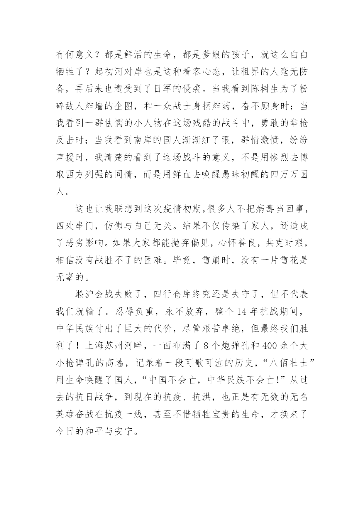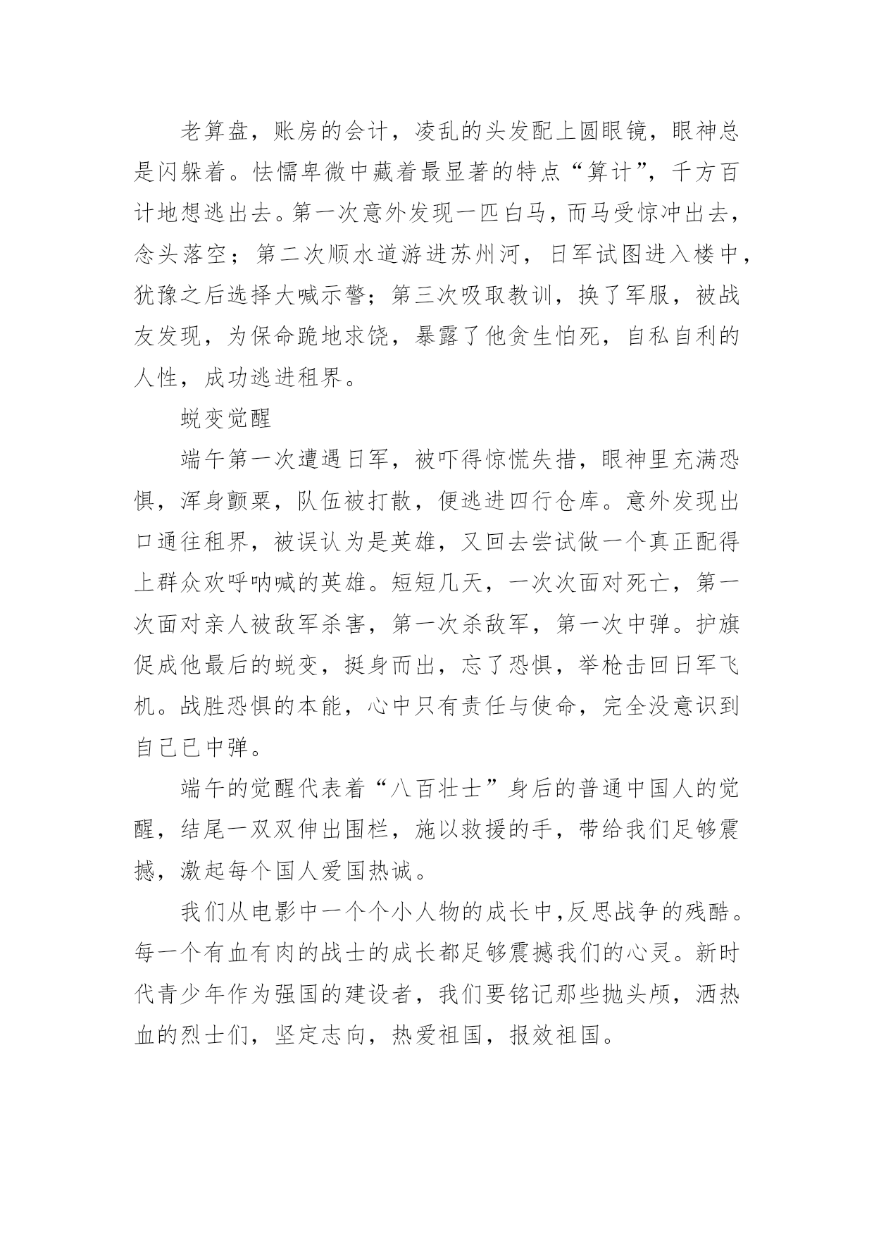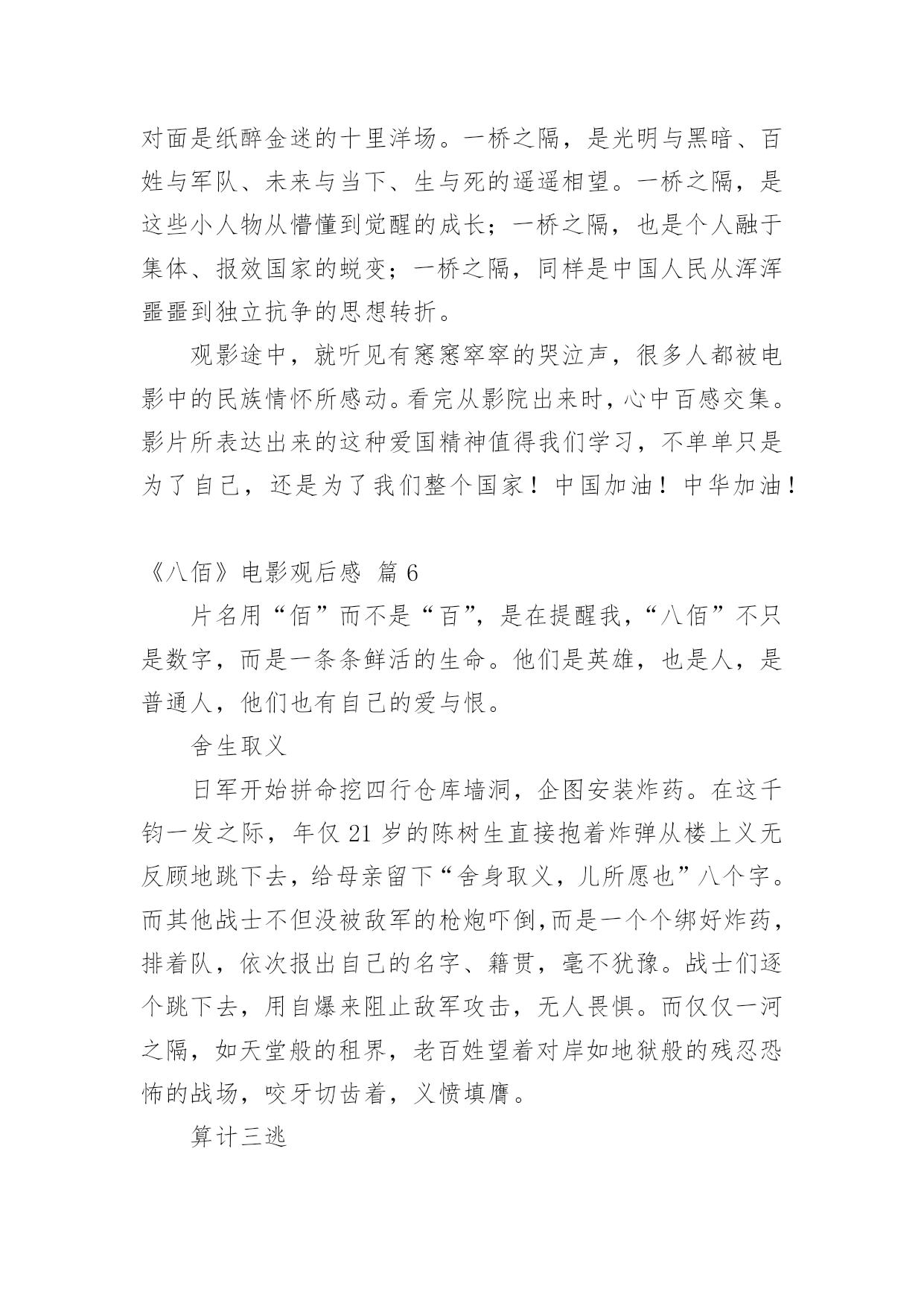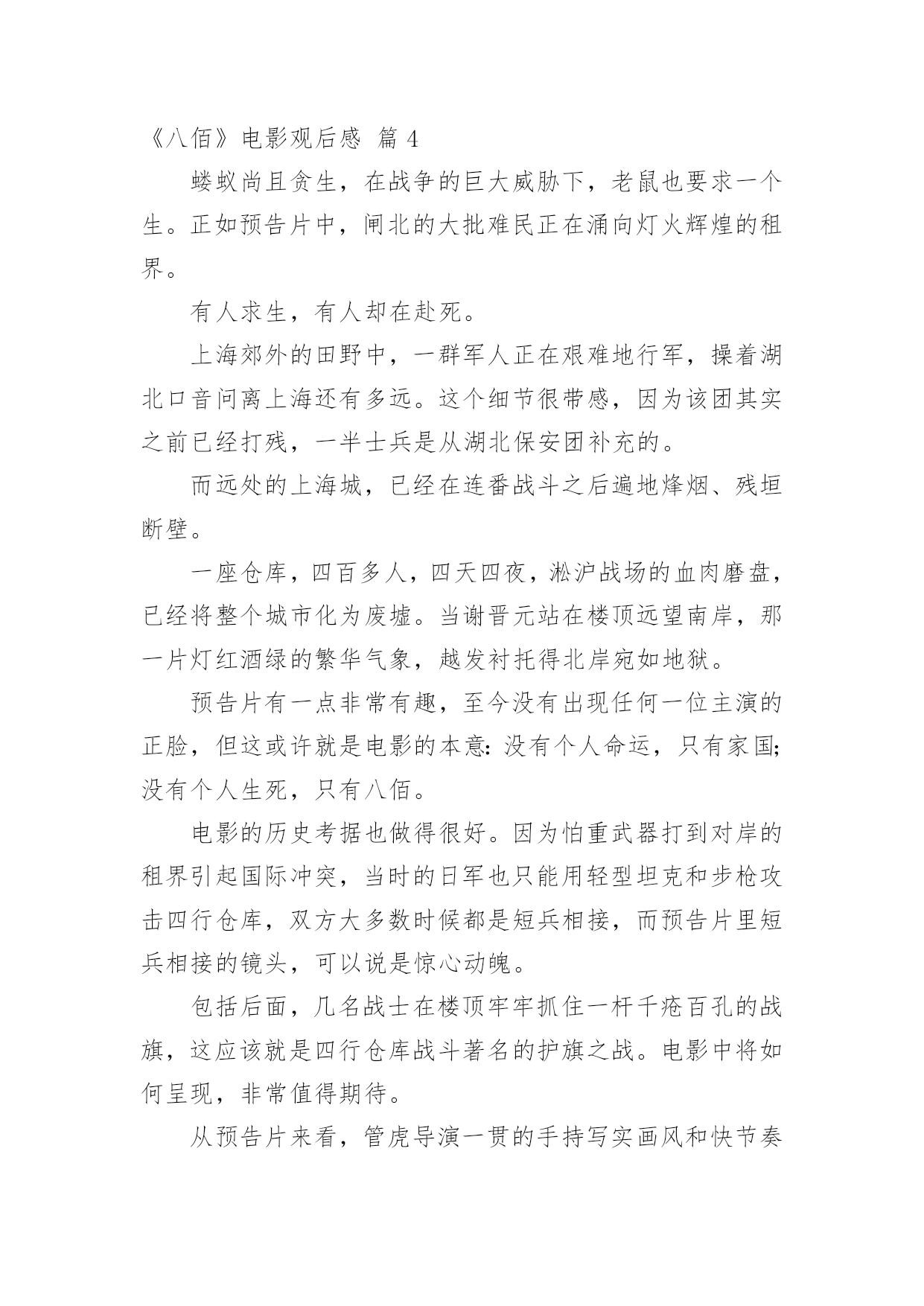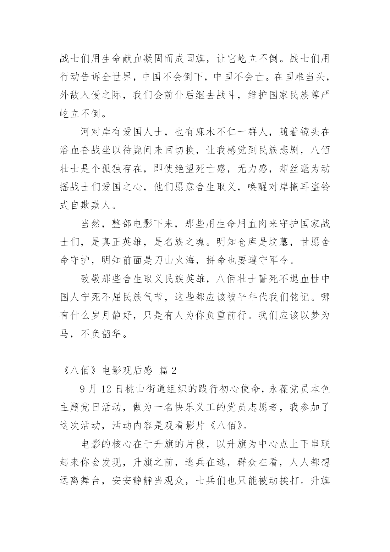 《八佰》电影观后感《八佰》电影观后感(精选20篇)在观看完一部作品以后,相信你会有不少感想吧,何不写一篇观后感记录下呢?观后感你想好怎么写了吗?以下是小编整理的《八佰》电影观后感,仅供参考,欢迎大家阅读。《八佰》电影观后感篇1今天,我们全体人员观看了一部振奋人心,令人动容历史题材电影《八佰》。我们生活在如此繁华昌盛今天,是多少革命人士不惧危险,不怕牺牲为我们后辈打下江山。在观看电影中,给我带来震撼感想不是一点点,在电影中虽然刻画每个人性格不同,但是都是有血有肉,铁骨铮铮硬汉形象,为了保卫祖国最后一道防线,国民革命军第88师524团留守上海四行仓库孤军奋战四天四夜,电影跌宕起伏,扣人心弦,有许多情节让人泪目。在观影中,让我印象最深是河对岸爱国民众不畏惧生命危险,趁着夜色游过河对岸将国旗带到四行仓库,交到壮士们手中,在危险面前,在正义面前,团长选择升旗,他希望这样选择能够燃气中华人民斗志激情,也让中国人民燃气希望,不要隔江犹唱后庭花。为了鲜红旗帜能在四行仓库平台上升旗,战士们奋力抵抗,以血肉之躯,前仆后继。守住了战士们用生命献血凝固而成国旗,让它屹立不倒。战士们用行动告诉全世界,中国不会倒下,中国不会亡。在国难当头,外敌入侵之际,我们会前仆后继去战斗,维护国家民族尊严屹立不倒。河对岸有爱国人士,也有麻木不仁一群人,随着镜头在浴血奋战坐以待毙间来回切换,让我感觉到民族悲剧,八佰壮士是个孤独存在,即使绝望死亡感,无力感,却丝毫为动摇战士们爱国之心,他们愿意舍生取义,唤醒对岸掩耳盗铃式自欺欺人。当然,整部电影下来,那些用生命用血肉来守护国家战士们,是真正英雄,是名族之魂。明知仓库是坟墓,甘愿舍命守护,明知前面是刀山火海,拼命也要遵守军令。致敬那些舍生取义民族英雄,八佰壮士誓死不退血性中国人宁死不屈民族气节,这些都应该被平年代我们铭记。哪有什么岁月静好,只是有人为你负重前行。我们应该以梦为马,不负韶华。《八佰》电影观后感篇29月12日桃山街道组织的践行初心使命,永葆党员本色主题党日活动,做为一名快乐义工的党员志愿者,我参加了这次活动,活动内容是观看影片《八佰》。电影的核心在于升旗的片段,以升旗为中心点上下串联起来你会发现,升旗之前,逃兵在逃,群众在看,人人都想远离舞台,安安静静当观众,士兵们也只能被动挨打。升旗之后,逃兵敢战,群众应援,大家都开始明白,自己必须是舞台上的主角,士兵们还挨打但士气却完全不一样了。中华民族的崛起,全是靠这些不怕死的壮士们用血肉之躯铺就的。同样坐在电影院里的我们不是看客,人人都是戏中人,我们只有把心里的旗升起来,中华才能不倒。在面对极其野蛮、极其残暴的侵略者,中国人民没有屈服,而是凝聚起了同侵略者血战到底的空前斗志,展现出不畏强暴、敢于压倒一切敌人而不被敌人所压倒的英雄气概。铭记历史不是要延续仇恨,而是为了唤起每一个善良的人对和平的向往和坚守;是我们每一位中国人对国家的富强而努力;铭记历史,更是为了从历史中汲取前进的力量。《八佰》电影观后感篇31945年9月2日,在同盟国联合受降仪式上,日方代表在投降书上签字确认,2020年9月2日,时隔七十五年,我走进熟悉的影院,看了一场最近风靡的《八佰》。影片取材于1937年淞沪会战末期,国民革命军第88师524团团副谢晋元率“八佰壮士”留守四行仓库,孤立无援,用智慧、勇气和鲜血与日军奋战4昼夜的悲壮故事。战争伊始,四行仓库被日军反复围攻,英勇的战士接连倒在血泊中。一条不宽的苏州河隔开南北两岸,南岸是英美租界,灯红酒绿,歌舞升平,是天堂般的存在;北岸则是被日军蹂躏的国土,枪林弹雨,尸横遍野,是无边的地狱。我相信很多人看到这一幕会想:既然注定了失败,这样的坚守有何意义?都是鲜活的生命,都是爹娘的孩子,就这么白白牺牲了?起初河对岸也是这种看客心态,让租界的人毫无防备,再后来也遭受到了日军的侵袭。当我看到陈树生为了粉碎敌人炸墙的企图,和一众战士身捆炸药,奋不顾身时;当我看到一群怯懦的小人物在这场残酷的战斗中,勇敢的举枪反击时;当我看到南岸的国人渐渐红了眼,群情激愤,纷纷声援时,我清楚的看到了这场战斗的意义,不是用惨烈去博取西方列强的同情,而是用鲜血去唤醒愚昧初醒的四万万国人。这也让我联想到这次疫情初期,很多人不把病毒当回事,四处串门,仿佛与自己无关。结果不仅传染了家人,还造成了恶劣影响。如果大家都能抛弃偏见,心怀善良,共克时艰,相信没有战胜不了的困难。毕竟,雪崩时,没有一片雪花是无辜的。淞沪会战失败了,四行仓库终究还是失守了,但不代表我们就输了。忍辱负重,永不放弃,整个14年抗战期间,中华民族付出了巨大的代价,尽管艰苦卓绝,但最终我们胜利了!上海苏州河畔,一面布满了8个炮弹孔和400余个大小枪弹孔的高墙,记录着一段可歌可泣的历史,“八佰壮士”用生命唤醒了国人,“中国不会亡,中华