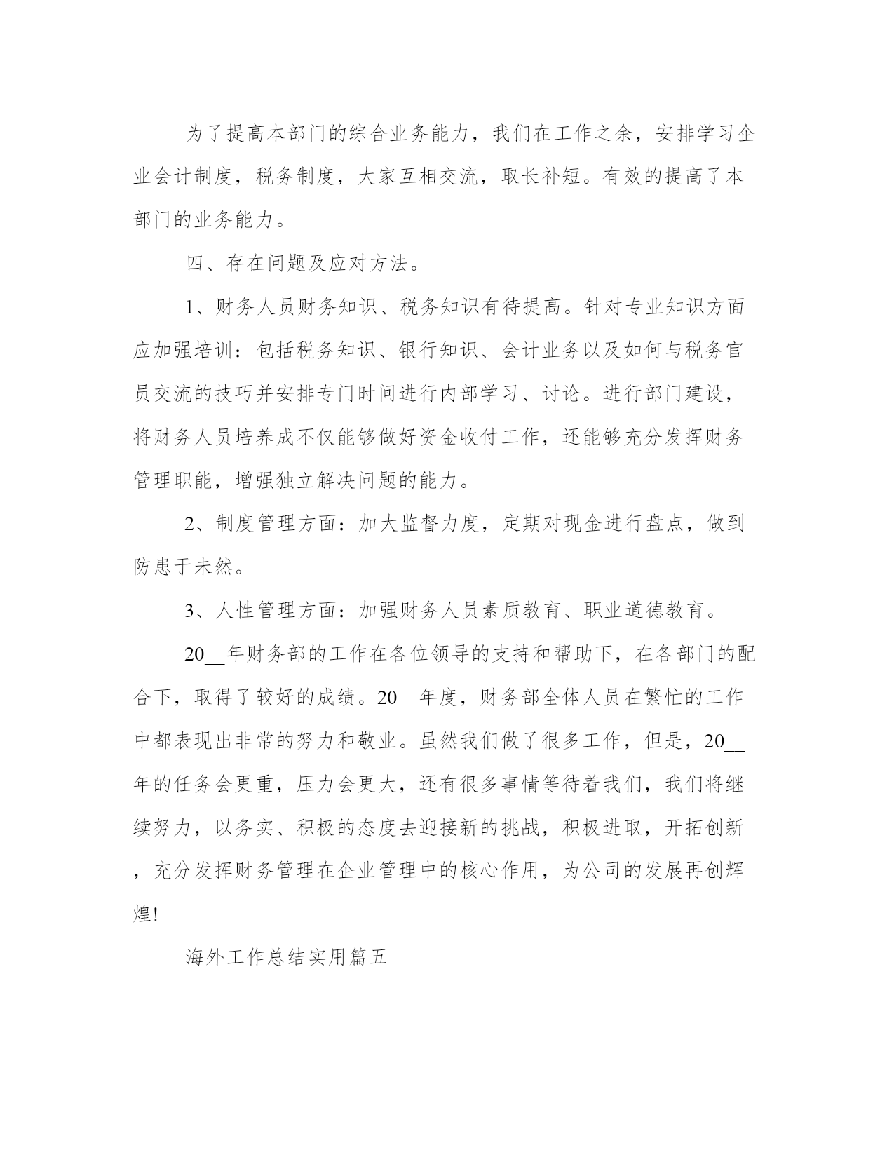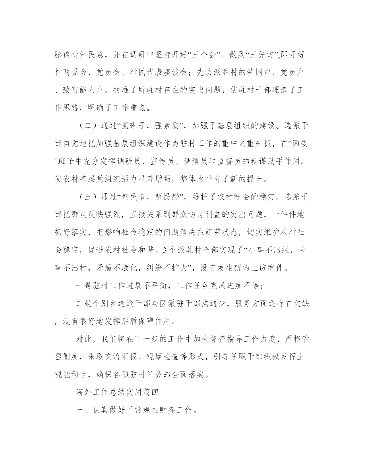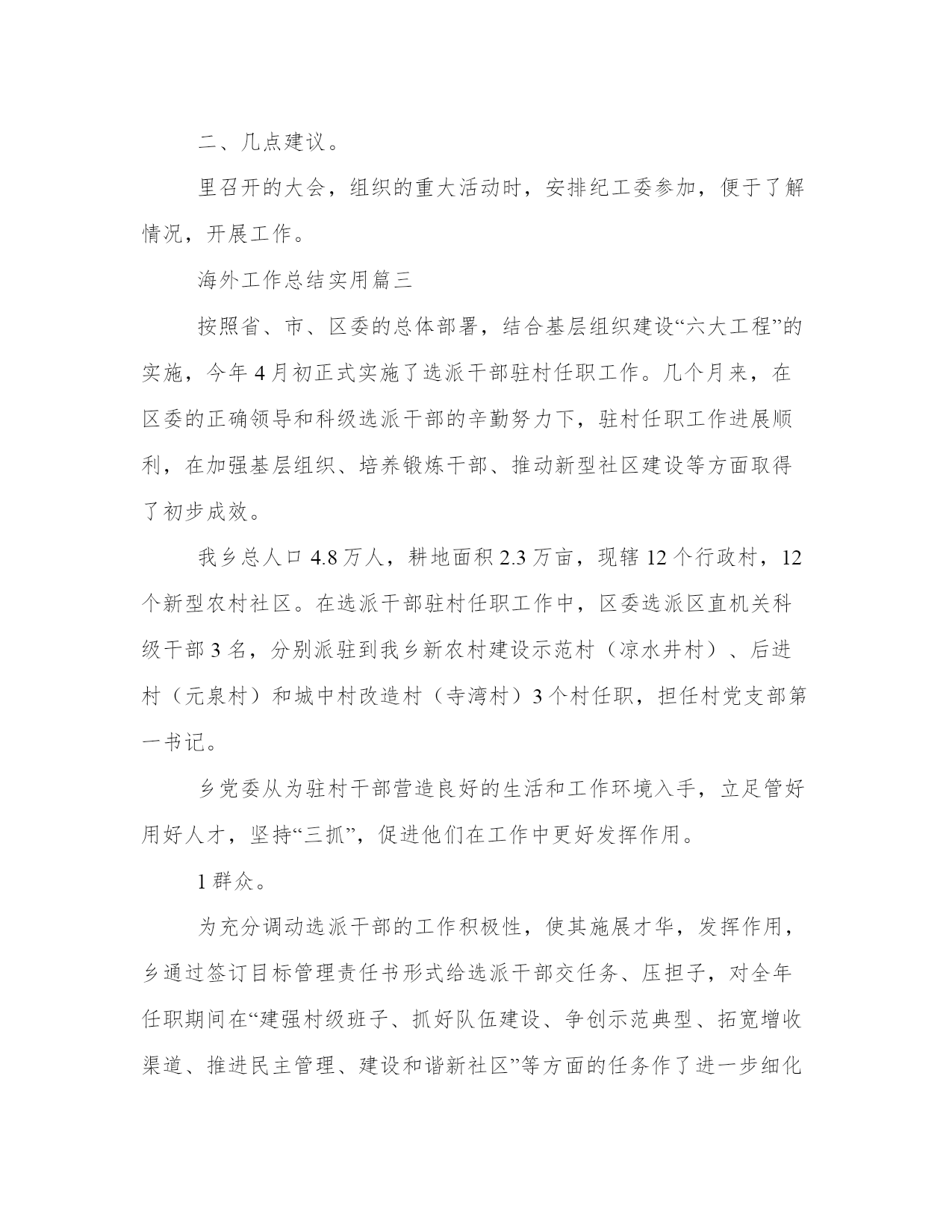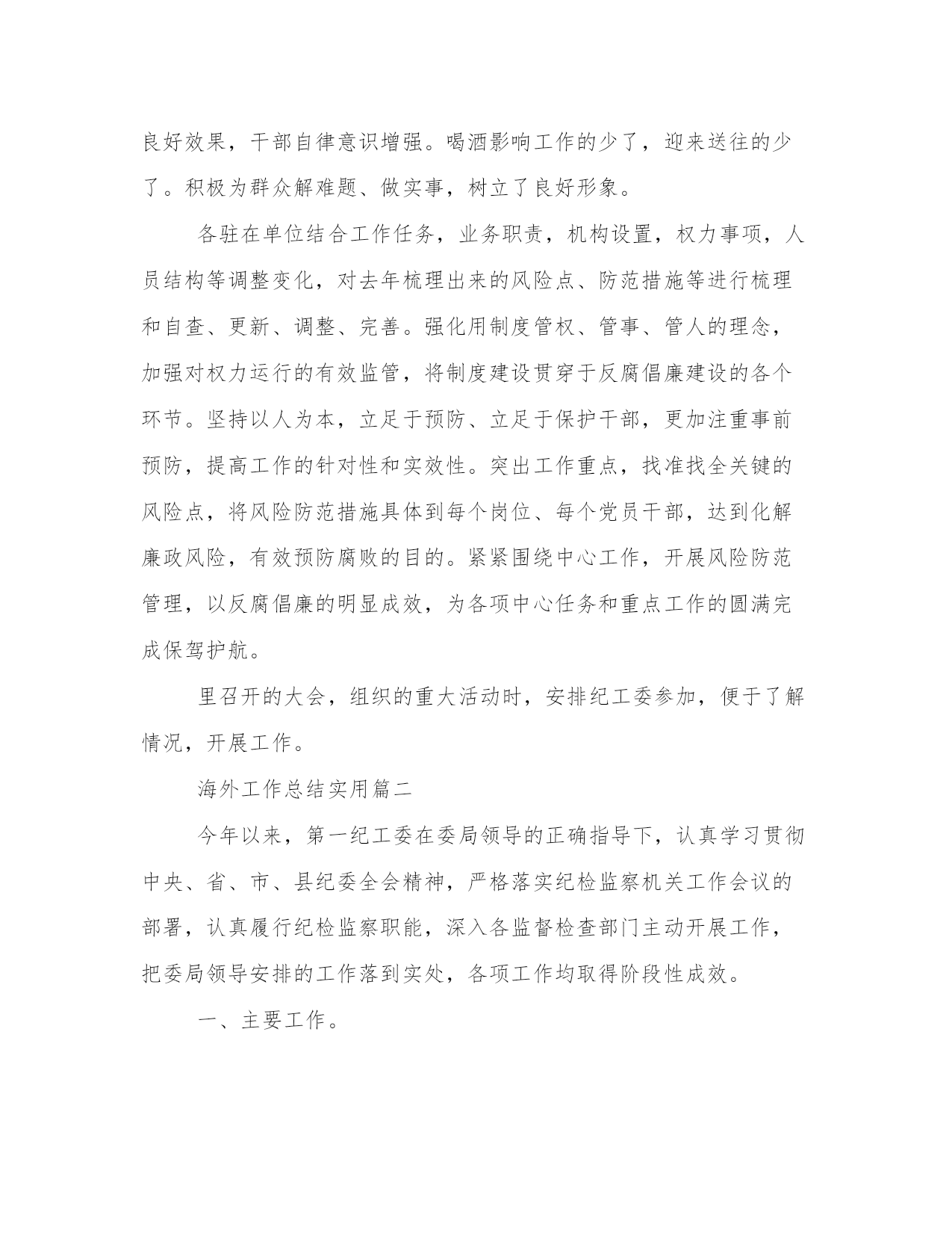 海外工作总结实用海外工作总结(优质8篇)对某一单位、某一部门工作进行全面性总结,既反映工作的概况,取得的成绩,存在的问题、缺点,也要写经验教训和今后如何改进的意见等。那么,我们该怎么写总结呢?以下是小编为大家收集的总结范文,仅供参考,大家一起来看看吧。海外工作总结实用篇一今年以来,第一纪工委在委局领导的正确指导下,认真学习贯彻中央、省、市、县纪委全会精神,严格落实纪检监察机关工作会议的部署,认真履行纪检监察职能,深入各监督检查部门主动开展工作,把委局领导安排的工作落到实处,各项工作均取得阶段性成效。新形势下,对纪检干部有更高要求,第一纪工委加强政治理论学习,把学理论、学政策当作一项重要任务,认真学习政治理论和业务知识。认真学习中国监察、纪检监察报等党报党刊,学习干部素养读本、落实重于一切等书籍。提高理论基础和业务能力,并且认真总结学习经验和学习体会,夯实了思想政治基础。在业务学习方面,认真学习纪检监察政策法规汇编、中国共产党纪律处分条例、行政机关公务员处分条例和中纪委相关法律法规,不断更新充实学习内容,提高自身业务素质。开展工作。并于5月16日至20日,调研走访了所属的10个单位,查阅、核实了有关账目,与相关工作人员和服务对象进行了座谈了解,确保有关数据客观、真实。对调查表和整改意见建议,进行认真分析总结,针对存在的问题提出对策性建议,撰写调研报告,调研活动取得良好的效果。按照关于进一步做好落实德州市机关作风建设“八条禁令”的通知文件要求,积极参加驻在乡镇和部门的专题会议,统一思想,提高认识,仔细对照“八条禁令“的要求,不折不扣地把“八条禁令”落到实处。并对各部门提出要求:一是进一步加大宣传教育力度。提高广大干部对“八条禁令”的认识,使全体干部对“八条禁令”要求入脑入心。同时,进一步加强干部队伍的思想建设,不断提升各级干部的思想境界,从根本上增强遵守“八条禁令”自觉性。二是进一步发挥领导机关和领导干部的示范作用。领导干部要带头学习禁令、遵守禁令、维护禁令,用自身的表率作用,影响和带动各级干部作风的转变。加强机关干部的教育管理,要求基层做到的,机关首先做到;要求基层不做的,机关坚决杜绝,以实际行动取信于基层职工群众。三是进一步完善长效机制。突出简便易行的原则,围绕“八条禁令”的落实,建立完善监督检查、公开通报和考评奖惩等制度,真正将“八条禁令”融入干部作风、机关建设和党风廉政建设的各项制度中,使“八条禁令”能够长久地发挥积极作用。各驻在部门认真执行,取得良好效果,干部自律意识增强。喝酒影响工作的少了,迎来送往的少了。积极为群众解难题、做实事,树立了良好形象。各驻在单位结合工作任务,业务职责,机构设置,权力事项,人员结构等调整变化,对去年梳理出来的风险点、防范措施等进行梳理和自查、更新、调整、完善。强化用制度管权、管事、管人的理念,加强对权力运行的有效监管,将制度建设贯穿于反腐倡廉建设的各个环节。坚持以人为本,立足于预防、立足于保护干部,更加注重事前预防,提高工作的针对性和实效性。突出工作重点,找准找全关键的风险点,将风险防范措施具体到每个岗位、每个党员干部,达到化解廉政风险,有效预防腐败的目的。紧紧围绕中心工作,开展风险防范管理,以反腐倡廉的明显成效,为各项中心任务和重点工作的圆满完成保驾护航。里召开的大会,组织的重大活动时,安排纪工委参加,便于了解情况,开展工作。海外工作总结实用篇二今年以来,第一纪工委在委局领导的正确指导下,认真学习贯彻中央、省、市、县纪委全会精神,严格落实纪检监察机关工作会议的部署,认真履行纪检监察职能,深入各监督检查部门主动开展工作,把委局领导安排的工作落到实处,各项工作均取得阶段性成效。一、主要工作。1、加强自身建设。新形势下,对纪检干部有更高要求,第一纪工委加强政治理论学习,把学理论、学政策当作一项重要任务,认真学习政治理论和业务知识。认真学习中国监察、纪检监察报等党报党刊,学习干部素养读本、落实重于一切等书籍。提高理论基础和业务能力,并且认真总结学习经验和学习体会,夯实了思想政治基础。在业务学习方面,认真学习纪检监察政策法规汇编、中国共产党纪律处分条例、行政机关公务员处分条例和中纪委相关法律法规,不断更新充实学习内容,提高自身业务素质。开展工作。并于5月16日至20日,调研走访了所属的10个单位,查阅、核实了有关账目,与相关工作人员和服务对象进行了座谈了解,确保有关数据客观、真实。对调查表和整改意见建议,进行认真分析总结,针对存在的问题提出对策性建议,撰写调研报告,调研活动取得良好的效果。3、积极贯彻落实八条禁令。按照关于进一步做好落实德州市机关作风建设“八条禁令”的通知文件要求,积极参加驻在乡镇和部门的专题会议,统一思想,提高认识,仔细对照“八条禁令“的要求,不