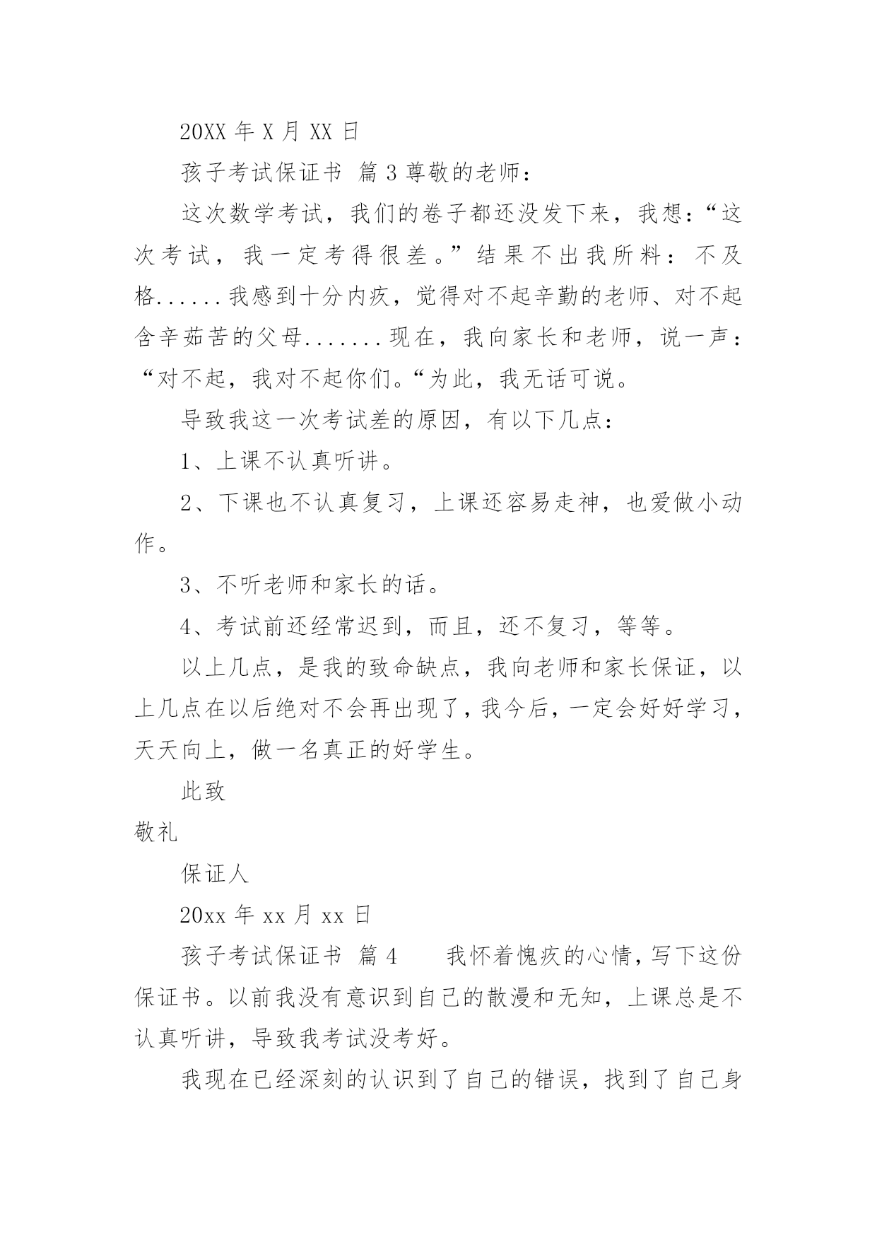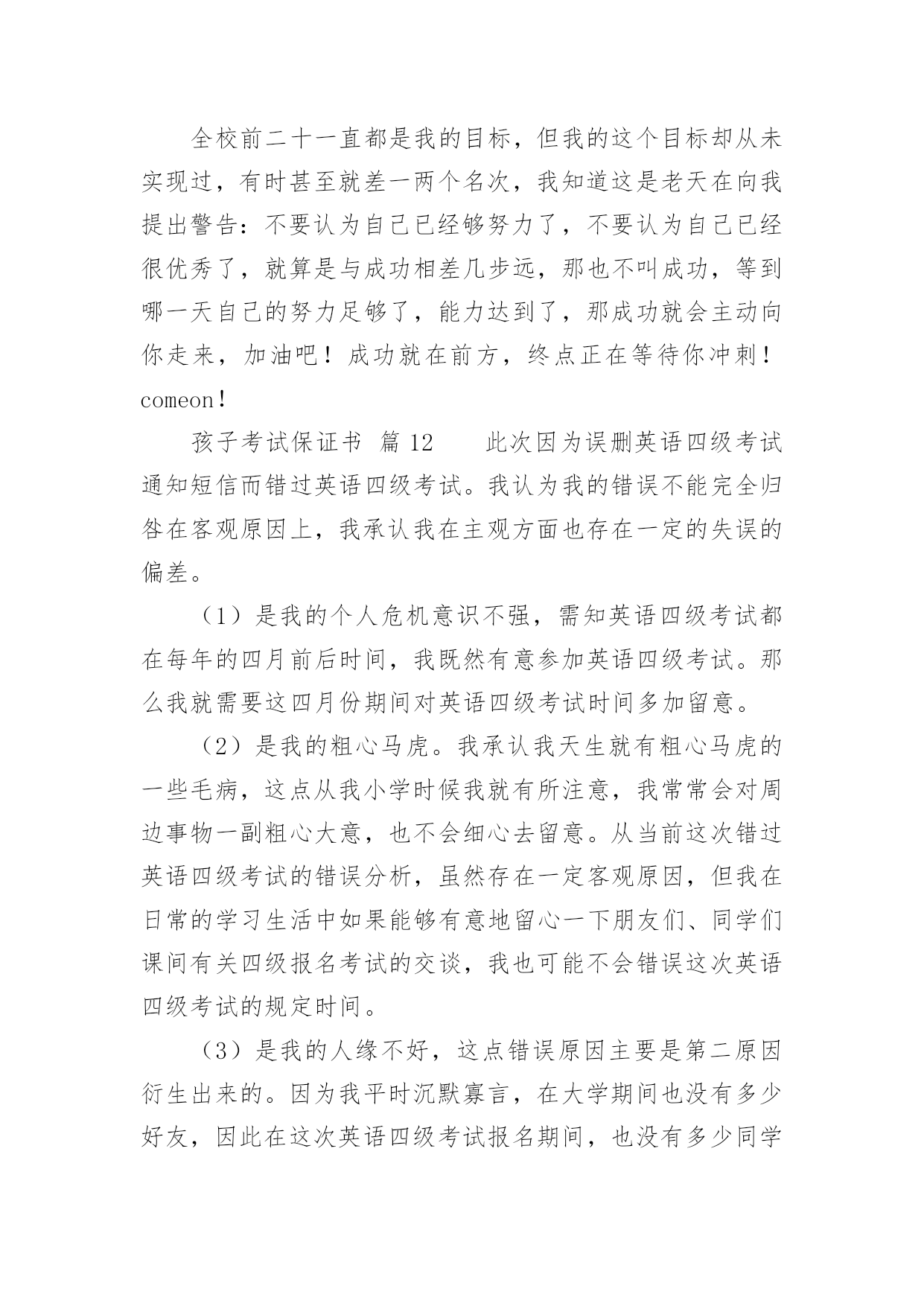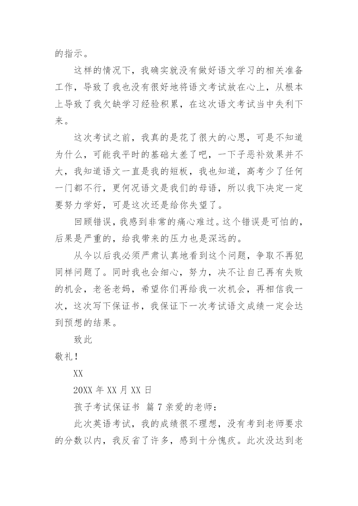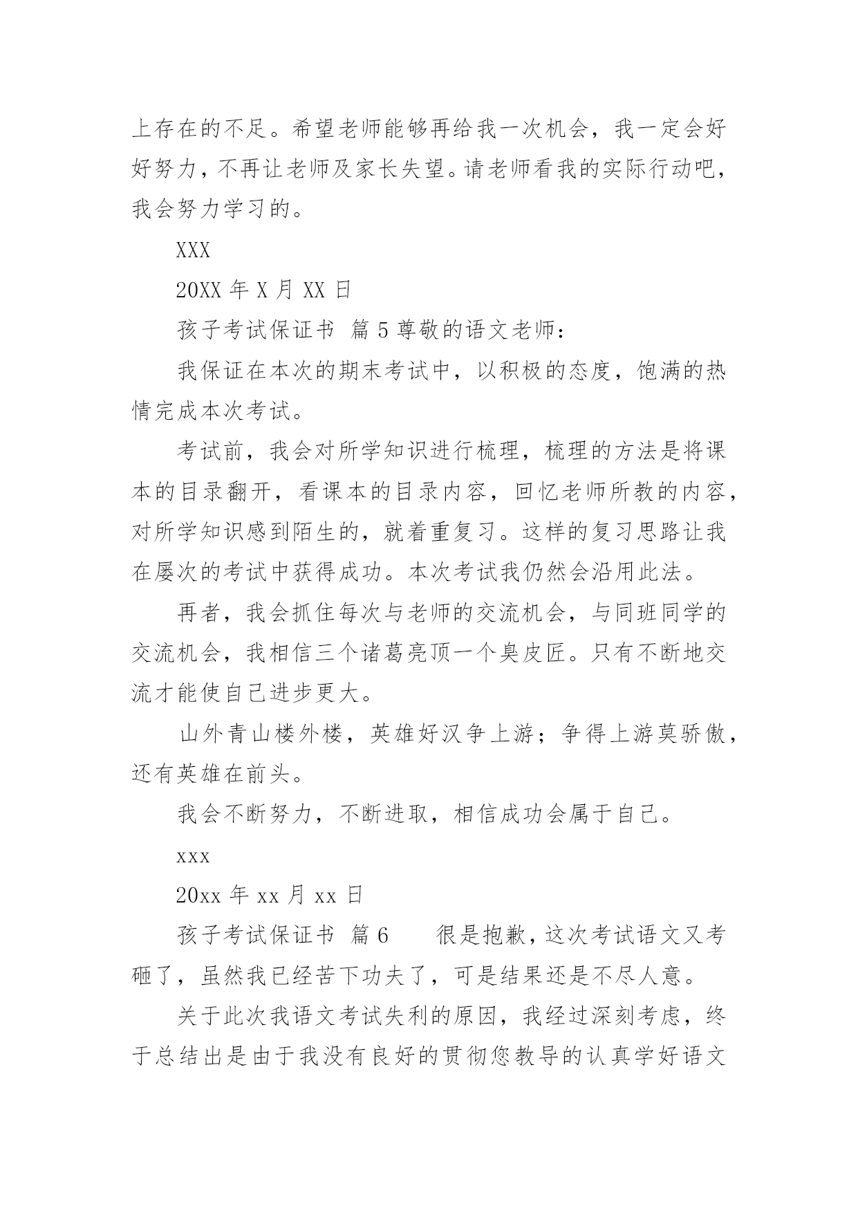 孩子考试保证书孩子考试保证书(精选16篇)在社会一步步向前发展的今天,保证书在我们的生活中并不鲜见,保证书是个人信用的保证。你所见过的保证书是什么样的呢?以下是小编整理的孩子考试保证书,供大家参考借鉴,希望可以帮助到有需要的朋友。孩子考试保证书篇1在这次考试中,我的成绩不是很理想,这跟我的平时努力有很大的关系。最近一段时间,我有点贪玩,忽视了学习。还有就是,我本身对数学就偏科,所以学起来会比较累。但是,我一定不会放弃的,我还是会努力加油,利用平时时间把最近的课补好。我保证在下次的考试中,我的数学成绩一定会有所提高的!XXX20XX年X月XX日孩子考试保证书篇2XXXX:前段时间不是因为月考成绩看得过去有所松懈,导致这次考试没考好。上课时,特别是数学和英语,一有听不懂的情况就犯困,越困越听不懂。然后,我不清楚何时有了个大毛病——发呆。这的确浪费了很多时间。只要一闲下来就发呆。所以,以后打算把日程排满,充实自己,改掉这个自杀式的烂毛病。争取下次考试取得理想成绩。XXX20XX年X月XX日孩子考试保证书篇3尊敬的老师:这次数学考试,我们的卷子都还没发下来,我想:“这次考试,我一定考得很差。”结果不出我所料:不及格......我感到十分内疚,觉得对不起辛勤的老师、对不起含辛茹苦的父母.......现在,我向家长和老师,说一声:“对不起,我对不起你们。“为此,我无话可说。导致我这一次考试差的原因,有以下几点:1、上课不认真听讲。2、下课也不认真复习,上课还容易走神,也爱做小动作。3、不听老师和家长的话。4、考试前还经常迟到,而且,还不复习,等等。以上几点,是我的致命缺点,我向老师和家长保证,以上几点在以后绝对不会再出现了,我今后,一定会好好学习,天天向上,做一名真正的好学生。此致敬礼保证人20xx年xx月xx日孩子考试保证书篇4我怀着愧疚的心情,写下这份保证书。以前我没有意识到自己的散漫和无知,上课总是不认真听讲,导致我考试没考好。我现在已经深刻的认识到了自己的错误,找到了自己身上存在的不足。希望老师能够再给我一次机会,我一定会好好努力,不再让老师及家长失望。请老师看我的实际行动吧,我会努力学习的。XXX20XX年X月XX日孩子考试保证书篇5尊敬的语文老师:我保证在本次的期末考试中,以积极的态度,饱满的热情完成本次考试。考试前,我会对所学知识进行梳理,梳理的方法是将课本的目录翻开,看课本的目录内容,回忆老师所教的内容,对所学知识感到陌生的,就着重复习。这样的复习思路让我在屡次的考试中获得成功。本次考试我仍然会沿用此法。再者,我会抓住每次与老师的交流机会,与同班同学的交流机会,我相信三个诸葛亮顶一个臭皮匠。只有不断地交流才能使自己进步更大。山外青山楼外楼,英雄好汉争上游;争得上游莫骄傲,还有英雄在前头。我会不断努力,不断进取,相信成功会属于自己。xxx20xx年xx月xx日孩子考试保证书篇6很是抱歉,这次考试语文又考砸了,虽然我已经苦下功夫了,可是结果还是不尽人意。关于此次我语文考试失利的原因,我经过深刻考虑,终于总结出是由于我没有良好的贯彻您教导的认真学好语文的指示。这样的情况下,我确实就没有做好语文学习的相关准备工作,导致了我也没有很好地将语文考试放在心上,从根本上导致了我欠缺学习经验积累,在这次语文考试当中失利下来。这次考试之前,我真的是花了很大的心思,可是不知道为什么,可能我平时的基础太差了吧,一下子恶补效果并不大,我知道语文一直是我的短板,我也知道,高考少了任何一门都不行,更何况语文是我们的母语,所以我下决定一定要努力学好,可是这次还是给你失望了。回顾错误,我感到非常的痛心难过。这个错误是可怕的,后果是严重的,给我带来的压力也是深远的。从今以后我必须严肃认真地看到这个问题,争取不再犯同样问题了。同时我也会细心,努力,决不让自己再有失败的机会,老爸老妈,希望你们再给我一次机会,再相信我一次,这次写下保证书,我保证下一次考试语文成绩一定会达到预想的结果。致此敬礼!XX20XX年XX月XX日孩子考试保证书篇7亲爱的老师:此次英语考试,我的成绩很不理想,没有考到老师要求的分数以内,我反省了许多,感到十分愧疚。此次没达到老师的要求,我觉得主要是我的态度不好。在平时的学习中,我不太重视英语,觉得英语不是太重要,于是上课时没有认真听课,作业没有好好做,考试前也没有认真复习。于是,此次考试的成绩自然就差了。其实,英语是一门很重要的学科,不仅从小学到高中都是主科,在每次考试中都占很大比重,而且英语对我们未来的生活和发展也有着至关重要的作用,以后如果要出国,说一口好的英语能让自身更加方便。即使不出国,在国内英语也有许多要用的地方。而且,其实老师要求的分数并不难达到,我没有达到,只能是自身的错。老师每天为我们批改作业,认真给我们备课,而我却辜负了