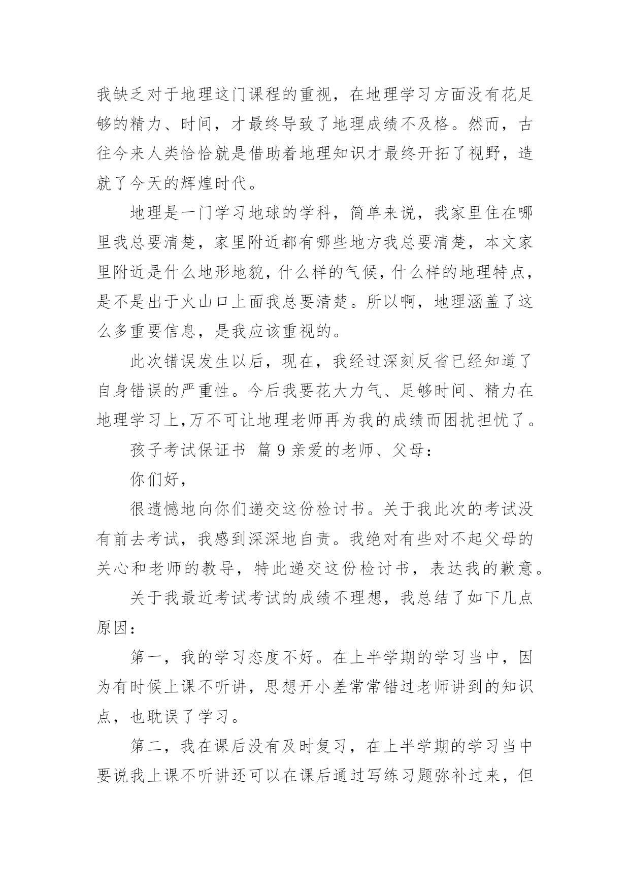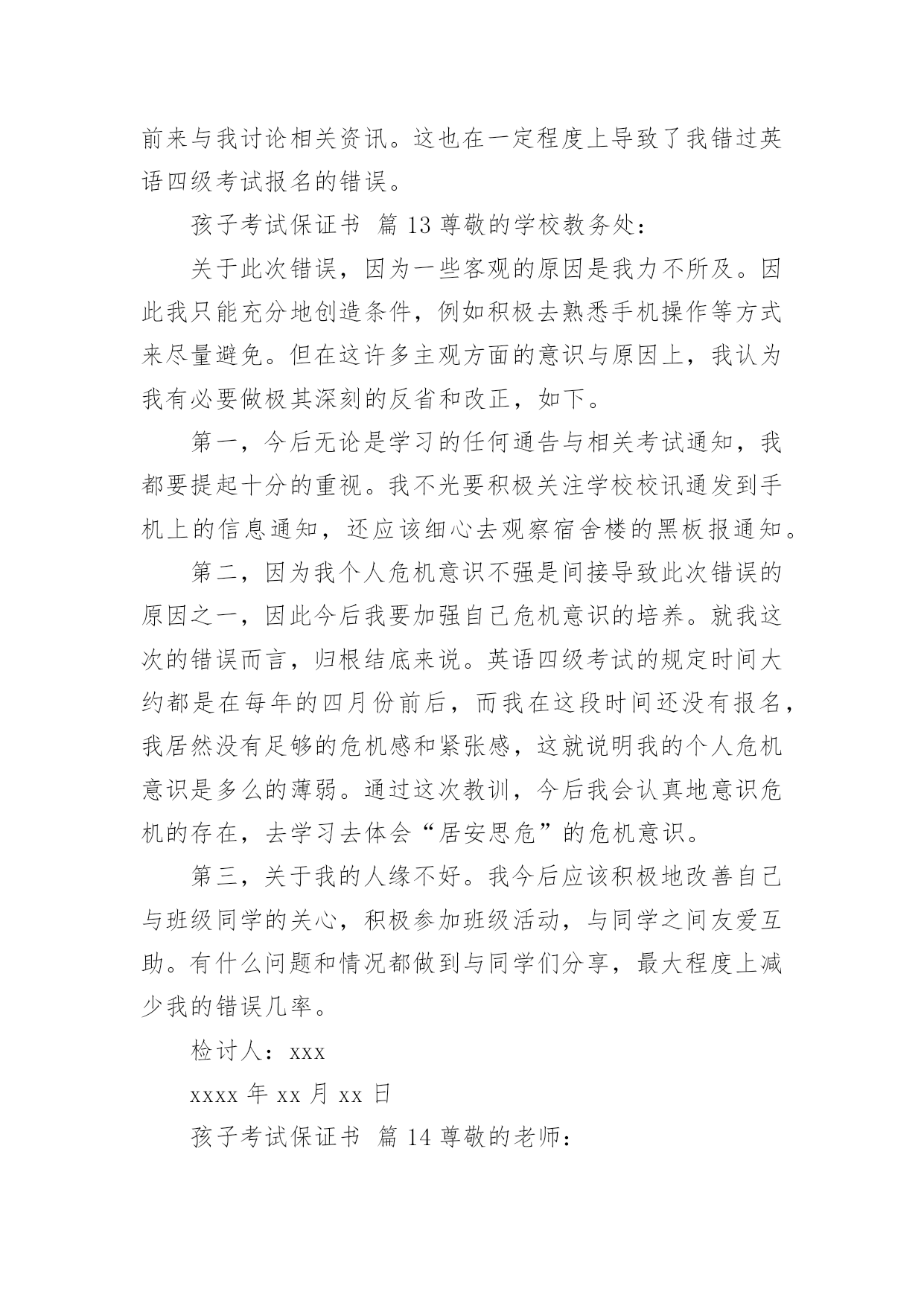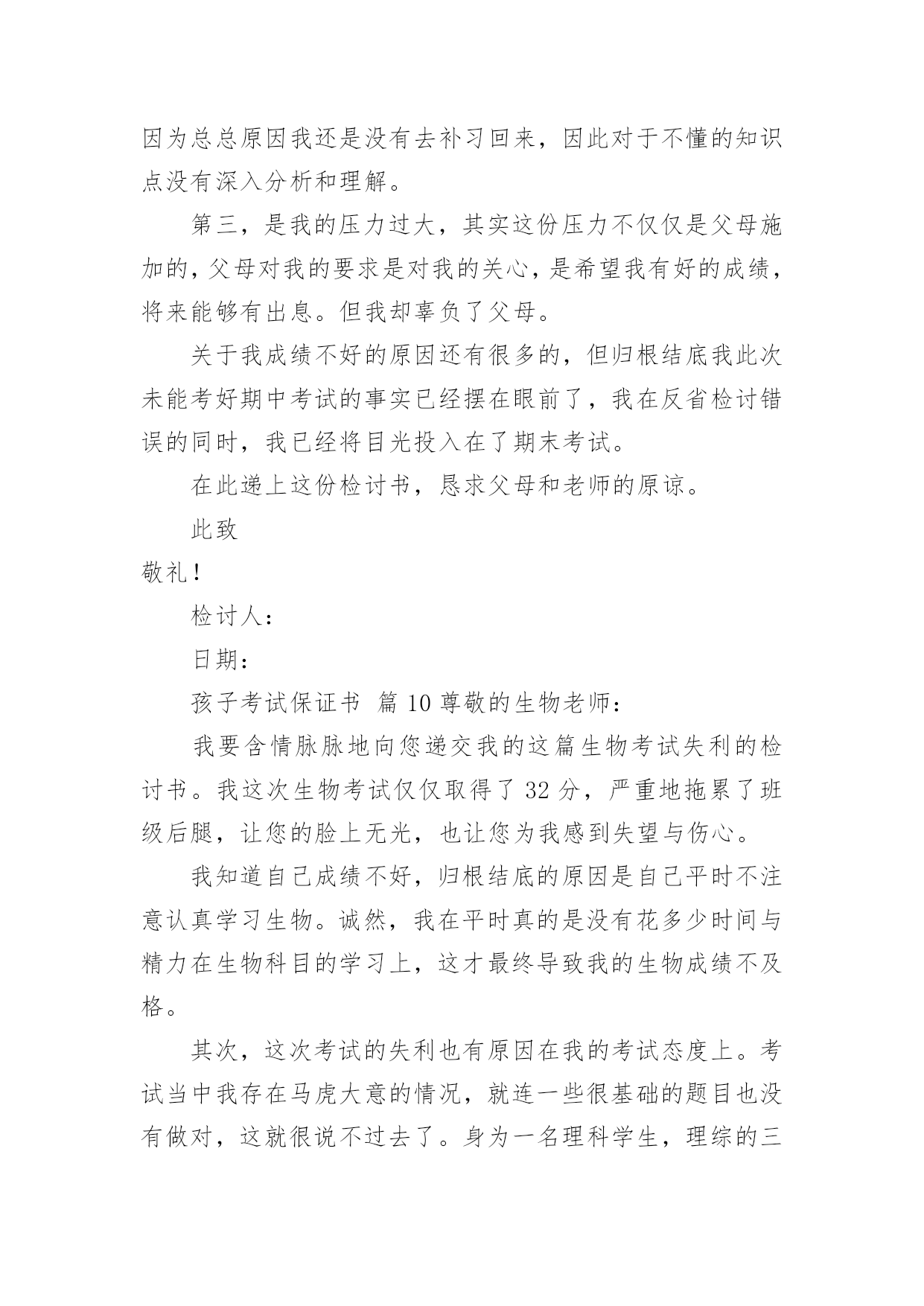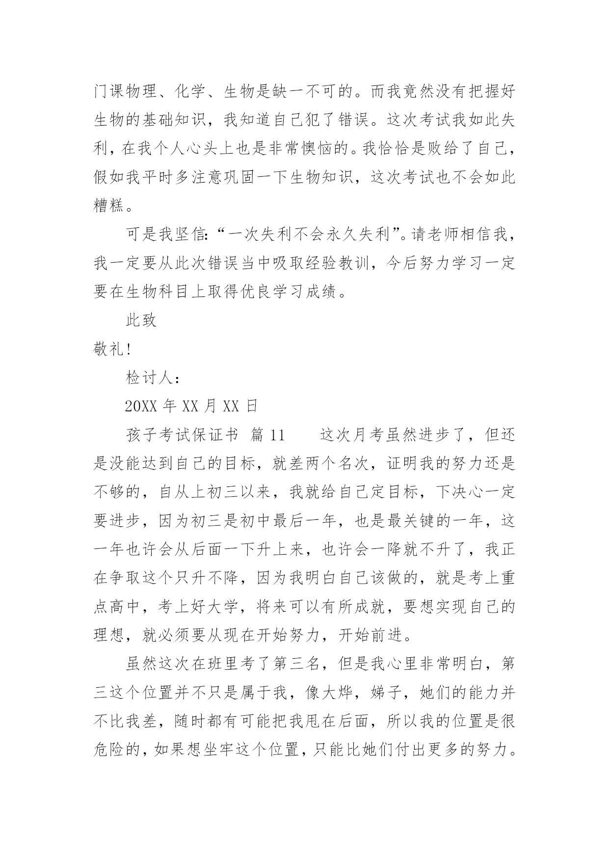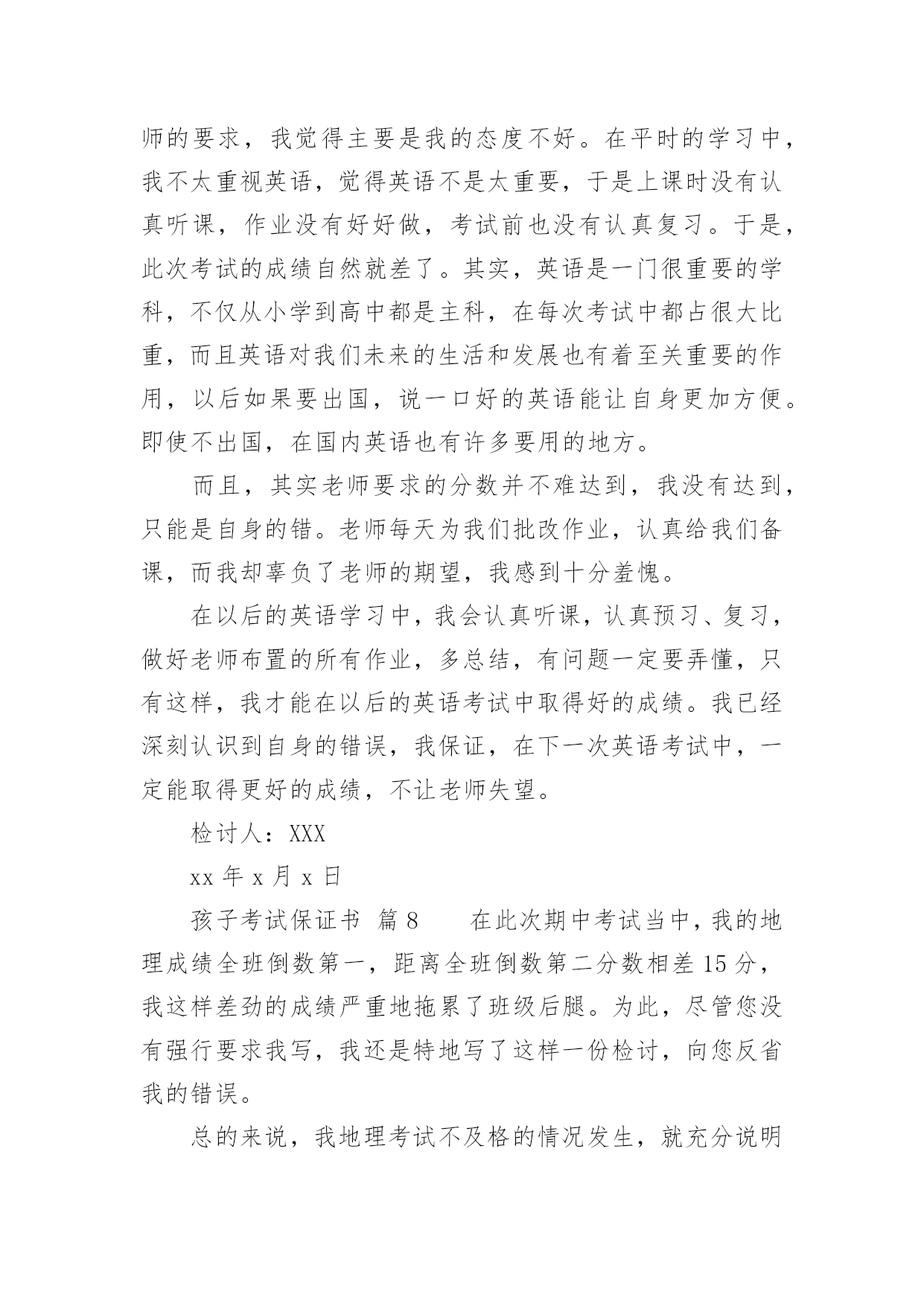 孩子考试保证书孩子考试保证书(精选16篇)在社会一步步向前发展的今天,保证书在我们的生活中并不鲜见,保证书是个人信用的保证。你所见过的保证书是什么样的呢?以下是小编整理的孩子考试保证书,供大家参考借鉴,希望可以帮助到有需要的朋友。孩子考试保证书篇1在这次考试中,我的成绩不是很理想,这跟我的平时努力有很大的关系。最近一段时间,我有点贪玩,忽视了学习。还有就是,我本身对数学就偏科,所以学起来会比较累。但是,我一定不会放弃的,我还是会努力加油,利用平时时间把最近的课补好。我保证在下次的考试中,我的数学成绩一定会有所提高的!XXX20XX年X月XX日孩子考试保证书篇2XXXX:前段时间不是因为月考成绩看得过去有所松懈,导致这次考试没考好。上课时,特别是数学和英语,一有听不懂的情况就犯困,越困越听不懂。然后,我不清楚何时有了个大毛病——发呆。这的确浪费了很多时间。只要一闲下来就发呆。所以,以后打算把日程排满,充实自己,改掉这个自杀式的烂毛病。争取下次考试取得理想成绩。XXX20XX年X月XX日孩子考试保证书篇3尊敬的老师:这次数学考试,我们的卷子都还没发下来,我想:“这次考试,我一定考得很差。”结果不出我所料:不及格......我感到十分内疚,觉得对不起辛勤的老师、对不起含辛茹苦的父母.......现在,我向家长和老师,说一声:“对不起,我对不起你们。“为此,我无话可说。导致我这一次考试差的原因,有以下几点:1、上课不认真听讲。2、下课也不认真复习,上课还容易走神,也爱做小动作。3、不听老师和家长的话。4、考试前还经常迟到,而且,还不复习,等等。以上几点,是我的致命缺点,我向老师和家长保证,以上几点在以后绝对不会再出现了,我今后,一定会好好学习,天天向上,做一名真正的好学生。此致敬礼保证人20xx年xx月xx日孩子考试保证书篇4我怀着愧疚的心情,写下这份保证书。以前我没有意识到自己的散漫和无知,上课总是不认真听讲,导致我考试没考好。我现在已经深刻的认识到了自己的错误,找到了自己身上存在的不足。希望老师能够再给我一次机会,我一定会好好努力,不再让老师及家长失望。请老师看我的实际行动吧,我会努力学习的。XXX20XX年X月XX日孩子考试保证书篇5尊敬的语文老师:我保证在本次的期末考试中,以积极的态度,饱满的热情完成本次考试。考试前,我会对所学知识进行梳理,梳理的方法是将课本的目录翻开,看课本的目录内容,回忆老师所教的内容,对所学知识感到陌生的,就着重复习。这样的复习思路让我在屡次的考试中获得成功。本次考试我仍然会沿用此法。再者,我会抓住每次与老师的交流机会,与同班同学的交流机会,我相信三个诸葛亮顶一个臭皮匠。只有不断地交流才能使自己进步更大。山外青山楼外楼,英雄好汉争上游;争得上游莫骄傲,还有英雄在前头。我会不断努力,不断进取,相信成功会属于自己。xxx20xx年xx月xx日孩子考试保证书篇6很是抱歉,这次考试语文又考砸了,虽然我已经苦下功夫了,可是结果还是不尽人意。关于此次我语文考试失利的原因,我经过深刻考虑,终于总结出是由于我没有良好的贯彻您教导的认真学好语文的指示。这样的情况下,我确实就没有做好语文学习的相关准备工作,导致了我也没有很好地将语文考试放在心上,从根本上导致了我欠缺学习经验积累,在这次语文考试当中失利下来。这次考试之前,我真的是花了很大的心思,可是不知道为什么,可能我平时的基础太差了吧,一下子恶补效果并不大,我知道语文一直是我的短板,我也知道,高考少了任何一门都不行,更何况语文是我们的母语,所以我下决定一定要努力学好,可是这次还是给你失望了。回顾错误,我感到非常的痛心难过。这个错误是可怕的,后果是严重的,给我带来的压力也是深远的。从今以后我必须严肃认真地看到这个问题,争取不再犯同样问题了。同时我也会细心,努力,决不让自己再有失败的机会,老爸老妈,希望你们再给我一次机会,再相信我一次,这次写下保证书,我保证下一次考试语文成绩一定会达到预想的结果。致此敬礼!XX20XX年XX月XX日孩子考试保证书篇7亲爱的老师:此次英语考试,我的成绩很不理想,没有考到老师要求的分数以内,我反省了许多,感到十分愧疚。此次没达到老师的要求,我觉得主要是我的态度不好。在平时的学习中,我不太重视英语,觉得英语不是太重要,于是上课时没有认真听课,作业没有好好做,考试前也没有认真复习。于是,此次考试的成绩自然就差了。其实,英语是一门很重要的学科,不仅从小学到高中都是主科,在每次考试中都占很大比重,而且英语对我们未来的生活和发展也有着至关重要的作用,以后如果要出国,说一口好的英语能让自身更加方便。即使不出国,在国内英语也有许多要用的地方。而且,其实老师要求的分数并不难达到,我没有达到,只能是自身的错。老师每天为我们批改作业,认真给我们备课,而我却辜负了