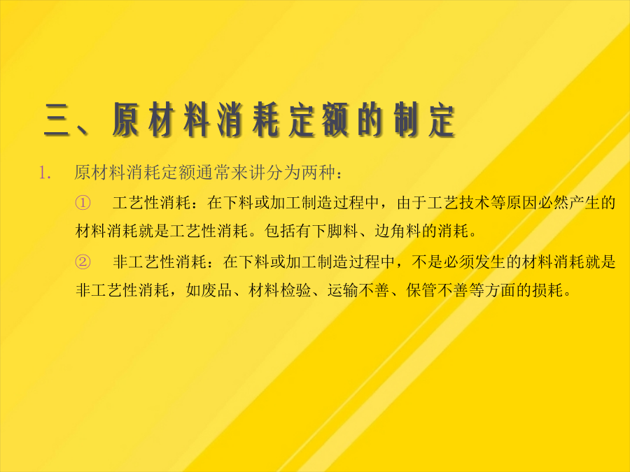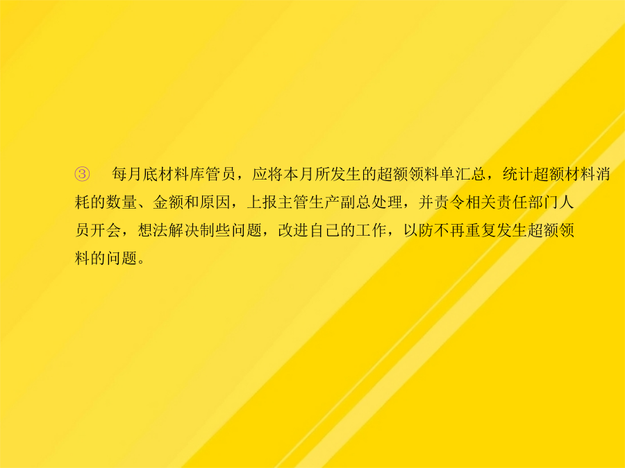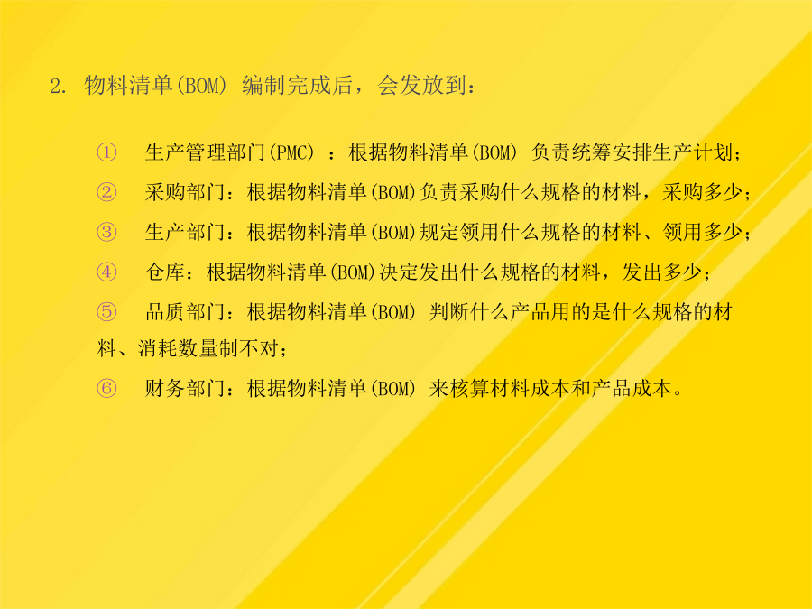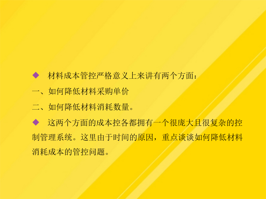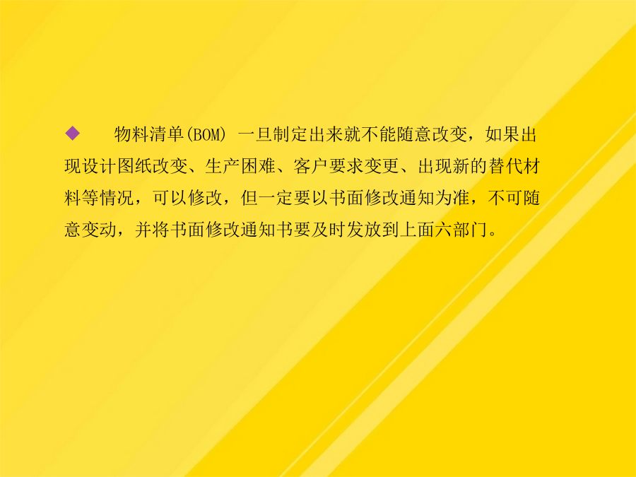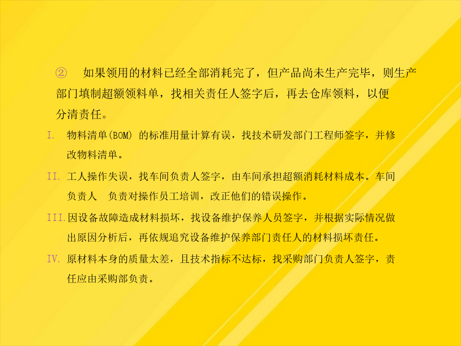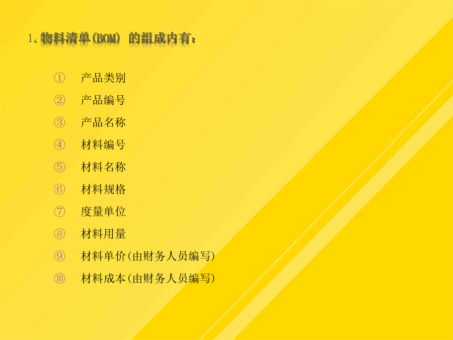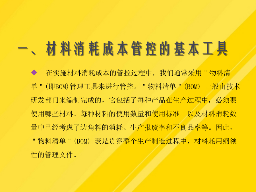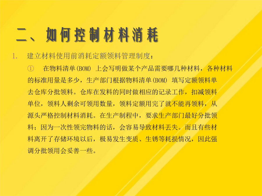 在前面的应聘述职报告中,本人谈到了任何一家企业,所应追求的终极目标都是"盈利"二字。而要追求"盈利"最关键、最有效的管理手段,就是应强化对生产成本管控,从而促进企业盈利的增长。但成本管控是件非常复杂的事情,它涉及到多部门的工作,且范围较广。在这里将重点谈谈本人在从事多年的生产运营管控之中,就如何实施材料成本控制几点思路和经验,与在座的各位领导及同仁们分享与交流,并请大家提出宝意见!材料成本管控严格意义上来讲有两个方面:一、如何降低材料采购单价二、如何降低材料消耗数量。这两个方面的成本控各都拥有一个很庞大且很复杂的控制管理系统。这里由于时间的原因,重点谈谈如何降低材料消耗成本的管控问题。一、材料消耗成本管控的基本工具1.物料清单(BOM)的组成内有:2.物料清单(BOM)编制完成后,会发放到:物料清单(BOM)一旦制定出来就不能随意改变,如果出现设计图纸改变、生产困难、客户要求变更、出现新的替代材料等情况,可以修改,但一定要以书面修改通知为准,不可随意变动,并将书面修改通知书要及时发放到上面六部门。二、如何控制材料消耗二、如何降低材料消耗数量。因为一次性领完物料的话,会容易导致材料丟失。供应商不要的话,低价卖给同行其他公司;简化产品设计,尽量釆用宜购和便宜材料。指材料质量是好的,但是生产用不上的闲置材料,不知道什么时候会再次用上;这两个方面的成本控各都拥有一个很庞大且很复杂的控制管理系统。生产制造中,一次领料不易太多,容易造成丢失、变质和生锈;因为一次性领完物料的话,会容易导致材料丟失。财务部门:财务部门是否要签字,要区分两种情况:工人操作失误,找车间负责人签字,由车间承担超额消耗材料成本。当呆滞材料出现以后,应成立呆滞料处理小组。通常来讲形成呆滞材料的原因有两种车间负责人负责对操作员工培训,改正他们的错误操作。简化产品设计,尽量釆用宜购和便宜材料。技术、生产人员通过研究发现有些材料缺料时,可以用别的材料代替使用。在物料清单(BOM)上会写明做某个产品需要哪几种材料,各种材料的标准用量是多少,生产部门根据物料清单(BOM)填写定额领料单去仓库分批领料。技术、生产人员通过研究发现有些材料缺料时,可以用别的材料代替使用。这里就辅料消耗定额的制定谈谈几点意见:每月底材料库管员,应将本月所发生的超额领料单汇总,统计超额材料消耗的数量、金额和原因,上报主管生产副总处理,并责令相关责任部门人员开会,想法解决制些问题,改进自己的工作,以防不再重复发生超额领料的问题。一、材料消耗成本管控的基本工具对于难以核算的辅料,通常一般按照生产部门所完成的生产产值比例来计算耗损定额。因为一次性领完物料的话,会容易导致材料丟失。因为不同的材料其生产用途是不一样的,而一个产品的售价决定了它能够忍受的成本是多少。财务部门:财务部门是否要签字,要区分两种情况:电镀、油漆、热处理等化工工艺可按产品的面积或重量计算。否则,材料消耗成本的控制不算到位。因设备故障造成材料损坏,找设备维护保养人员签字,并根据实际情况做出原因分析后,再依规追究设备维护保养部门责任人的材料损坏责任。但成本管控是件非常复杂的事情,它涉及到多部门的工作,且范围较广。这时,无论是代用材料需要去仓库领用,还是生产部门自己利用生产剩余的边角料,都要填写代用材料申请单,并将此书面材料送交以下部门签字:在前面的应聘述职报告中,本人谈到了任何一家企业,所应追求的终极目标都是"盈利"二字。生产制造中,一次领料不易太多,容易造成丢失、变质和生锈;使用的是代用材料:此时需要财务部的签字同意。对于难以核算的辅料,通常一般按照生产部门所完成的生产产值比例来计算耗损定额。定额数据确定的四种方法:材料成本(由财务人员编写)定额数据确定的四种方法:公式法:原材料消耗定额=单位零件净重/各种工艺性损耗;技术测算法:技术研发人员根据加工零件的形状、尺寸、材料类别,计算出它的重量,然后根据工艺指导书和工艺文件的规定,确定工艺定额。这种技术测算方法,适用于产量大,使用规格多的材料产品;统计分析法:技术研发人员根据同类产品半年或一年生产了多少数量,实际消耗了多少材料,加权平均一除即可。此方法适用于产品的材料消耗测算;经验估计法:技术研发人员、生产操作人员根据平时积累的经验,估计出一个消耗定额。四、辅料消耗定额的制定把与主要原材料结合使用的辅料,可按主要原材料消耗定额的比例来确定辅料消耗定额。与产品直接相关的辅料,可按产品单位数量、面积、重量、长度来确定辅料消耗定额。例:包装用木箱、纸箱、塑料袋等可按产品数量决定。电镀、油漆、热处理等化工工艺可按产品的面积或重量计算。比如㳶化液、润滑油、轴承、吊车用钢丝绳等可按多长时间更换一次。与使用期限有关的辅料,