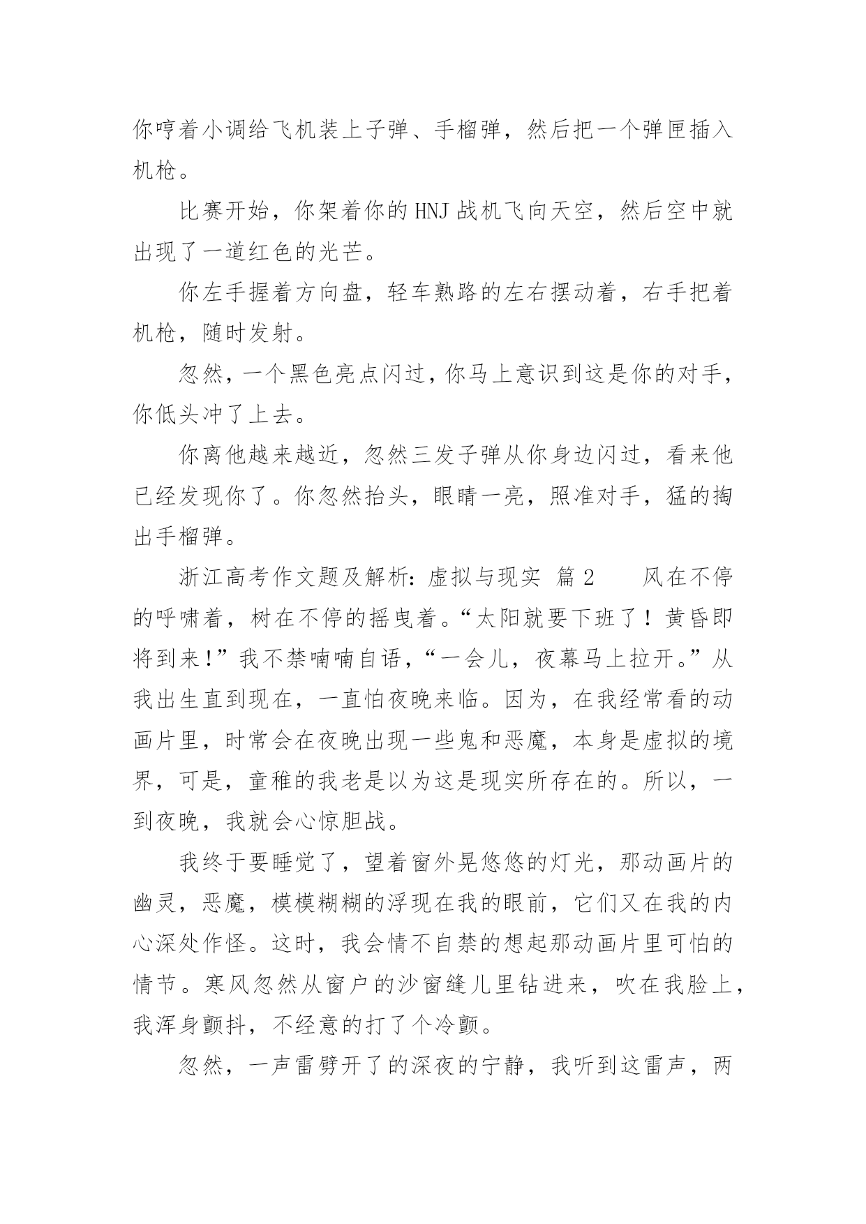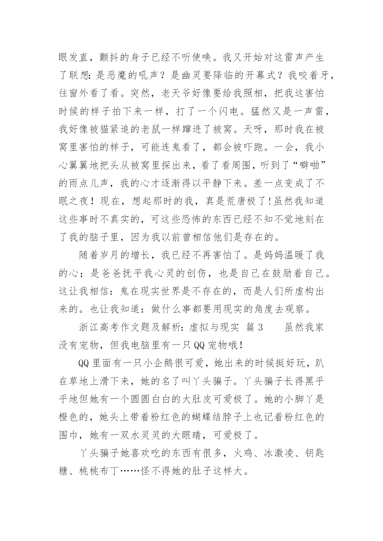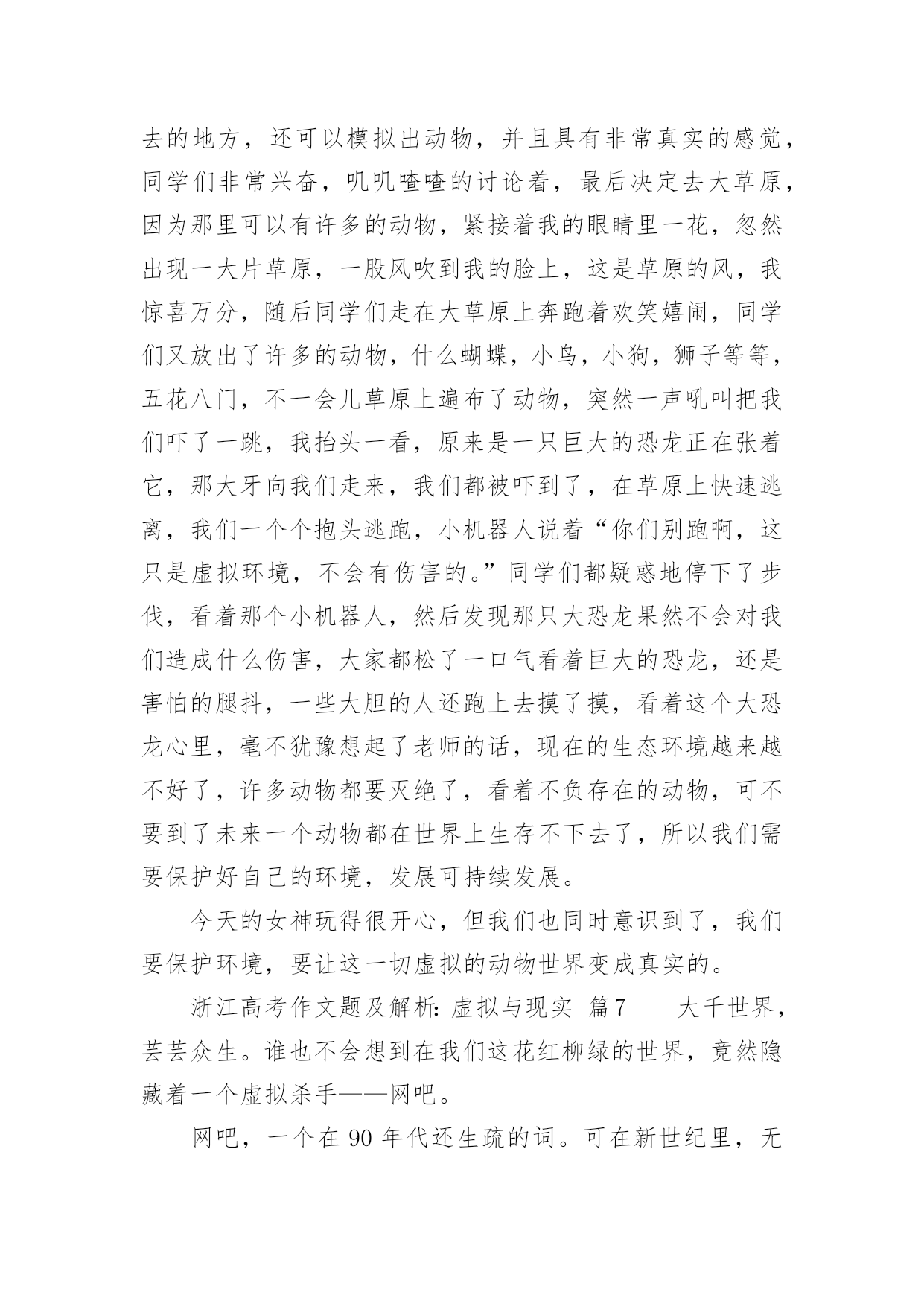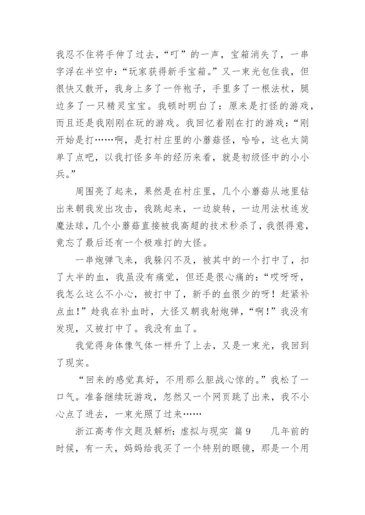 浙江高考作文题及解析:虚拟与现实浙江高考作文题及解析:虚拟与现实(通用36篇)在平日的学习、工作和生活里,大家都写过作文,肯定对各类作文都很熟悉吧,借助作文可以提高我们的语言组织能力。那么问题来了,到底应如何写一篇优秀的作文呢?以下是小编帮大家整理的浙江高考作文题及解析:虚拟与现实,仅供参考,大家一起来看看吧。浙江高考作文题及解析:虚拟与现实篇1你是你们“空中特种战队”A队中的绝对主力。部队以你为豪。你勇往直前,英勇杀敌,靠着飞机上不算多的子弹、手榴弹把敌人的老窝一次又一次无情的轰炸。敌人都畏惧你,说你是“空中魔鬼”。首领很器重你,你获得了部队的“最佳贡献奖”,还得了个一级勋章,而你平时缴获的战利品无数多个。又有战役了,你理所当然的担当了全队的核心人物。这次,你们的对手是D队。你们A队排行第一,他们就排行第二,他们的实力不容小视。全队上下都很紧张,包括你。其实他们本来水平不高,因为有一个神秘人物“XUF”的出现,让他们从倒数第一跃居第二。XUF平时打不过你,却总是从你手中逃脱。因为这个,你想干掉他的愿望更加强烈。赛前,你很认真的擦了一遍你的“HNJ”号战机,这架战机已经伴随你两年了,你和它有了感情。比赛前五分钟,你哼着小调给飞机装上子弹、手榴弹,然后把一个弹匣插入机枪。比赛开始,你架着你的HNJ战机飞向天空,然后空中就出现了一道红色的光芒。你左手握着方向盘,轻车熟路的左右摆动着,右手把着机枪,随时发射。忽然,一个黑色亮点闪过,你马上意识到这是你的对手,你低头冲了上去。你离他越来越近,忽然三发子弹从你身边闪过,看来他已经发现你了。你忽然抬头,眼睛一亮,照准对手,猛的掏出手榴弹。浙江高考作文题及解析:虚拟与现实篇2风在不停的呼啸着,树在不停的摇曳着。“太阳就要下班了!黄昏即将到来!”我不禁喃喃自语,“一会儿,夜幕马上拉开。”从我出生直到现在,一直怕夜晚来临。因为,在我经常看的动画片里,时常会在夜晚出现一些鬼和恶魔,本身是虚拟的境界,可是,童稚的我老是以为这是现实所存在的。所以,一到夜晚,我就会心惊胆战。我终于要睡觉了,望着窗外晃悠悠的灯光,那动画片的幽灵,恶魔,模模糊糊的浮现在我的眼前,它们又在我的内心深处作怪。这时,我会情不自禁的想起那动画片里可怕的情节。寒风忽然从窗户的沙窗缝儿里钻进来,吹在我脸上,我浑身颤抖,不经意的打了个冷颤。忽然,一声雷劈开了的深夜的宁静,我听到这雷声,两眼发直,颤抖的身子已经不听使唤。我又开始对这雷声产生了联想:是恶魔的吼声?是幽灵要降临的开幕式?我咬着牙,往窗外看了看。突然,老天爷好像要给我照相,把我这害怕时候的样子拍下来一样,打了一个闪电。猛然又是一声雷,我好像被猫紧追的老鼠一样蹿进了被窝。天呀,那时我在被窝里害怕的样子,可能连鬼看了,都会被吓跑。一会,我小心翼翼地把头从被窝里探出来,看了看周围,听到了“噼啪”的雨点儿声,我的心才逐渐得以平静下来。差一点变成了不眠之夜!现在,想起那时的我,真是荒唐极了!虽然我知道这些事时不真实的,可这些恐怖的东西已经不知不觉地刻在了我的脑子里,因为我以前曾相信他们是存在的。随着岁月的增长,我已经不再害怕了。是妈妈温暖了我的心;是爸爸抚平我心灵的创伤,也是自己在鼓励着自己。这让我相信:鬼在现实世界是不存在的,而是人们所虚构出来的。也让我知道:做什么事都要用现实的角度去观察。浙江高考作文题及解析:虚拟与现实篇3虽然我家没有宠物,但我电脑里有一只QQ宠物哦!QQ里面有一只小企鹅很可爱,她出来的时候挺好玩,趴在草地上滑下来,她的名了叫丫头骗子。丫头骗子长得黑乎乎地但她有一个圆圆白白的大肚皮可爱极了。她的小脚丫是橙色的,她头上带着粉红色的蝴蝶结脖子上也记着粉红色的围巾,她有一双水灵灵的大眼睛,可爱极了。丫头骗子她喜欢吃的东西有很多,火鸡、冰激凌、钥匙糖、桃桃布丁……怪不得她的肚子这样大。她很爱干净,我经常要帮她梳洗,一按沐浴她会拉一块布挡着洗澡,而且她头上还有喷水器。鼠标一下子不动,丫头骗子就装死了一样一动不动。我又动起鼠标她也又动起来了。有时候她很搞笑,我用鼠标把她抓起来,我看她是在游泳,可是妈妈说她是在跳舞,我看我自己她郁闷哦!她会弹吉他,不过是用扫把弹的。这就是我的虚拟宠物,可爱吗?浙江高考作文题及解析:虚拟与现实篇4我说老王啊,想当年你捧着把扇于站在马路边上一边摇扇子,一边吹喝肴“来看一看,礁一礁,走过路过不要错过啊,最新技术的美国进口西瓜啊,不甜不要钱啊。”那时候我想,您这牛皮还真不是吹的啊,自家后院里胡乱种的两三个西瓜变成了美国进口的高科技西瓜。可是鱿凭您那刹戴肴个大草擂,穿着件汉衫,拿着把破扇子的样子,卖的却是进口西瓜。鬼才信您呢?吹牛也要吹得有点敬业精神啊。您礁,这不电视里放的“脑枉松”的广告。呵.人家会司请的足电影明星何家劲,穿得是又帅又潇洒。往那一站,