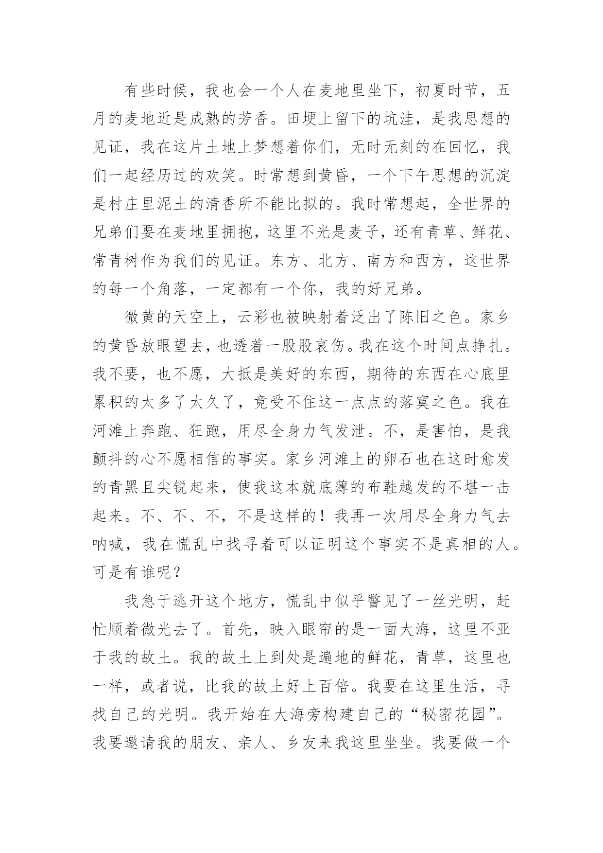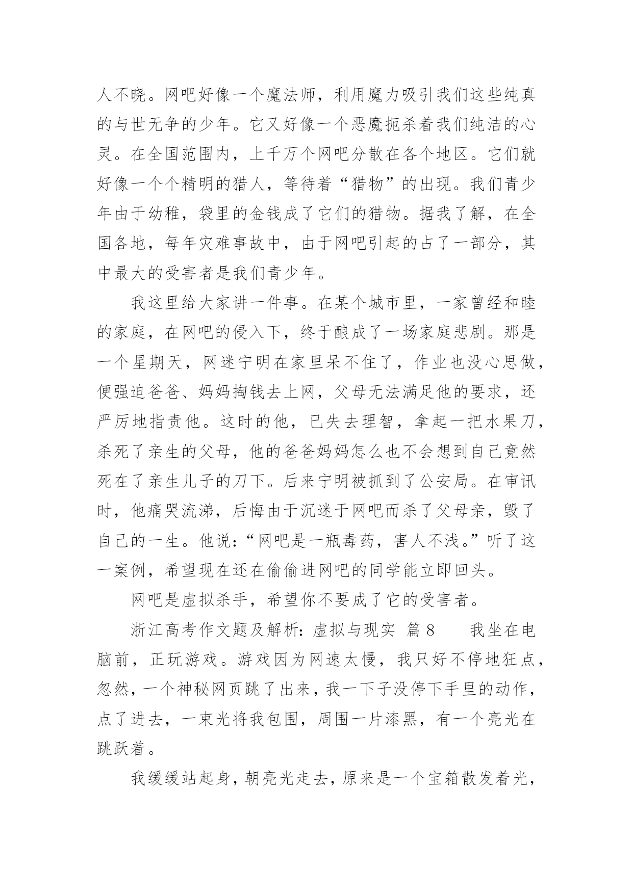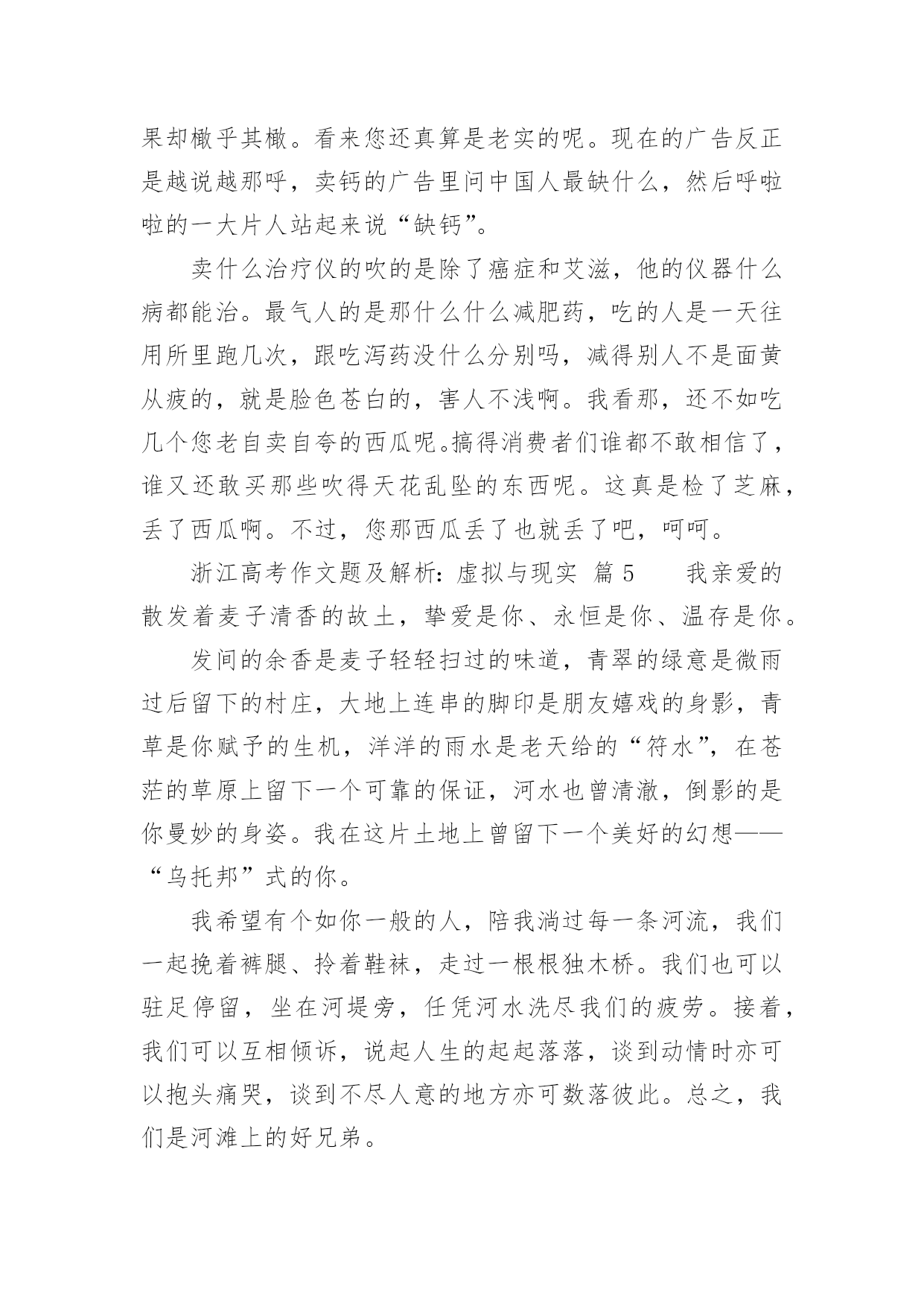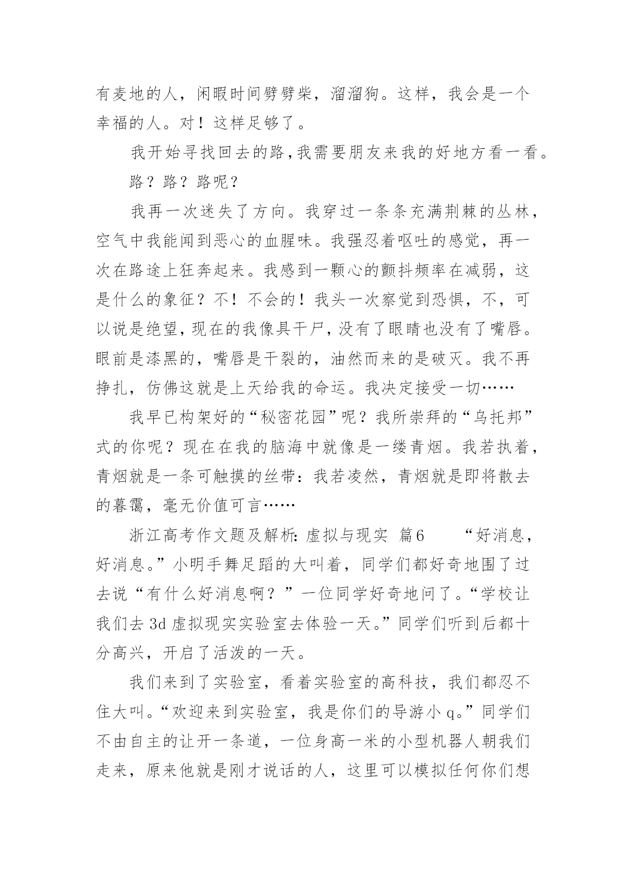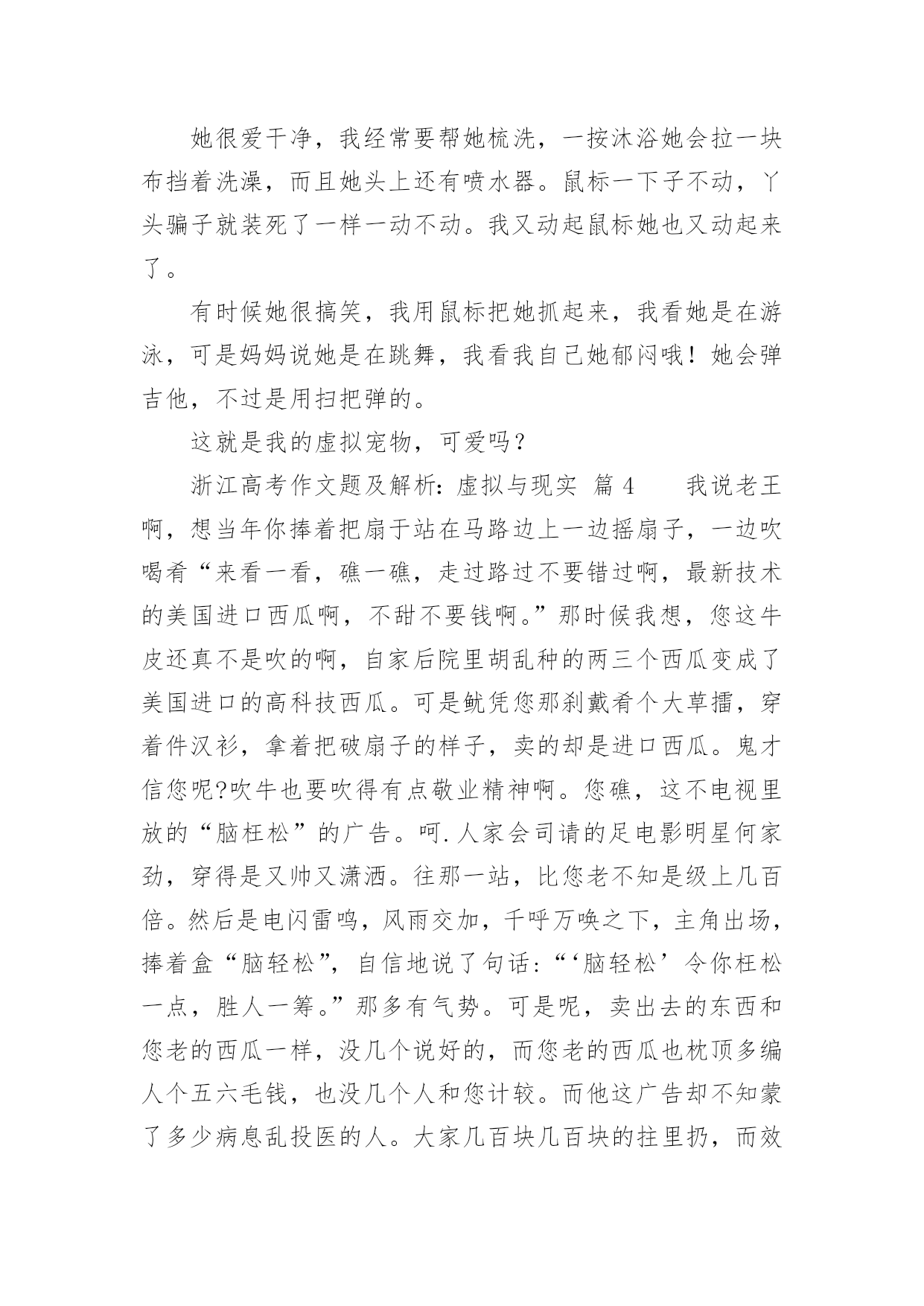 浙江高考作文题及解析:虚拟与现实浙江高考作文题及解析:虚拟与现实(通用36篇)在平日的学习、工作和生活里,大家都写过作文,肯定对各类作文都很熟悉吧,借助作文可以提高我们的语言组织能力。那么问题来了,到底应如何写一篇优秀的作文呢?以下是小编帮大家整理的浙江高考作文题及解析:虚拟与现实,仅供参考,大家一起来看看吧。浙江高考作文题及解析:虚拟与现实篇1你是你们“空中特种战队”A队中的绝对主力。部队以你为豪。你勇往直前,英勇杀敌,靠着飞机上不算多的子弹、手榴弹把敌人的老窝一次又一次无情的轰炸。敌人都畏惧你,说你是“空中魔鬼”。首领很器重你,你获得了部队的“最佳贡献奖”,还得了个一级勋章,而你平时缴获的战利品无数多个。又有战役了,你理所当然的担当了全队的核心人物。这次,你们的对手是D队。你们A队排行第一,他们就排行第二,他们的实力不容小视。全队上下都很紧张,包括你。其实他们本来水平不高,因为有一个神秘人物“XUF”的出现,让他们从倒数第一跃居第二。XUF平时打不过你,却总是从你手中逃脱。因为这个,你想干掉他的愿望更加强烈。赛前,你很认真的擦了一遍你的“HNJ”号战机,这架战机已经伴随你两年了,你和它有了感情。比赛前五分钟,你哼着小调给飞机装上子弹、手榴弹,然后把一个弹匣插入机枪。比赛开始,你架着你的HNJ战机飞向天空,然后空中就出现了一道红色的光芒。你左手握着方向盘,轻车熟路的左右摆动着,右手把着机枪,随时发射。忽然,一个黑色亮点闪过,你马上意识到这是你的对手,你低头冲了上去。你离他越来越近,忽然三发子弹从你身边闪过,看来他已经发现你了。你忽然抬头,眼睛一亮,照准对手,猛的掏出手榴弹。浙江高考作文题及解析:虚拟与现实篇2风在不停的呼啸着,树在不停的摇曳着。“太阳就要下班了!黄昏即将到来!”我不禁喃喃自语,“一会儿,夜幕马上拉开。”从我出生直到现在,一直怕夜晚来临。因为,在我经常看的动画片里,时常会在夜晚出现一些鬼和恶魔,本身是虚拟的境界,可是,童稚的我老是以为这是现实所存在的。所以,一到夜晚,我就会心惊胆战。我终于要睡觉了,望着窗外晃悠悠的灯光,那动画片的幽灵,恶魔,模模糊糊的浮现在我的眼前,它们又在我的内心深处作怪。这时,我会情不自禁的想起那动画片里可怕的情节。寒风忽然从窗户的沙窗缝儿里钻进来,吹在我脸上,我浑身颤抖,不经意的打了个冷颤。忽然,一声雷劈开了的深夜的宁静,我听到这雷声,两眼发直,颤抖的身子已经不听使唤。我又开始对这雷声产生了联想:是恶魔的吼声?是幽灵要降临的开幕式?我咬着牙,往窗外看了看。突然,老天爷好像要给我照相,把我这害怕时候的样子拍下来一样,打了一个闪电。猛然又是一声雷,我好像被猫紧追的老鼠一样蹿进了被窝。天呀,那时我在被窝里害怕的样子,可能连鬼看了,都会被吓跑。一会,我小心翼翼地把头从被窝里探出来,看了看周围,听到了“噼啪”的雨点儿声,我的心才逐渐得以平静下来。差一点变成了不眠之夜!现在,想起那时的我,真是荒唐极了!虽然我知道这些事时不真实的,可这些恐怖的东西已经不知不觉地刻在了我的脑子里,因为我以前曾相信他们是存在的。随着岁月的增长,我已经不再害怕了。是妈妈温暖了我的心;是爸爸抚平我心灵的创伤,也是自己在鼓励着自己。这让我相信:鬼在现实世界是不存在的,而是人们所虚构出来的。也让我知道:做什么事都要用现实的角度去观察。浙江高考作文题及解析:虚拟与现实篇3虽然我家没有宠物,但我电脑里有一只QQ宠物哦!QQ里面有一只小企鹅很可爱,她出来的时候挺好玩,趴在草地上滑下来,她的名了叫丫头骗子。丫头骗子长得黑乎乎地但她有一个圆圆白白的大肚皮可爱极了。她的小脚丫是橙色的,她头上带着粉红色的蝴蝶结脖子上也记着粉红色的围巾,她有一双水灵灵的大眼睛,可爱极了。丫头骗子她喜欢吃的东西有很多,火鸡、冰激凌、钥匙糖、桃桃布丁……怪不得她的肚子这样大。她很爱干净,我经常要帮她梳洗,一按沐浴她会拉一块布挡着洗澡,而且她头上还有喷水器。鼠标一下子不动,丫头骗子就装死了一样一动不动。我又动起鼠标她也又动起来了。有时候她很搞笑,我用鼠标把她抓起来,我看她是在游泳,可是妈妈说她是在跳舞,我看我自己她郁闷哦!她会弹吉他,不过是用扫把弹的。这就是我的虚拟宠物,可爱吗?浙江高考作文题及解析:虚拟与现实篇4我说老王啊,想当年你捧着把扇于站在马路边上一边摇扇子,一边吹喝肴“来看一看,礁一礁,走过路过不要错过啊,最新技术的美国进口西瓜啊,不甜不要钱啊。”那时候我想,您这牛皮还真不是吹的啊,自家后院里胡乱种的两三个西瓜变成了美国进口的高科技西瓜。可是鱿凭您那刹戴肴个大草擂,穿着件汉衫,拿着把破扇子的样子,卖的却是进口西瓜。鬼才信您呢?吹牛也要吹得有点敬业精神啊。您礁,这不电视里放的“脑枉松”的广告。呵.人家会司请的足电影明星何家劲,穿得是又帅又潇洒。往那一站,