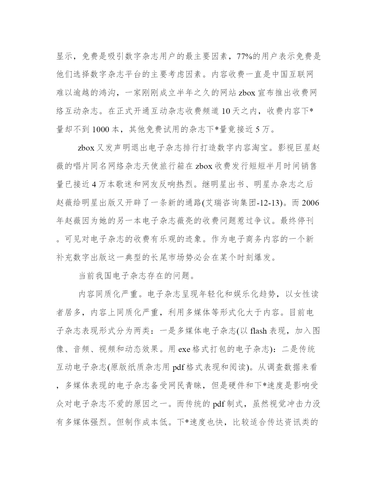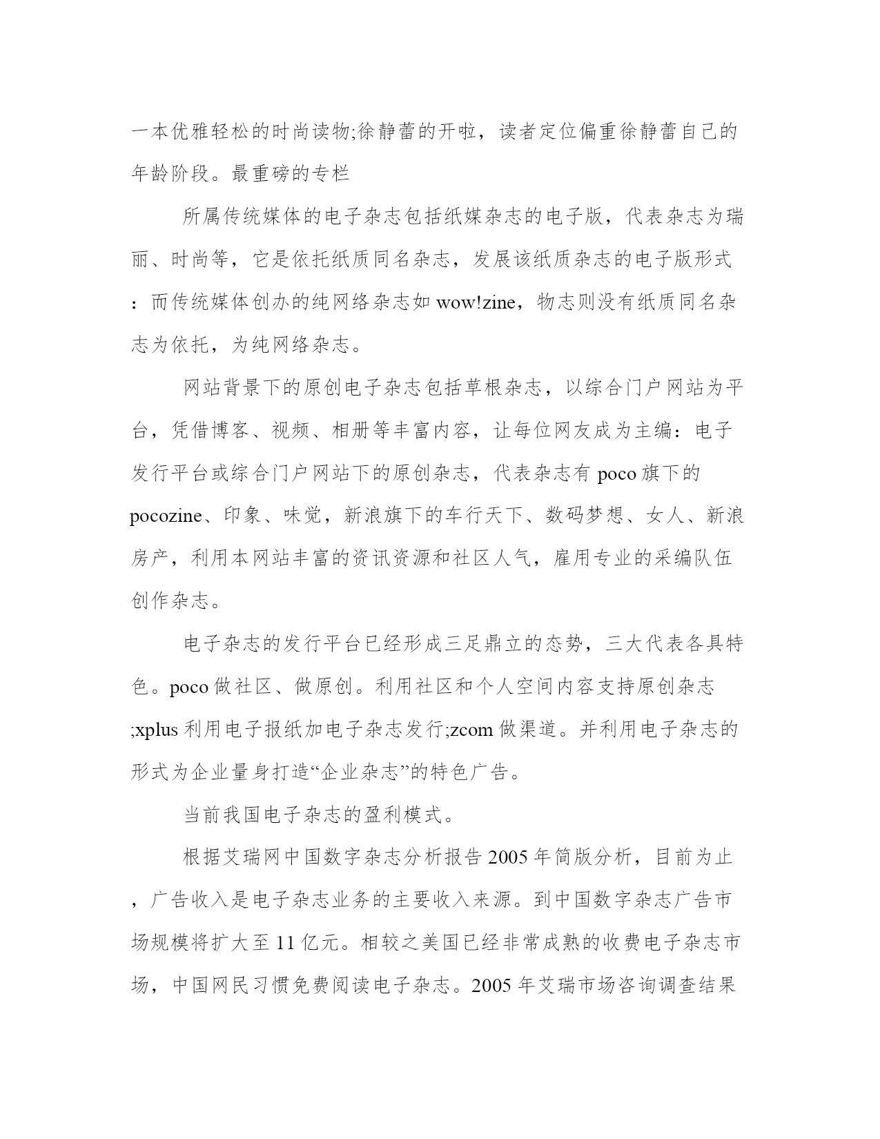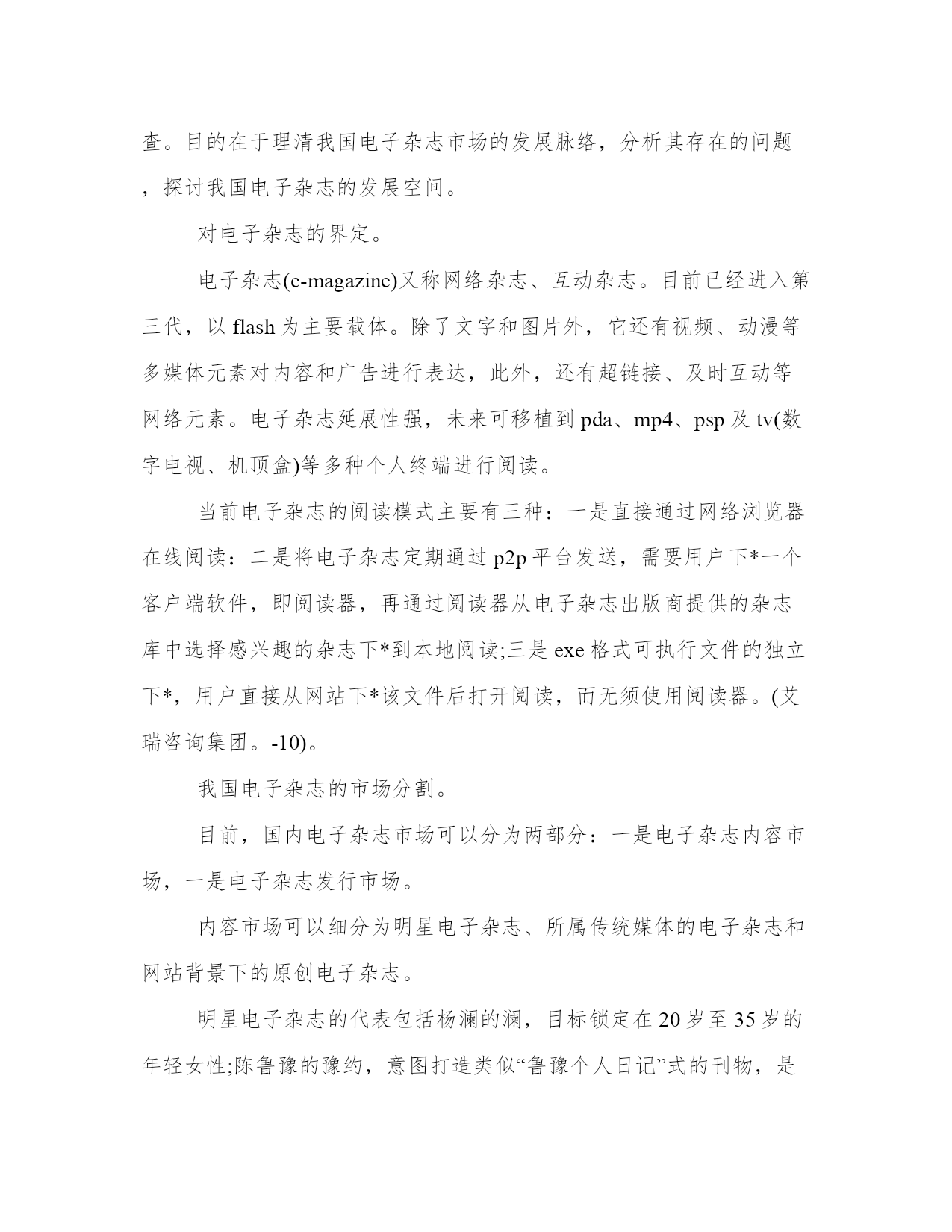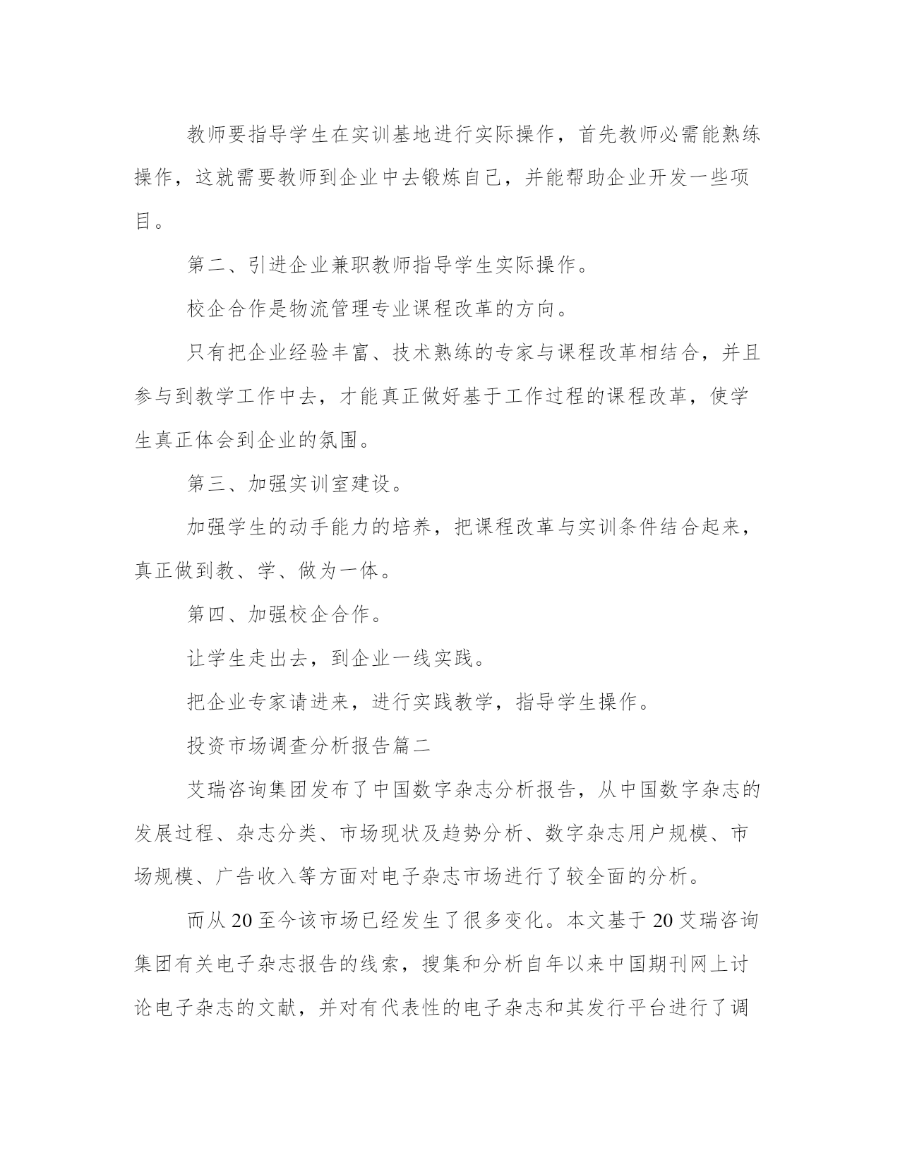 投资市场调查分析报告(优质15篇)在工作中,我们常常需要撰写报告来向领导或团队汇报工作进展和成果。最后,向相关人员提交报告,并及时回答他们可能有的问题。通过阅读这些报告范文,我们可以了解到报告写作的一些常见问题和解决方法。投资市场调查分析报告篇一基于以上资料和分析,对我系物流管理专业今后学生培养、专业课程、实训课程设置提出以下建议。一、学生培养方面。1、加大实践教学投入,建立“双师”型教学队伍,进行课程改革。实践教学是高职教育教学中的主要环节和特色部分,构建一套适应高职教育教学的实践教学体系,不仅可以保证实践教学的有效实施,更是促进高职教育持续发展和体现高职教育特色的关键。实践教学内容以提高学生从业能力为依据,通过哪些实践教学内容和活动来培养从业能力,需要对专业课程改革,建立起校企合作,工学结合,教、学、做为一体的专业课程。第一、建立一支具有现代教育理念和创新精神、教学能力强、熟悉生产领域、掌握过硬技术、乐于教书育人的高素质双师型师资队伍。第二、加强校内外实践教学基地建设,通过学校投入和校企共建等途径,不断改善校内外实习条件,大力整合现有资源,优化管理,扎扎实实地建设好专业的实验室、实训室、实训工厂等。第三、进行课程改革,改变教师讲学生听为学生在教师的指导下动手操作。使教、学、做为一体,培养学生的关键能力。2、加强对学生语言表达能力、沟通能力、协调能力、抗挫折能力的培养。第一,明确学生的语言表达能力、沟通能力、协调能力、抗挫折能力是现代大学生应具备的最基本能力,学生的这些能力是让用人单位短时间认可的先决条件,应引起院领导和教师的高度重视。第二,对学生“心理适应能力弱,处理问题能力差,不会表达,不知怎么与人打交道,不爱动手,与社会要求距离较大”等问题采取得力措施,在课程改革过程中,把语言表达能力、沟通能力、协调能力、抗挫折能力作为一项重要的教学内容,把每个学生培养成综合素质高的优秀人才。3、加强对教师的培训,提高教师的专业技能。教师理论水平和实践技能高,是培养高素质、高技能实用人才的先决条件。那么,怎样才能提高教师素质呢?第一、教师到企业去锻炼。教师要指导学生在实训基地进行实际操作,首先教师必需能熟练操作,这就需要教师到企业中去锻炼自己,并能帮助企业开发一些项目。第二、引进企业兼职教师指导学生实际操作。校企合作是物流管理专业课程改革的方向。只有把企业经验丰富、技术熟练的专家与课程改革相结合,并且参与到教学工作中去,才能真正做好基于工作过程的课程改革,使学生真正体会到企业的氛围。第三、加强实训室建设。加强学生的动手能力的培养,把课程改革与实训条件结合起来,真正做到教、学、做为一体。第四、加强校企合作。让学生走出去,到企业一线实践。把企业专家请进来,进行实践教学,指导学生操作。投资市场调查分析报告篇二艾瑞咨询集团发布了中国数字杂志分析报告,从中国数字杂志的发展过程、杂志分类、市场现状及趋势分析、数字杂志用户规模、市场规模、广告收入等方面对电子杂志市场进行了较全面的分析。而从20至今该市场已经发生了很多变化。本文基于20艾瑞咨询集团有关电子杂志报告的线索,搜集和分析自年以来中国期刊网上讨论电子杂志的文献,并对有代表性的电子杂志和其发行平台进行了调查。目的在于理清我国电子杂志市场的发展脉络,分析其存在的问题,探讨我国电子杂志的发展空间。对电子杂志的界定。电子杂志(e-magazine)又称网络杂志、互动杂志。目前已经进入第三代,以flash为主要载体。除了文字和图片外,它还有视频、动漫等多媒体元素对内容和广告进行表达,此外,还有超链接、及时互动等网络元素。电子杂志延展性强,未来可移植到pda、mp4、psp及tv(数字电视、机顶盒)等多种个人终端进行阅读。当前电子杂志的阅读模式主要有三种:一是直接通过网络浏览器在线阅读:二是将电子杂志定期通过p2p平台发送,需要用户下*一个客户端软件,即阅读器,再通过阅读器从电子杂志出版商提供的杂志库中选择感兴趣的杂志下*到本地阅读;三是exe格式可执行文件的独立下*,用户直接从网站下*该文件后打开阅读,而无须使用阅读器。(艾瑞咨询集团。-10)。我国电子杂志的市场分割。目前,国内电子杂志市场可以分为两部分:一是电子杂志内容市场,一是电子杂志发行市场。内容市场可以细分为明星电子杂志、所属传统媒体的电子杂志和网站背景下的原创电子杂志。明星电子杂志的代表包括杨澜的澜,目标锁定在20岁至35岁的年轻女性;陈鲁豫的豫约,意图打造类似“鲁豫个人日记”式的刊物,是一本优雅轻松的时尚读物;徐静蕾的开啦,读者定位偏重徐静蕾自己的年龄阶段。最重磅的专栏所属传统媒体的电子杂志包括纸媒杂志的电子版,代表杂志为瑞丽、时尚等,它是依托纸质同名杂志,发展