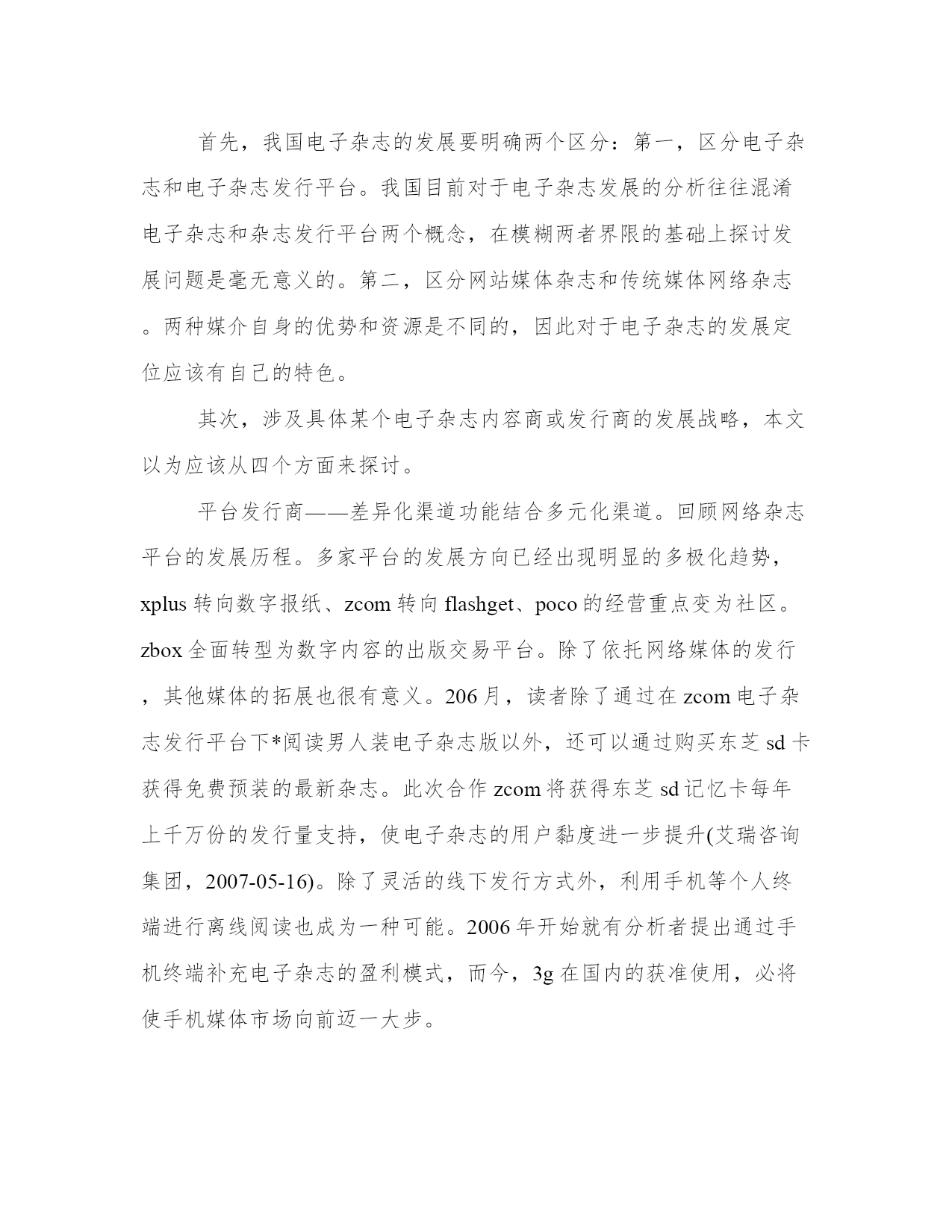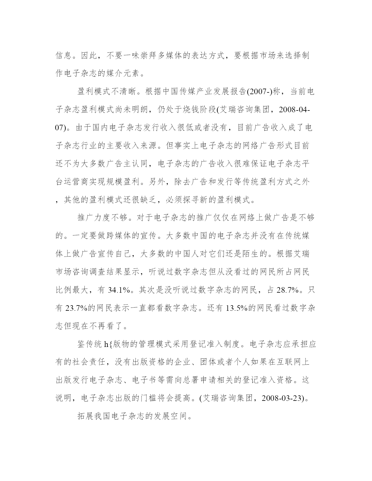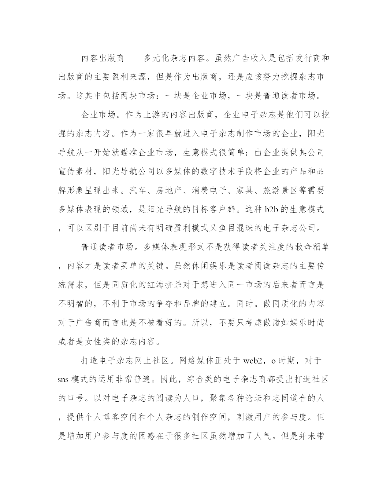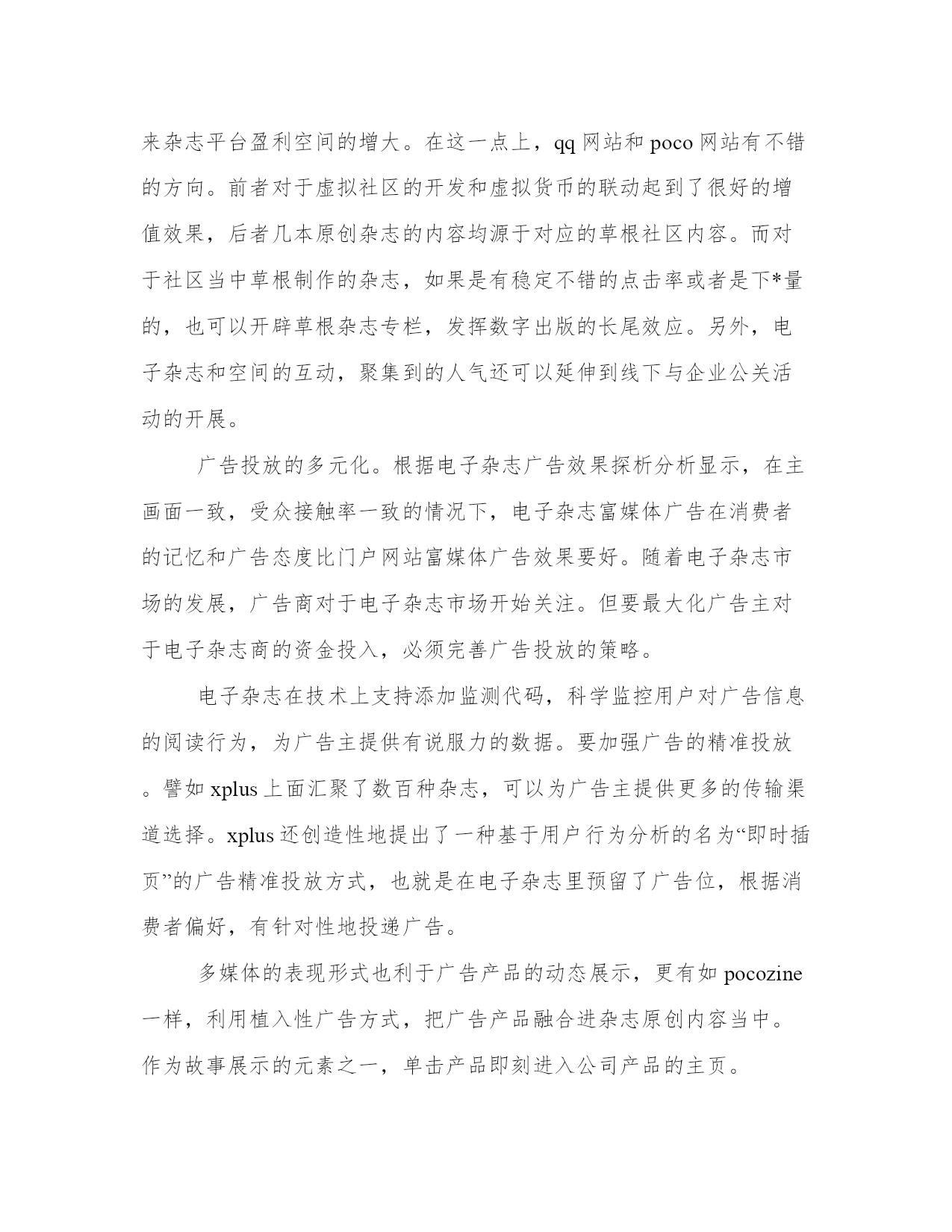 投资市场调查分析报告(优质15篇)在工作中,我们常常需要撰写报告来向领导或团队汇报工作进展和成果。最后,向相关人员提交报告,并及时回答他们可能有的问题。通过阅读这些报告范文,我们可以了解到报告写作的一些常见问题和解决方法。投资市场调查分析报告篇一基于以上资料和分析,对我系物流管理专业今后学生培养、专业课程、实训课程设置提出以下建议。一、学生培养方面。1、加大实践教学投入,建立“双师”型教学队伍,进行课程改革。实践教学是高职教育教学中的主要环节和特色部分,构建一套适应高职教育教学的实践教学体系,不仅可以保证实践教学的有效实施,更是促进高职教育持续发展和体现高职教育特色的关键。实践教学内容以提高学生从业能力为依据,通过哪些实践教学内容和活动来培养从业能力,需要对专业课程改革,建立起校企合作,工学结合,教、学、做为一体的专业课程。第一、建立一支具有现代教育理念和创新精神、教学能力强、熟悉生产领域、掌握过硬技术、乐于教书育人的高素质双师型师资队伍。第二、加强校内外实践教学基地建设,通过学校投入和校企共建等途径,不断改善校内外实习条件,大力整合现有资源,优化管理,扎扎实实地建设好专业的实验室、实训室、实训工厂等。第三、进行课程改革,改变教师讲学生听为学生在教师的指导下动手操作。使教、学、做为一体,培养学生的关键能力。2、加强对学生语言表达能力、沟通能力、协调能力、抗挫折能力的培养。第一,明确学生的语言表达能力、沟通能力、协调能力、抗挫折能力是现代大学生应具备的最基本能力,学生的这些能力是让用人单位短时间认可的先决条件,应引起院领导和教师的高度重视。第二,对学生“心理适应能力弱,处理问题能力差,不会表达,不知怎么与人打交道,不爱动手,与社会要求距离较大”等问题采取得力措施,在课程改革过程中,把语言表达能力、沟通能力、协调能力、抗挫折能力作为一项重要的教学内容,把每个学生培养成综合素质高的优秀人才。3、加强对教师的培训,提高教师的专业技能。教师理论水平和实践技能高,是培养高素质、高技能实用人才的先决条件。那么,怎样才能提高教师素质呢?第一、教师到企业去锻炼。教师要指导学生在实训基地进行实际操作,首先教师必需能熟练操作,这就需要教师到企业中去锻炼自己,并能帮助企业开发一些项目。第二、引进企业兼职教师指导学生实际操作。校企合作是物流管理专业课程改革的方向。只有把企业经验丰富、技术熟练的专家与课程改革相结合,并且参与到教学工作中去,才能真正做好基于工作过程的课程改革,使学生真正体会到企业的氛围。第三、加强实训室建设。加强学生的动手能力的培养,把课程改革与实训条件结合起来,真正做到教、学、做为一体。第四、加强校企合作。让学生走出去,到企业一线实践。把企业专家请进来,进行实践教学,指导学生操作。投资市场调查分析报告篇二艾瑞咨询集团发布了中国数字杂志分析报告,从中国数字杂志的发展过程、杂志分类、市场现状及趋势分析、数字杂志用户规模、市场规模、广告收入等方面对电子杂志市场进行了较全面的分析。而从20至今该市场已经发生了很多变化。本文基于20艾瑞咨询集团有关电子杂志报告的线索,搜集和分析自年以来中国期刊网上讨论电子杂志的文献,并对有代表性的电子杂志和其发行平台进行了调查。目的在于理清我国电子杂志市场的发展脉络,分析其存在的问题,探讨我国电子杂志的发展空间。对电子杂志的界定。电子杂志(e-magazine)又称网络杂志、互动杂志。目前已经进入第三代,以flash为主要载体。除了文字和图片外,它还有视频、动漫等多媒体元素对内容和广告进行表达,此外,还有超链接、及时互动等网络元素。电子杂志延展性强,未来可移植到pda、mp4、psp及tv(数字电视、机顶盒)等多种个人终端进行阅读。当前电子杂志的阅读模式主要有三种:一是直接通过网络浏览器在线阅读:二是将电子杂志定期通过p2p平台发送,需要用户下*一个客户端软件,即阅读器,再通过阅读器从电子杂志出版商提供的杂志库中选择感兴趣的杂志下*到本地阅读;三是exe格式可执行文件的独立下*,用户直接从网站下*该文件后打开阅读,而无须使用阅读器。(艾瑞咨询集团。-10)。我国电子杂志的市场分割。目前,国内电子杂志市场可以分为两部分:一是电子杂志内容市场,一是电子杂志发行市场。内容市场可以细分为明星电子杂志、所属传统媒体的电子杂志和网站背景下的原创电子杂志。明星电子杂志的代表包括杨澜的澜,目标锁定在20岁至35岁的年轻女性;陈鲁豫的豫约,意图打造类似“鲁豫个人日记”式的刊物,是一本优雅轻松的时尚读物;徐静蕾的开啦,读者定位偏重徐静蕾自己的年龄阶段。最重磅的专栏所属传统媒体的电子杂志包括纸媒杂志的电子版,代表杂志为瑞丽、时尚等,它是依托纸质同名杂志,发展