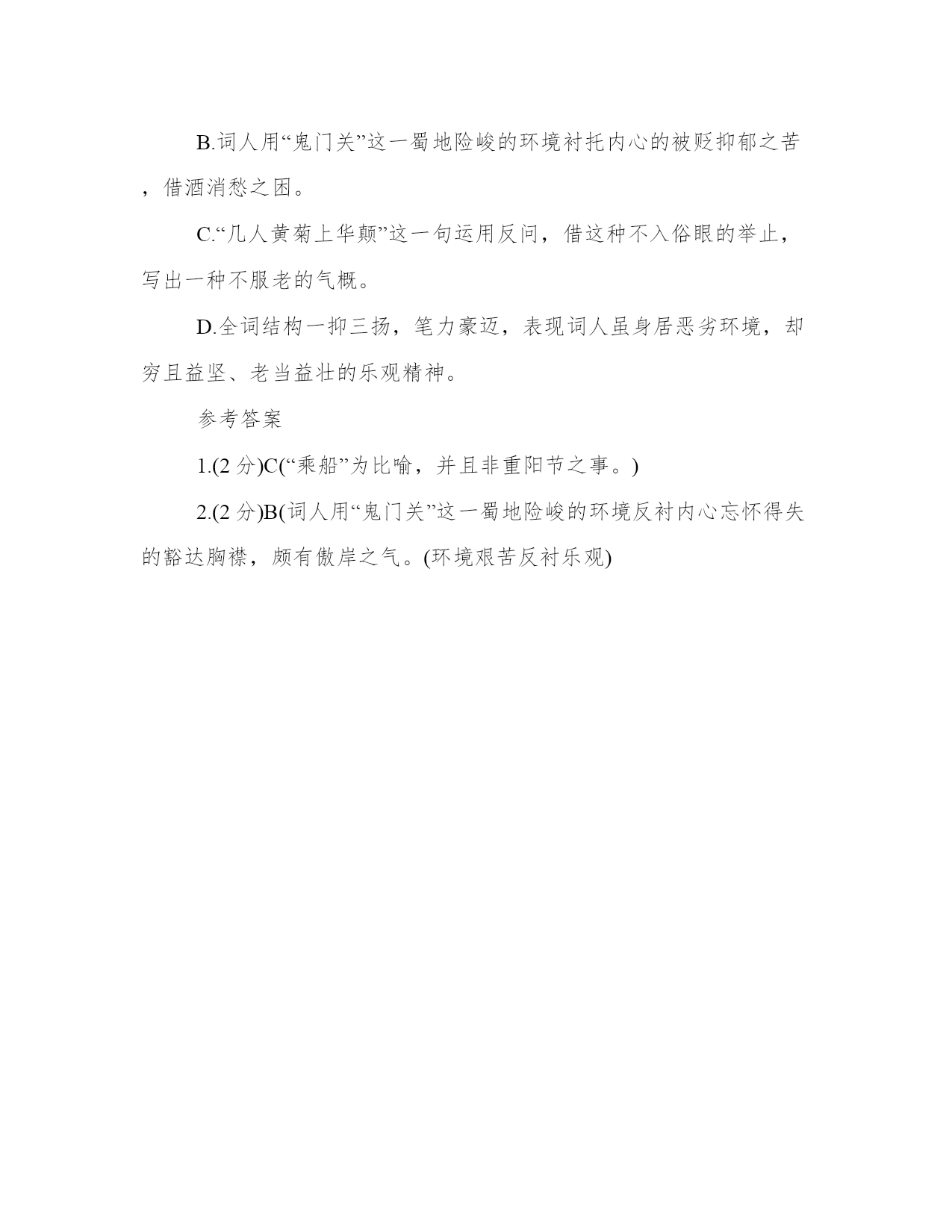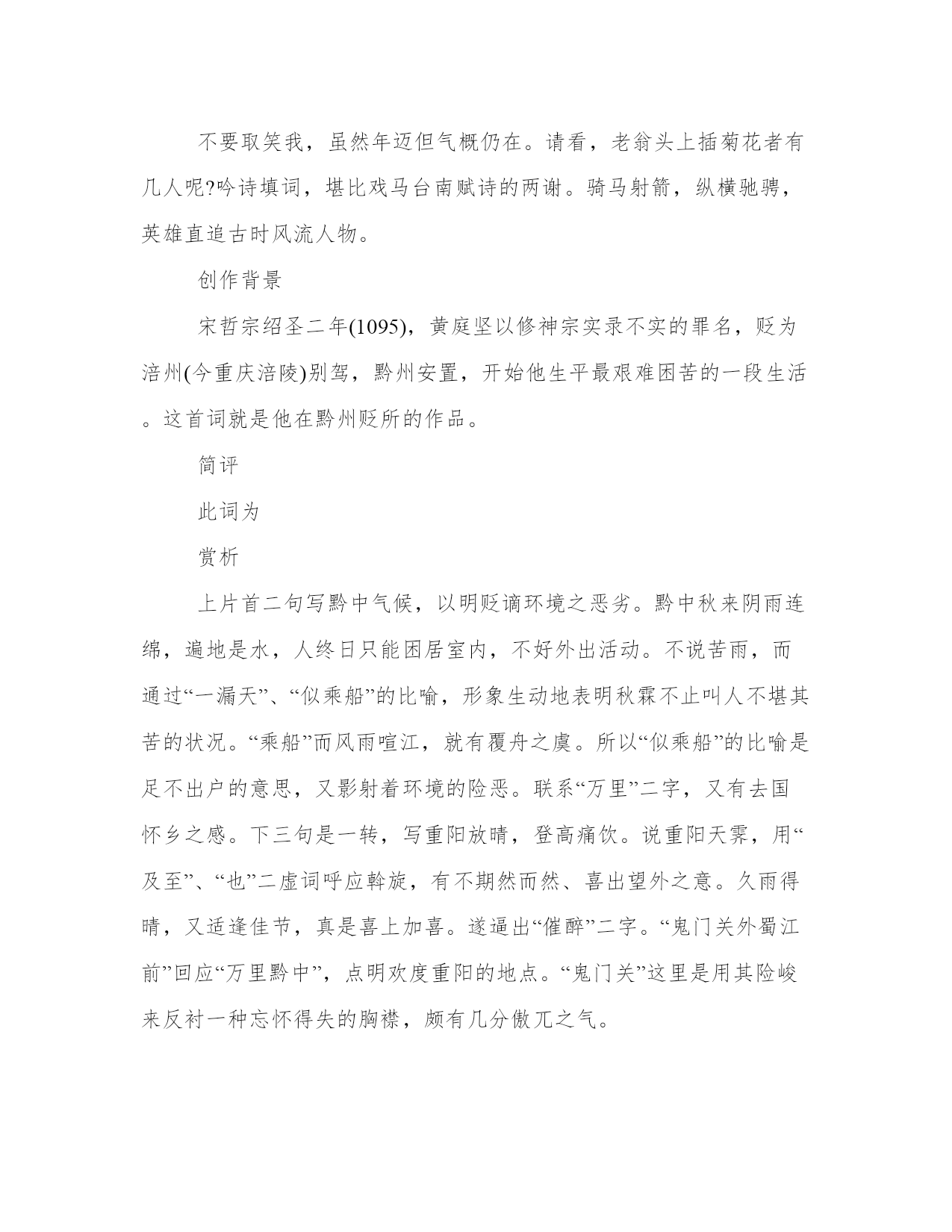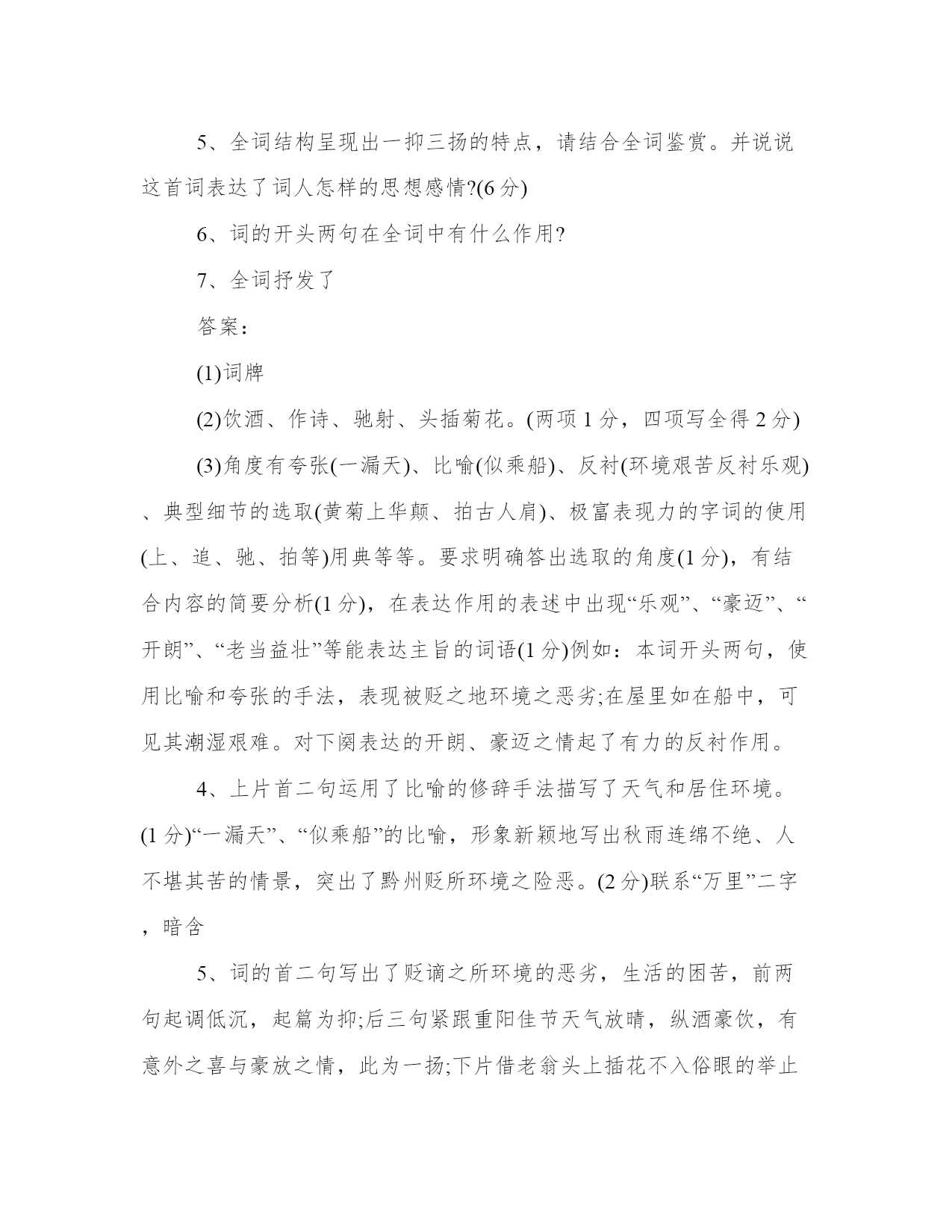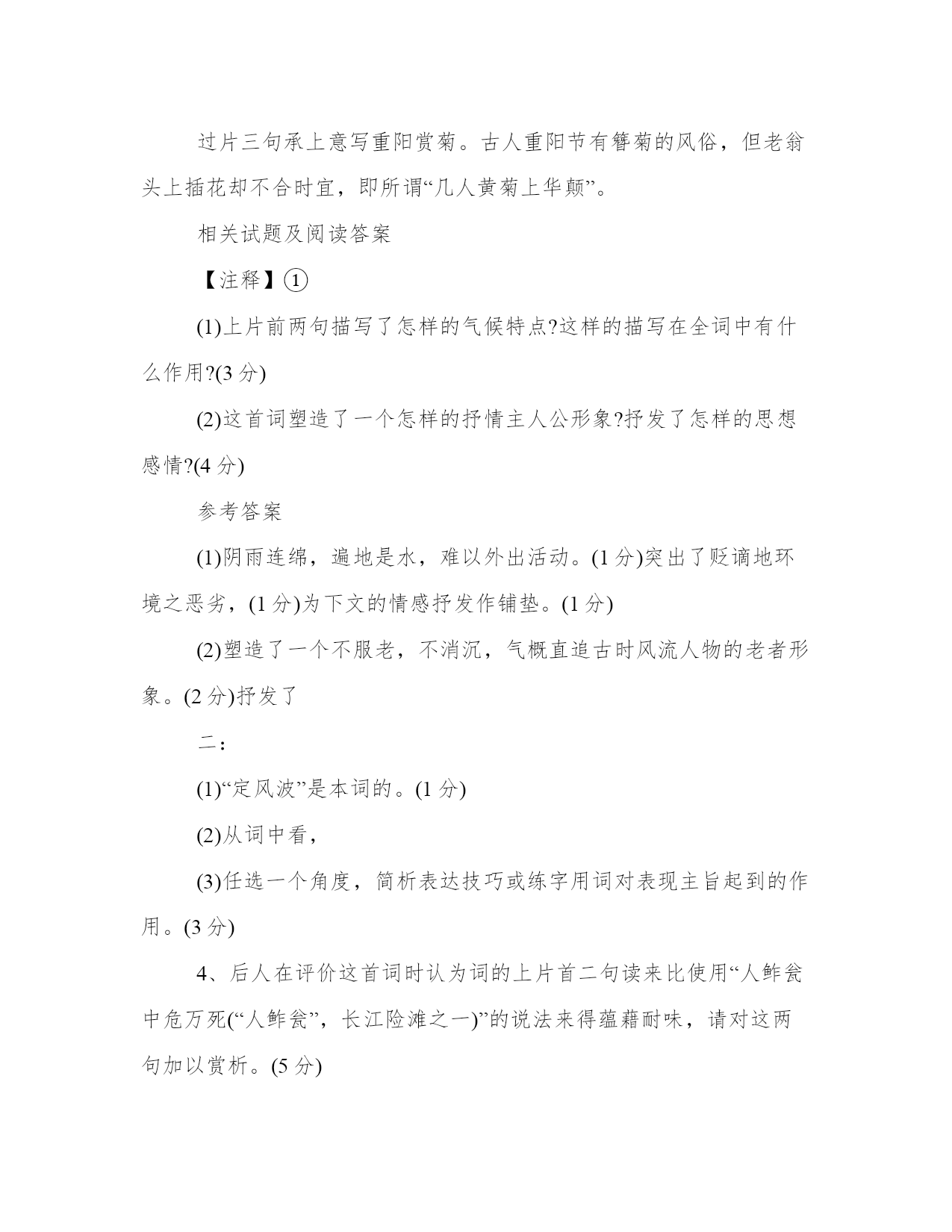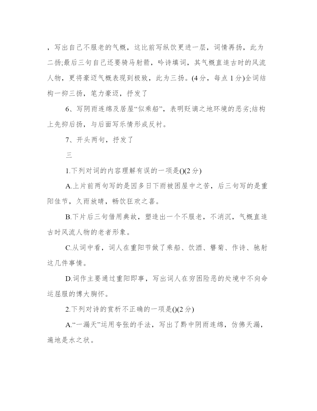 2024年定风波黄庭坚工作报告风波⑴·次高左藏使君韵万里黔中一漏天⑵,屋居终日似乘船。及至重阳天也霁⑶,催醉,鬼门关外蜀江前⑷。莫笑老翁犹气岸⑸,君看,几人黄菊上华颠⑹?戏马台南追两谢⑺,驰射,风流犹拍古人肩。注释⑴定风波:词牌名。⑵黔中:即黔州(今四川彭水)。漏天:指阴雨连绵。⑶霁:雨雪之止也。⑷鬼门关:即石门关,今重庆市奉节县东,两山相夹如蜀门户。⑸气岸:气度傲岸。⑹华颠:白头。⑺戏马台:一名掠马台,项羽所筑,今江苏徐州城南。晋安帝义熙十二年,刘裕北征,九月九日会僚属于此,赋诗为乐,谢瞻和谢灵运各赋九日从宋公戏马台集送孔令一首。两谢:即谢瞻和谢灵运。参考译文黔中阴雨连绵,仿佛天漏,遍地都是水,终日被困家中,犹如待在一艘破船上。久雨放晴,又逢重阳佳节,在蜀江之畔,畅饮狂欢。不要取笑我,虽然年迈但气概仍在。请看,老翁头上插菊花者有几人呢?吟诗填词,堪比戏马台南赋诗的两谢。骑马射箭,纵横驰骋,英雄直追古时风流人物。创作背景宋哲宗绍圣二年(1095),黄庭坚以修神宗实录不实的罪名,贬为涪州(今重庆涪陵)别驾,黔州安置,开始他生平最艰难困苦的一段生活。这首词就是他在黔州贬所的作品。简评此词为赏析上片首二句写黔中气候,以明贬谪环境之恶劣。黔中秋来阴雨连绵,遍地是水,人终日只能困居室内,不好外出活动。不说苦雨,而通过“一漏天”、“似乘船”的比喻,形象生动地表明秋霖不止叫人不堪其苦的状况。“乘船”而风雨喧江,就有覆舟之虞。所以“似乘船”的比喻是足不出户的意思,又影射着环境的险恶。联系“万里”二字,又有去国怀乡之感。下三句是一转,写重阳放晴,登高痛饮。说重阳天霁,用“及至”、“也”二虚词呼应斡旋,有不期然而然、喜出望外之意。久雨得晴,又适逢佳节,真是喜上加喜。遂逼出“催醉”二字。“鬼门关外蜀江前”回应“万里黔中”,点明欢度重阳的地点。“鬼门关”这里是用其险峻来反衬一种忘怀得失的胸襟,颇有几分傲兀之气。过片三句承上意写重阳赏菊。古人重阳节有簪菊的风俗,但老翁头上插花却不合时宜,即所谓“几人黄菊上华颠”。相关试题及阅读答案【注释】①(1)上片前两句描写了怎样的气候特点?这样的描写在全词中有什么作用?(3分)(2)这首词塑造了一个怎样的抒情主人公形象?抒发了怎样的思想感情?(4分)参考答案(1)阴雨连绵,遍地是水,难以外出活动。(1分)突出了贬谪地环境之恶劣,(1分)为下文的情感抒发作铺垫。(1分)(2)塑造了一个不服老,不消沉,气概直追古时风流人物的老者形象。(2分)抒发了二:(1)“定风波”是本词的。(1分)(2)从词中看,(3)任选一个角度,简析表达技巧或练字用词对表现主旨起到的作用。(3分)4、后人在评价这首词时认为词的上片首二句读来比使用“人鲊瓮中危万死(“人鲊瓮”,长江险滩之一)”的说法来得蕴藉耐味,请对这两句加以赏析。(5分)5、全词结构呈现出一抑三扬的特点,请结合全词鉴赏。并说说这首词表达了词人怎样的思想感情?(6分)6、词的开头两句在全词中有什么作用?7、全词抒发了答案:(1)词牌(2)饮酒、作诗、驰射、头插菊花。(两项1分,四项写全得2分)(3)角度有夸张(一漏天)、比喻(似乘船)、反衬(环境艰苦反衬乐观)、典型细节的选取(黄菊上华颠、拍古人肩)、极富表现力的字词的使用(上、追、驰、拍等)用典等等。要求明确答出选取的角度(1分),有结合内容的简要分析(1分),在表达作用的表述中出现“乐观”、“豪迈”、“开朗”、“老当益壮”等能表达主旨的词语(1分)例如:本词开头两句,使用比喻和夸张的手法,表现被贬之地环境之恶劣;在屋里如在船中,可见其潮湿艰难。对下阕表达的开朗、豪迈之情起了有力的反衬作用。4、上片首二句运用了比喻的修辞手法描写了天气和居住环境。(1分)“一漏天”、“似乘船”的比喻,形象新颖地写出秋雨连绵不绝、人不堪其苦的情景,突出了黔州贬所环境之险恶。(2分)联系“万里”二字,暗含5、词的首二句写出了贬谪之所环境的恶劣,生活的困苦,前两句起调低沉,起篇为抑;后三句紧跟重阳佳节天气放晴,纵酒豪饮,有意外之喜与豪放之情,此为一扬;下片借老翁头上插花不入俗眼的举止,写出自己不服老的气概,这比前写纵饮更进一层,词情再扬,此为二扬;最后三句自己还要骑马射箭,吟诗填词,其气概直追古时的风流人物,更将豪迈气概表现到极致,此为三扬。(4分,每点1分)全词结构一抑三扬,笔力豪迈,抒发了6、写阴雨连绵及居屋“似乘船”,表明贬谪之地环境的恶劣;结构上先抑后扬,与后面写乐情形成反衬。7、开头两句,抒发了三1.下列对词的内容理解有误的一项是()(2分)A.上片前两句写的是因多日下雨被困屋中之苦,后三句写的是重阳佳节,久雨放晴,畅饮狂欢之喜。B.下片后三句借
