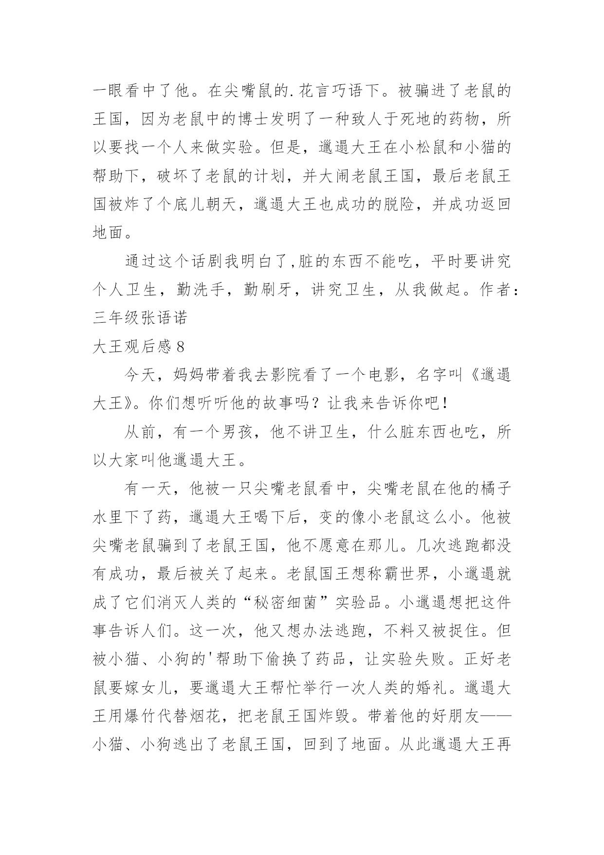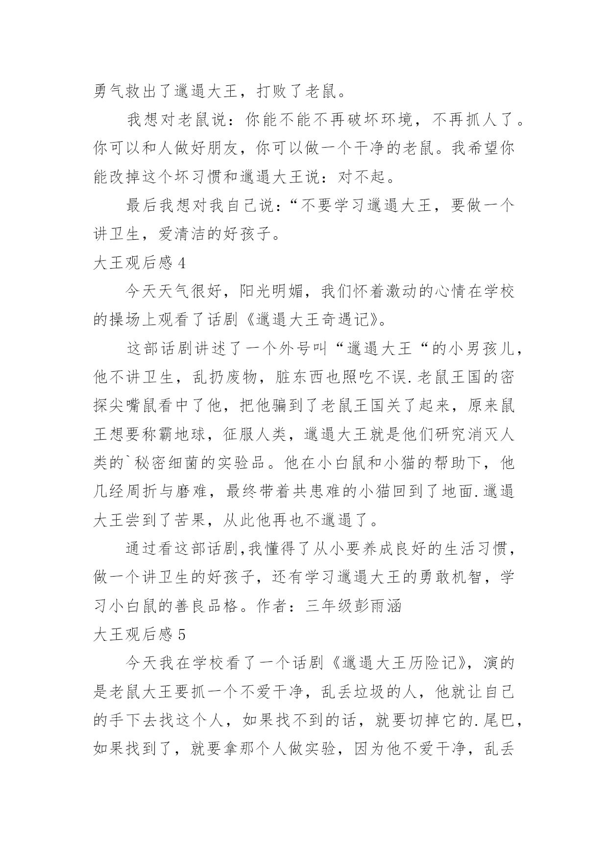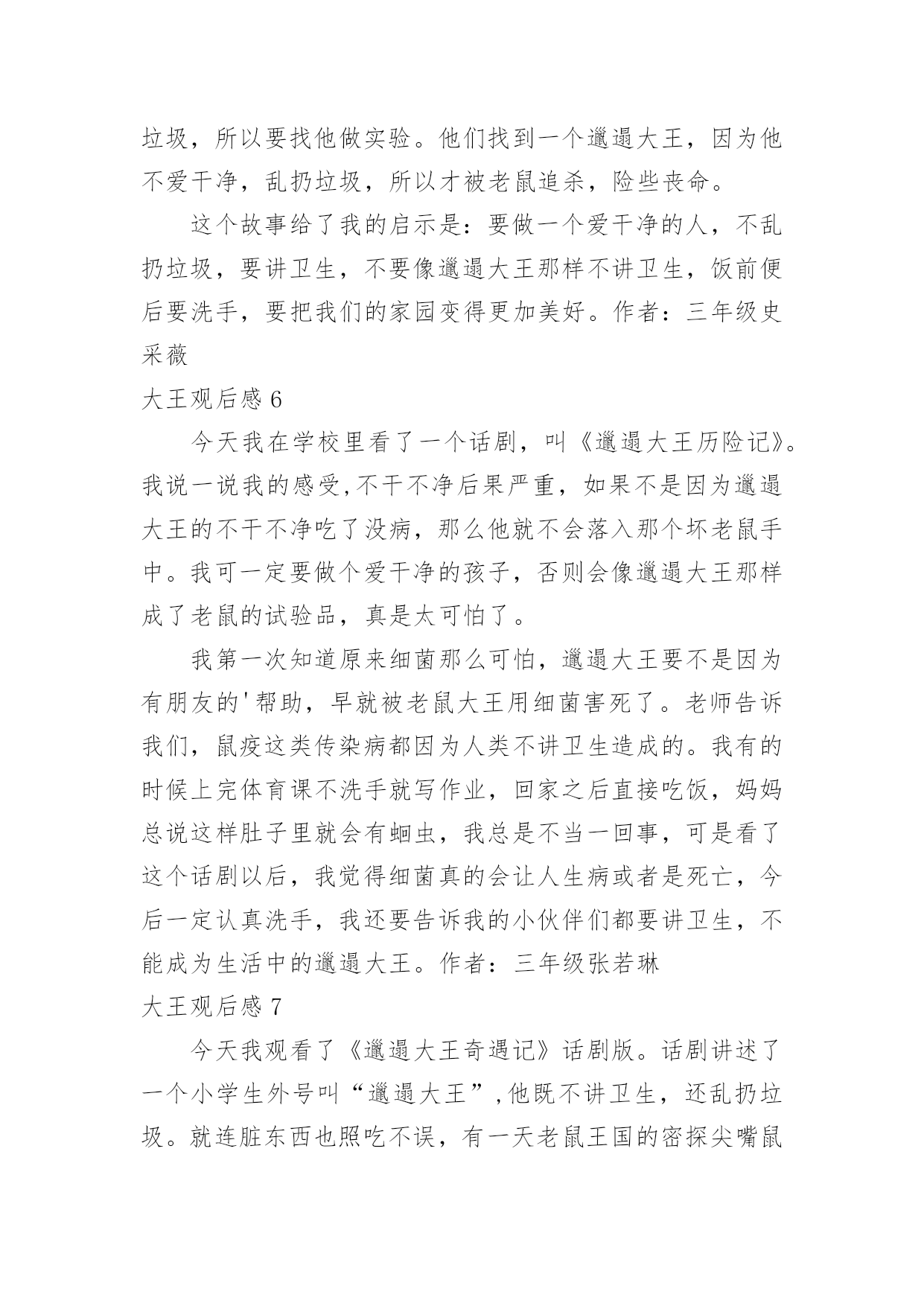 大王观后感大王观后感当观看作品时,我们会沉浸在情节之中,相信大家一定领会了不少东西,每个观看完影片的人都有不一样的感受与想法。那么观后感到底应该怎么写呢?以下是小编为大家整理的大王观后感,供大家参考借鉴,希望可以帮助到有需要的朋友。大王观后感1敏豪生的冒险故事,总是非常离谱:头盖骨可以象阀门一样打开:用十分饥饿的狼拉雪橇:会飞的树:奶酪岛……无论如何,他的故事都是那么的离奇古怪,令人忍俊不禁。这本书记录了敏豪生的历险故事。有人会说:“这不是一本教人说谎编瞎话的书吗?”不是的,这是人类想象力的`顶峰,有很高的文学价值的。他的想象力真丰富啊!我真佩服他。但是,他爱吹牛,说瞎话的恶习,也是一个缺点。犹如一丛花中透露出了一点黑色,令人胆战心惊。他的缺点只有一个:爱说瞎话。如果可以把这一点改了的话,他就十全十美了。不过,他的历险故事太离谱了。我要“夸”他一下:你太“历害”了。可现在有些人,分明自己口袋中只有8角钱,却说自己有1元钱,还按照1元钱的标准去花。到了考试时,某人问他:“你能考多少啊?”他说:“我能考满分。”结果,他才考了个良,还有一道大题作弊了。我们可千万不要养成爱吹牛的恶习啊!大王观后感2《吹牛大王历险记》这本书是由德国作家戈。毕尔格创作而成,它的主人公是吹牛大王豪。这本书我最喜欢的一篇文章是《一枪射中七只肥鹅》,故事的主要内容是:有一天,吹牛大王打猎回来,正好看见路上有七只他鹅,可是没有子弹了,难道白白放过这些肥肥胖胖的鹅儿吗?他眼珠一转,计上心来,从挎包里取出擦枪的通条,就是一种头削的.尖尖的、长长像火炉钩一样的玩意儿,然后把它装进枪膛里。吹牛大王让猎狗往前一跳,这样鹅就飞起来了,当它们飞成一条线时,他一扣扳机,通条飞出枪膛,直射向七只肥鹅。竟然一只不落的全穿在了一根通条上。文中的吹牛大王真聪明啊!用通条代替子弹,射中了七只肥鹅。我以后也要学习他那种遇事沉着应对,勤于动脑、敢于探索的高尚品质,学会用自己的聪明才智解决问题。大王观后感3我觉得这个话剧非常好看,从话剧中我明白了很多道理。此时我想对邋遢大王说:我们要一天至少洗一回澡,不刷牙是会牙疼的,不要养成乱扔垃圾的`习惯,要干净,这样别人才会喜欢你,才会和你玩,我希望你能改掉这些习惯。我想对小松鼠和小猫说:你们太棒了,用你们的聪明和勇气救出了邋遢大王,打败了老鼠。我想对老鼠说:你能不能不再破坏环境,不再抓人了。你可以和人做好朋友,你可以做一个干净的老鼠。我希望你能改掉这个坏习惯和邋遢大王说:对不起。最后我想对我自己说:“不要学习邋遢大王,要做一个讲卫生,爱清洁的好孩子。大王观后感4今天天气很好,阳光明媚,我们怀着激动的心情在学校的操场上观看了话剧《邋遢大王奇遇记》。这部话剧讲述了一个外号叫“邋遢大王“的小男孩儿,他不讲卫生,乱扔废物,脏东西也照吃不误.老鼠王国的密探尖嘴鼠看中了他,把他骗到了老鼠王国关了起来,原来鼠王想要称霸地球,征服人类,邋遢大王就是他们研究消灭人类的`秘密细菌的实验品。他在小白鼠和小猫的帮助下,他几经周折与磨难,最终带着共患难的小猫回到了地面.邋遢大王尝到了苦果,从此他再也不邋遢了。通过看这部话剧,我懂得了从小要养成良好的生活习惯,做一个讲卫生的好孩子,还有学习邋遢大王的勇敢机智,学习小白鼠的善良品格。作者:三年级彭雨涵大王观后感5今天我在学校看了一个话剧《邋遢大王历险记》,演的是老鼠大王要抓一个不爱干净,乱丢垃圾的人,他就让自己的手下去找这个人,如果找不到的话,就要切掉它的.尾巴,如果找到了,就要拿那个人做实验,因为他不爱干净,乱丢垃圾,所以要找他做实验。他们找到一个邋遢大王,因为他不爱干净,乱扔垃圾,所以才被老鼠追杀,险些丧命。这个故事给了我的启示是:要做一个爱干净的人,不乱扔垃圾,要讲卫生,不要像邋遢大王那样不讲卫生,饭前便后要洗手,要把我们的家园变得更加美好。作者:三年级史采薇大王观后感6今天我在学校里看了一个话剧,叫《邋遢大王历险记》。我说一说我的感受,不干不净后果严重,如果不是因为邋遢大王的不干不净吃了没病,那么他就不会落入那个坏老鼠手中。我可一定要做个爱干净的孩子,否则会像邋遢大王那样成了老鼠的试验品,真是太可怕了。我第一次知道原来细菌那么可怕,邋遢大王要不是因为有朋友的'帮助,早就被老鼠大王用细菌害死了。老师告诉我们,鼠疫这类传染病都因为人类不讲卫生造成的。我有的时候上完体育课不洗手就写作业,回家之后直接吃饭,妈妈总说这样肚子里就会有蛔虫,我总是不当一回事,可是看了这个话剧以后,我觉得细菌真的会让人生病或者是死亡,今后一定认真洗手,我还要告诉我的小伙伴们都要讲卫生,不能成为生活中的邋遢大王。作者:三年级张若琳大王观后感7今天我观看了《邋遢大王奇遇记》话剧版。话剧讲述了一个小学生外号叫“邋遢大王”,他既不讲卫生,还乱扔垃圾。就连脏东西