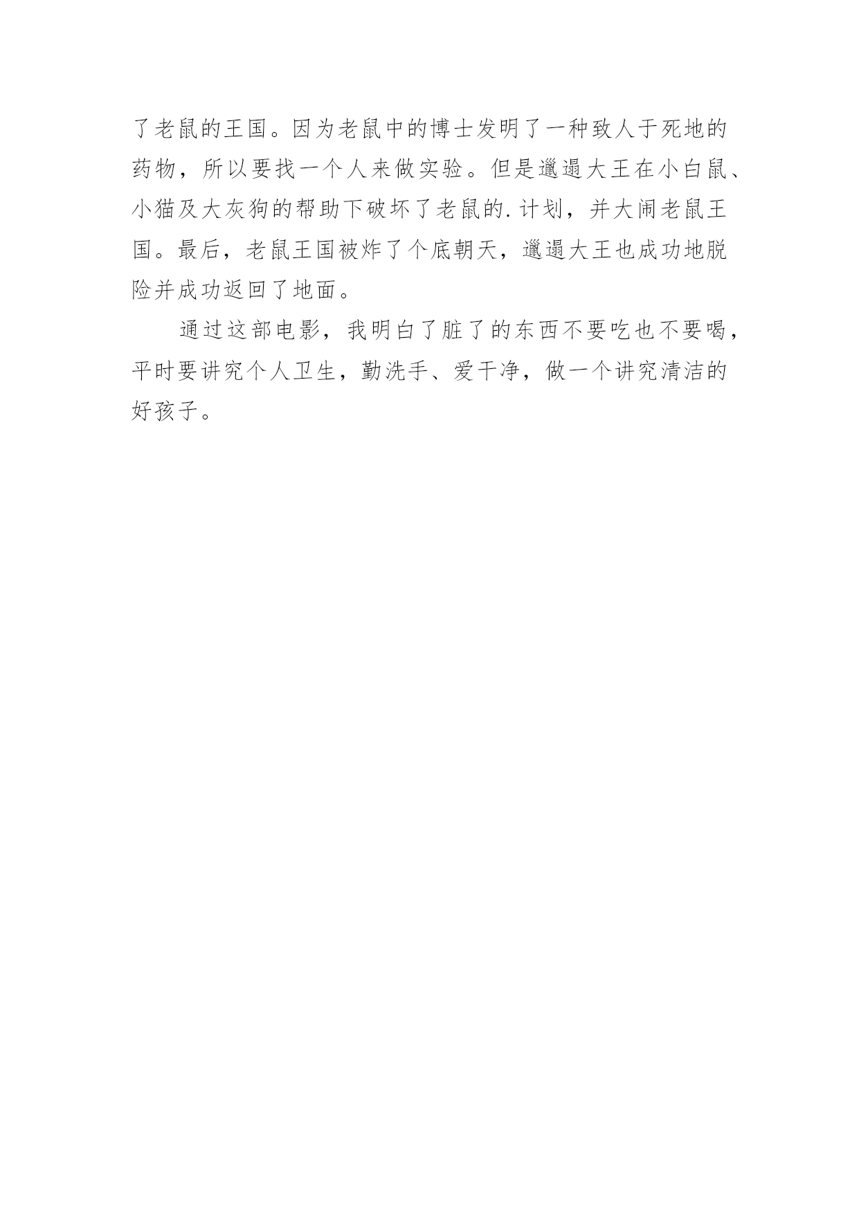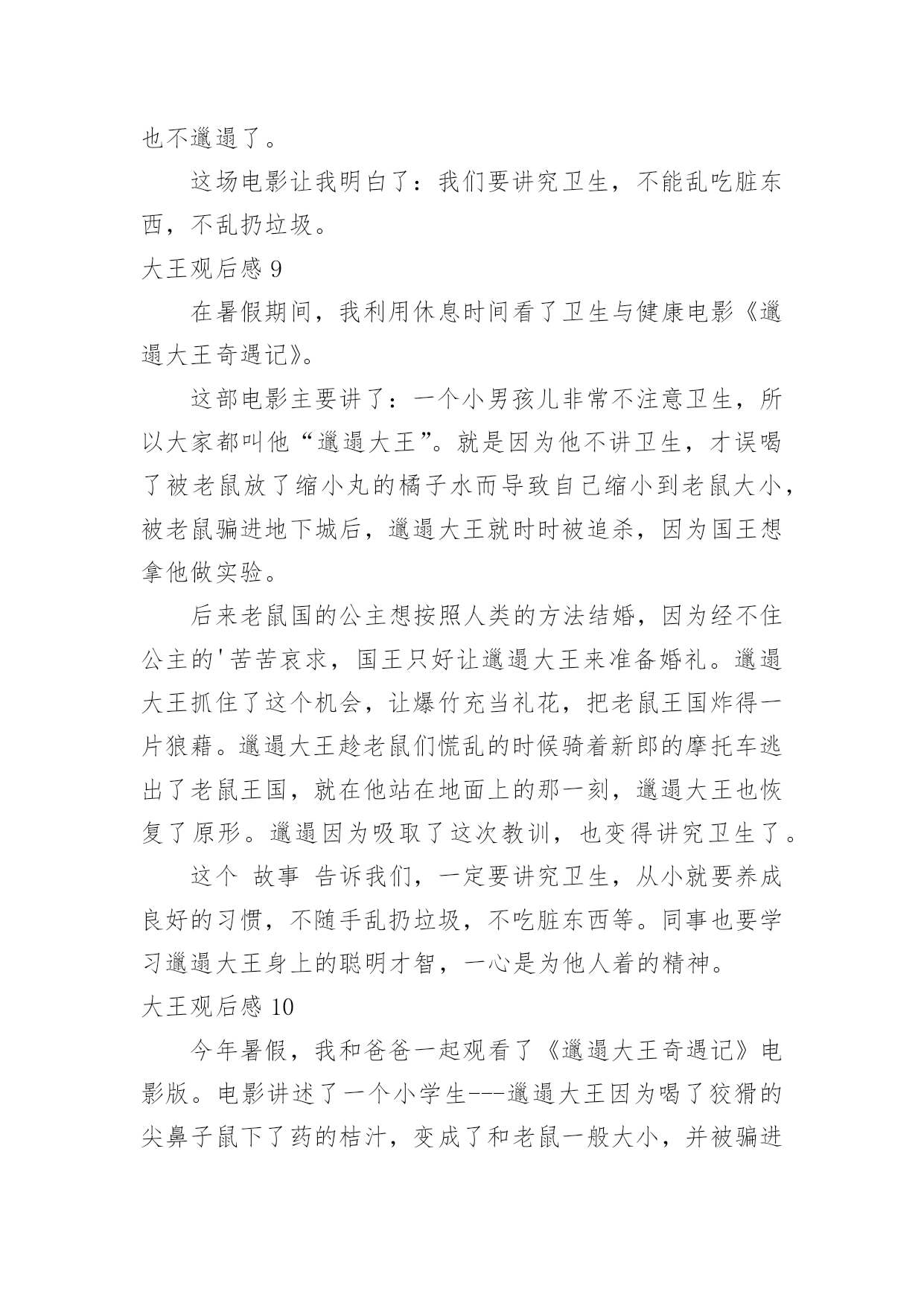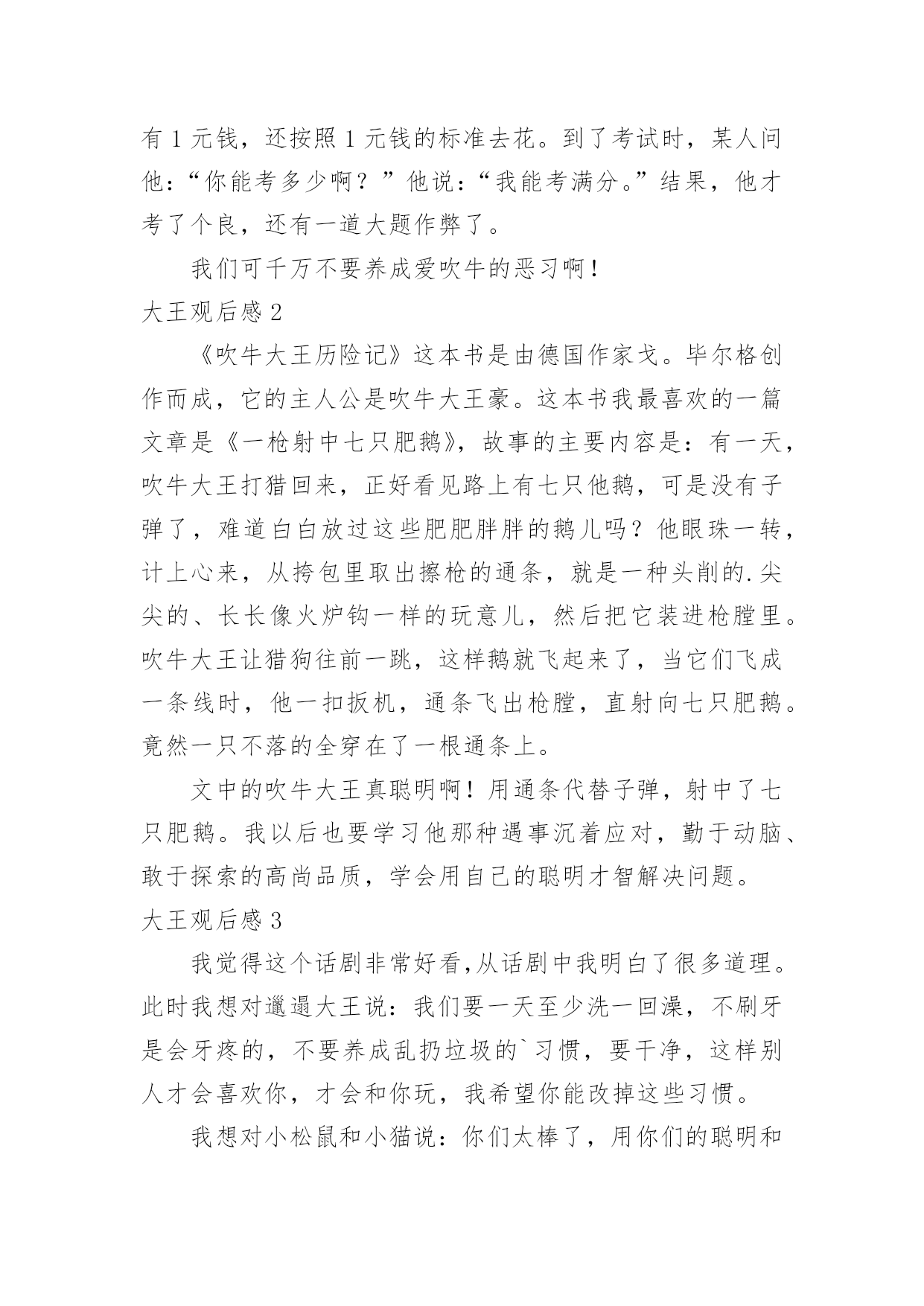 大王观后感大王观后感当观看作品时,我们会沉浸在情节之中,相信大家一定领会了不少东西,每个观看完影片的人都有不一样的感受与想法。那么观后感到底应该怎么写呢?以下是小编为大家整理的大王观后感,供大家参考借鉴,希望可以帮助到有需要的朋友。大王观后感1敏豪生的冒险故事,总是非常离谱:头盖骨可以象阀门一样打开:用十分饥饿的狼拉雪橇:会飞的树:奶酪岛……无论如何,他的故事都是那么的离奇古怪,令人忍俊不禁。这本书记录了敏豪生的历险故事。有人会说:“这不是一本教人说谎编瞎话的书吗?”不是的,这是人类想象力的`顶峰,有很高的文学价值的。他的想象力真丰富啊!我真佩服他。但是,他爱吹牛,说瞎话的恶习,也是一个缺点。犹如一丛花中透露出了一点黑色,令人胆战心惊。他的缺点只有一个:爱说瞎话。如果可以把这一点改了的话,他就十全十美了。不过,他的历险故事太离谱了。我要“夸”他一下:你太“历害”了。可现在有些人,分明自己口袋中只有8角钱,却说自己有1元钱,还按照1元钱的标准去花。到了考试时,某人问他:“你能考多少啊?”他说:“我能考满分。”结果,他才考了个良,还有一道大题作弊了。我们可千万不要养成爱吹牛的恶习啊!大王观后感2《吹牛大王历险记》这本书是由德国作家戈。毕尔格创作而成,它的主人公是吹牛大王豪。这本书我最喜欢的一篇文章是《一枪射中七只肥鹅》,故事的主要内容是:有一天,吹牛大王打猎回来,正好看见路上有七只他鹅,可是没有子弹了,难道白白放过这些肥肥胖胖的鹅儿吗?他眼珠一转,计上心来,从挎包里取出擦枪的通条,就是一种头削的.尖尖的、长长像火炉钩一样的玩意儿,然后把它装进枪膛里。吹牛大王让猎狗往前一跳,这样鹅就飞起来了,当它们飞成一条线时,他一扣扳机,通条飞出枪膛,直射向七只肥鹅。竟然一只不落的全穿在了一根通条上。文中的吹牛大王真聪明啊!用通条代替子弹,射中了七只肥鹅。我以后也要学习他那种遇事沉着应对,勤于动脑、敢于探索的高尚品质,学会用自己的聪明才智解决问题。大王观后感3我觉得这个话剧非常好看,从话剧中我明白了很多道理。此时我想对邋遢大王说:我们要一天至少洗一回澡,不刷牙是会牙疼的,不要养成乱扔垃圾的`习惯,要干净,这样别人才会喜欢你,才会和你玩,我希望你能改掉这些习惯。我想对小松鼠和小猫说:你们太棒了,用你们的聪明和勇气救出了邋遢大王,打败了老鼠。我想对老鼠说:你能不能不再破坏环境,不再抓人了。你可以和人做好朋友,你可以做一个干净的老鼠。我希望你能改掉这个坏习惯和邋遢大王说:对不起。最后我想对我自己说:“不要学习邋遢大王,要做一个讲卫生,爱清洁的好孩子。大王观后感4今天天气很好,阳光明媚,我们怀着激动的心情在学校的操场上观看了话剧《邋遢大王奇遇记》。这部话剧讲述了一个外号叫“邋遢大王“的小男孩儿,他不讲卫生,乱扔废物,脏东西也照吃不误.老鼠王国的密探尖嘴鼠看中了他,把他骗到了老鼠王国关了起来,原来鼠王想要称霸地球,征服人类,邋遢大王就是他们研究消灭人类的`秘密细菌的实验品。他在小白鼠和小猫的帮助下,他几经周折与磨难,最终带着共患难的小猫回到了地面.邋遢大王尝到了苦果,从此他再也不邋遢了。通过看这部话剧,我懂得了从小要养成良好的生活习惯,做一个讲卫生的好孩子,还有学习邋遢大王的勇敢机智,学习小白鼠的善良品格。作者:三年级彭雨涵大王观后感5今天我在学校看了一个话剧《邋遢大王历险记》,演的是老鼠大王要抓一个不爱干净,乱丢垃圾的人,他就让自己的手下去找这个人,如果找不到的话,就要切掉它的.尾巴,如果找到了,就要拿那个人做实验,因为他不爱干净,乱丢垃圾,所以要找他做实验。他们找到一个邋遢大王,因为他不爱干净,乱扔垃圾,所以才被老鼠追杀,险些丧命。这个故事给了我的启示是:要做一个爱干净的人,不乱扔垃圾,要讲卫生,不要像邋遢大王那样不讲卫生,饭前便后要洗手,要把我们的家园变得更加美好。作者:三年级史采薇大王观后感6今天我在学校里看了一个话剧,叫《邋遢大王历险记》。我说一说我的感受,不干不净后果严重,如果不是因为邋遢大王的不干不净吃了没病,那么他就不会落入那个坏老鼠手中。我可一定要做个爱干净的孩子,否则会像邋遢大王那样成了老鼠的试验品,真是太可怕了。我第一次知道原来细菌那么可怕,邋遢大王要不是因为有朋友的'帮助,早就被老鼠大王用细菌害死了。老师告诉我们,鼠疫这类传染病都因为人类不讲卫生造成的。我有的时候上完体育课不洗手就写作业,回家之后直接吃饭,妈妈总说这样肚子里就会有蛔虫,我总是不当一回事,可是看了这个话剧以后,我觉得细菌真的会让人生病或者是死亡,今后一定认真洗手,我还要告诉我的小伙伴们都要讲卫生,不能成为生活中的邋遢大王。作者:三年级张若琳大王观后感7今天我观看了《邋遢大王奇遇记》话剧版。话剧讲述了一个小学生外号叫“邋遢大王”,他既不讲卫生,还乱扔垃圾。就连脏东西