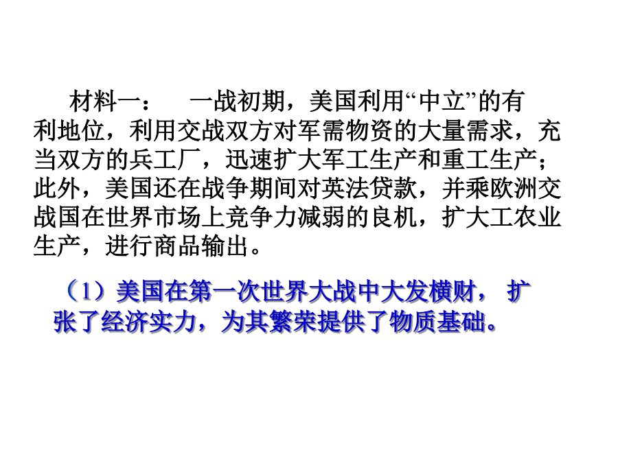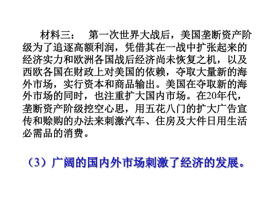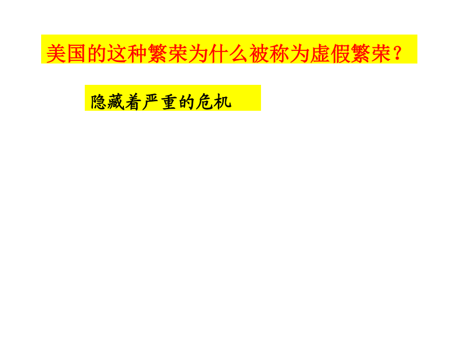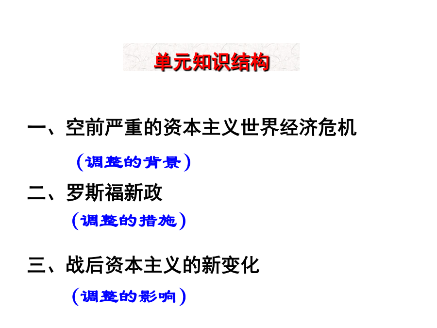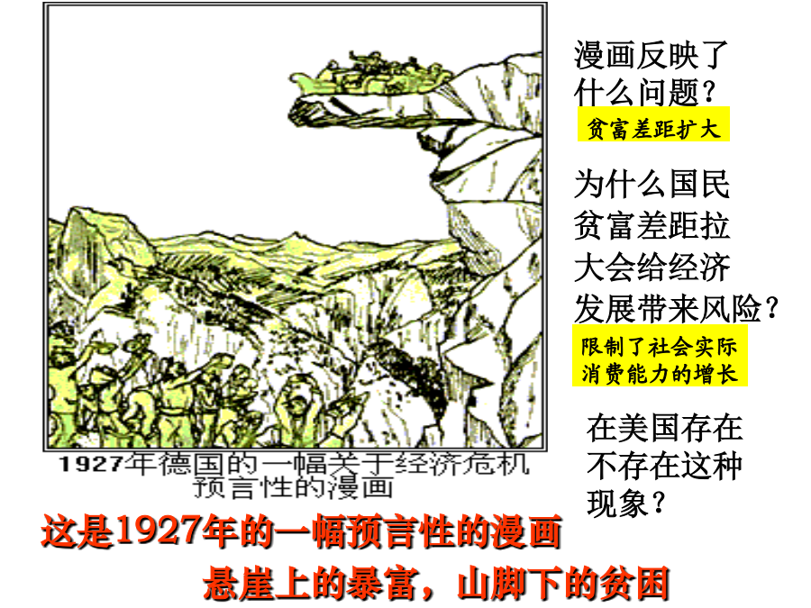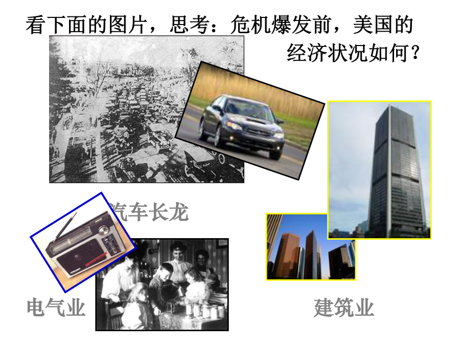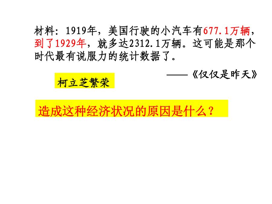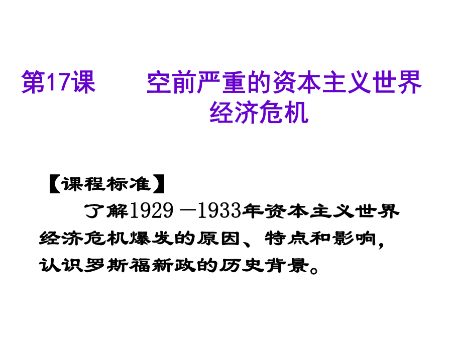 第六单元世界资本主义经济政策的调整单元知识结构第17课空前严重的资本主义世界经济危机汽车长龙材料:1919年,美国行驶的小汽车有677.1万辆,到了1929年,就多达2312.1万辆。这可能是那个时代最有说服力的统计数据了。——《仅仅是昨天》(2)技术革命是最基本、最重要的原因。(3)广阔的国内外市场刺激了经济的发展。隐藏着严重的危机这是1927年的一幅预言性的漫画悬崖上的暴富,山脚下的贫困材料:1920~1929年,美国工人的工资增长是2%,而工厂中生产率却增长55%。到1929年,美国国家财富的三分之一由只占人口总数的1%的人拥有。贫富差距扩大,人们的购买力下降,市场相对狭小,所以出现生产过剩。2:当时美国的流行说法是:“一美元首付,一美元月供。”据统计,1924~1929年,分期付款销售额从20亿美元增加到35亿美元。那时,农民贷款购买土地、化肥和农用设备;城里人贷款买汽车、收音机、洗衣机;投资者贷款买股票。1926年约有70%的汽车,是用分期付款的形式购买的。有的家具店对年轻的新婚夫妇说:“分期付款,你负责打扮新娘,我们来布置新房。”后来殡仪馆也登起广告:“分期付款,人死了,我们来负责料理后事。”思考:20世纪20年代的分期付款方式对美国经济产生了哪些影响?1929年8月贫富差距扩大一、背景:柯立芝繁荣1929年10月24日,纽约股票交易所上市的各种股票狂跌,共下降450亿美元左右,这一天被称为“黑色星期四”。-BlackThursday一、背景:柯立芝繁荣大危机的影响材料三:大萧条破坏了资本主义经济…1930年美国通过提高制成品关税的《斯穆特—霍利税法》后,许多国家政府立刻通过增加美国产品进口关税加以抵制美国。——《新全球史》材料四:1929年至1931年间,日本对外贸易减少了近50%。……军队领导人和其他拥护扩张领上的人这时能颇有说服力地争辩……日本应征服一个使日本能自给自足、在经济上不依赖世界其他地区的帝国。——《全球通史》大危机的影响“自由放任”政策的失败——胡佛反危机措施2、胡佛反危机的措施随处可见的胡佛村3、胡佛的反危机结果胡佛的反危机措施四、经济危机的反思思考:当资本主义遭遇经济危机时,社会主义国家苏联却“风景这边独好”,苏联的情况怎么样?对此你有什么认识?思考:今天的中国经济会不会出现大规模的盲目投资?