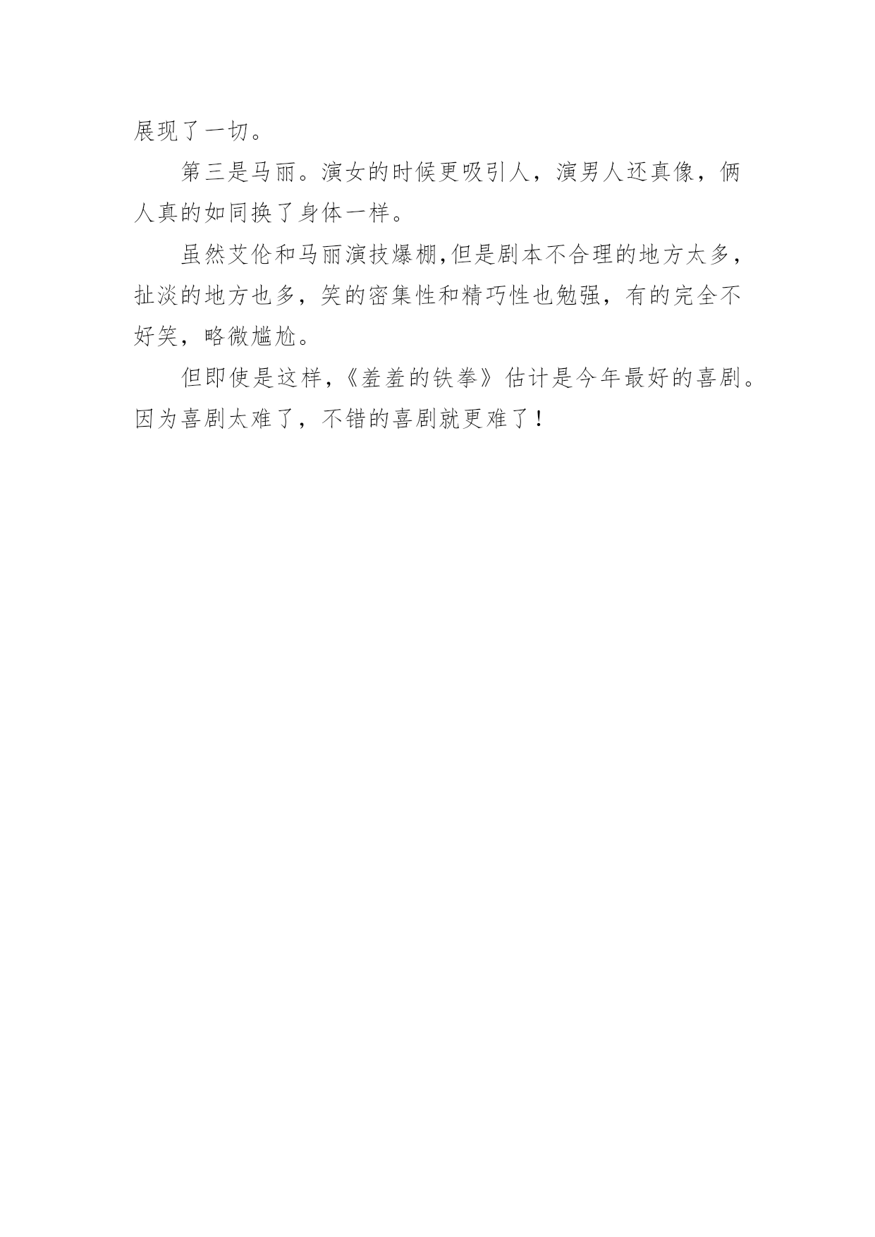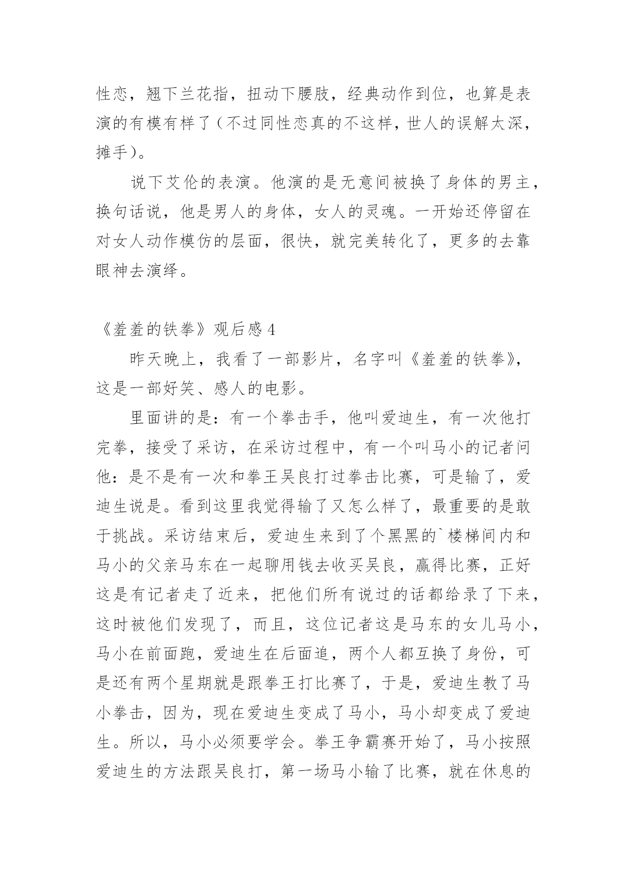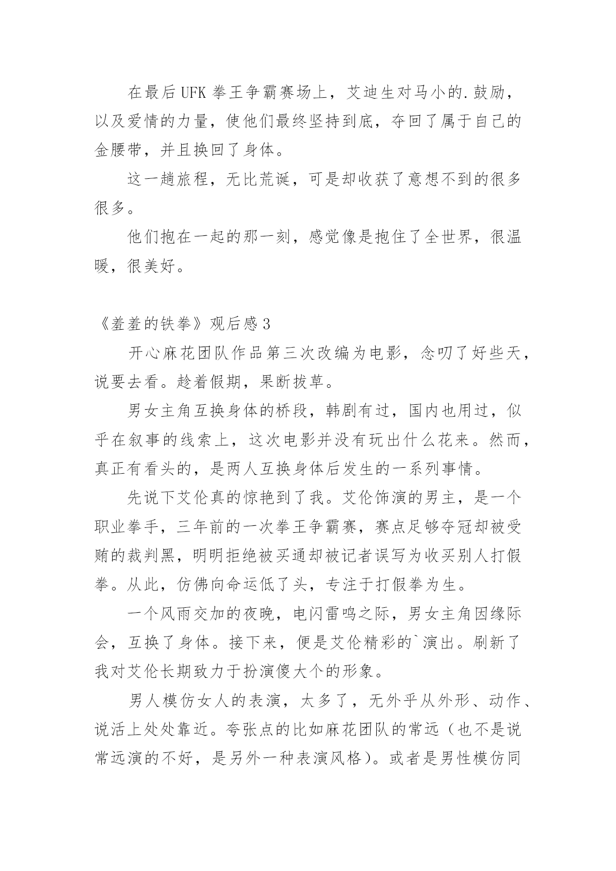《羞羞的铁拳》观后感在观看完一部作品以后,相信大家增长不少见闻吧,不妨坐下来好好写写观后感吧。那么观后感到底应该怎么写呢?以下是小编整理的《羞羞的铁拳》观后感,欢迎阅读,希望大家能够喜欢。《羞羞的铁拳》观后感1国庆假期,又是一大波电影来袭。开心麻花的《羞羞的铁拳》我们全家在中秋前夜和小姨一起去看了。非常不错,继《夏洛特烦恼》的又一个不错的搞笑片。首先说一下,感觉开心麻花的电影的主角名称都是名人啊,夏洛特(《夏洛特的'网》),也可理解为夏洛克(福尔摩斯),艾迪生,就不用我说了吧。剧情还是比较老套,两人互换身体,最后又换回来。主要是过程,当时电影院里,我都笑到不行了。全场都在笑,无论是沈腾还是艾力,无论是上山学艺,打拳,互相伤害还是哪儿,都非常搞笑,而且演员也确实演得很好。两个人也选得很好,马丽很酷,艾伦很像。还有一些小小的点,比如那个发传单被撞死的徒弟,搞笑爆了。还有沈腾一飞就跪下来了。但是如果真的以批判的精神看还是有很多BUG的,比如两人在泳池中互换身体,被雷劈,根据科学来说,当身体完全进入水中时,哪怕劈中了游泳池,电也会飞散开来,根本劈不到他们。其次,挨了两次雷还毫发无损,除去主角光环,他们俩可能是钢铁,哦不,超人之躯吧。另外,哪亲嘴,哪有雷,搞不好还是雷神。虽然BUG多多,但是作为一个非内涵片,主要是看剧情和笑点,作为一部喜剧片,还是可以的,也搞不好,下部电影就叫《托马撕煎饼》!《羞羞的铁拳》观后感2开心麻花的第三部电影《羞羞的铁拳》,无疑再次引起了高潮,火爆程度无法描述,观影过程中,旁边的陌生姑娘全程笑到合不拢嘴,丝毫不顾忌是在公共场合,也确实投入其中。看过这部电影,我最大的感触是,一个人到底可以有多么强大的意志力,才能够支撑得起自己全部的梦想和目标。关于拳王,之前因为真人秀《爸爸去哪儿》对邹市明有了一些了解,也看到过在擂台上鼻青脸肿的图像,感觉是拿用生命去拼。这部电影,开场全是笑点,而且总是在人意料之外。后来因为一个意外,马小和艾迪生双双坠入泳池,且在遭受雷电打击之后互换了身体,从此两个人的人生就彻底颠覆了。从一开始互相报复,到后来彼此理解,为了各自的梦想去努力,再到后来相互依靠,暗生情愫,这中间所经历的苦痛,大概只有观看过的人才能够体会。在最后UFK拳王争霸赛场上,艾迪生对马小的.鼓励,以及爱情的力量,使他们最终坚持到底,夺回了属于自己的金腰带,并且换回了身体。这一趟旅程,无比荒诞,可是却收获了意想不到的很多很多。他们抱在一起的那一刻,感觉像是抱住了全世界,很温暖,很美好。《羞羞的铁拳》观后感3开心麻花团队作品第三次改编为电影,念叨了好些天,说要去看。趁着假期,果断拔草。男女主角互换身体的桥段,韩剧有过,国内也用过,似乎在叙事的线索上,这次电影并没有玩出什么花来。然而,真正有看头的,是两人互换身体后发生的一系列事情。先说下艾伦真的惊艳到了我。艾伦饰演的男主,是一个职业拳手,三年前的一次拳王争霸赛,赛点足够夺冠却被受贿的裁判黑,明明拒绝被买通却被记者误写为收买别人打假拳。从此,仿佛向命运低了头,专注于打假拳为生。一个风雨交加的夜晚,电闪雷鸣之际,男女主角因缘际会,互换了身体。接下来,便是艾伦精彩的`演出。刷新了我对艾伦长期致力于扮演傻大个的形象。男人模仿女人的表演,太多了,无外乎从外形、动作、说活上处处靠近。夸张点的比如麻花团队的常远(也不是说常远演的不好,是另外一种表演风格)。或者是男性模仿同性恋,翘下兰花指,扭动下腰肢,经典动作到位,也算是表演的有模有样了(不过同性恋真的不这样,世人的误解太深,摊手)。说下艾伦的表演。他演的是无意间被换了身体的男主,换句话说,他是男人的身体,女人的灵魂。一开始还停留在对女人动作模仿的层面,很快,就完美转化了,更多的去靠眼神去演绎。《羞羞的铁拳》观后感4昨天晚上,我看了一部影片,名字叫《羞羞的铁拳》,这是一部好笑、感人的电影。里面讲的是:有一个拳击手,他叫爱迪生,有一次他打完拳,接受了采访,在采访过程中,有一个叫马小的记者问他:是不是有一次和拳王吴良打过拳击比赛,可是输了,爱迪生说是。看到这里我觉得输了又怎么样了,最重要的是敢于挑战。采访结束后,爱迪生来到了个黑黑的`楼梯间内和马小的父亲马东在一起聊用钱去收买吴良,赢得比赛,正好这是有记者走了近来,把他们所有说过的话都给录了下来,这时被他们发现了,而且,这位记者这是马东的女儿马小,马小在前面跑,爱迪生在后面追,两个人都互换了身份,可是还有两个星期就是跟拳王打比赛了,于是,爱迪生教了马小拳击,因为,现在爱迪生变成了马小,马小却变成了爱迪生。所以,马小必须要学会。拳王争霸赛开始了,马小按照爱迪生的方法跟吴良打,第一场马小输了比赛,就在休息的时候,他们两个人换了回来。第二场开始了,爱迪生使出了最大的力气,这时,爱迪生的手被拉的都快断了,