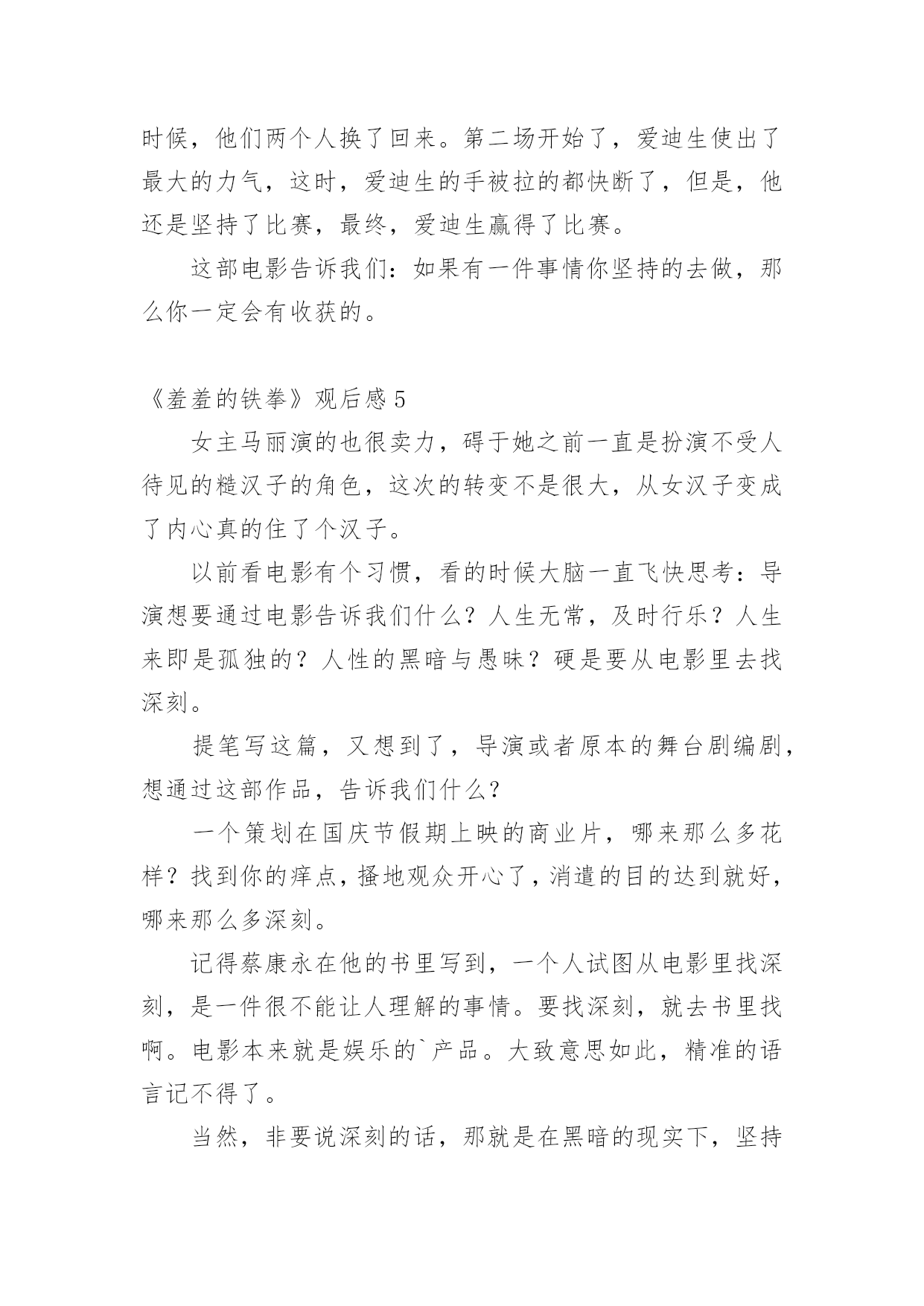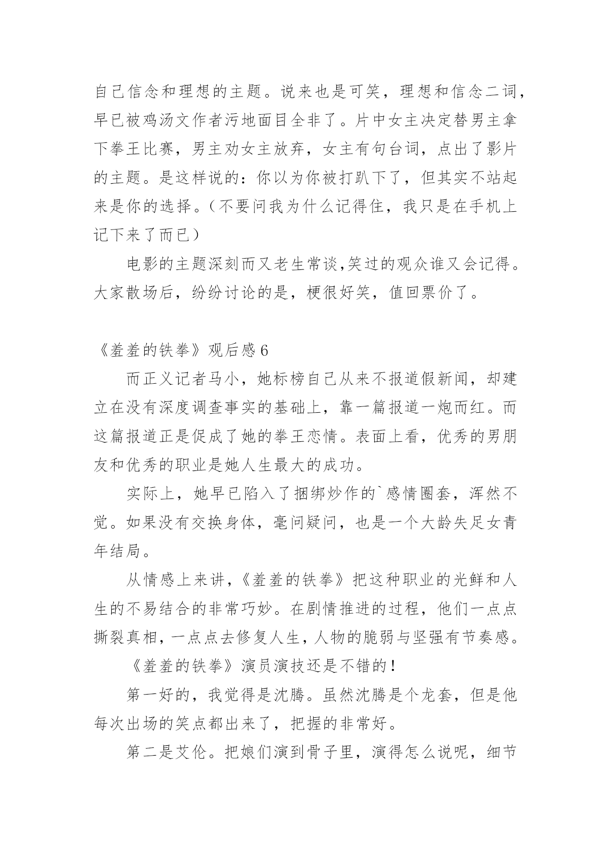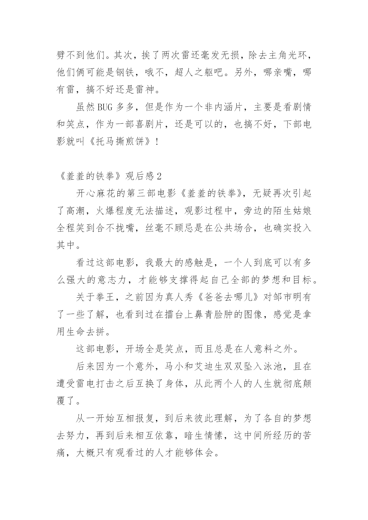 《羞羞的铁拳》观后感在观看完一部作品以后,相信大家增长不少见闻吧,不妨坐下来好好写写观后感吧。那么观后感到底应该怎么写呢?以下是小编整理的《羞羞的铁拳》观后感,欢迎阅读,希望大家能够喜欢。《羞羞的铁拳》观后感1国庆假期,又是一大波电影来袭。开心麻花的《羞羞的铁拳》我们全家在中秋前夜和小姨一起去看了。非常不错,继《夏洛特烦恼》的又一个不错的搞笑片。首先说一下,感觉开心麻花的电影的主角名称都是名人啊,夏洛特(《夏洛特的'网》),也可理解为夏洛克(福尔摩斯),艾迪生,就不用我说了吧。剧情还是比较老套,两人互换身体,最后又换回来。主要是过程,当时电影院里,我都笑到不行了。全场都在笑,无论是沈腾还是艾力,无论是上山学艺,打拳,互相伤害还是哪儿,都非常搞笑,而且演员也确实演得很好。两个人也选得很好,马丽很酷,艾伦很像。还有一些小小的点,比如那个发传单被撞死的徒弟,搞笑爆了。还有沈腾一飞就跪下来了。但是如果真的以批判的精神看还是有很多BUG的,比如两人在泳池中互换身体,被雷劈,根据科学来说,当身体完全进入水中时,哪怕劈中了游泳池,电也会飞散开来,根本劈不到他们。其次,挨了两次雷还毫发无损,除去主角光环,他们俩可能是钢铁,哦不,超人之躯吧。另外,哪亲嘴,哪有雷,搞不好还是雷神。虽然BUG多多,但是作为一个非内涵片,主要是看剧情和笑点,作为一部喜剧片,还是可以的,也搞不好,下部电影就叫《托马撕煎饼》!《羞羞的铁拳》观后感2开心麻花的第三部电影《羞羞的铁拳》,无疑再次引起了高潮,火爆程度无法描述,观影过程中,旁边的陌生姑娘全程笑到合不拢嘴,丝毫不顾忌是在公共场合,也确实投入其中。看过这部电影,我最大的感触是,一个人到底可以有多么强大的意志力,才能够支撑得起自己全部的梦想和目标。关于拳王,之前因为真人秀《爸爸去哪儿》对邹市明有了一些了解,也看到过在擂台上鼻青脸肿的图像,感觉是拿用生命去拼。这部电影,开场全是笑点,而且总是在人意料之外。后来因为一个意外,马小和艾迪生双双坠入泳池,且在遭受雷电打击之后互换了身体,从此两个人的人生就彻底颠覆了。从一开始互相报复,到后来彼此理解,为了各自的梦想去努力,再到后来相互依靠,暗生情愫,这中间所经历的苦痛,大概只有观看过的人才能够体会。在最后UFK拳王争霸赛场上,艾迪生对马小的.鼓励,以及爱情的力量,使他们最终坚持到底,夺回了属于自己的金腰带,并且换回了身体。这一趟旅程,无比荒诞,可是却收获了意想不到的很多很多。他们抱在一起的那一刻,感觉像是抱住了全世界,很温暖,很美好。《羞羞的铁拳》观后感3开心麻花团队作品第三次改编为电影,念叨了好些天,说要去看。趁着假期,果断拔草。男女主角互换身体的桥段,韩剧有过,国内也用过,似乎在叙事的线索上,这次电影并没有玩出什么花来。然而,真正有看头的,是两人互换身体后发生的一系列事情。先说下艾伦真的惊艳到了我。艾伦饰演的男主,是一个职业拳手,三年前的一次拳王争霸赛,赛点足够夺冠却被受贿的裁判黑,明明拒绝被买通却被记者误写为收买别人打假拳。从此,仿佛向命运低了头,专注于打假拳为生。一个风雨交加的夜晚,电闪雷鸣之际,男女主角因缘际会,互换了身体。接下来,便是艾伦精彩的`演出。刷新了我对艾伦长期致力于扮演傻大个的形象。男人模仿女人的表演,太多了,无外乎从外形、动作、说活上处处靠近。夸张点的比如麻花团队的常远(也不是说常远演的不好,是另外一种表演风格)。或者是男性模仿同性恋,翘下兰花指,扭动下腰肢,经典动作到位,也算是表演的有模有样了(不过同性恋真的不这样,世人的误解太深,摊手)。说下艾伦的表演。他演的是无意间被换了身体的男主,换句话说,他是男人的身体,女人的灵魂。一开始还停留在对女人动作模仿的层面,很快,就完美转化了,更多的去靠眼神去演绎。《羞羞的铁拳》观后感4昨天晚上,我看了一部影片,名字叫《羞羞的铁拳》,这是一部好笑、感人的电影。里面讲的是:有一个拳击手,他叫爱迪生,有一次他打完拳,接受了采访,在采访过程中,有一个叫马小的记者问他:是不是有一次和拳王吴良打过拳击比赛,可是输了,爱迪生说是。看到这里我觉得输了又怎么样了,最重要的是敢于挑战。采访结束后,爱迪生来到了个黑黑的`楼梯间内和马小的父亲马东在一起聊用钱去收买吴良,赢得比赛,正好这是有记者走了近来,把他们所有说过的话都给录了下来,这时被他们发现了,而且,这位记者这是马东的女儿马小,马小在前面跑,爱迪生在后面追,两个人都互换了身份,可是还有两个星期就是跟拳王打比赛了,于是,爱迪生教了马小拳击,因为,现在爱迪生变成了马小,马小却变成了爱迪生。所以,马小必须要学会。拳王争霸赛开始了,马小按照爱迪生的方法跟吴良打,第一场马小输了比赛,就在休息的时候,他们两个人换了回来。第二场开始了,爱迪生使出了最大的力气,这时,爱迪生的手被拉的都快断了,