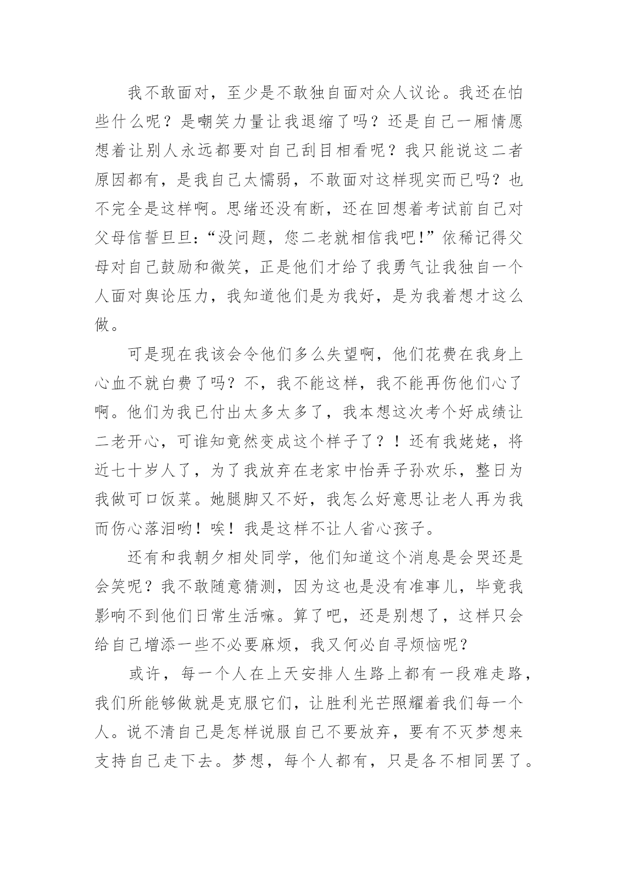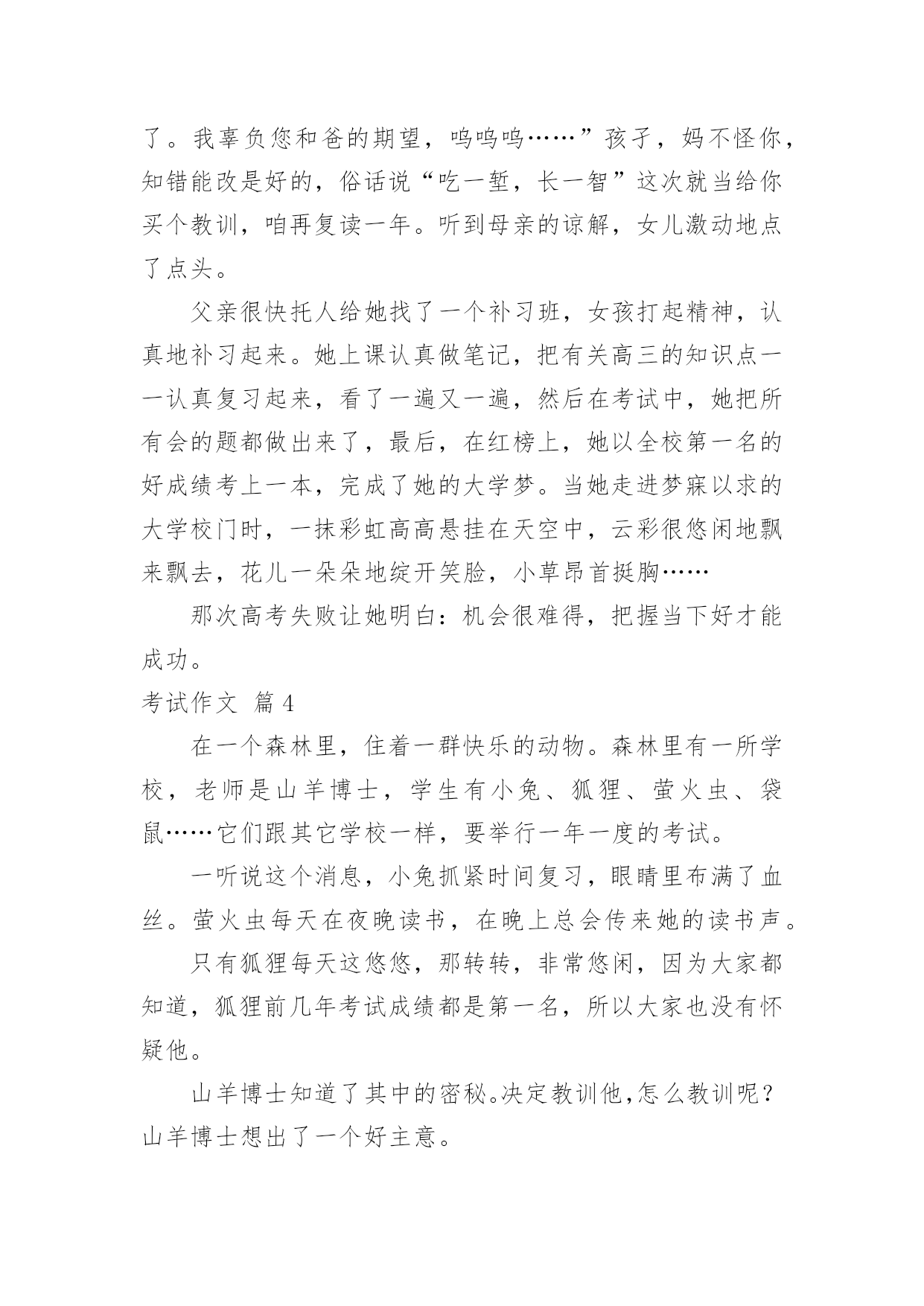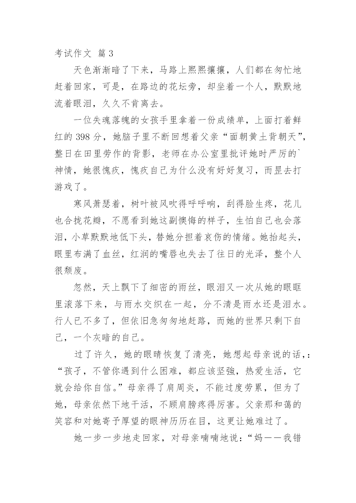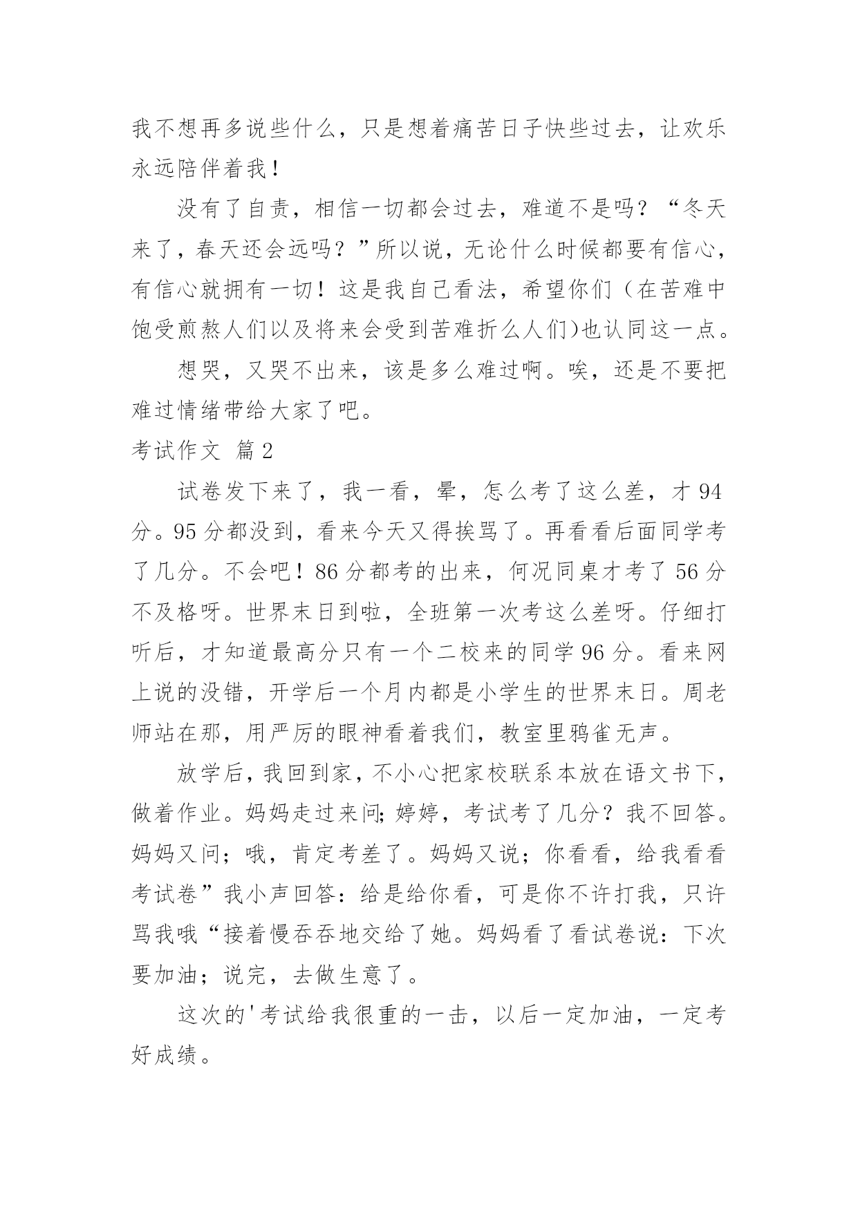 考试作文考试作文常用4篇无论是身处学校还是步入社会,说到作文,大家肯定都不陌生吧,写作文可以锻炼我们的独处习惯,让自己的心静下来,思考自己未来的方向。作文的注意事项有许多,你确定会写吗?下面是小编收集整理的考试作文5篇,仅供参考,欢迎大家阅读。考试作文篇1中考结束已有一段日子了,可我还是难以忘记自己去学校听分时情景,至今只要一想起当时情况,内心还是很惶恐不安感觉。说不出为什么,只是觉得有些不对劲儿。忘记了时间流逝,我只是在感受着我感受,无法听及旁人说话声、谈笑声,只是一味想找一个偏僻地方,能够让我一个人安安静静呆一会儿。如果我早就知道是这样结果,我也不必自己与自己过不去,只是这样结果让我措手不及。或许连上天也不应该和我开这样玩笑,事情有时就是这样不凑巧,不可思议事情发生了,我就不知该怎么办了。只觉得恍惚中一切都是假,没有真可言,连我自己都怀疑我这是怎么了,为何要把因担心而变成这个样子我还往痛苦深渊里面推,让我接着感受它带给我折么到底有多难受!不想埋怨这到底是上天不公平,还是自己蠢笨一手造成,只是不愿看到这样结局,至少它对我来讲不是什么好事情啊?!我不敢面对,至少是不敢独自面对众人议论。我还在怕些什么呢?是嘲笑力量让我退缩了吗?还是自己一厢情愿想着让别人永远都要对自己刮目相看呢?我只能说这二者原因都有,是我自己太懦弱,不敢面对这样现实而已吗?也不完全是这样啊。思绪还没有断,还在回想着考试前自己对父母信誓旦旦:“没问题,您二老就相信我吧!”依稀记得父母对自己鼓励和微笑,正是他们才给了我勇气让我独自一个人面对舆论压力,我知道他们是为我好,是为我着想才这么做。可是现在我该会令他们多么失望啊,他们花费在我身上心血不就白费了吗?不,我不能这样,我不能再伤他们心了啊。他们为我已付出太多太多了,我本想这次考个好成绩让二老开心,可谁知竟然变成这个样子了?!还有我姥姥,将近七十岁人了,为了我放弃在老家中怡弄子孙欢乐,整日为我做可口饭菜。她腿脚又不好,我怎么好意思让老人再为我而伤心落泪哟!唉!我是这样不让人省心孩子。还有和我朝夕相处同学,他们知道这个消息是会哭还是会笑呢?我不敢随意猜测,因为这也是没有准事儿,毕竟我影响不到他们日常生活嘛。算了吧,还是别想了,这样只会给自己增添一些不必要麻烦,我又何必自寻烦恼呢?或许,每一个人在上天安排人生路上都有一段难走路,我们所能够做就是克服它们,让胜利光芒照耀着我们每一个人。说不清自己是怎样说服自己不要放弃,要有不灭梦想来支持自己走下去。梦想,每个人都有,只是各不相同罢了。我不想再多说些什么,只是想着痛苦日子快些过去,让欢乐永远陪伴着我!没有了自责,相信一切都会过去,难道不是吗?“冬天来了,春天还会远吗?”所以说,无论什么时候都要有信心,有信心就拥有一切!这是我自己看法,希望你们(在苦难中饱受煎熬人们以及将来会受到苦难折么人们)也认同这一点。想哭,又哭不出来,该是多么难过啊。唉,还是不要把难过情绪带给大家了吧。考试作文篇2试卷发下来了,我一看,晕,怎么考了这么差,才94分。95分都没到,看来今天又得挨骂了。再看看后面同学考了几分。不会吧!86分都考的出来,何况同桌才考了56分不及格呀。世界末日到啦,全班第一次考这么差呀。仔细打听后,才知道最高分只有一个二校来的同学96分。看来网上说的没错,开学后一个月内都是小学生的世界末日。周老师站在那,用严厉的眼神看着我们,教室里鸦雀无声。放学后,我回到家,不小心把家校联系本放在语文书下,做着作业。妈妈走过来问;婷婷,考试考了几分?我不回答。妈妈又问;哦,肯定考差了。妈妈又说;你看看,给我看看考试卷”我小声回答:给是给你看,可是你不许打我,只许骂我哦“接着慢吞吞地交给了她。妈妈看了看试卷说:下次要加油;说完,去做生意了。这次的'考试给我很重的一击,以后一定加油,一定考好成绩。考试作文篇3天色渐渐暗了下来,马路上熙熙攘攘,人们都在匆忙地赶着回家,可是,在路边的花坛旁,却坐着一个人,默默地流着眼泪,久久不肯离去。一位失魂落魄的女孩手里拿着一份成绩单,上面打着鲜红的398分,她脑子里不断回想着父亲“面朝黄土背朝天”,整日在田里劳作的背影,老师在办公室里批评她时严厉的`神情,她很愧疚,愧疚自己为什么没有好好复习,而昰去打游戏了。寒风萧瑟着,树叶被风吹得呼呼响,刮得脸生疼,花儿也合拢花瓣,不愿看到她这副懊悔的样子,生怕自己也会落泪,小草默默地低下头,替她分担着哀伤的情绪。她抬起头,眼里布满了血丝,红润的嘴唇也失去了往日的光泽,整个人很颓废。忽然,天上飘下了细密的雨丝,眼泪又一次从她的眼眶里滚落下来,与雨水交织在一起,分不清是雨水还是泪水。行人已不多了,但依旧急匆匆地赶路,而她的世界只剩下自己,一个灰暗的自己。过了许久,她的眼晴恢复了清亮,她想起母亲说的话,:“孩孑,不管你遇到什么困