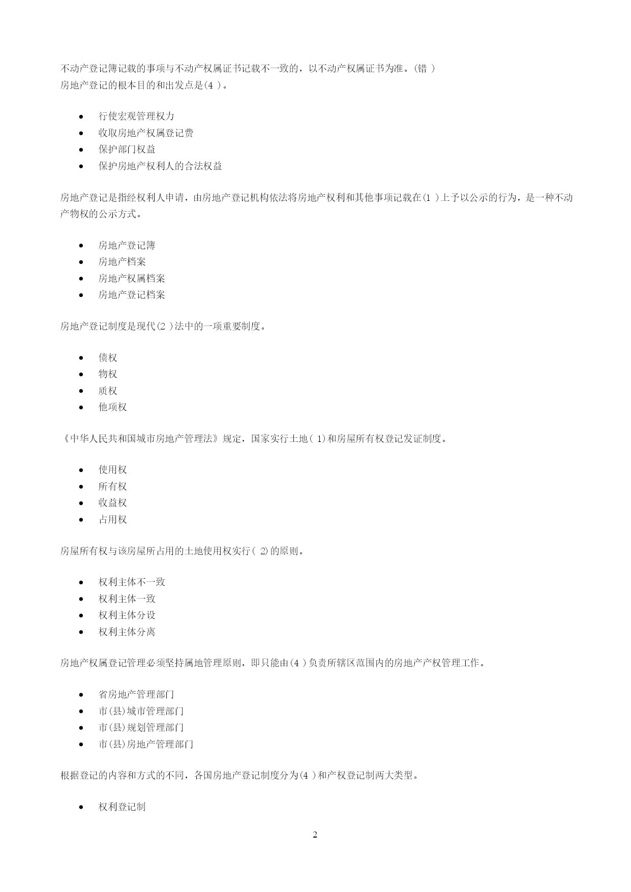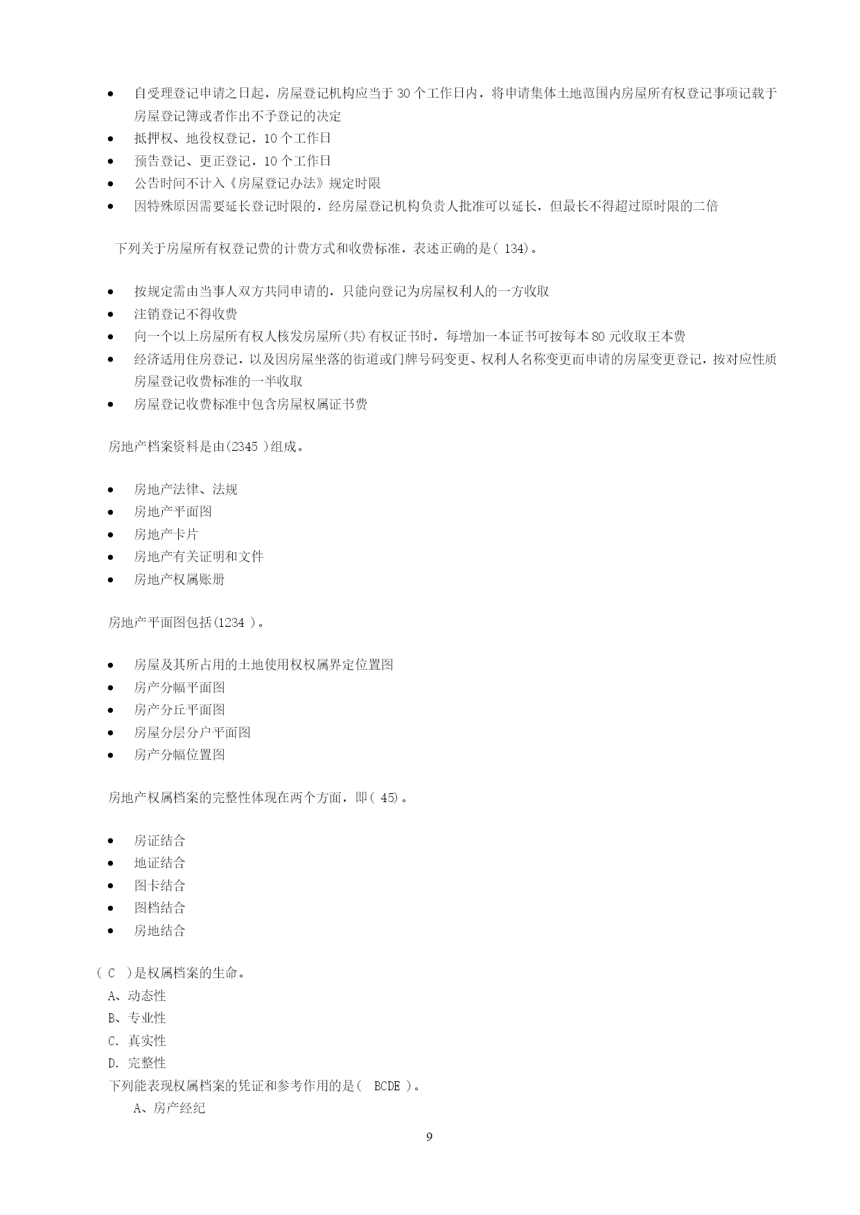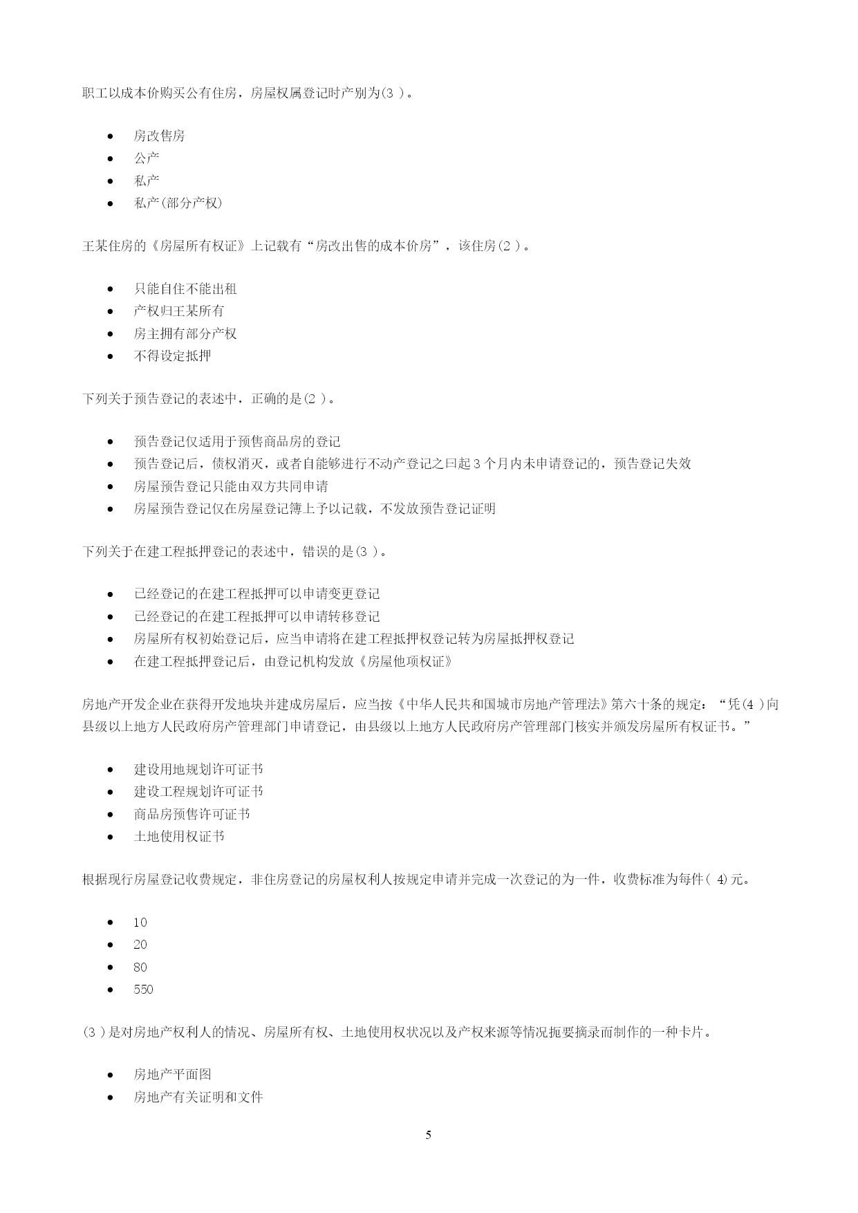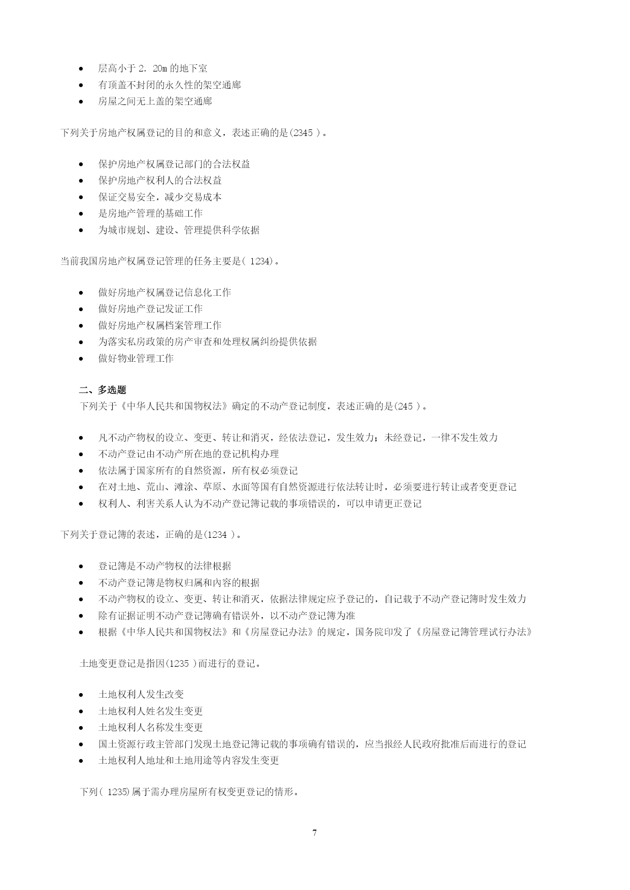 PAGEPAGE13一、单选题在共有建筑面积计算中,不应分摊的是(1)。用作公共休憩的架空层本幢公共使用的电梯井本幢的公共门厅本幢的公共过道根据《中华人民共和国物权法》,不动产登记费按(4)收取。面积套成交价格件权利人、利害关系人认为不动产登记簿记载的事项错误的,可以申请(4)登记。预告变更更正异议根据《房产测量规范》(GB/T17986.1—2000),不计算房屋建筑面积的是(4)。属永久性建筑有柱的货棚有顶盖不封闭的永久性架空通廊无顶盖的室外楼梯与室内不相通的类似于阳台的建筑《中华人民共和国物权法》规定,不动产登记机构应当履行的职责有(1345)。查验申请人提供的权厲证明审查申请人提供的评估报告就登记有关事项询问当事人必要时对被登记房屋进行实地查看及时登记有关事项《房屋登记办法》规定,可以办理房屋预告登记的情形有(12345)。房屋所有权转让房屋抵押在建工程抵押预购商品房抵押预购商品房预告登记后,未经预告登记权利人同意处分该不动产的,不发生物权效力。(对)异议登记不当,造成权利人损害的,权利人可以向异议登记申请人请求损害赔偿。(对)不动产登记簿记载的事项与不动产权属证书记载不一致的,以不动产权属证书为准。(错)房地产登记的根本目的和出发点是(4)。行使宏观管理权力收取房地产权属登记费保护部门权益保护房地产权利人的合法权益房地产登记是指经权利人申请,由房地产登记机构依法将房地产权利和其他事项记载在(1)上予以公示的行为,是一种不动产物权的公示方式。房地产登记簿房地产档案房地产权属档案房地产登记档案房地产登记制度是现代(2)法中的一项重要制度。债权物权质权他项权《中华人民共和国城市房地产管理法》规定,国家实行土地(1)和房屋所有权登记发证制度。使用权所有权收益权占用权房屋所有权与该房屋所占用的土地使用权实行(2)的原则。权利主体不一致权利主体一致权利主体分设权利主体分离房地产权属登记管理必须坚持属地管理原则,即只能由(4)负责所辖区范围内的房地产产权管理工作。省房地产管理部门市(县)城市管理部门市(县)规划管理部门市(县)房地产管理部门根据登记的内容和方式的不同,各国房地产登记制度分为(4)和产权登记制两大类型。权利登记制产权登记制托伦斯登记制契据登记制契据登记制度的理论基础是(3)。非对抗要件主义不对抗要件主义对抗要件主义成立要件主义产权登记制的理论基础是(4)。非对抗要件主义不对抗要件主义对抗要件主义成立要件主义《中华人民共和国城市房地产管理法》规定:“由(2)以上人民政府房产管理部门核实并颁发房屋所有权证书”。乡级县级地市级省级《土地登记办法》所称其他登记不包括(123)。土地预告登记土地异议登记土地更正登记土地变更登记(4)是指因土地权利的消灭等而进行的登记。土地初始登记土地变更登记土地总登记工地注销登记因土地权利人发生改变,或者因土地权利人姓名或者名称、地址和土地用途等內容发生变更而进行的登记,属于(3)。土地初始登记土地变更登记土地总登记土地注销登记李某继承了其父亲的一套房产。按照有关规定,李某应到当地房地产管理部门办理(3)。房屋总登记房屋所有权初始登记房屋所有权转移登记房屋所有权变更登记张某购买了一套二手房,按照有关规定,张某应到当地房地产管理部门办理(3)。房屋总登记房屋所有权初始登记房屋所有权转移登记房屋所有权变更登记《中华人民共和国物权法》规定,登记机构予以异议登记的,申请人在异议登记之日起(1)日内不起诉,异议登记失效。153045602010年3月,A市居民张某对其A市所住房屋进行了翻建,翻建后的房屋面积增加了12#[m^{2}]#,张某应当申请(b)。房屋所有权初始登记房屋所有权变更登记房屋所有权转移登记房屋更正登记2009年12月,B市居民马某在A市订购了一套商品住房,未签订正式购房合同,后因马某未购买,开发公司将这套商品住房卖给了刘某,则刘某需办理(3)。房屋所有权初始登记房屋所有权变更登记房屋所有权转移登记房屋更正登记2010年1月,王某用自己的住房抵押在A市建设银行贷款10万元。王某应到A市房地产管理部门办理(3)。房屋所有权转移登记房屋所有权初始登记房屋抵押权登记房屋所有权变更登记下列关于一般房屋登记程序,正确的是(3)。受理→申请→审核→记载于登记簿→发证申请→受理→记载子登记簿→审核→发证申请→受理→审核→记载于登记簿→发证受理→申请→记载于登记簿→审核→发证职工以成本价购买公有住房,房屋权