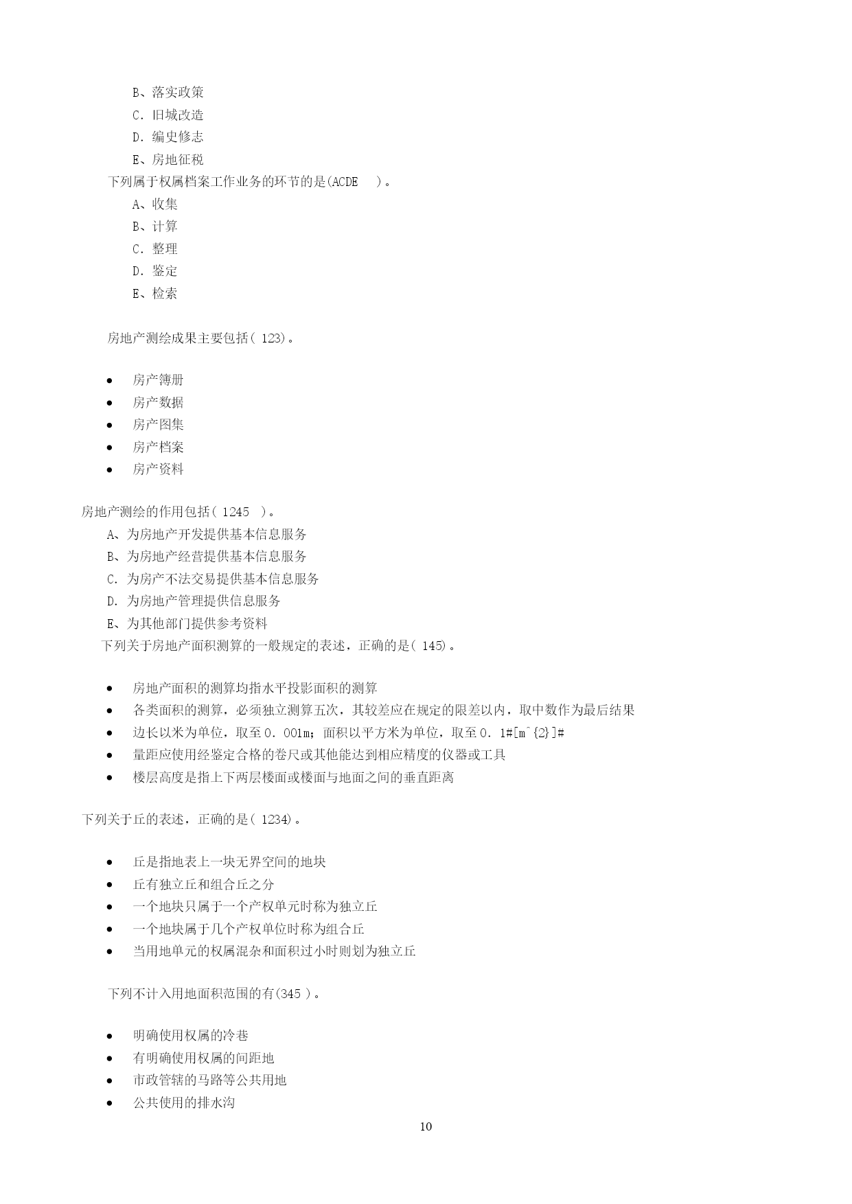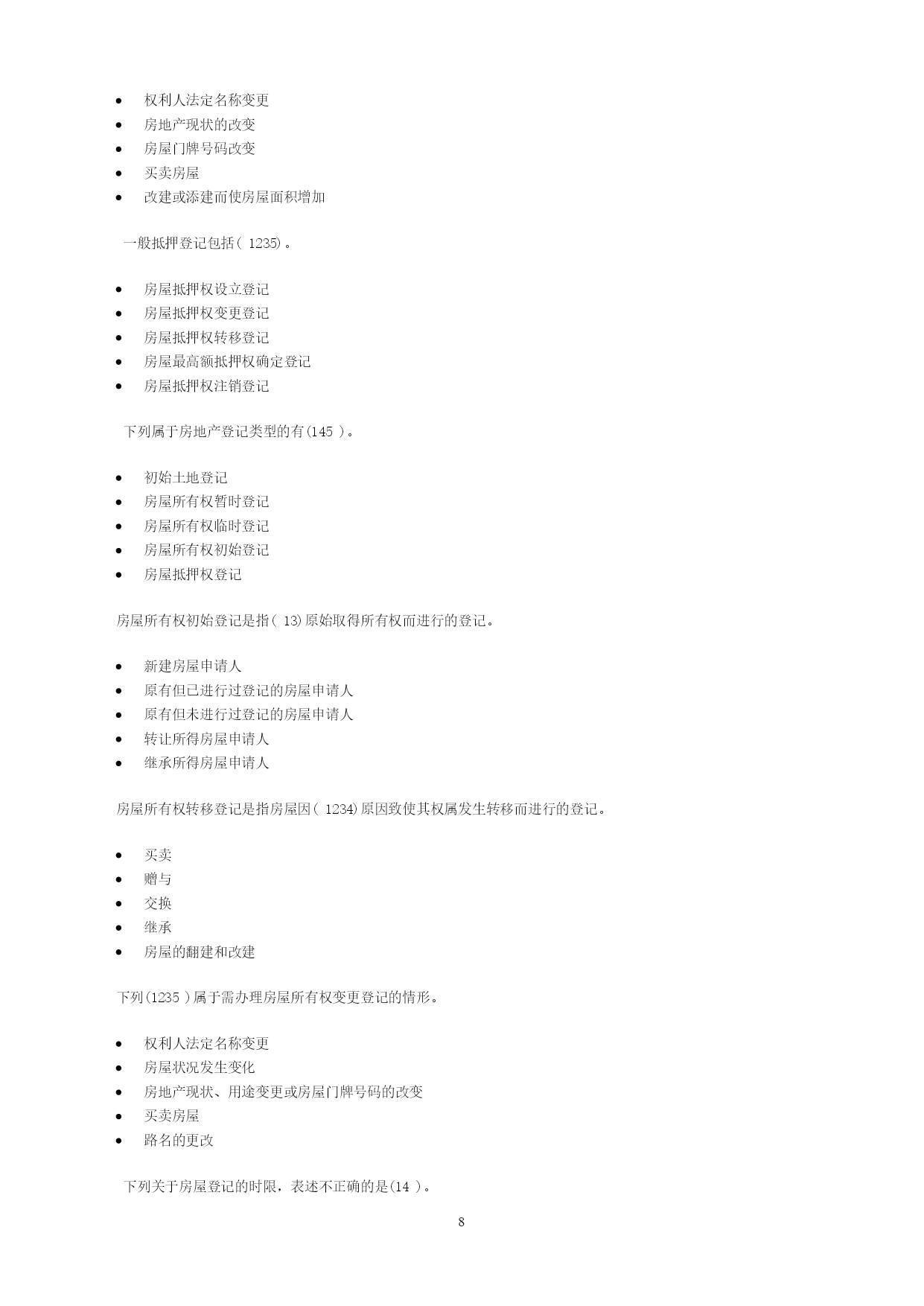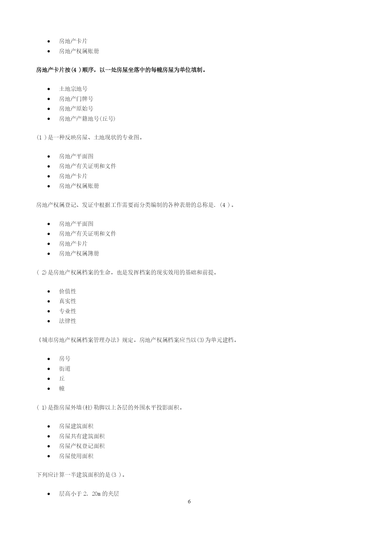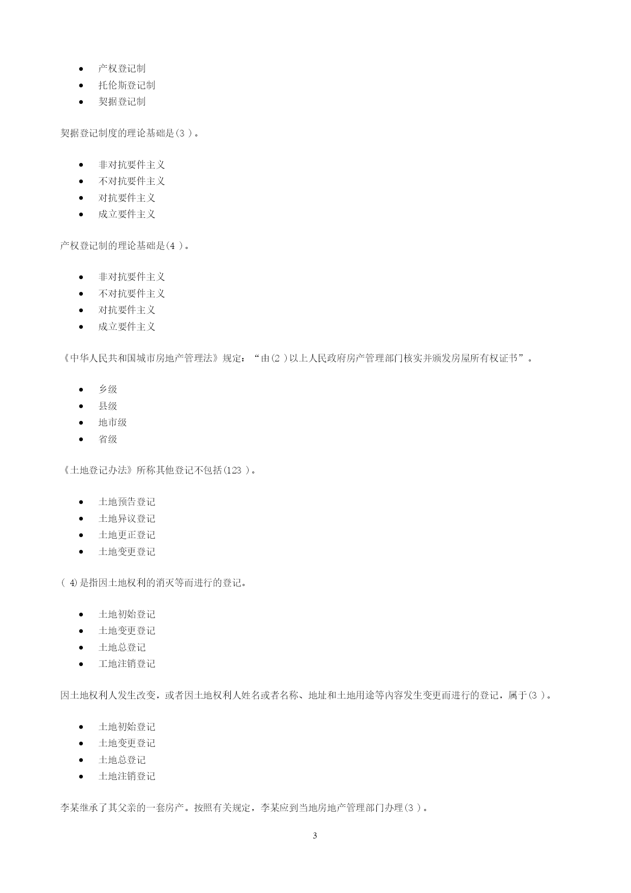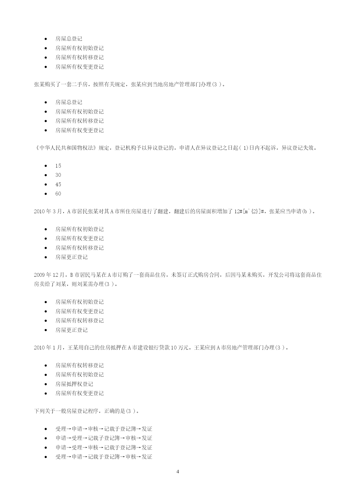 PAGEPAGE13一、单选题在共有建筑面积计算中,不应分摊的是(1)。用作公共休憩的架空层本幢公共使用的电梯井本幢的公共门厅本幢的公共过道根据《中华人民共和国物权法》,不动产登记费按(4)收取。面积套成交价格件权利人、利害关系人认为不动产登记簿记载的事项错误的,可以申请(4)登记。预告变更更正异议根据《房产测量规范》(GB/T17986.1—2000),不计算房屋建筑面积的是(4)。属永久性建筑有柱的货棚有顶盖不封闭的永久性架空通廊无顶盖的室外楼梯与室内不相通的类似于阳台的建筑《中华人民共和国物权法》规定,不动产登记机构应当履行的职责有(1345)。查验申请人提供的权厲证明审查申请人提供的评估报告就登记有关事项询问当事人必要时对被登记房屋进行实地查看及时登记有关事项《房屋登记办法》规定,可以办理房屋预告登记的情形有(12345)。房屋所有权转让房屋抵押在建工程抵押预购商品房抵押预购商品房预告登记后,未经预告登记权利人同意处分该不动产的,不发生物权效力。(对)异议登记不当,造成权利人损害的,权利人可以向异议登记申请人请求损害赔偿。(对)不动产登记簿记载的事项与不动产权属证书记载不一致的,以不动产权属证书为准。(错)房地产登记的根本目的和出发点是(4)。行使宏观管理权力收取房地产权属登记费保护部门权益保护房地产权利人的合法权益房地产登记是指经权利人申请,由房地产登记机构依法将房地产权利和其他事项记载在(1)上予以公示的行为,是一种不动产物权的公示方式。房地产登记簿房地产档案房地产权属档案房地产登记档案房地产登记制度是现代(2)法中的一项重要制度。债权物权质权他项权《中华人民共和国城市房地产管理法》规定,国家实行土地(1)和房屋所有权登记发证制度。使用权所有权收益权占用权房屋所有权与该房屋所占用的土地使用权实行(2)的原则。权利主体不一致权利主体一致权利主体分设权利主体分离房地产权属登记管理必须坚持属地管理原则,即只能由(4)负责所辖区范围内的房地产产权管理工作。省房地产管理部门市(县)城市管理部门市(县)规划管理部门市(县)房地产管理部门根据登记的内容和方式的不同,各国房地产登记制度分为(4)和产权登记制两大类型。权利登记制产权登记制托伦斯登记制契据登记制契据登记制度的理论基础是(3)。非对抗要件主义不对抗要件主义对抗要件主义成立要件主义产权登记制的理论基础是(4)。非对抗要件主义不对抗要件主义对抗要件主义成立要件主义《中华人民共和国城市房地产管理法》规定:“由(2)以上人民政府房产管理部门核实并颁发房屋所有权证书”。乡级县级地市级省级《土地登记办法》所称其他登记不包括(123)。土地预告登记土地异议登记土地更正登记土地变更登记(4)是指因土地权利的消灭等而进行的登记。土地初始登记土地变更登记土地总登记工地注销登记因土地权利人发生改变,或者因土地权利人姓名或者名称、地址和土地用途等內容发生变更而进行的登记,属于(3)。土地初始登记土地变更登记土地总登记土地注销登记李某继承了其父亲的一套房产。按照有关规定,李某应到当地房地产管理部门办理(3)。房屋总登记房屋所有权初始登记房屋所有权转移登记房屋所有权变更登记张某购买了一套二手房,按照有关规定,张某应到当地房地产管理部门办理(3)。房屋总登记房屋所有权初始登记房屋所有权转移登记房屋所有权变更登记《中华人民共和国物权法》规定,登记机构予以异议登记的,申请人在异议登记之日起(1)日内不起诉,异议登记失效。153045602010年3月,A市居民张某对其A市所住房屋进行了翻建,翻建后的房屋面积增加了12#[m^{2}]#,张某应当申请(b)。房屋所有权初始登记房屋所有权变更登记房屋所有权转移登记房屋更正登记2009年12月,B市居民马某在A市订购了一套商品住房,未签订正式购房合同,后因马某未购买,开发公司将这套商品住房卖给了刘某,则刘某需办理(3)。房屋所有权初始登记房屋所有权变更登记房屋所有权转移登记房屋更正登记2010年1月,王某用自己的住房抵押在A市建设银行贷款10万元。王某应到A市房地产管理部门办理(3)。房屋所有权转移登记房屋所有权初始登记房屋抵押权登记房屋所有权变更登记下列关于一般房屋登记程序,正确的是(3)。受理→申请→审核→记载于登记簿→发证申请→受理→记载子登记簿→审核→发证申请→受理→审核→记载于登记簿→发证受理→申请→记载于登记簿→审核→发证职工以成本价购买公有住房,房屋权