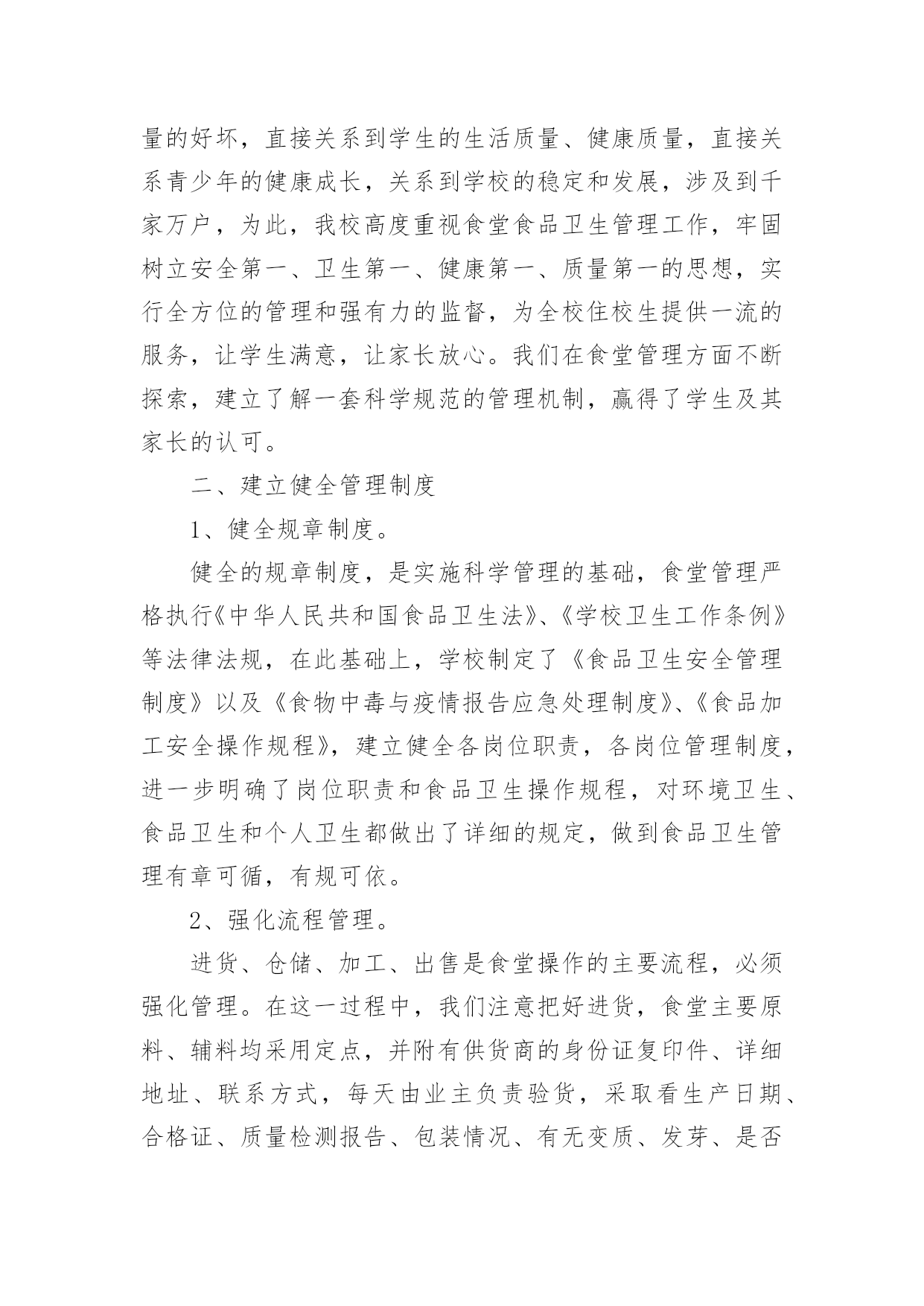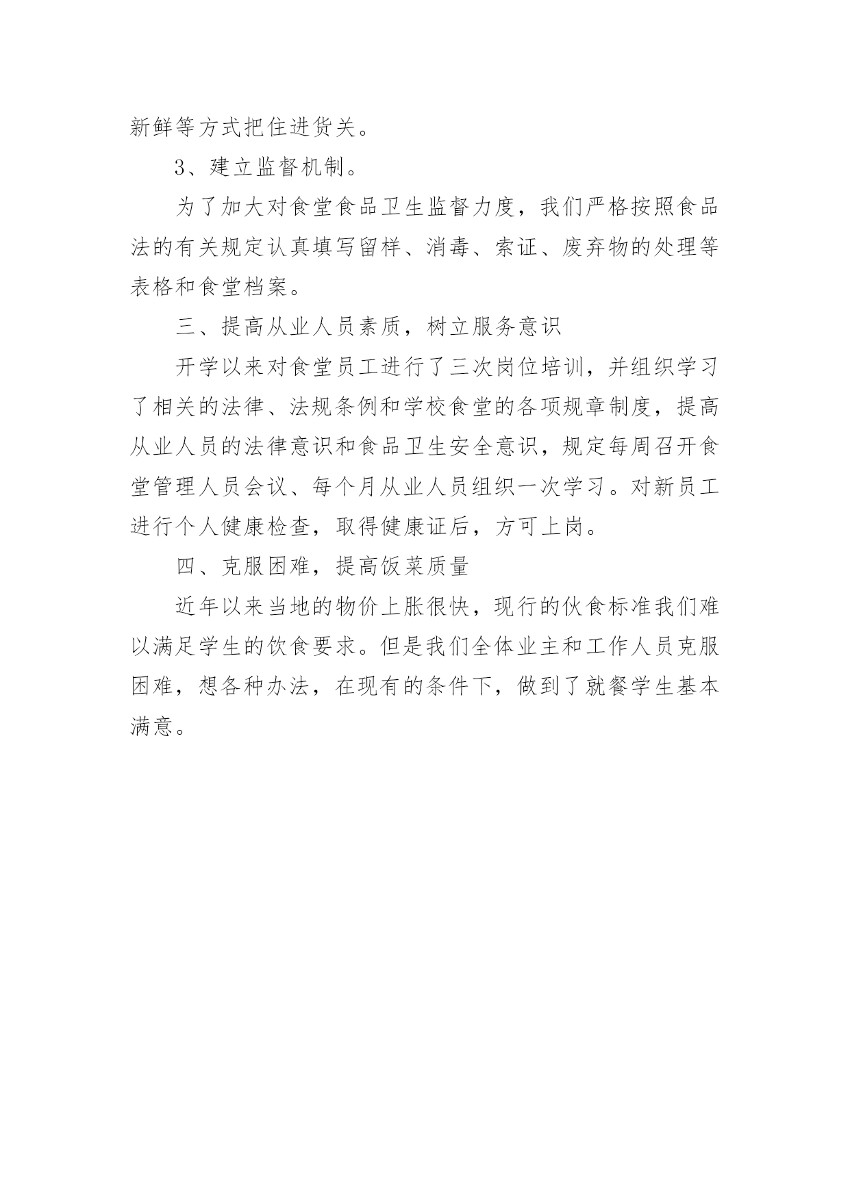 食堂的工作总结总结是在某一时期、某一项目或某些工作告一段落或者全部完成后进行回顾检查、分析评价,从而得出教训和一些规律性认识的一种书面材料,它能使我们及时找出错误并改正,不如静下心来好好写写总结吧。那么总结要注意有什么内容呢?以下是小编为大家收集的食堂的工作总结,欢迎阅读与收藏。学校是一个特殊的单位,学生又是一个特殊的消费群体,食堂的管理工作和学生的饮食安全,关系到学生的身体健康、学校的声誉和发展、教学质量的提高、社会的稳定,所以学校领导关心、学生关心、家长关心、社会关心。我校学生食堂自20××年xx月xx日营业以来,现有××多名学生在食堂用餐。为确保食堂及周边环境的安全工作,我们相继购买了××具灭火器、安装了××套监控摄像镜头,重新改装了××多米照明线路。为确保学生的饮食安全我们进行了三次库存物资的盘点,对全体业主和工作人员进行了三次培训。现将有关情况汇报如下:一、领导重视,认识到位1、学校食堂从开学以来,学校先后五次对食堂管理工作进行了全面检查,重点抓食堂规范化的管理和食品卫生安全,做到有目标、有计划、有重点、有措施,层层落实责任。2、我校有××多名学生在学校食堂就餐,食堂服务质量的好坏,直接关系到学生的生活质量、健康质量,直接关系青少年的健康成长,关系到学校的稳定和发展,涉及到千家万户,为此,我校高度重视食堂食品卫生管理工作,牢固树立安全第一、卫生第一、健康第一、质量第一的思想,实行全方位的管理和强有力的监督,为全校住校生提供一流的服务,让学生满意,让家长放心。我们在食堂管理方面不断探索,建立了解一套科学规范的管理机制,赢得了学生及其家长的认可。二、建立健全管理制度1、健全规章制度。健全的规章制度,是实施科学管理的基础,食堂管理严格执行《中华人民共和国食品卫生法》、《学校卫生工作条例》等法律法规,在此基础上,学校制定了《食品卫生安全管理制度》以及《食物中毒与疫情报告应急处理制度》、《食品加工安全操作规程》,建立健全各岗位职责,各岗位管理制度,进一步明确了岗位职责和食品卫生操作规程,对环境卫生、食品卫生和个人卫生都做出了详细的规定,做到食品卫生管理有章可循,有规可依。2、强化流程管理。进货、仓储、加工、出售是食堂操作的主要流程,必须强化管理。在这一过程中,我们注意把好进货,食堂主要原料、辅料均采用定点,并附有供货商的身份证复印件、详细地址、联系方式,每天由业主负责验货,采取看生产日期、合格证、质量检测报告、包装情况、有无变质、发芽、是否新鲜等方式把住进货关。3、建立监督机制。为了加大对食堂食品卫生监督力度,我们严格按照食品法的有关规定认真填写留样、消毒、索证、废弃物的处理等表格和食堂档案。三、提高从业人员素质,树立服务意识开学以来对食堂员工进行了三次岗位培训,并组织学习了相关的法律、法规条例和学校食堂的各项规章制度,提高从业人员的法律意识和食品卫生安全意识,规定每周召开食堂管理人员会议、每个月从业人员组织一次学习。对新员工进行个人健康检查,取得健康证后,方可上岗。四、克服困难,提高饭菜质量近年以来当地的物价上胀很快,现行的伙食标准我们难以满足学生的饮食要求。但是我们全体业主和工作人员克服困难,想各种办法,在现有的条件下,做到了就餐学生基本满意。