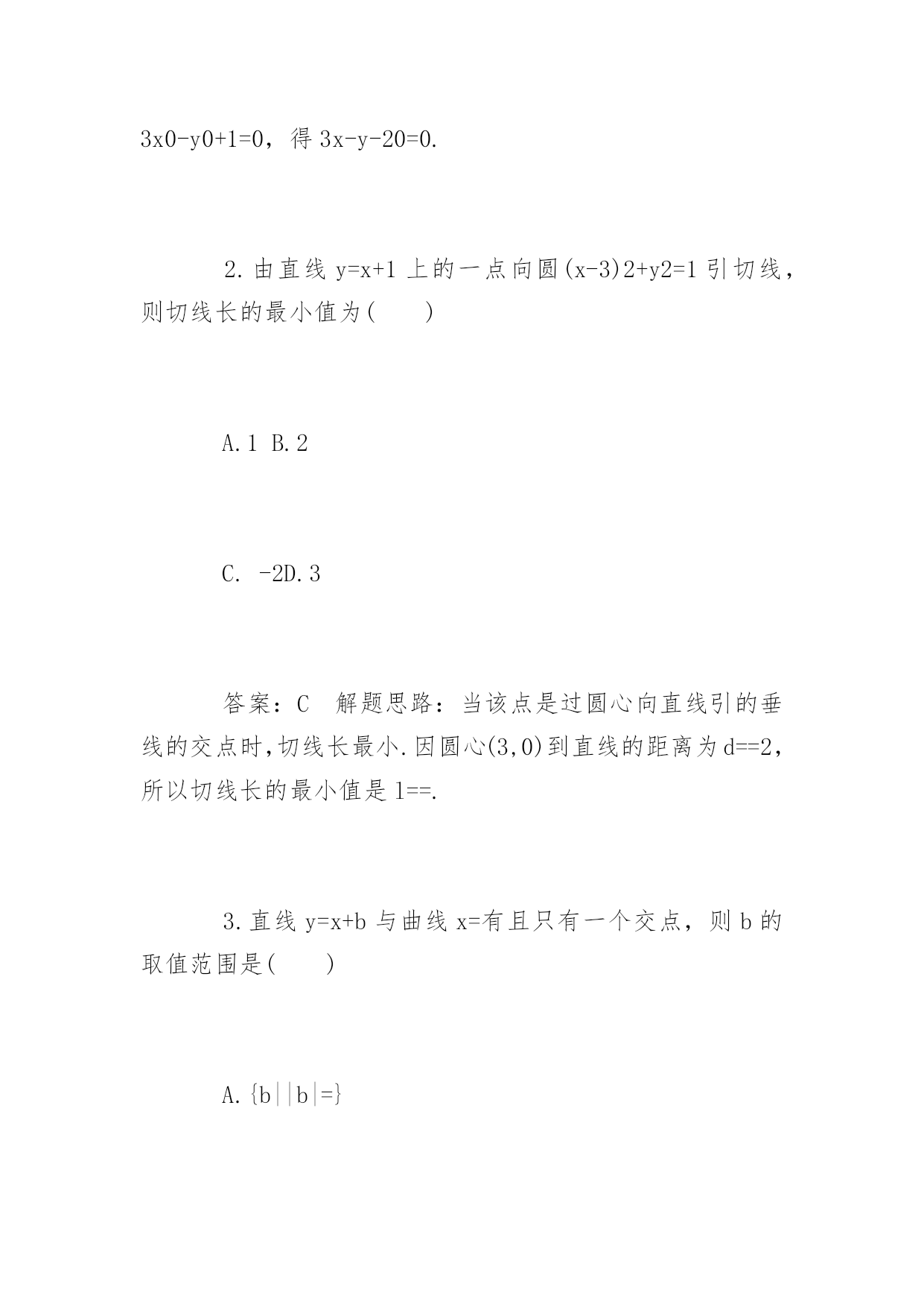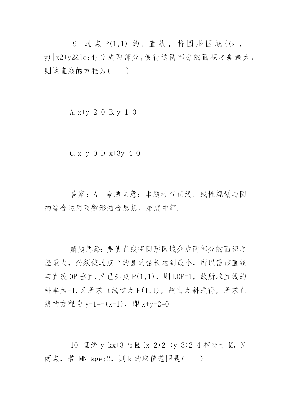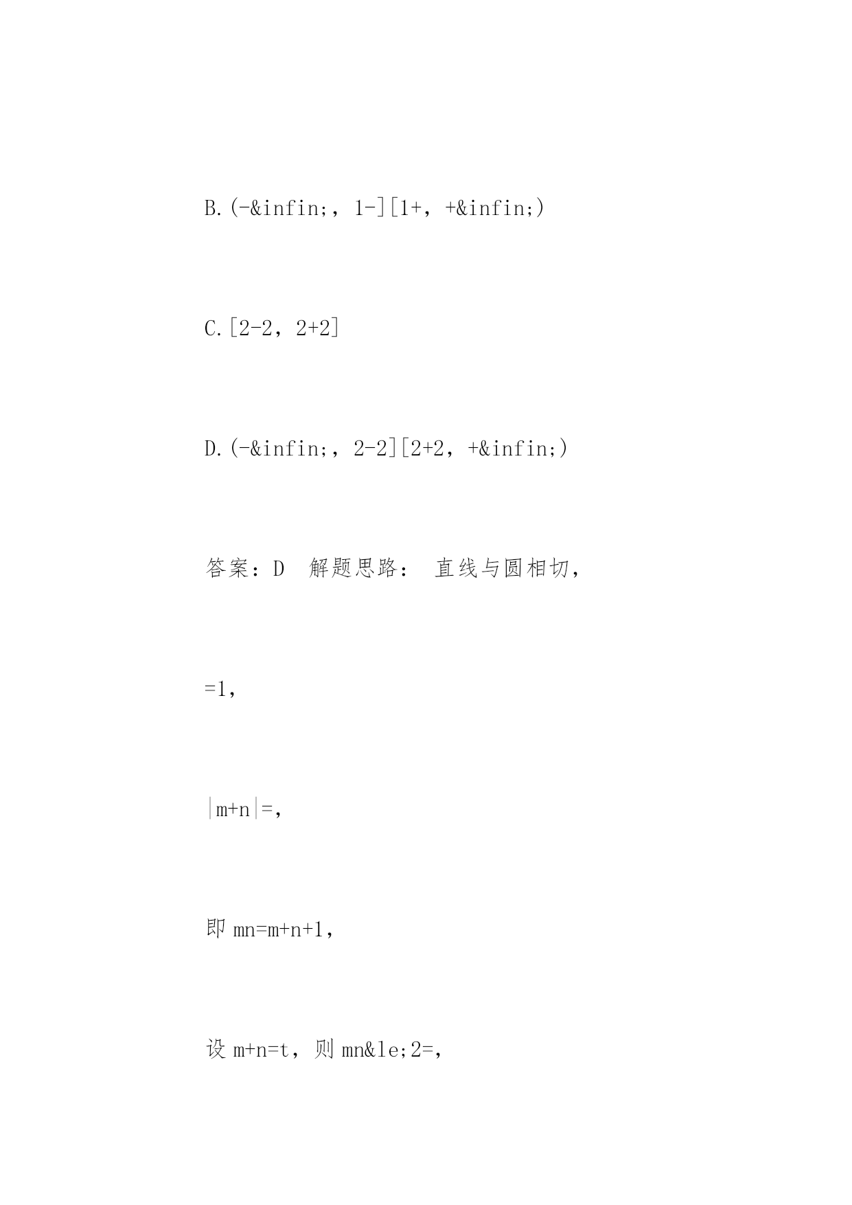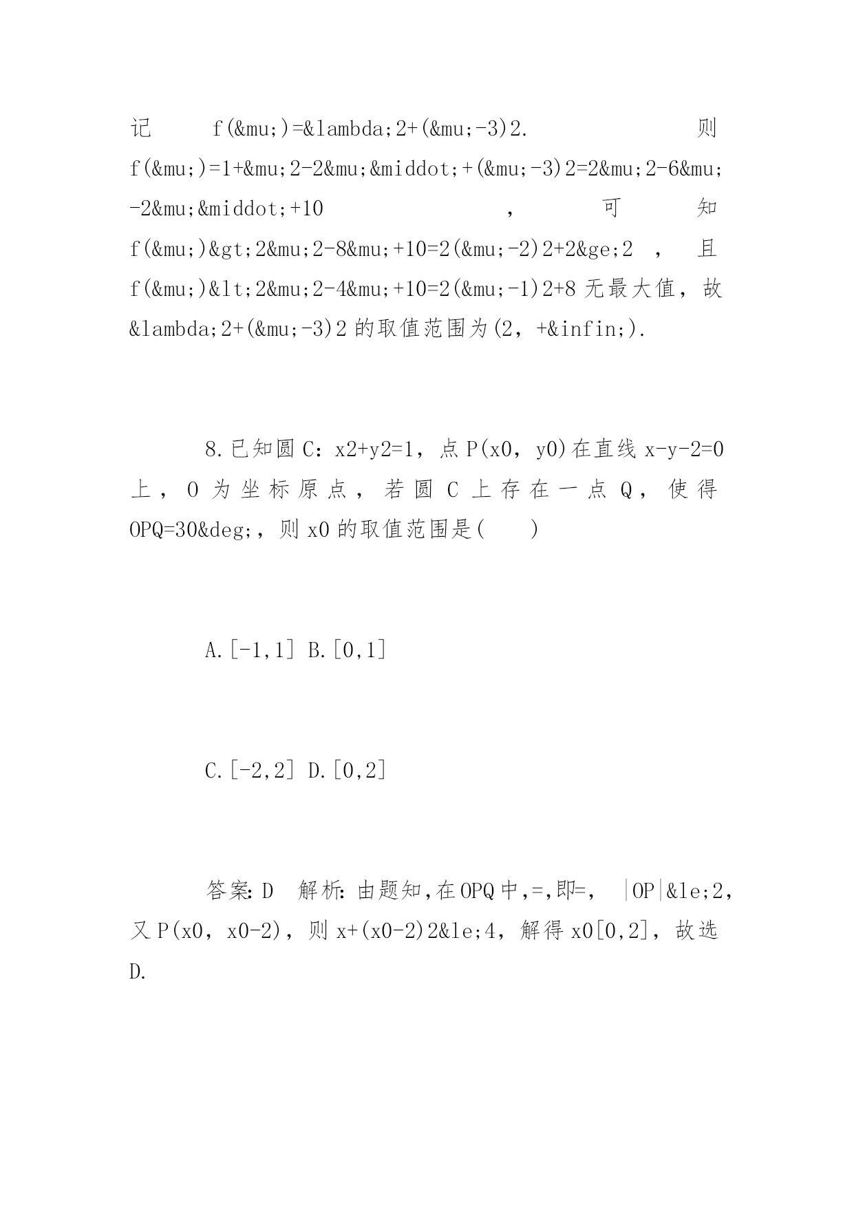 广东高考数学直线与圆的概念复习选择题2017广东高考数学直线与圆的概念复习选择题直线与圆是高考数学考试中的重要知识点,也是高考考试中比较容易拿分的知识点。以下是百分网小编给大家带来高考数学复习选择题,以供参阅。高考数学复习选择题1.平行四边形ABCD的一条对角线固定在A(3,-1),C(2,-3)两点,点D在直线3x-y+1=0上移动,则点B的轨迹方程为()A.3x-y-20=0B.3x-y+10=0C.3x-y-9=0D.3x-y-12=0答案:A解题思路:设AC的中点为O,即.设B(x,y)关于点O的对称点为(x0,y0),即D(x0,y0),则由3x0-y0+1=0,得3x-y-20=0.2.由直线y=x+1上的一点向圆(x-3)2+y2=1引切线,则切线长的最小值为()A.1B.2C.-2D.3答案:C解题思路:当该点是过圆心向直线引的垂线的交点时,切线长最小.因圆心(3,0)到直线的距离为d==2,所以切线长的最小值是l==.3.直线y=x+b与曲线x=有且只有一个交点,则b的取值范围是()A.{b||b|=}B.{b|-1C.{b|-1≤b<1}D.非以上答案答案:B解题思路:在同一坐标系中,画出y=x+b与曲线x=(就是x2+y2=1,x≥0)的图象,如图所示,相切时b=-,其他位置符合条件时需-14.若圆C:x2+y2+2x-4y+3=0关于直线2ax+by+6=0对称,则由点(a,b)向圆所作的切线长的最小值是()A.2B.3C.4D.6答案:C解题思路:圆的标准方程为(x+1)2+(y-2)2=2,所以圆心为(-1,2),半径为.因为圆关于直线2ax+by+6=0对称,所以圆心在直线2ax+by+6=0上,所以-2a+2b+6=0,即b=a-3,点(a,b)到圆心的距离为d====.所以当a=2时,d有最小值=3,此时切线长最小,为==4,故选C.5.已知动点P到两定点A,B的距离和为8,且|AB|=4,线段AB的中点为O,过点O的所有直线与点P的轨迹相交而形成的线段中,长度为整数的有()A.5条B.6条C.7条D.8条答案:D命题立意:本题考查椭圆的定义与性质,难度中等.解题思路:依题意,动点P的轨迹是以A,B为焦点,长轴长是8,短轴长是2=4的椭圆.注意到经过该椭圆的中心O的最短弦长等于4,最长弦长是8,因此过点O的所有直线与点P的轨迹相交而形成的线段中,长度可以为整数4,5,6,7,8,其中长度为4,8的各一条,长度为5,6,7的各有两条,因此满足题意的弦共有8条,故选D.6.设m,nR,若直线(m+1)x+(n+1)y-2=0与圆(x-1)2+(y-1)2=1相切,则m+n的取值范围是()A.[1-,1+]B.(-∞,1-][1+,+∞)C.[2-2,2+2]D.(-∞,2-2][2+2,+∞)答案:D解题思路:直线与圆相切,=1,|m+n|=,即mn=m+n+1,设m+n=t,则mn≤2=,t+1≤,t2-4t-4≥0,解得:t≤2-2或t≥2+2.7.在平面直角坐标系xOy中,设A,B,C是圆x2+y2=1上相异三点,若存在正实数λ,μ,使得=λ+μ,则λ2+(μ-3)2的取值范围是()A.[0,+∞)B.(2,+∞)C.(2,8)D.(8,+∞)答案:B解题思路:依题意B,O,C三点不可能在同一直线上,·=||||cosBOC=cosBOC∈(-1,1),又由=λ+μ,得λ=-μ,于是λ2=1+μ2-2μ·,记f(μ)=λ2+(μ-3)2.则f(μ)=1+μ2-2μ·+(μ-3)2=2μ2-6μ-2μ·+10,可知f(μ)>2μ2-8μ+10=2(μ-2)2+2≥2,且f(μ)<2μ2-4μ+10=2(μ-1)2+8无最大值,故λ2+(μ-3)2的取值范围为(2,+∞).8.已知圆C:x2+y2=1,点P(x0,y0)在直线x-y-2=0上,O为坐标原点,若圆C上存在一点Q,使得OPQ=30°,则x0的取值范围是()A.[-1,1]B.[0,1]C.[-2,2]D.[0,2]答案:D解析:由题知,在OPQ